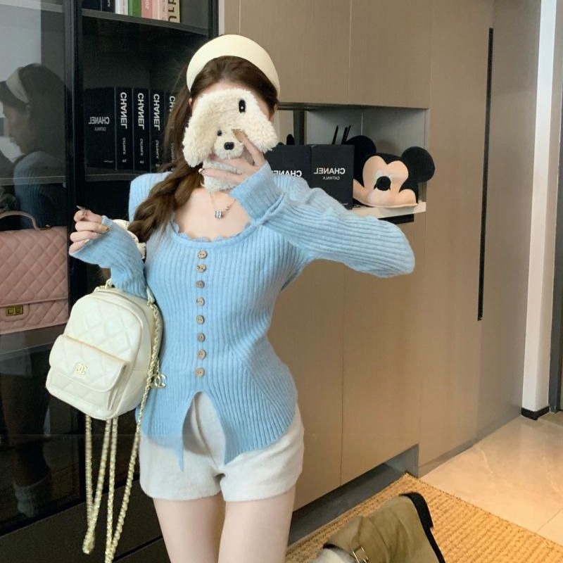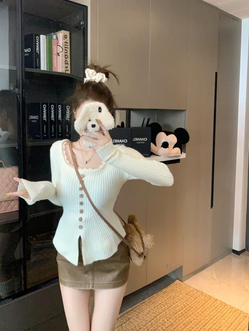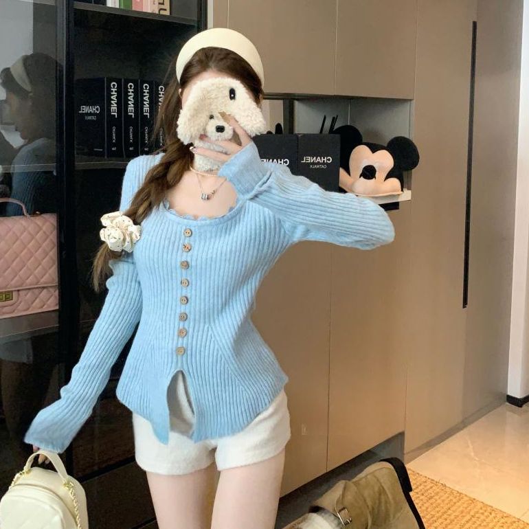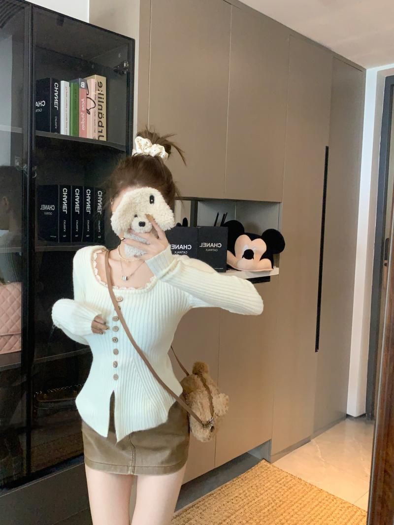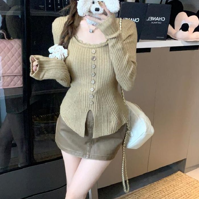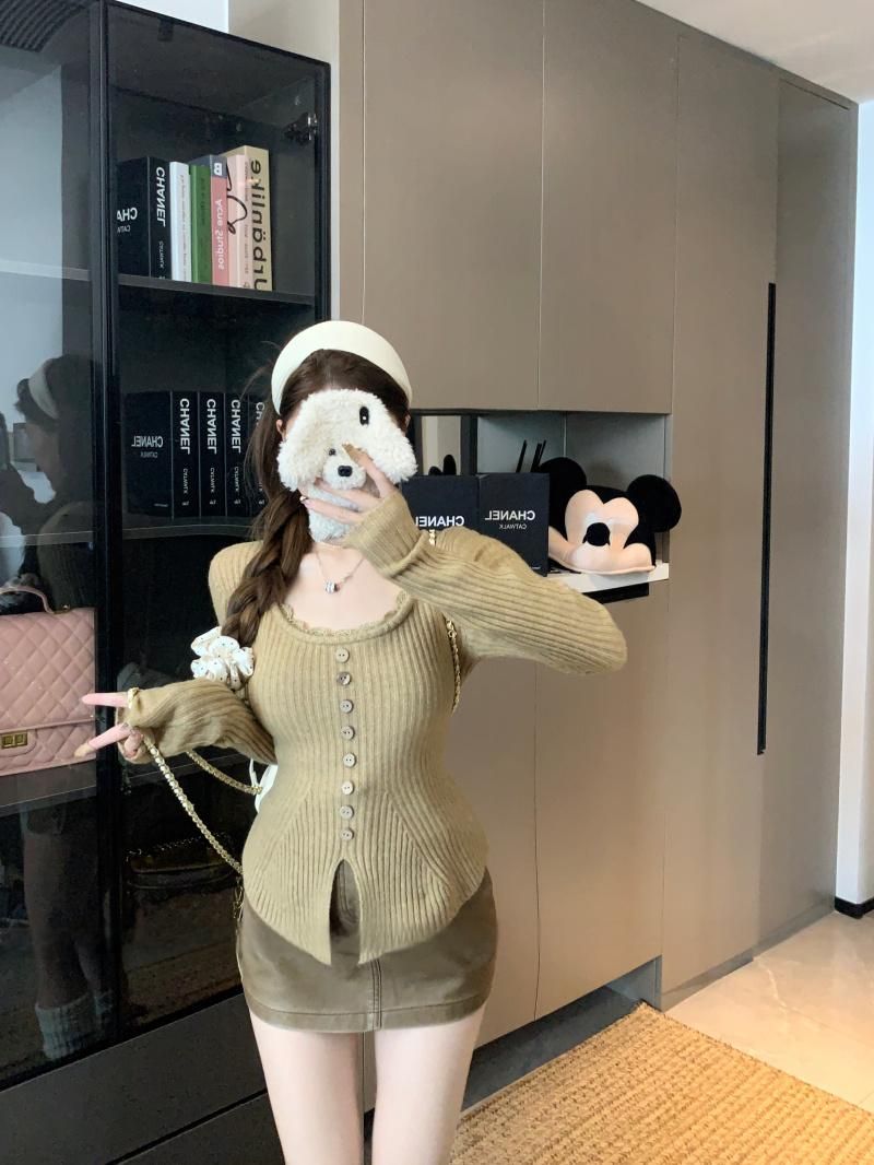 MY14822# 韩版纯色蕾丝拼接长袖针织衫女装新款修身显瘦设计感百搭上衣女裝貨源服裝批發