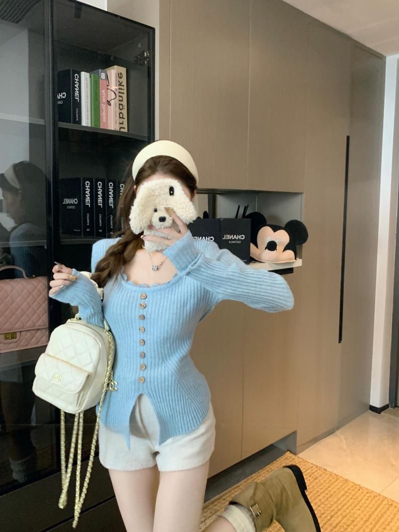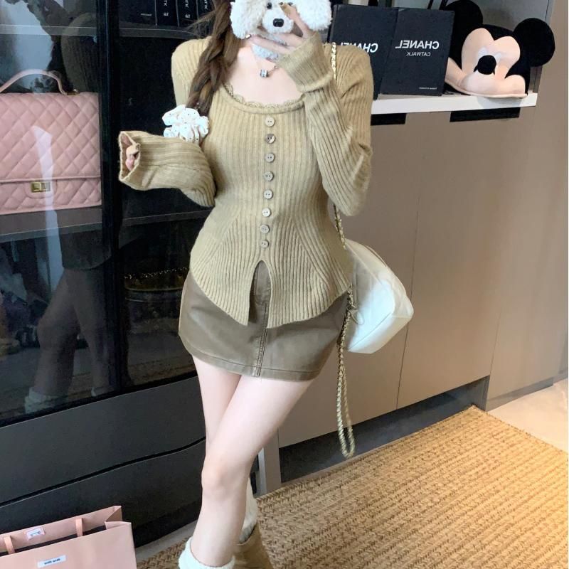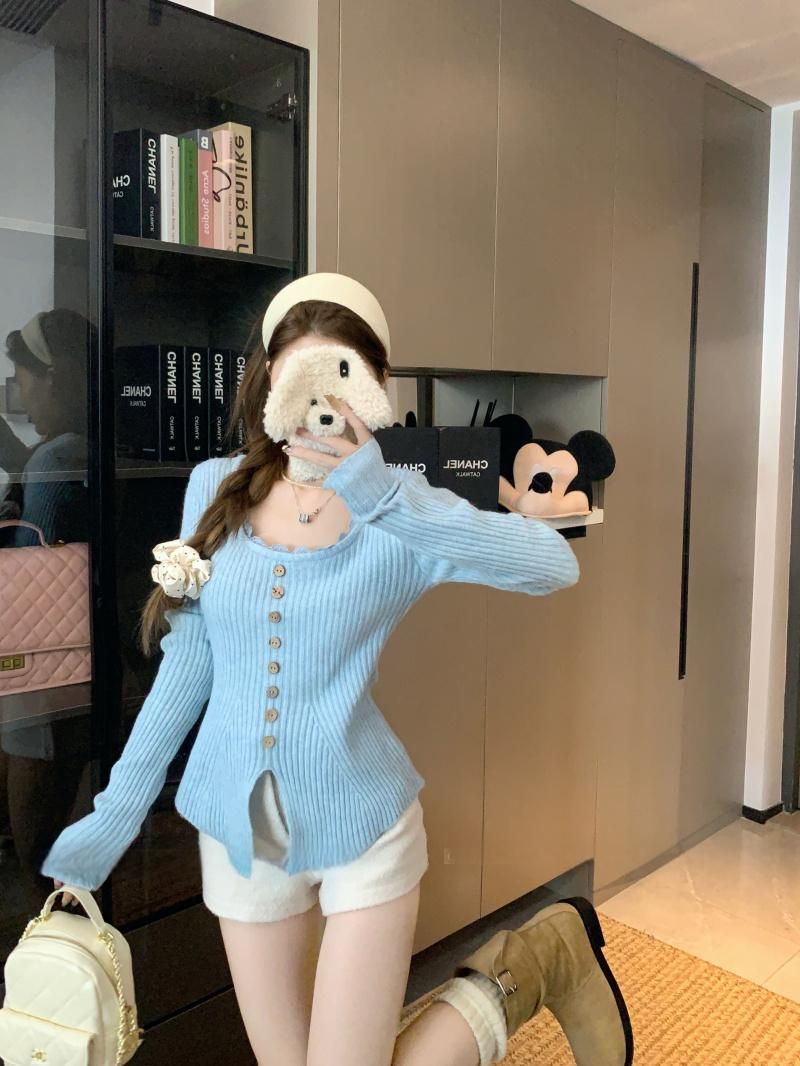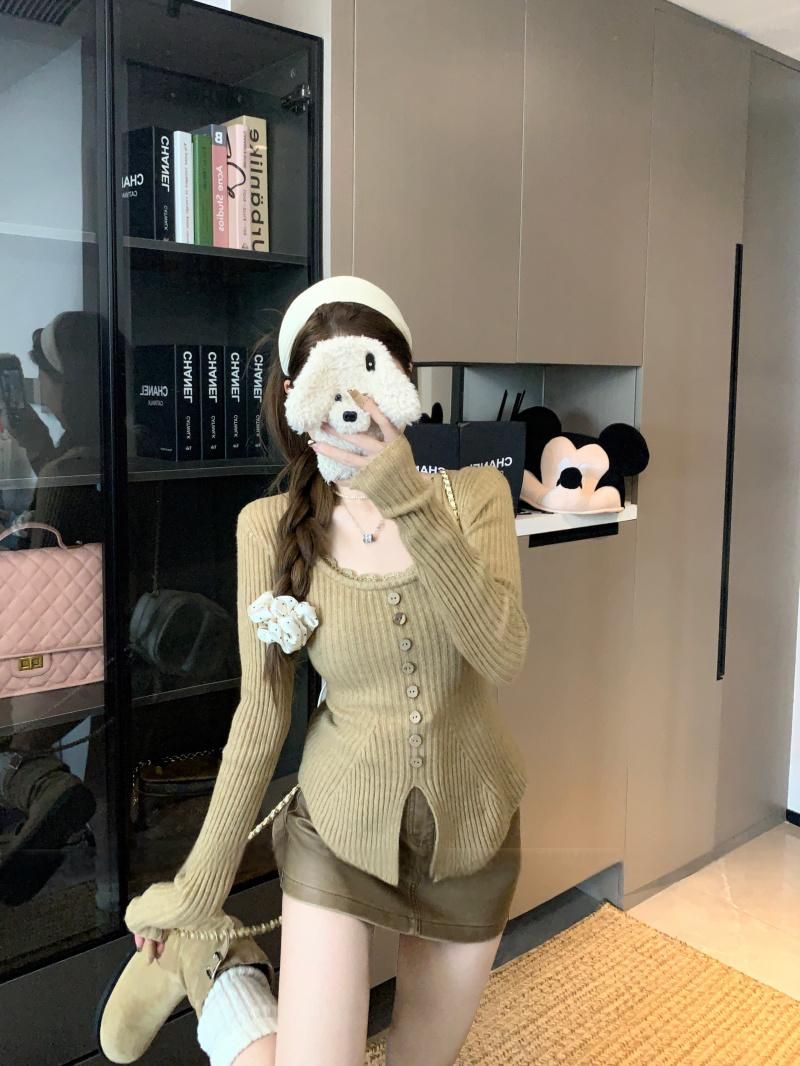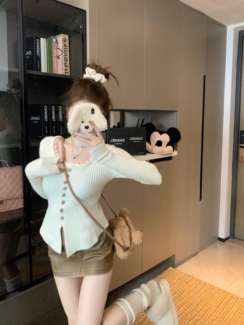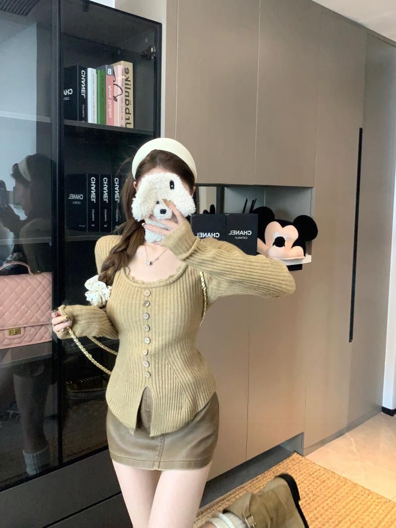 MY14822# 韩版纯色蕾丝拼接长袖针织衫女装新款修身显瘦设计感百搭上衣女裝貨源服裝批發