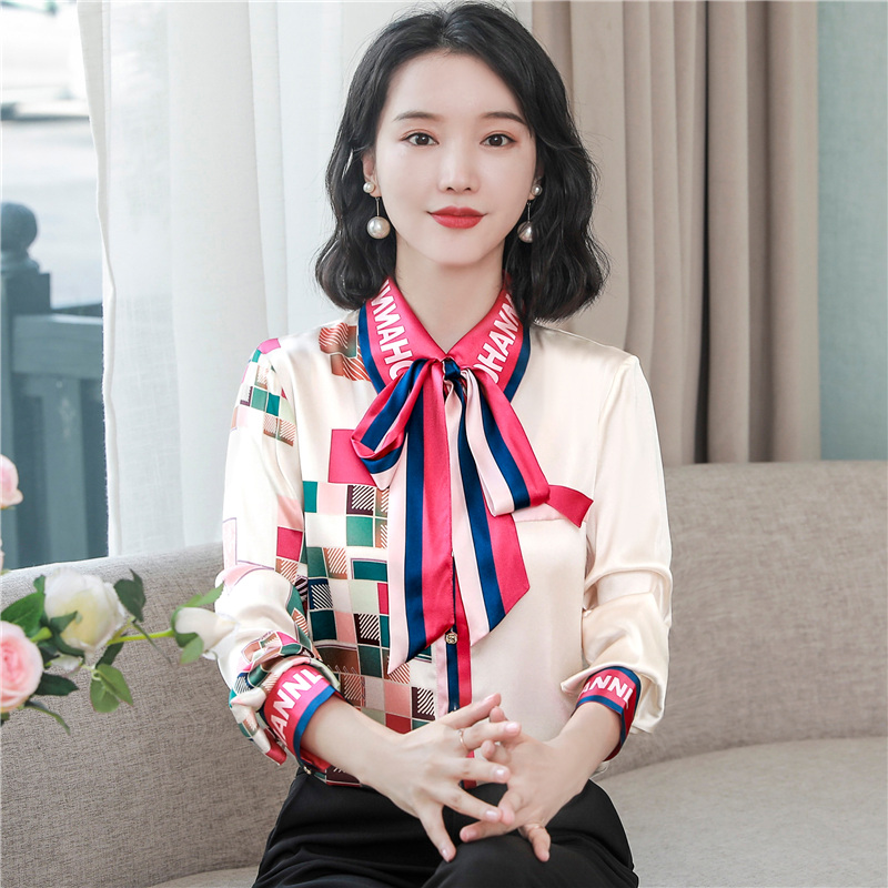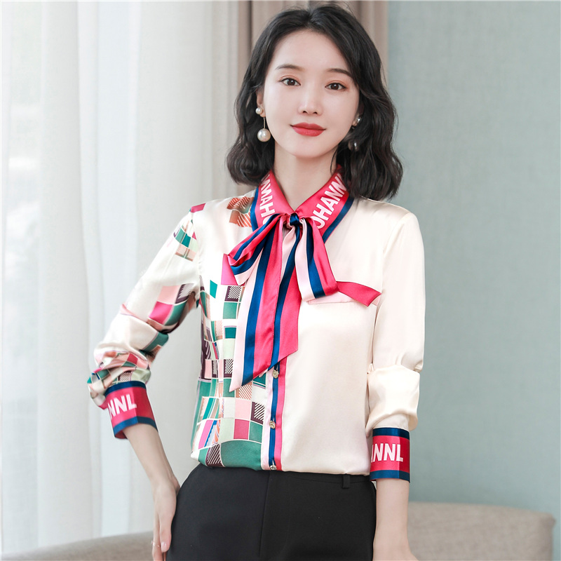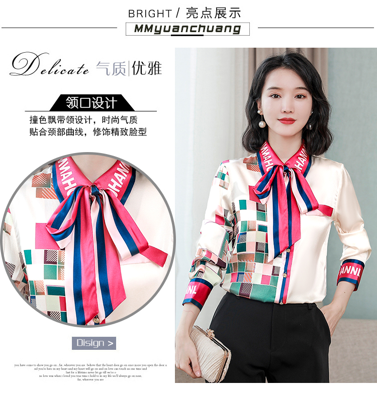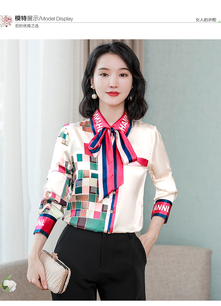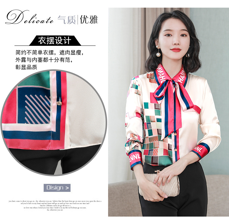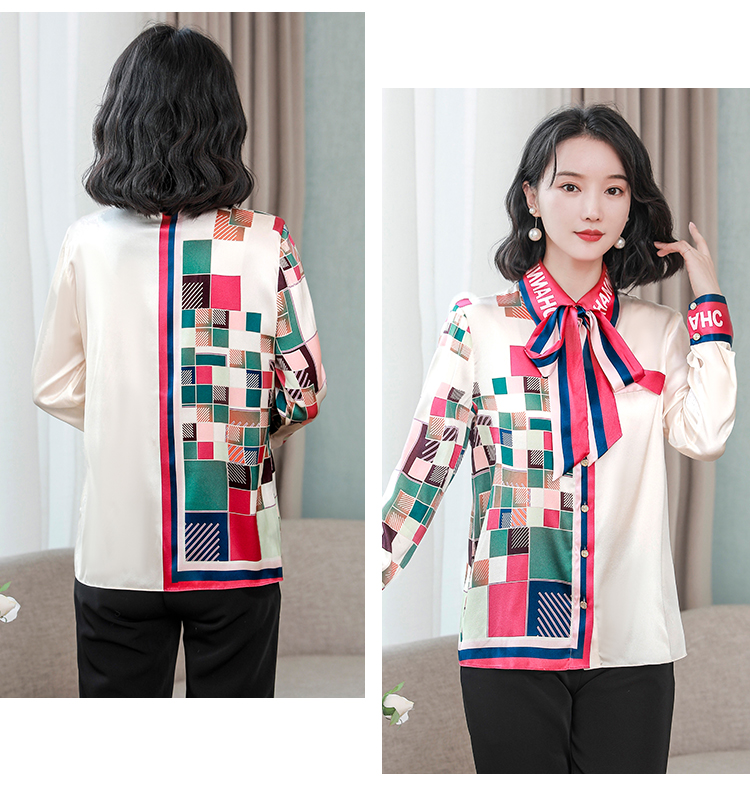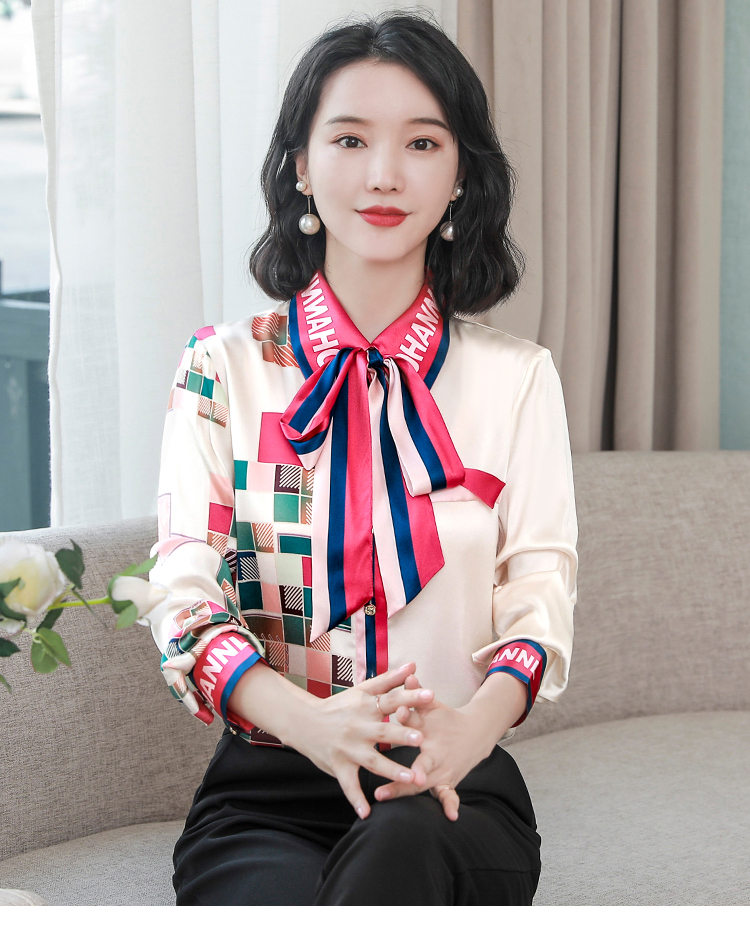 MY14828# 高端桑蚕丝真丝衬衫女飘带格子减龄设计感长袖上衣女裝貨源服裝批發