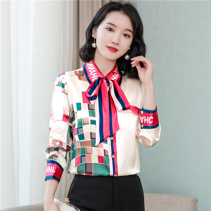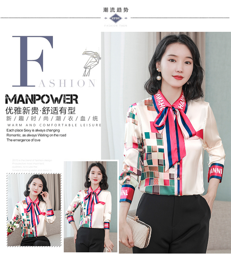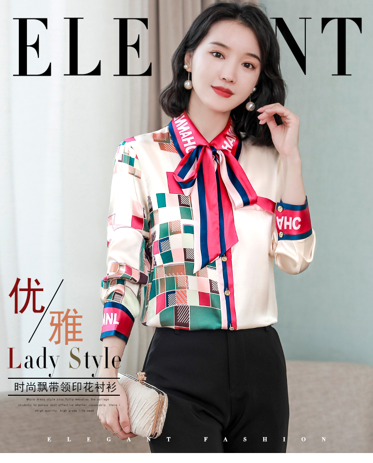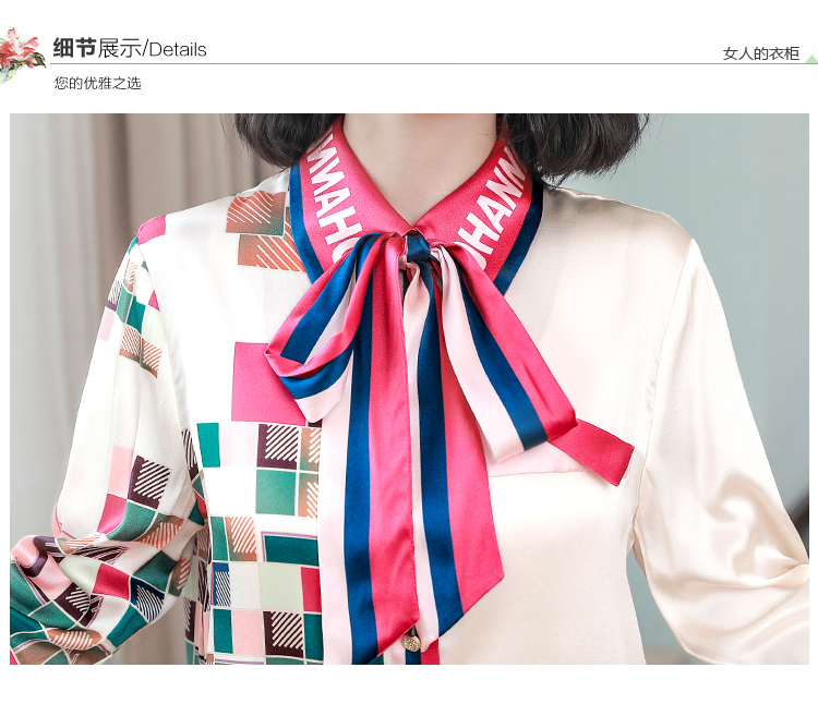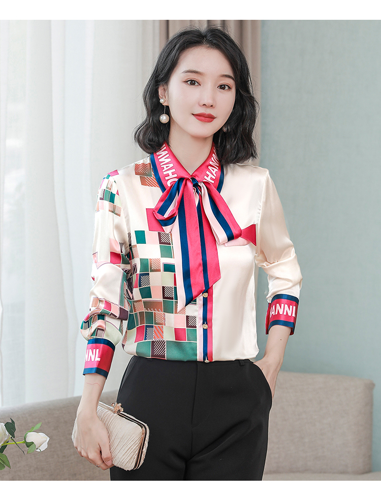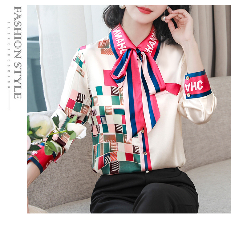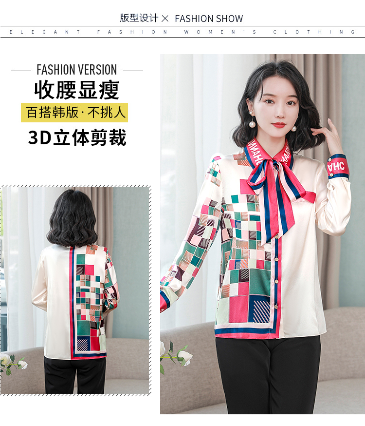 MY14828# 高端桑蚕丝真丝衬衫女飘带格子减龄设计感长袖上衣女裝貨源服裝批發