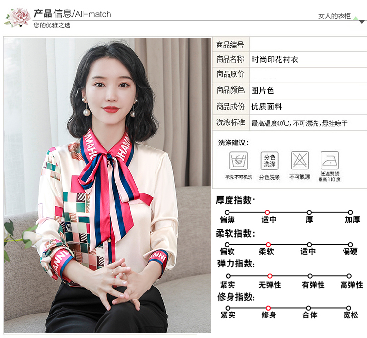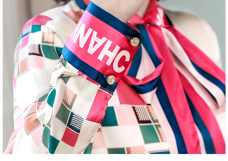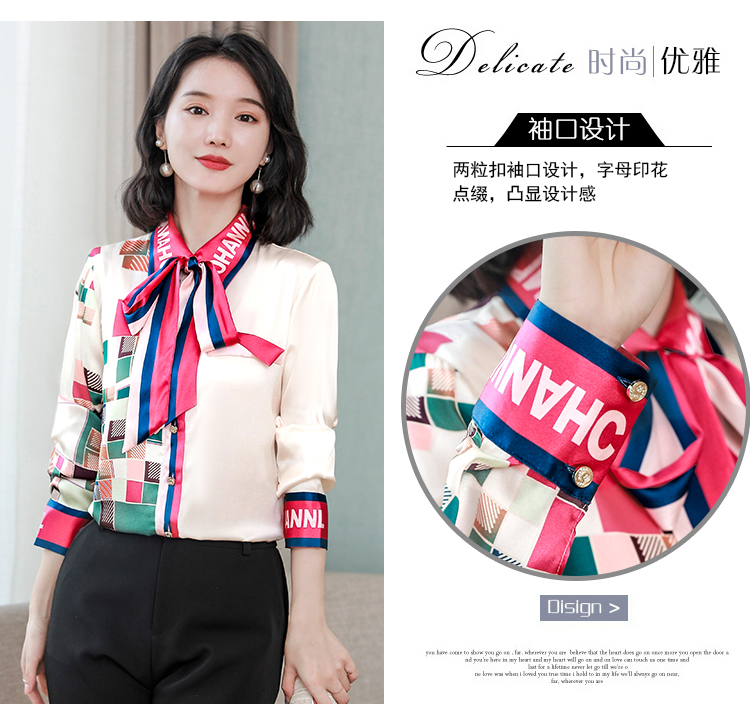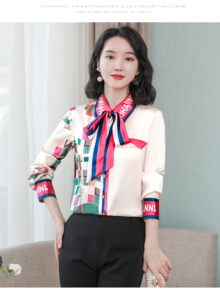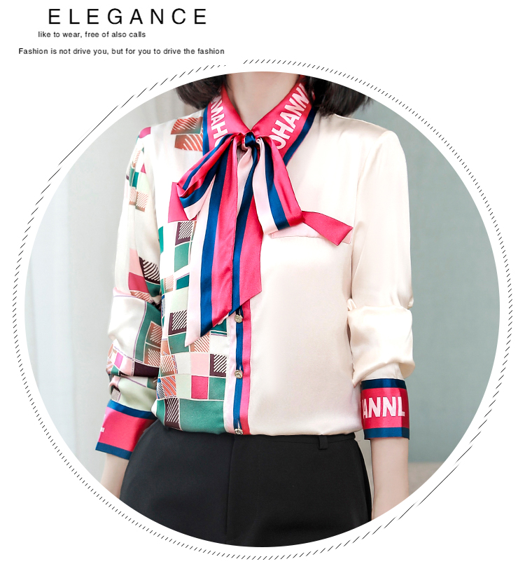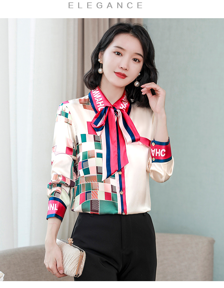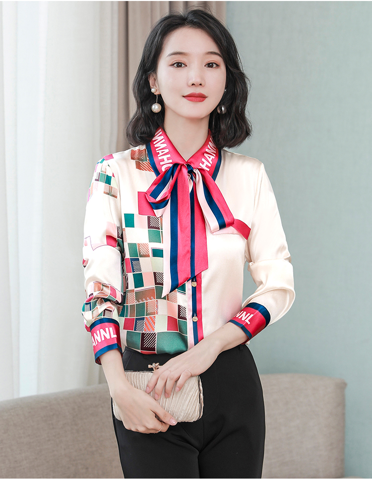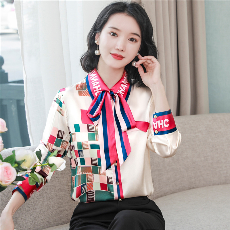 MY14828# 高端桑蚕丝真丝衬衫女飘带格子减龄设计感长袖上衣女裝貨源服裝批發