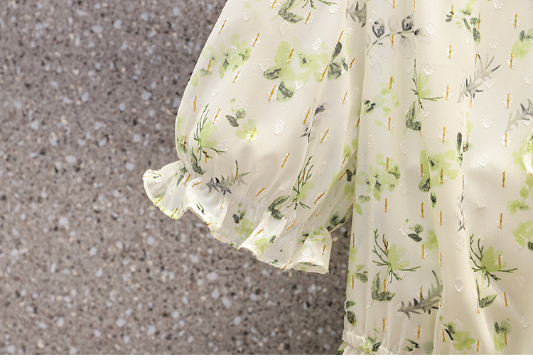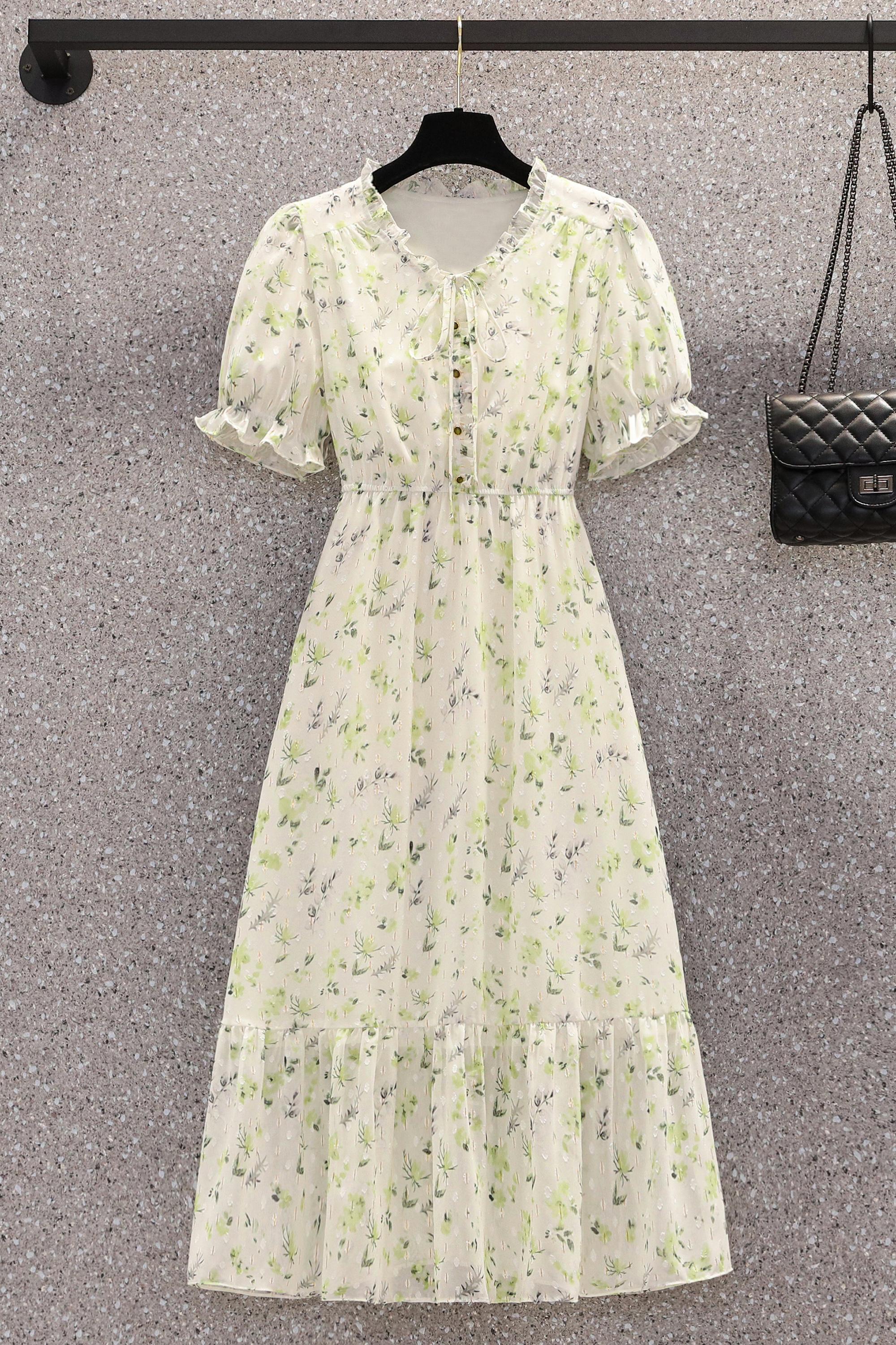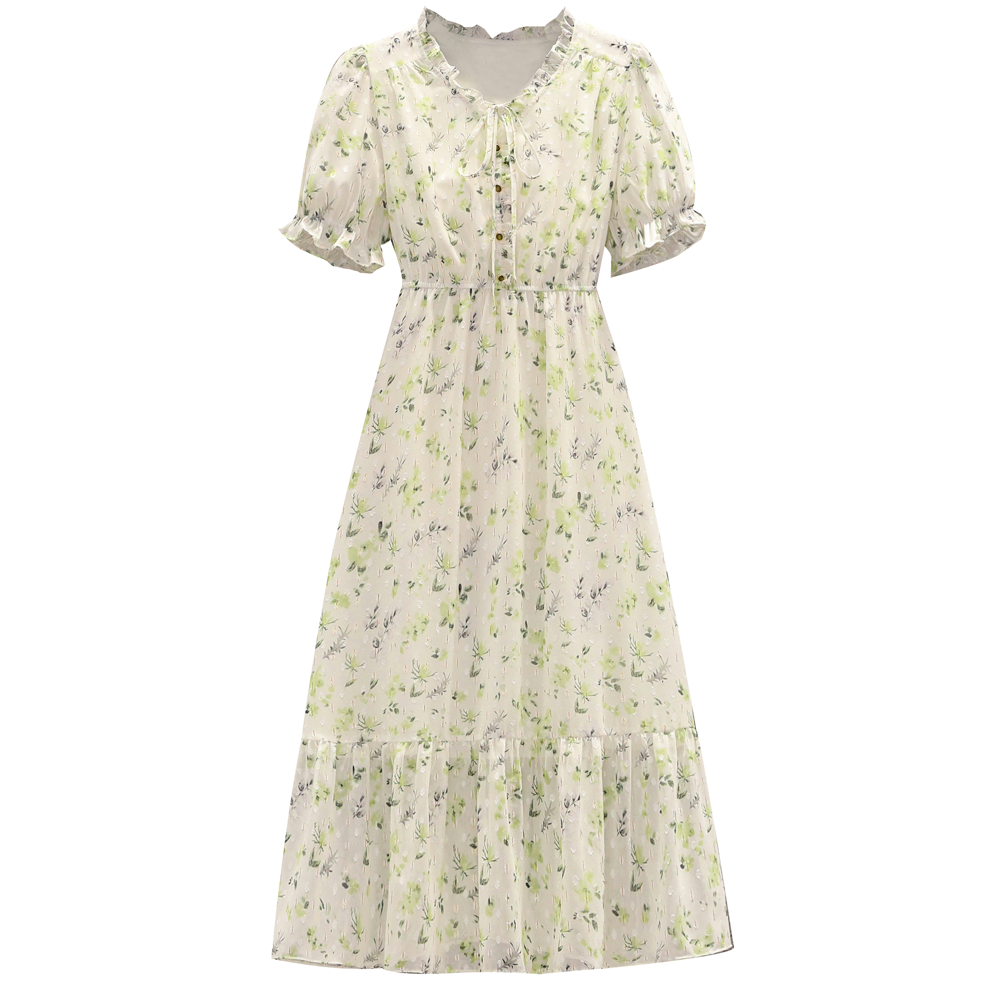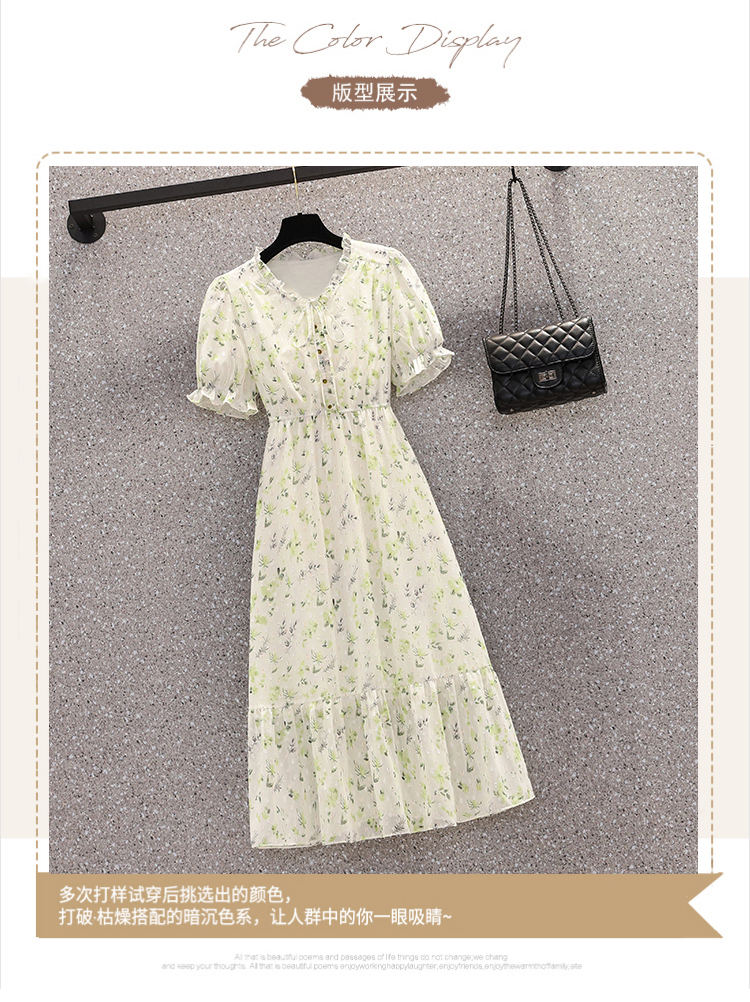 MY14839# 大码夏新款赫本风泡泡袖连衣裙女荷叶边V领碎花开叉长裙女裝...