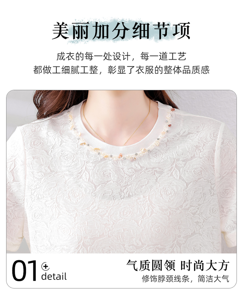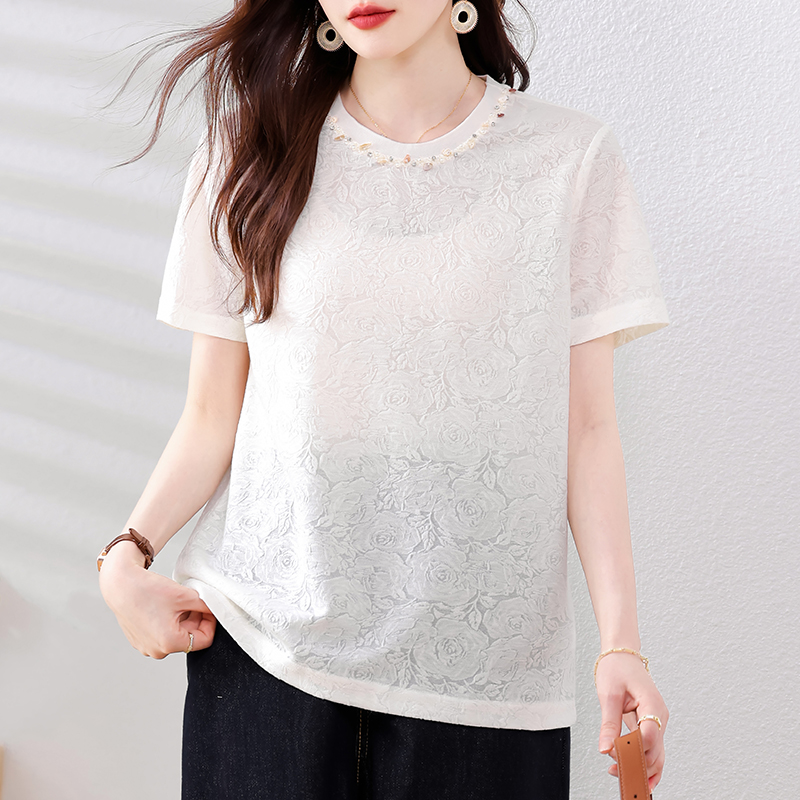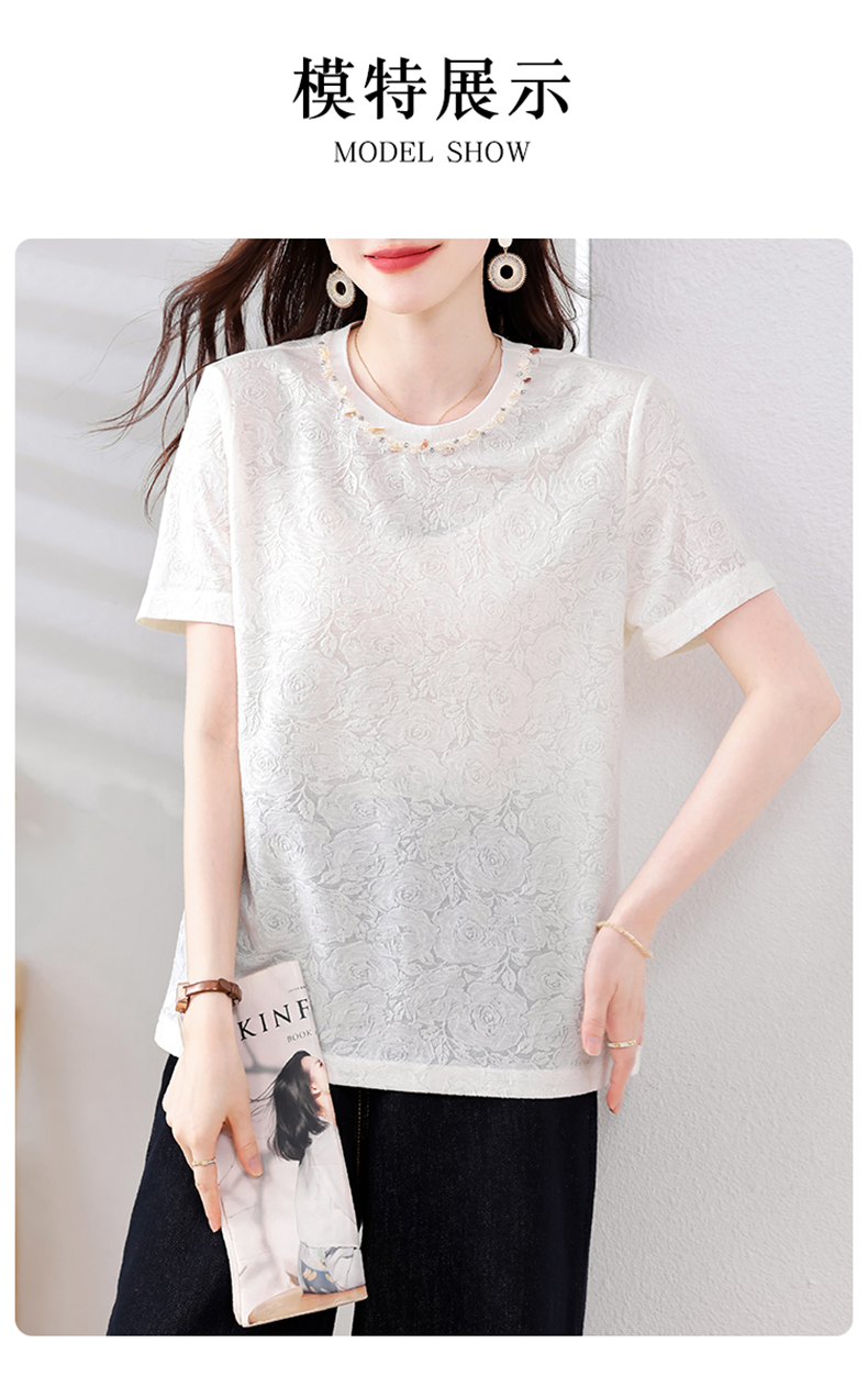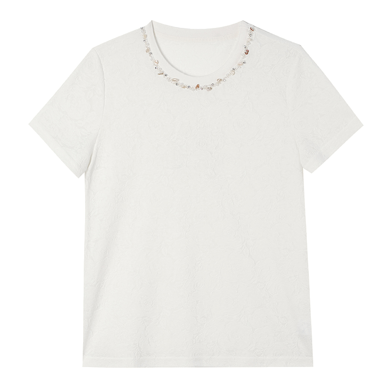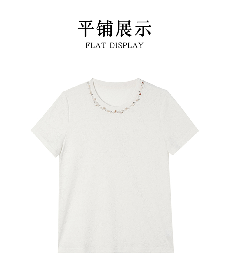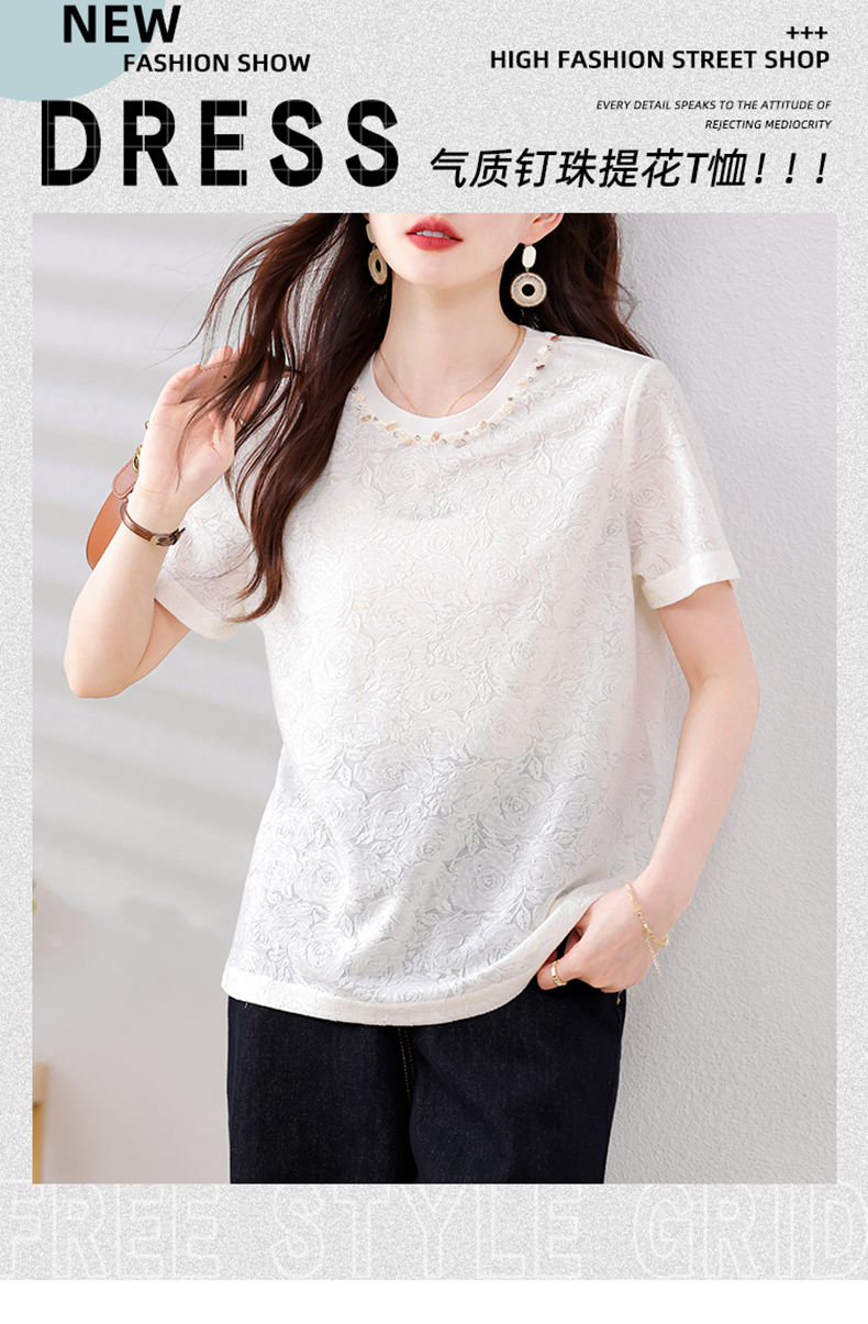 MY14857# 实拍 圆领钉钻提花白色短袖T恤2025夏季韩版简约百搭休闲棉上衣