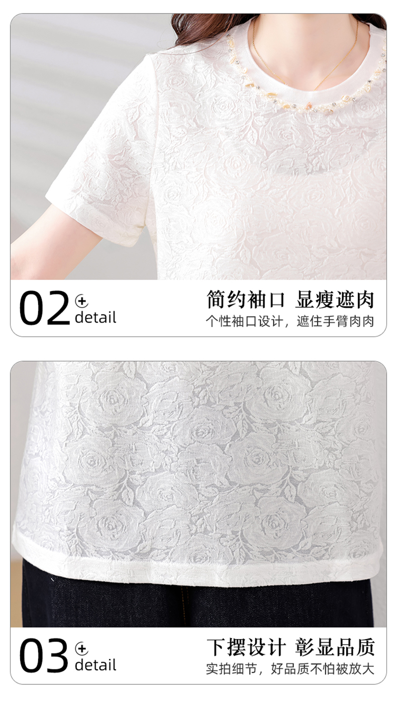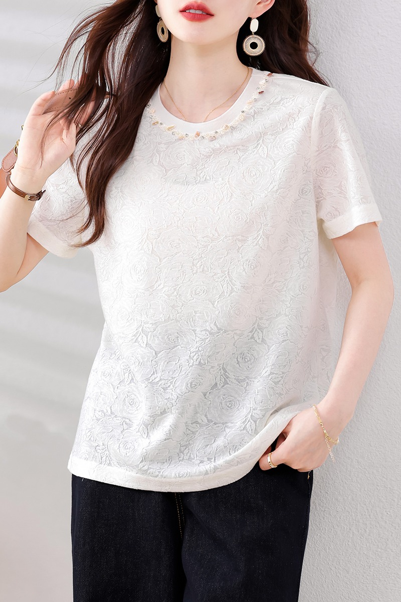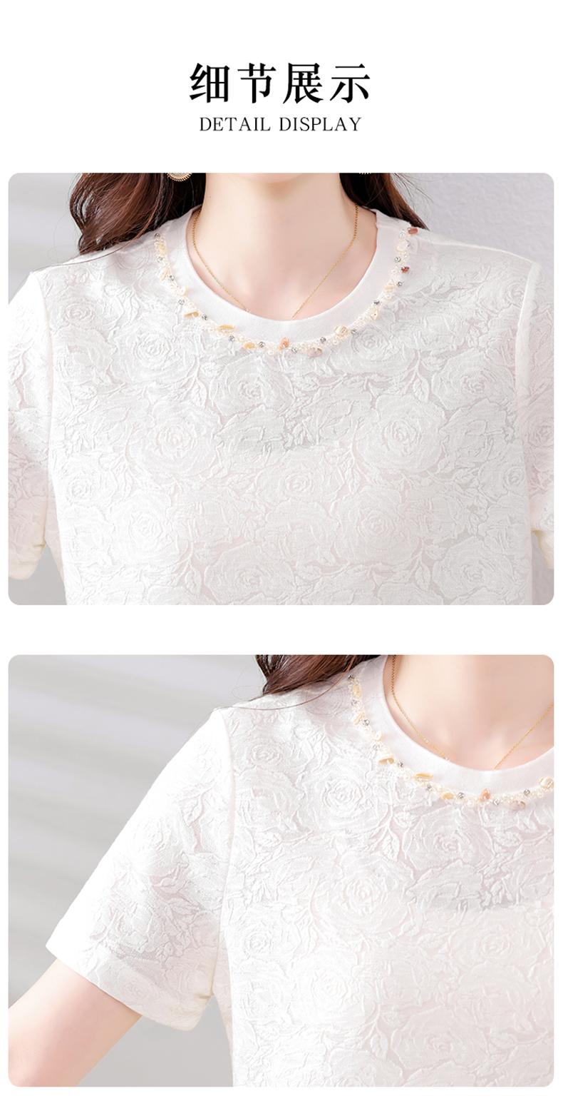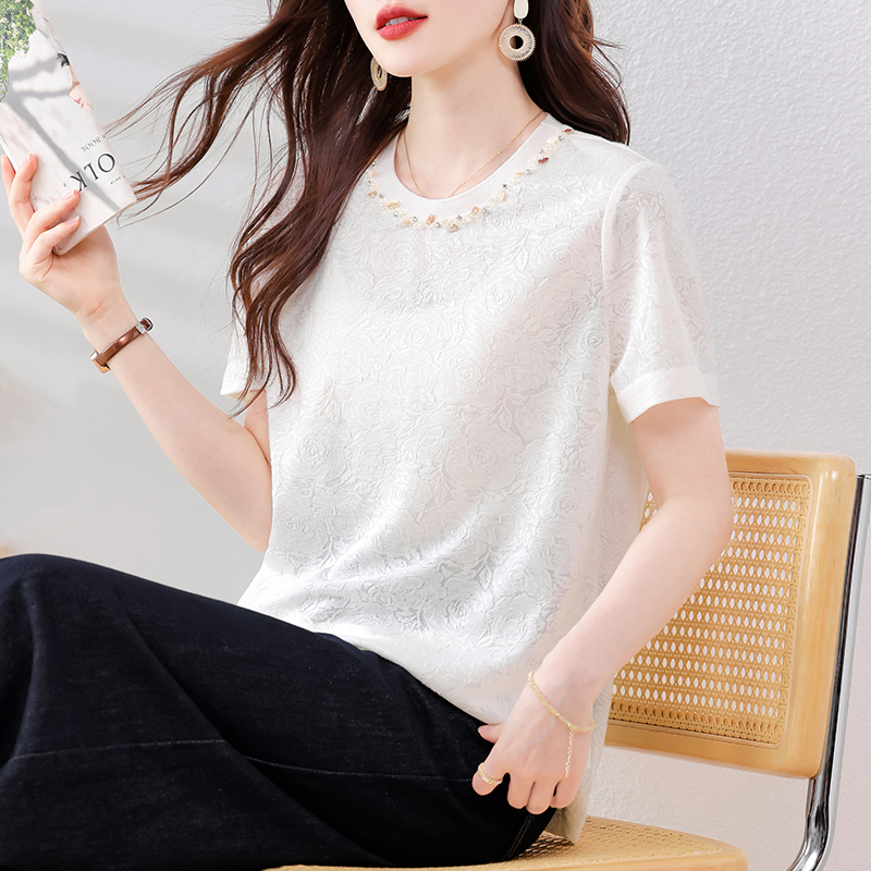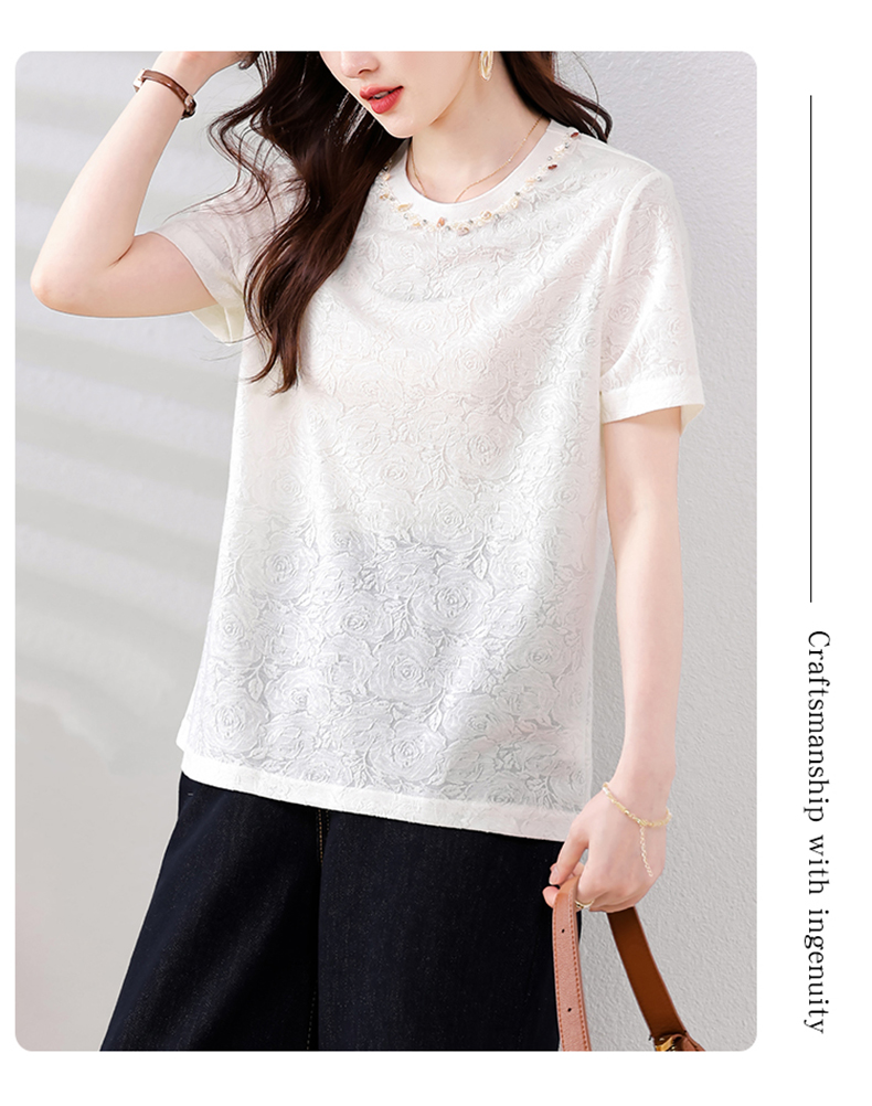 MY14857# 实拍 圆领钉钻提花白色短袖T恤2025夏季韩版简约百搭休闲棉上衣