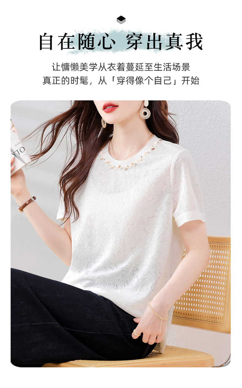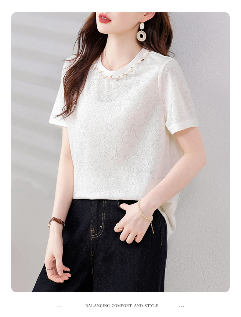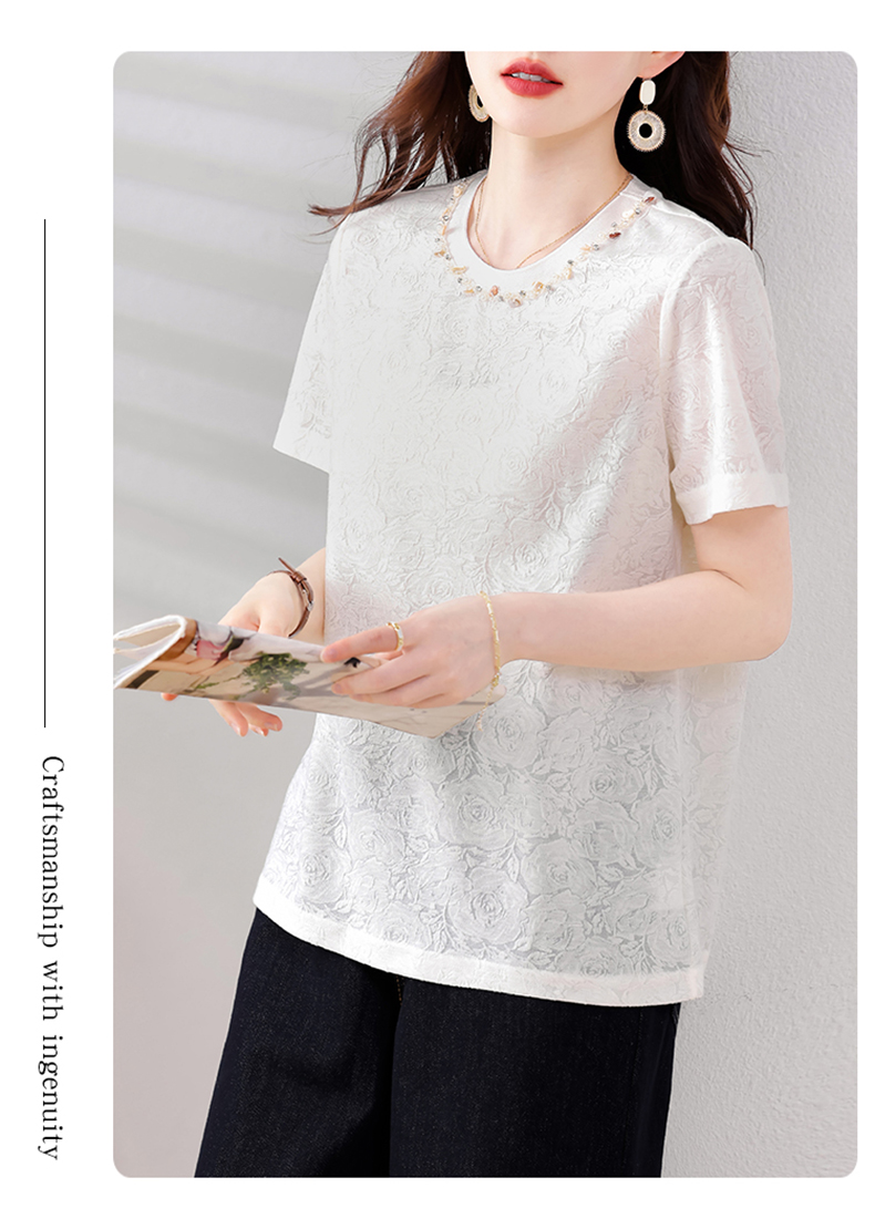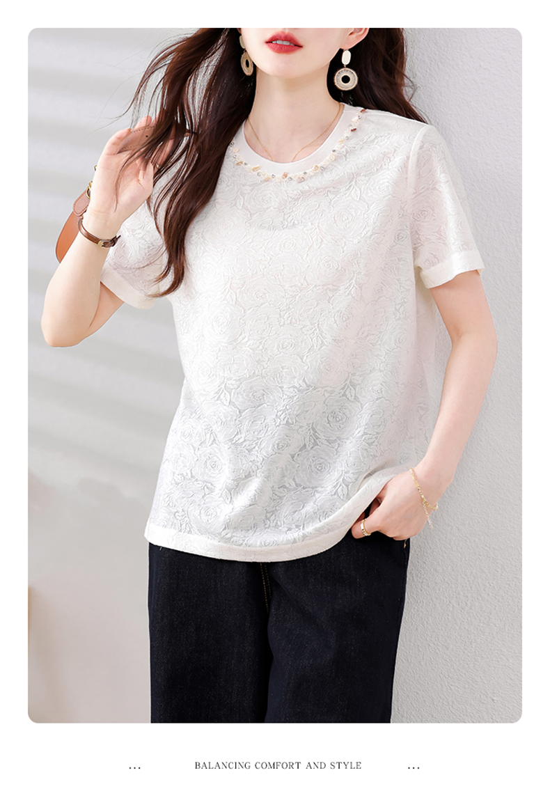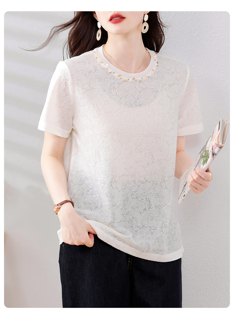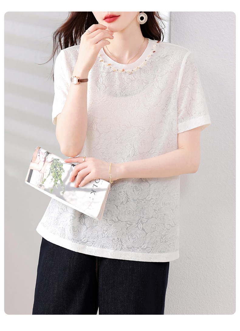 MY14857# 实拍 圆领钉钻提花白色短袖T恤2025夏季韩版简约百搭休闲棉上衣