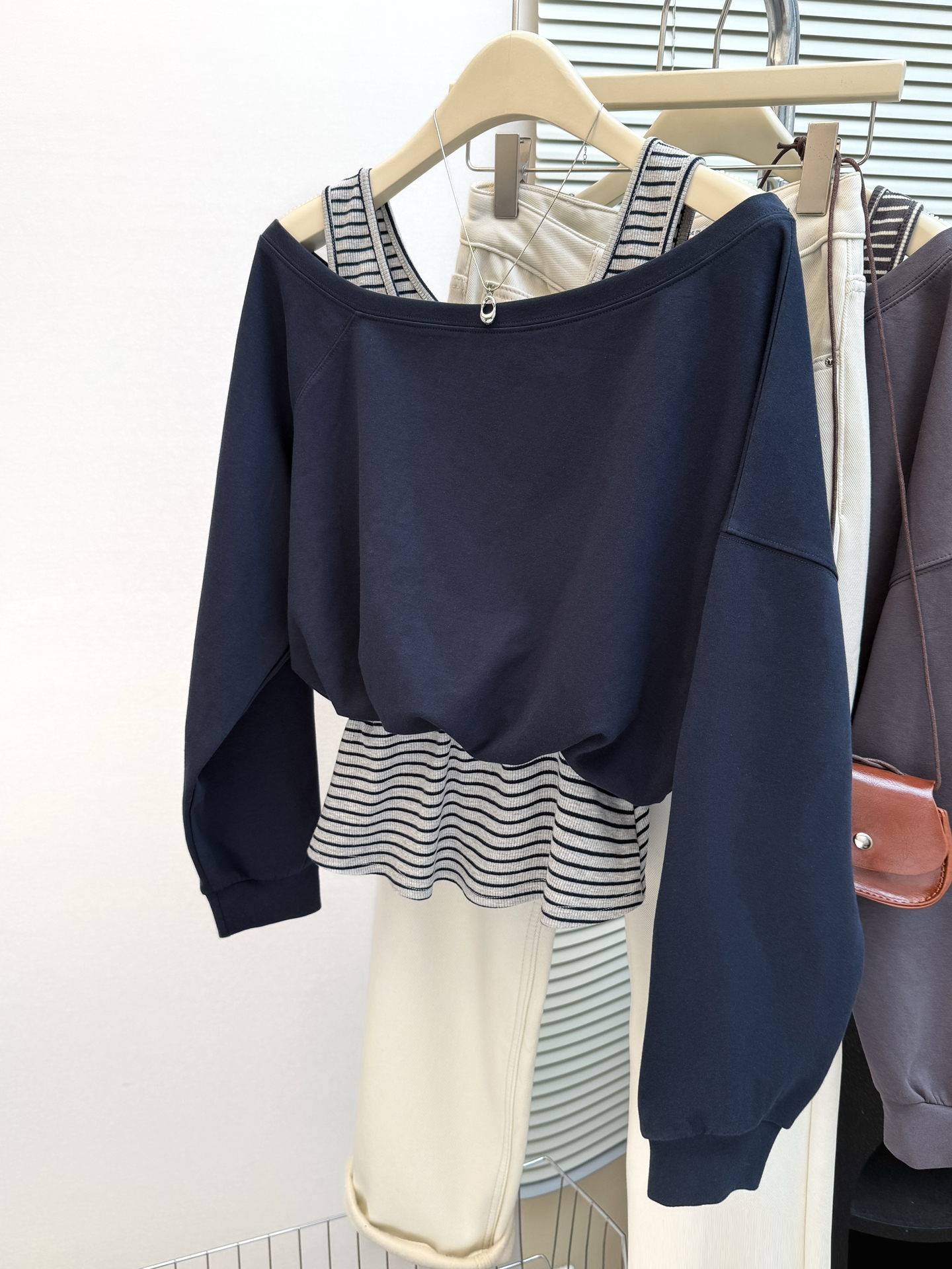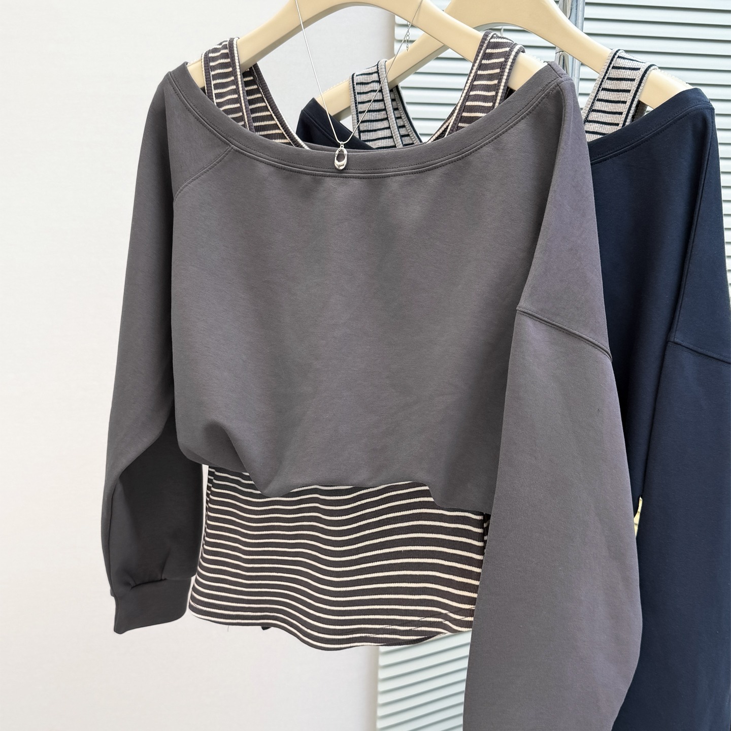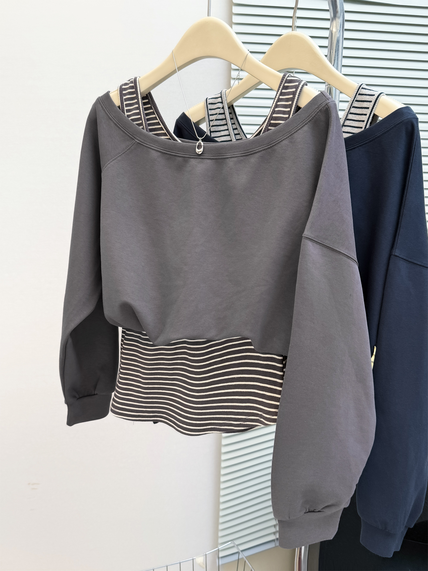 MY14921# 韩系字母印花一字肩长袖卫衣+修身背心套装新假两件套女裝貨源服裝批發