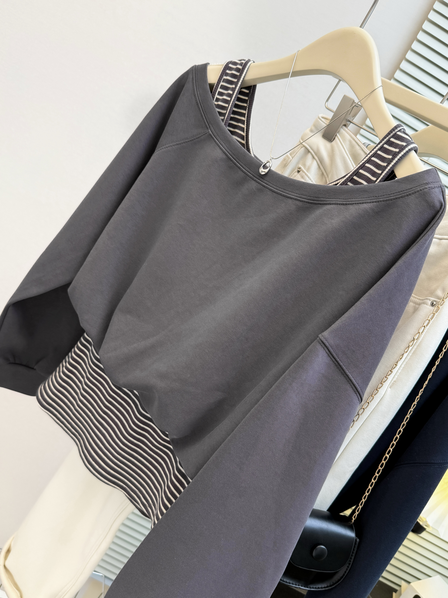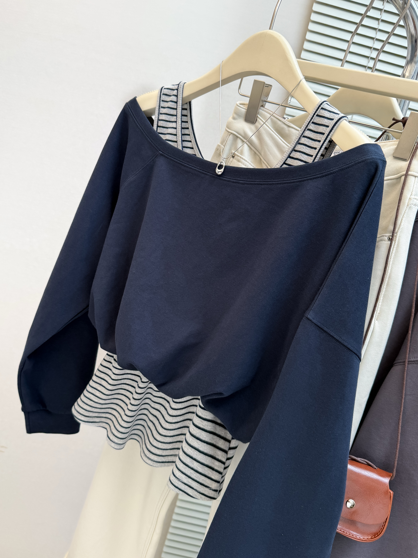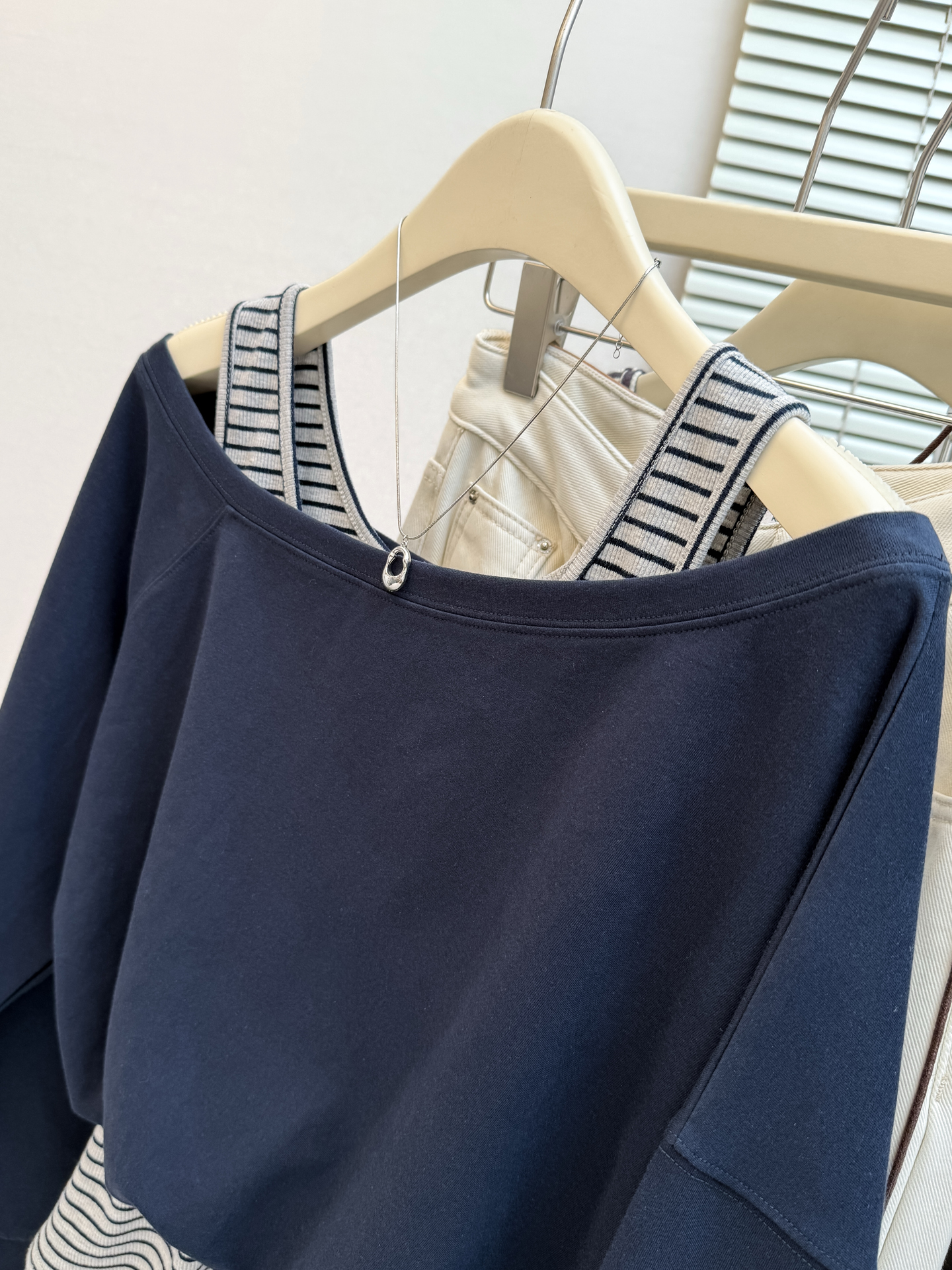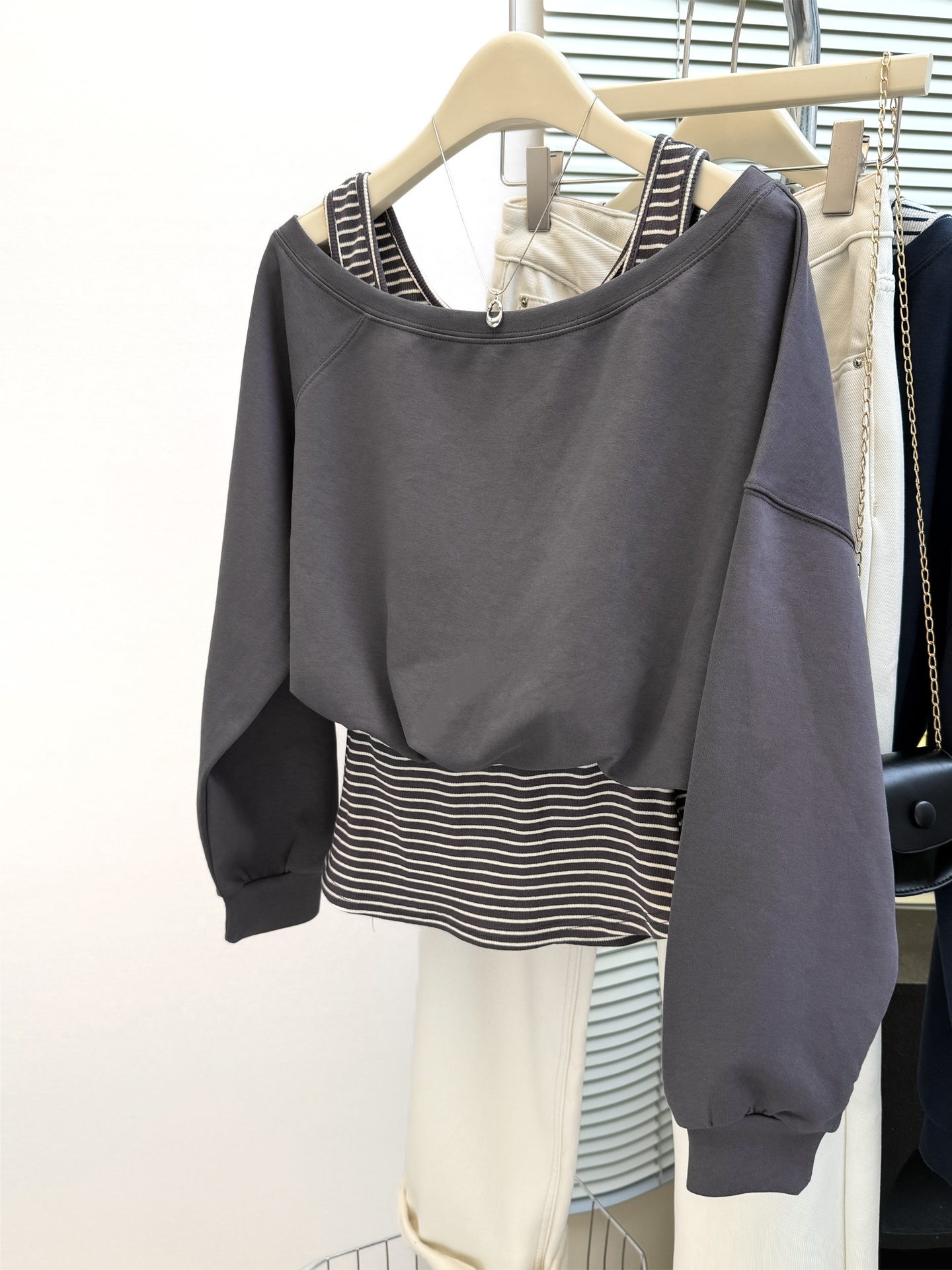 MY14921# 韩系字母印花一字肩长袖卫衣+修身背心套装新假两件套女裝貨源服裝批發