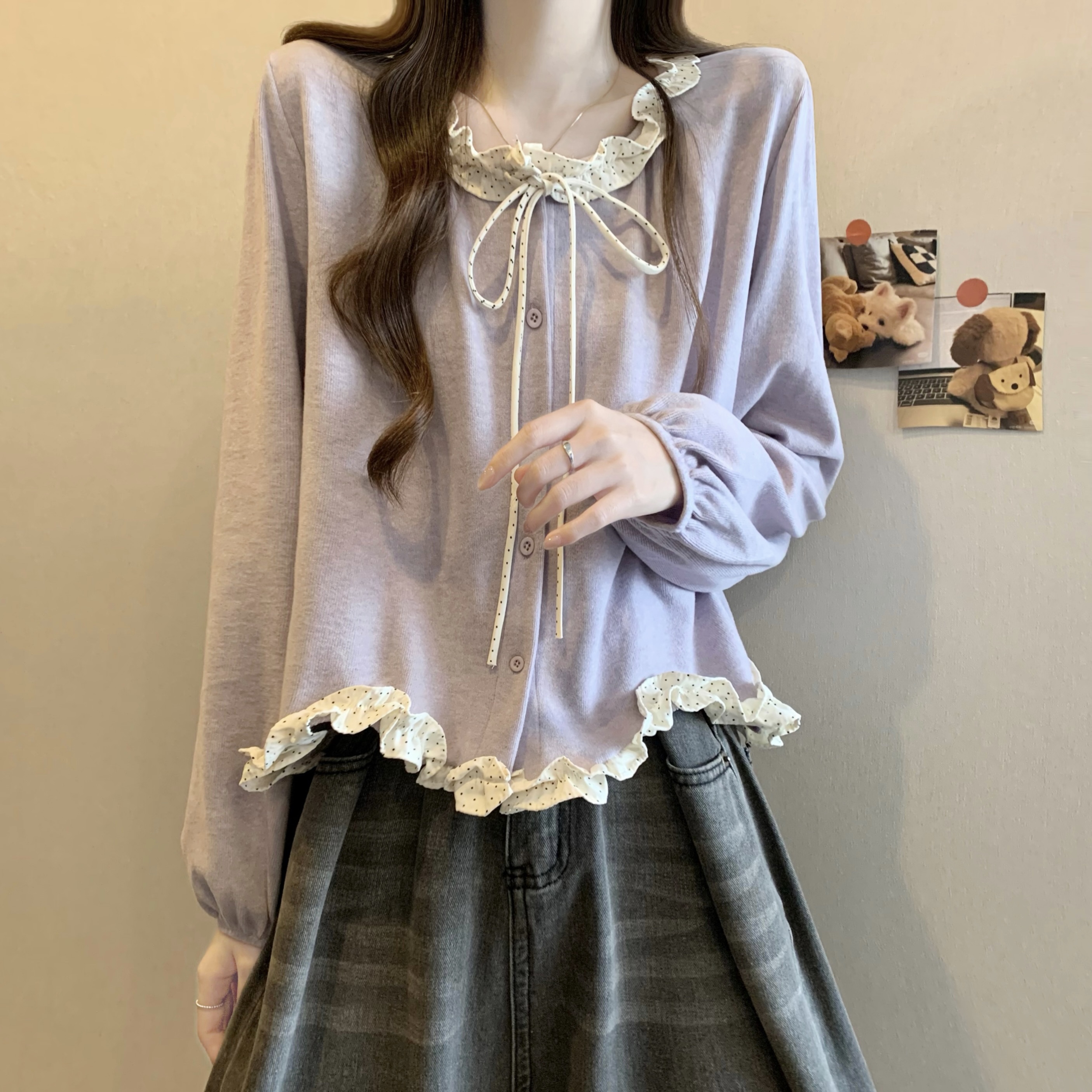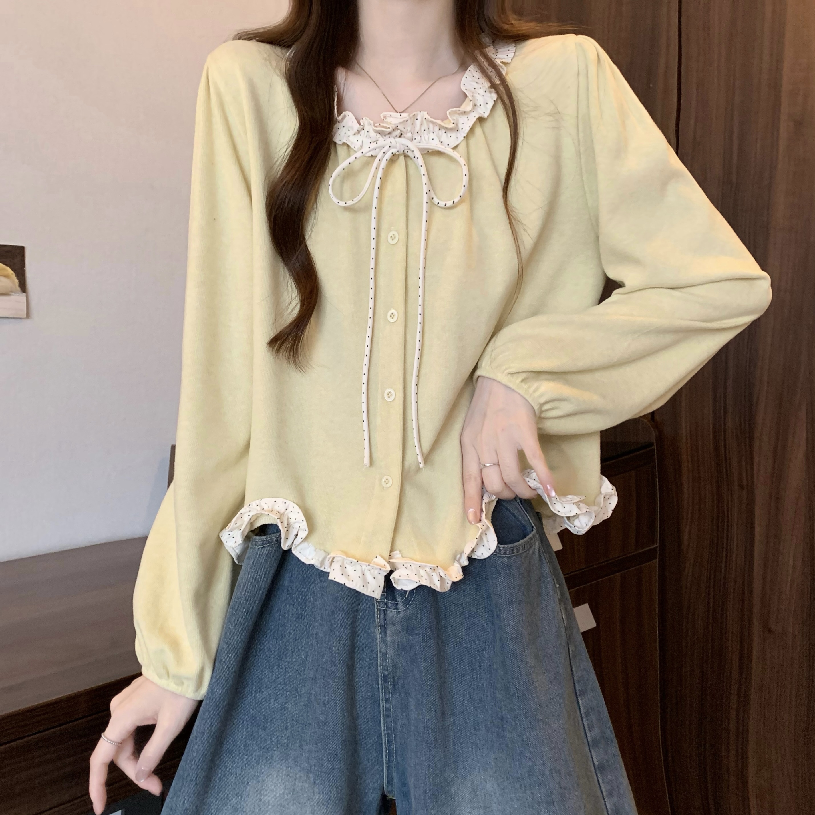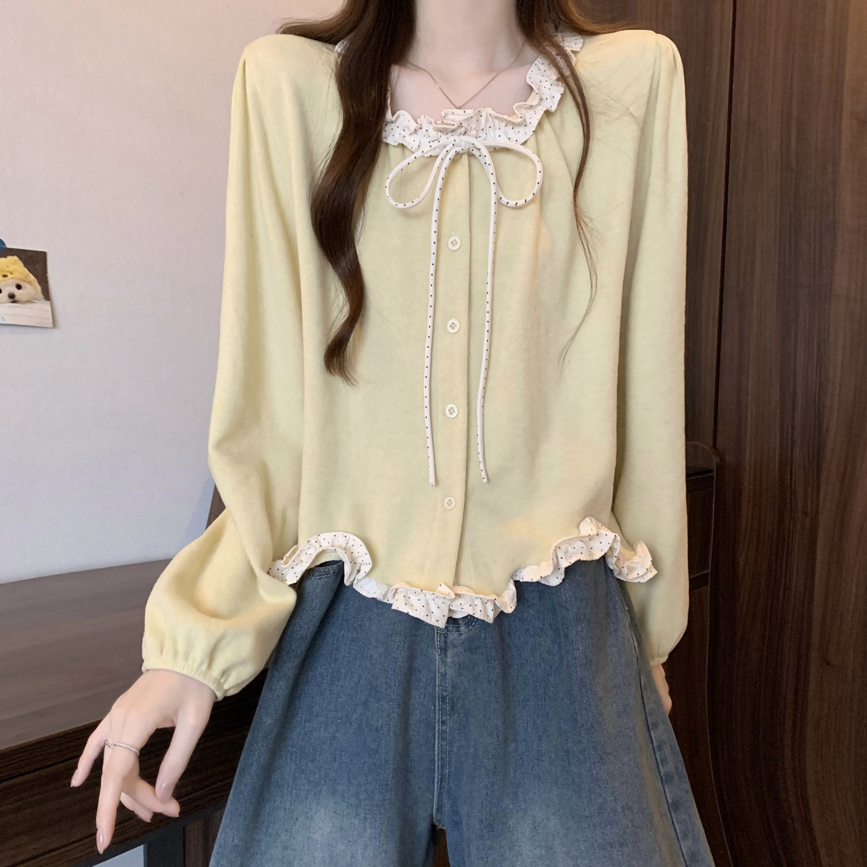MY15000# 新版法式气质泡泡袖木耳边蝴蝶结系带上衣女裝貨源服裝批發