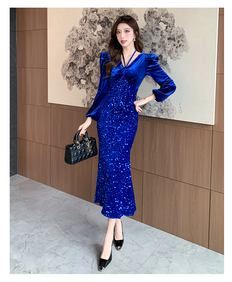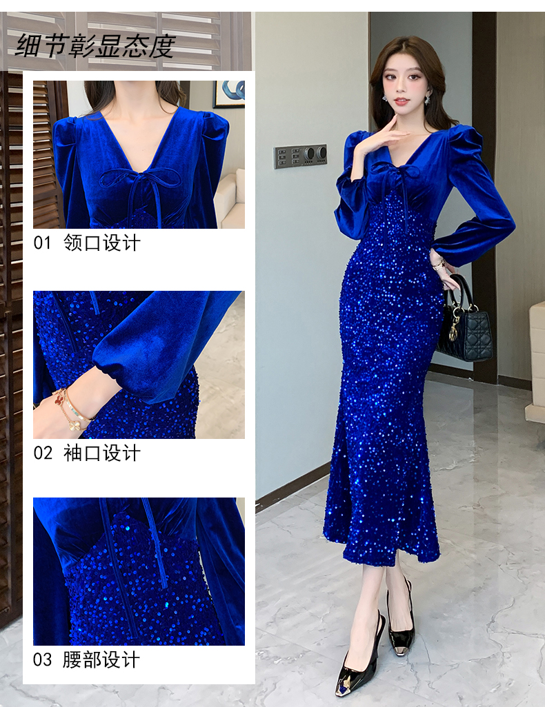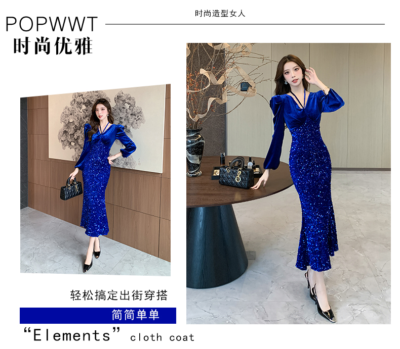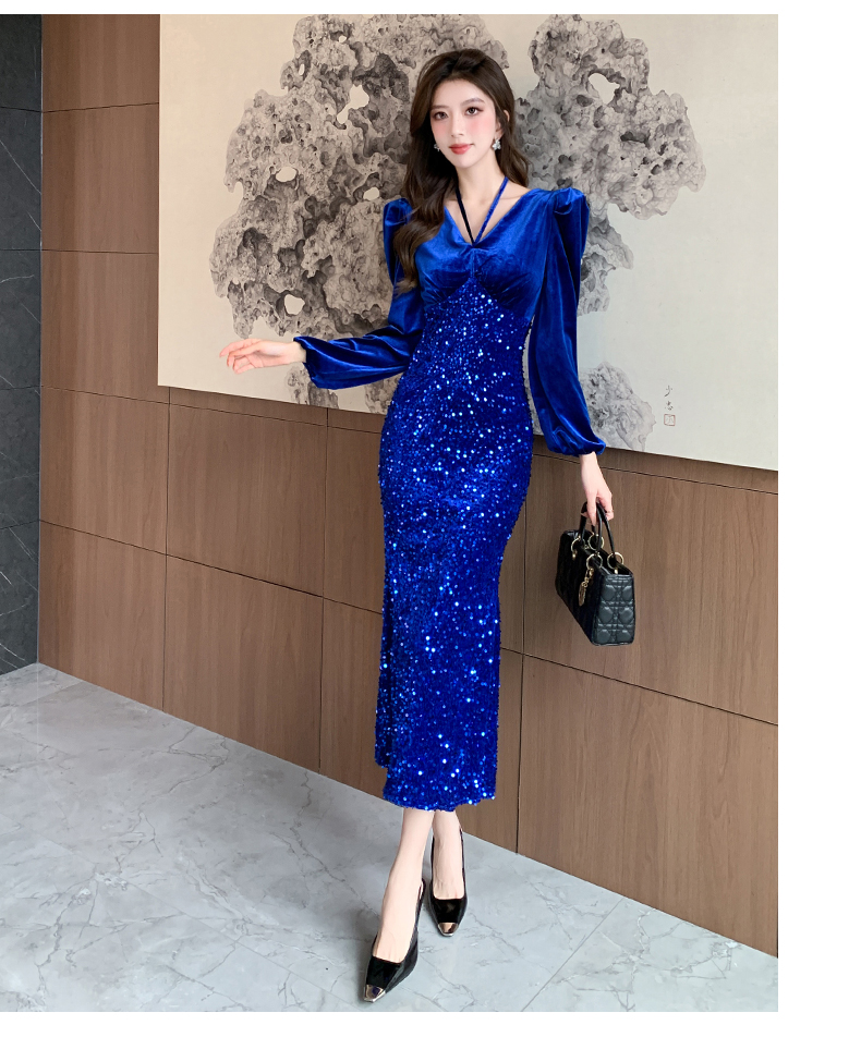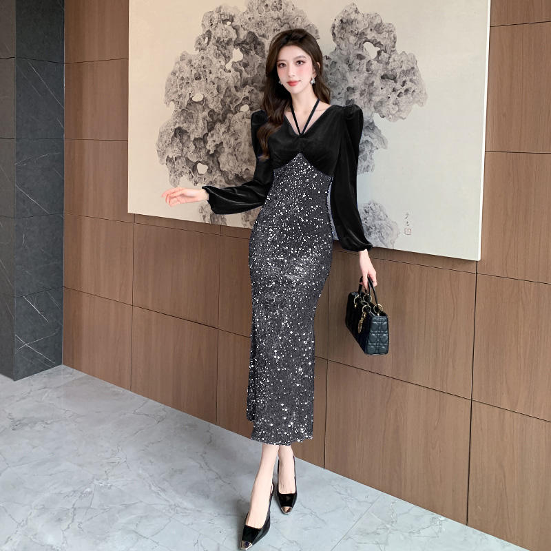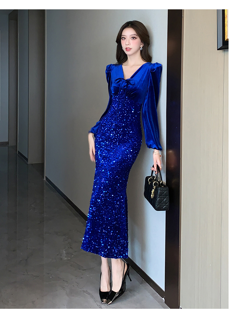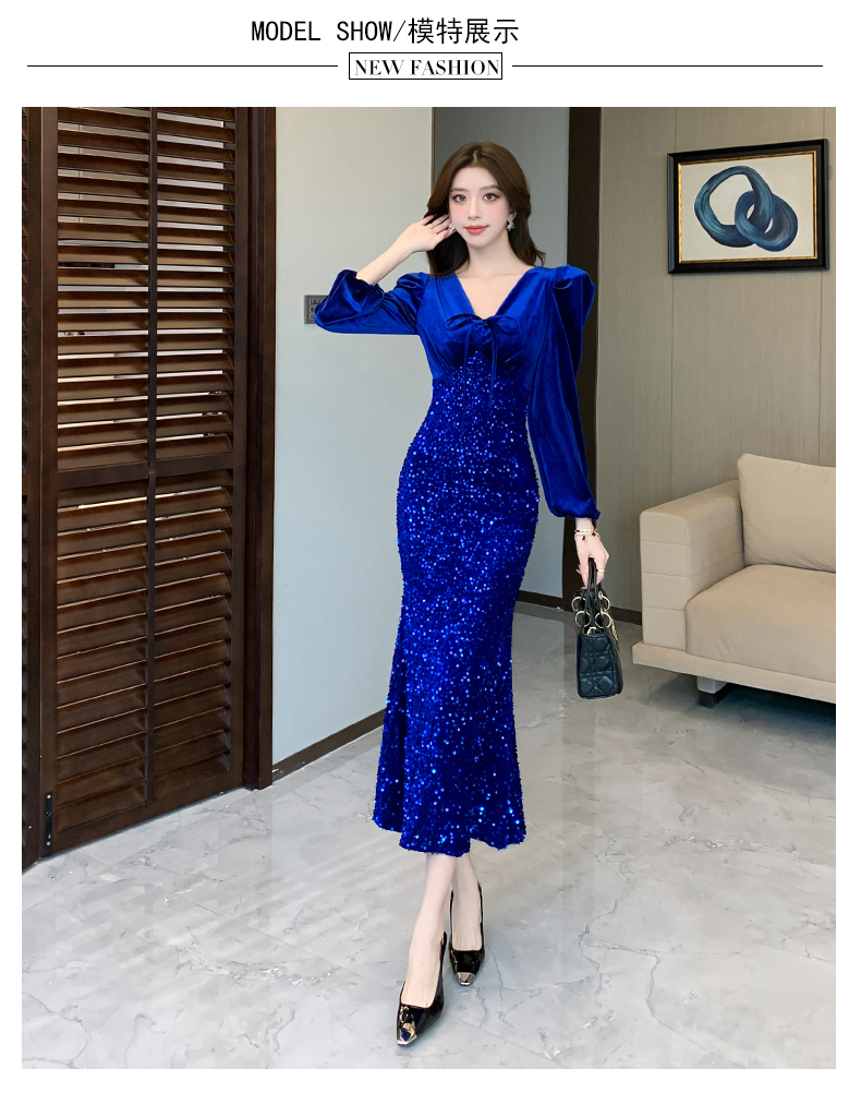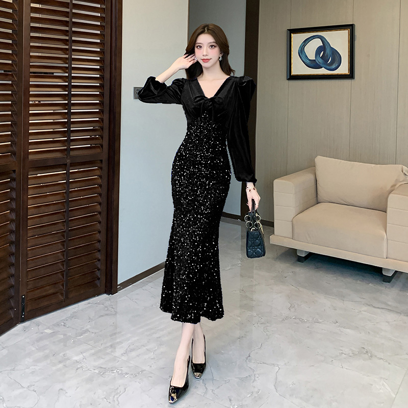 MY15010# 新款v领金丝绒亮片长裙包臀连衣裙女裝貨源服裝批發