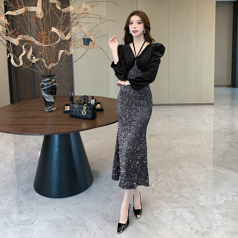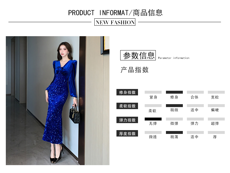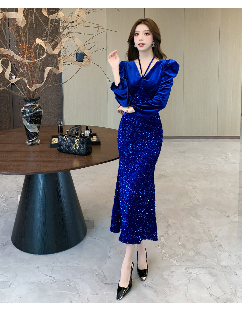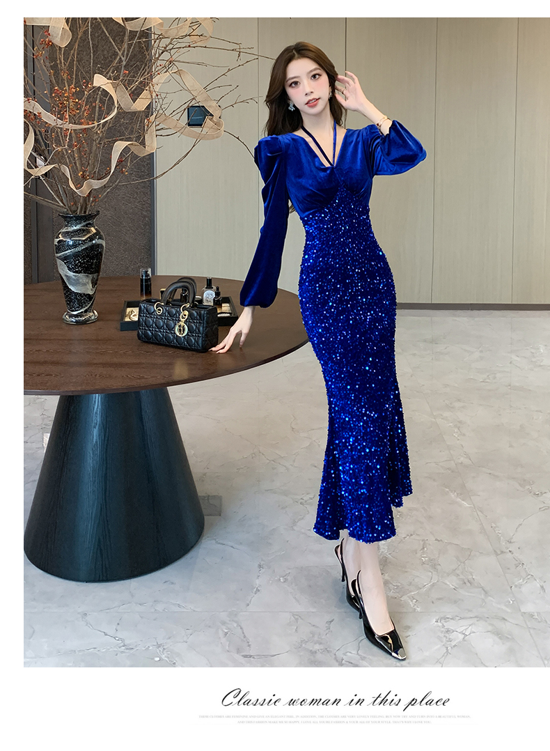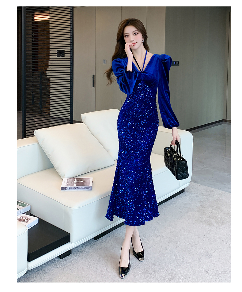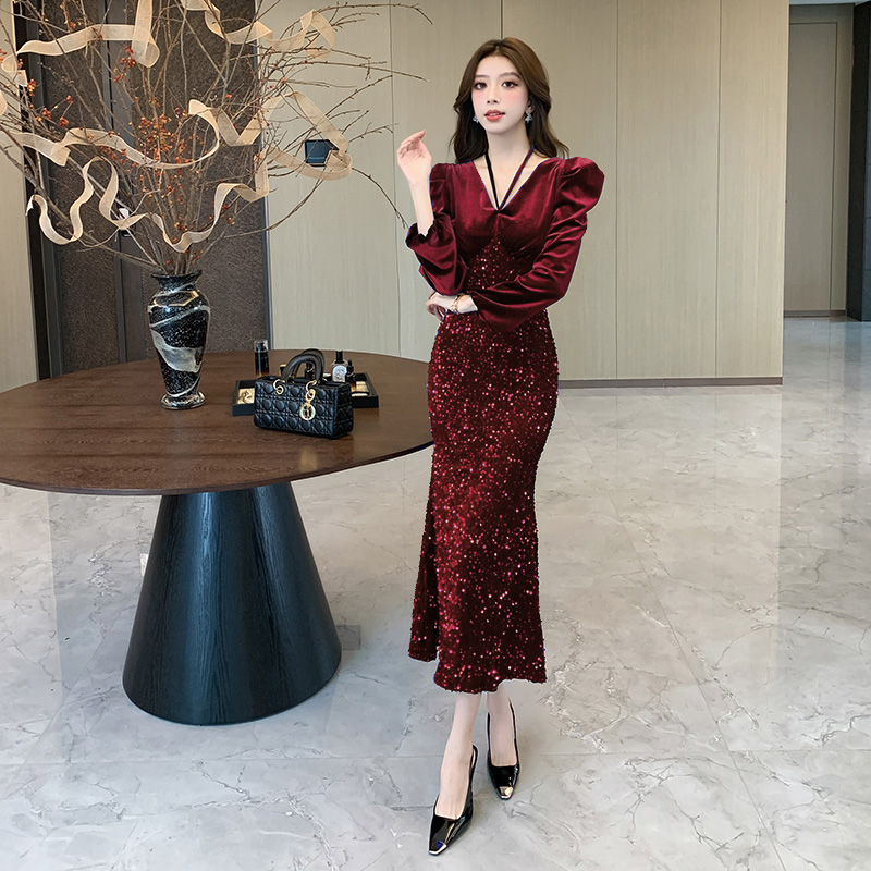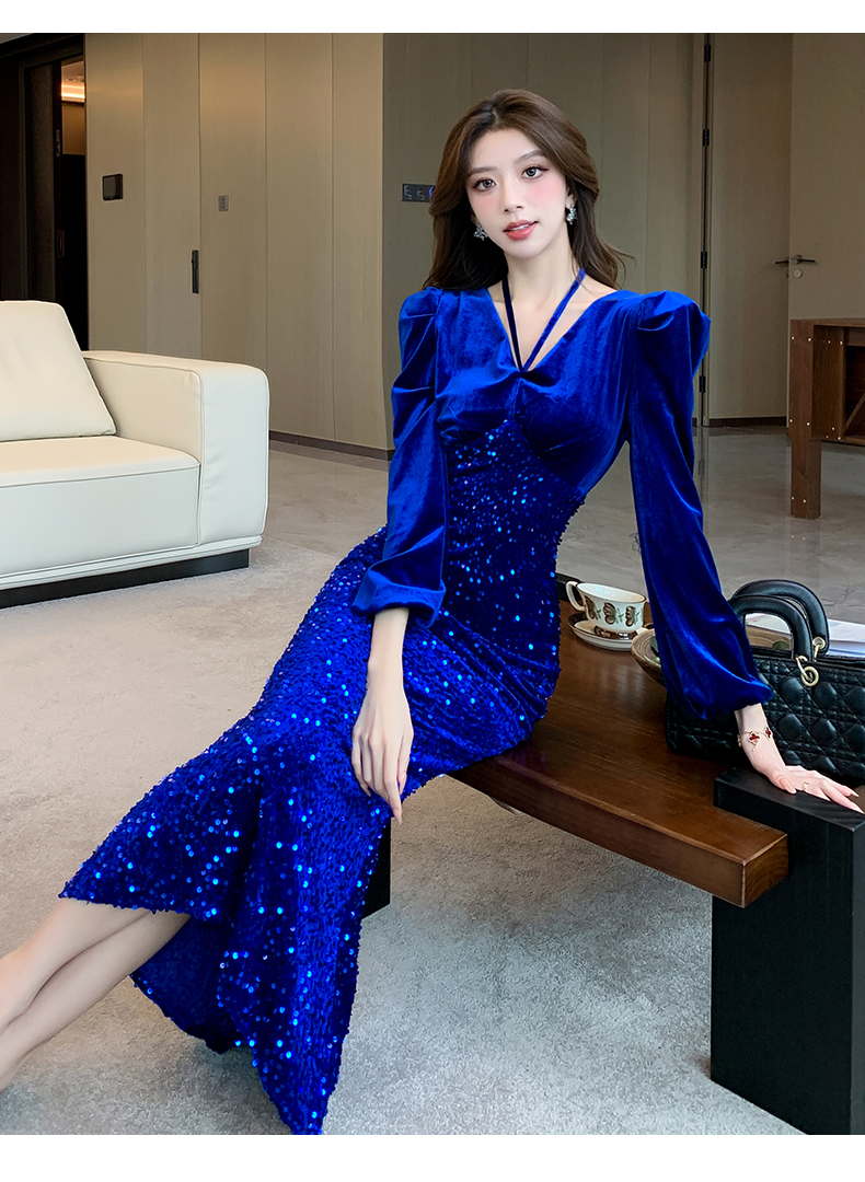 MY15010# 新款v领金丝绒亮片长裙包臀连衣裙女裝貨源服裝批發