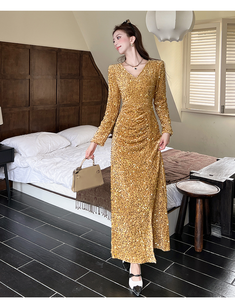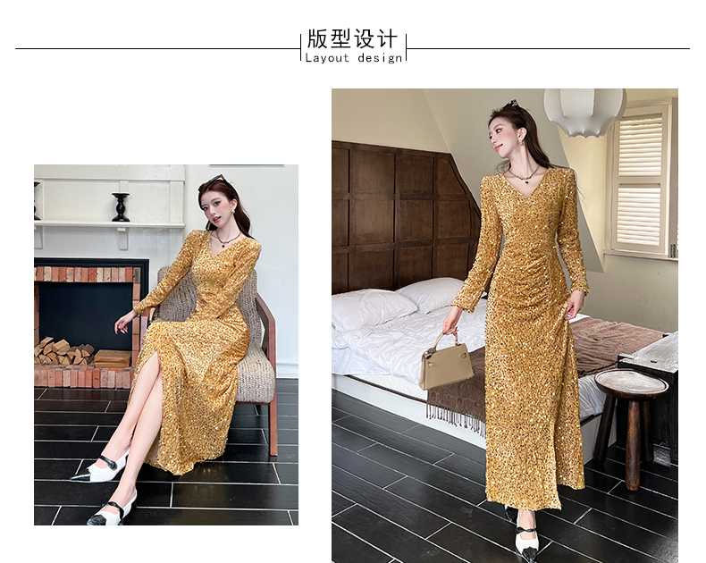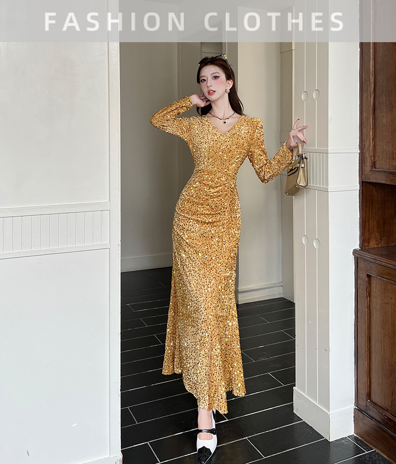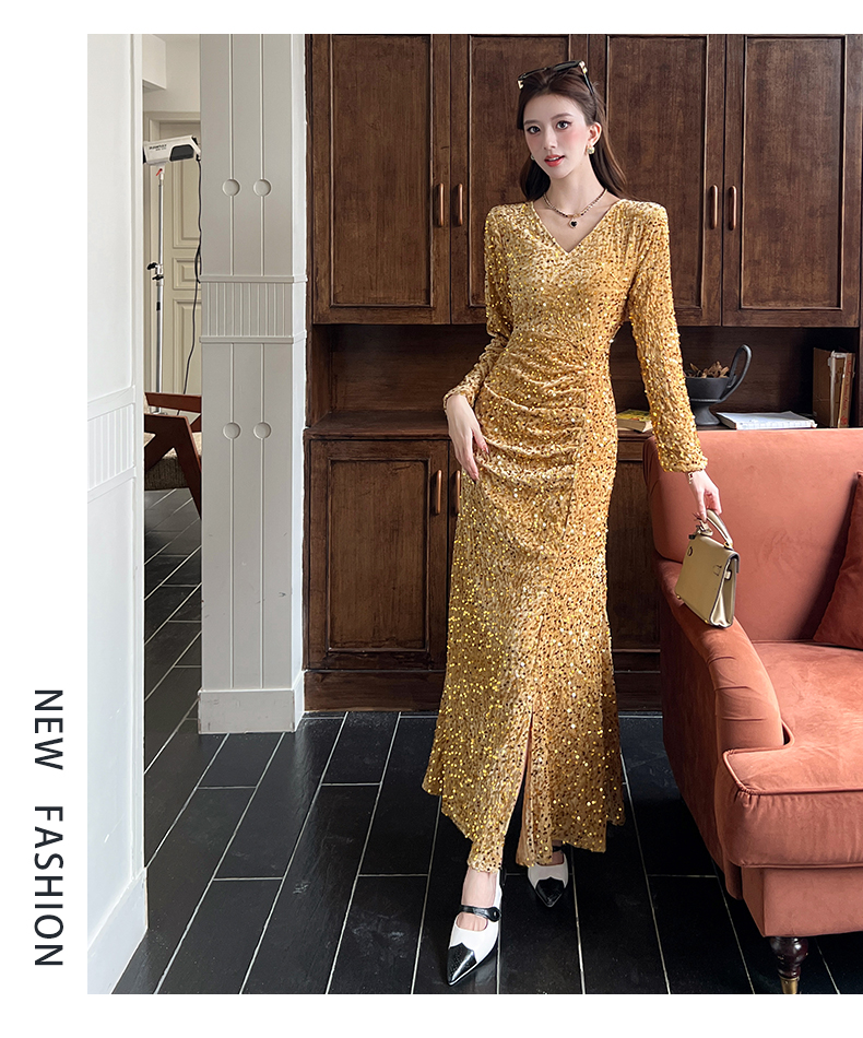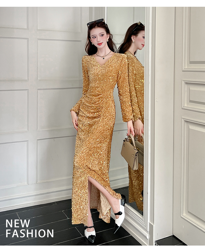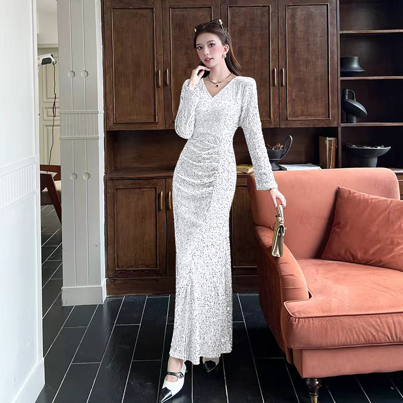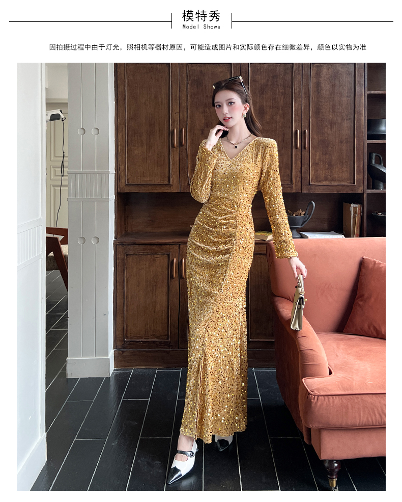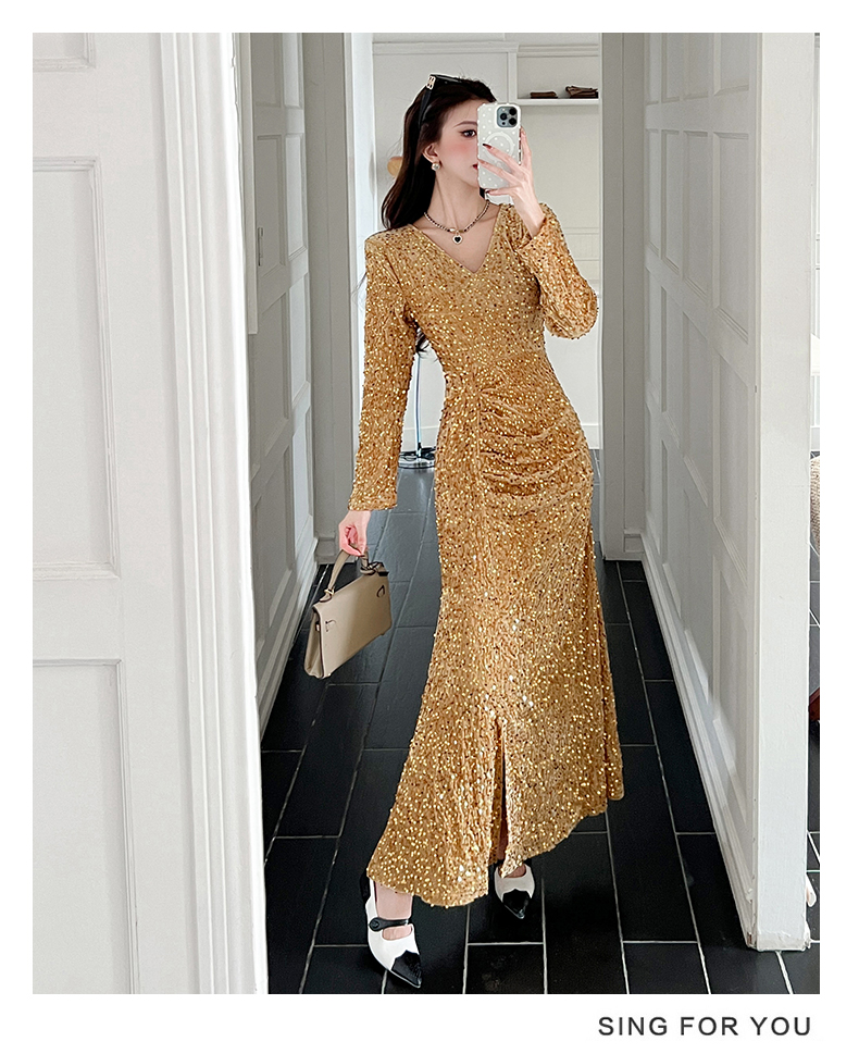 MY15017# 时尚气质亮片v领长裙包臀连衣裙女裝貨源服裝批發