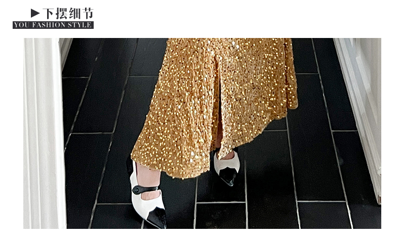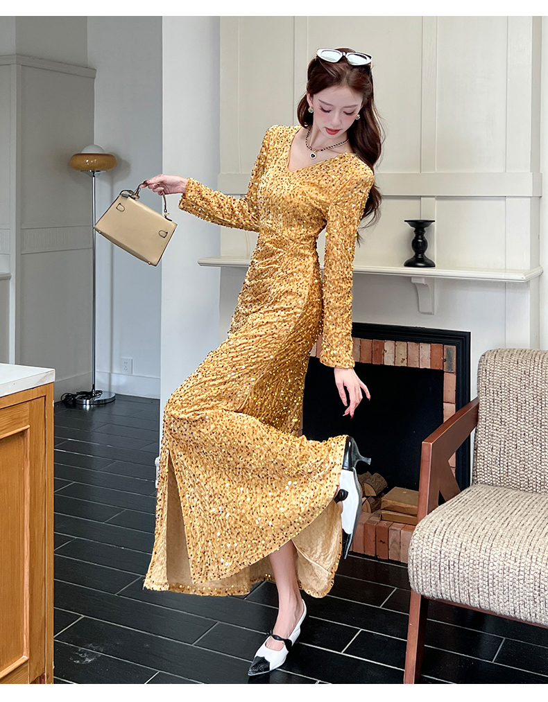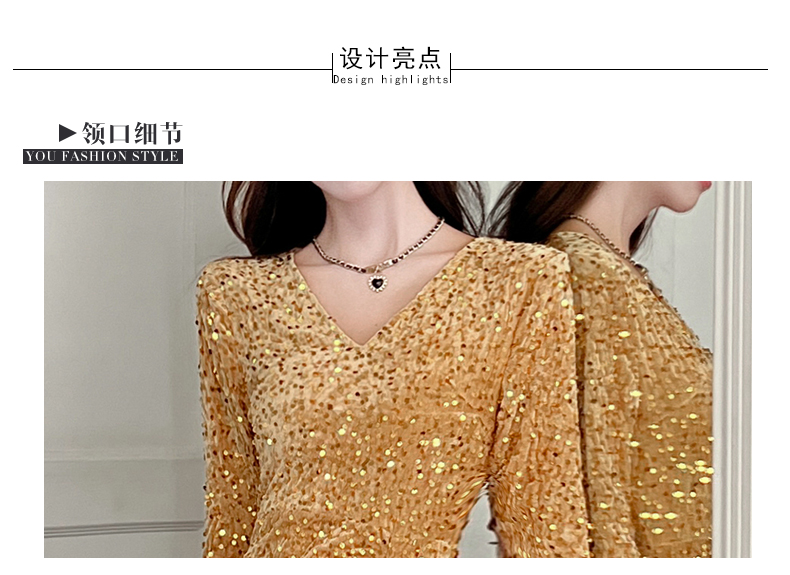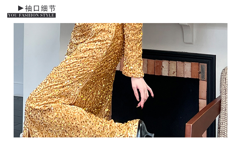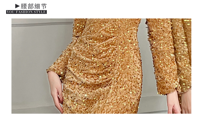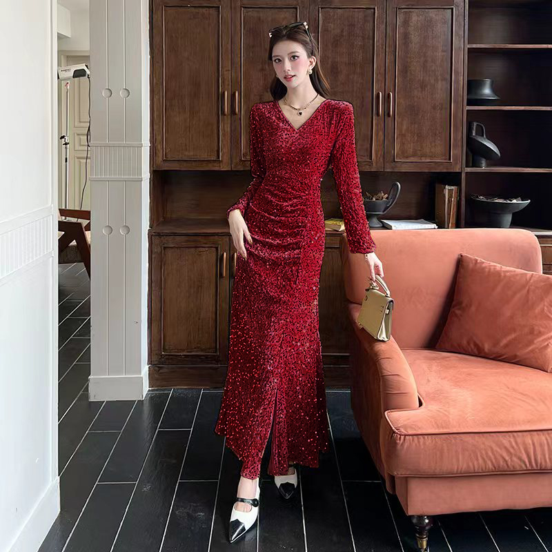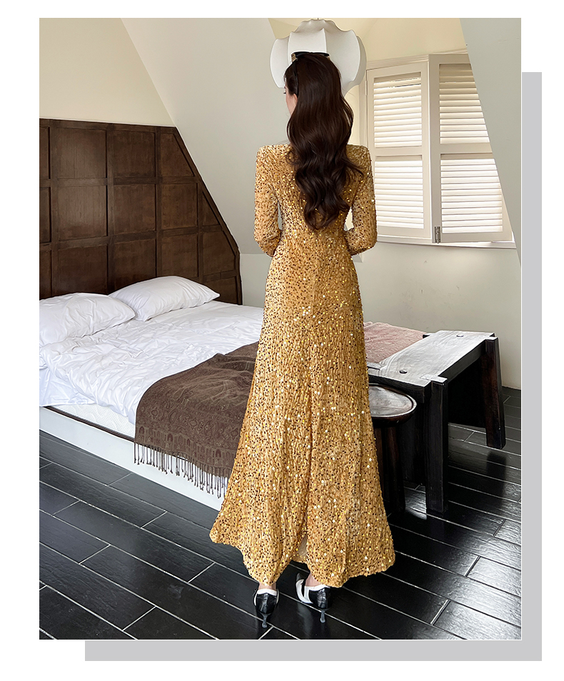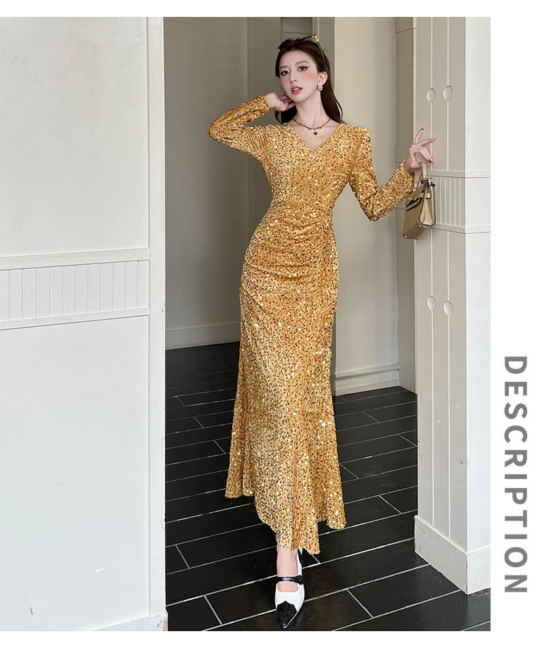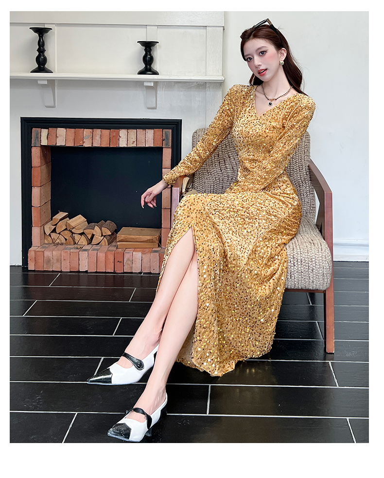 MY15017# 时尚气质亮片v领长裙包臀连衣裙女裝貨源服裝批發