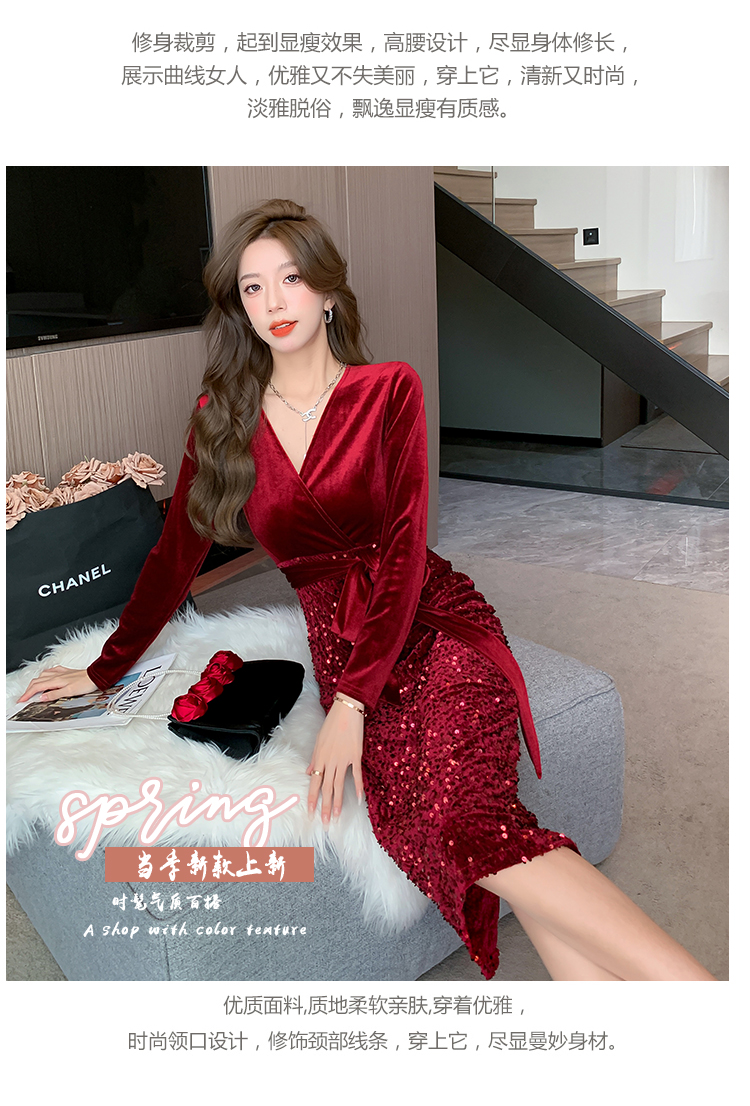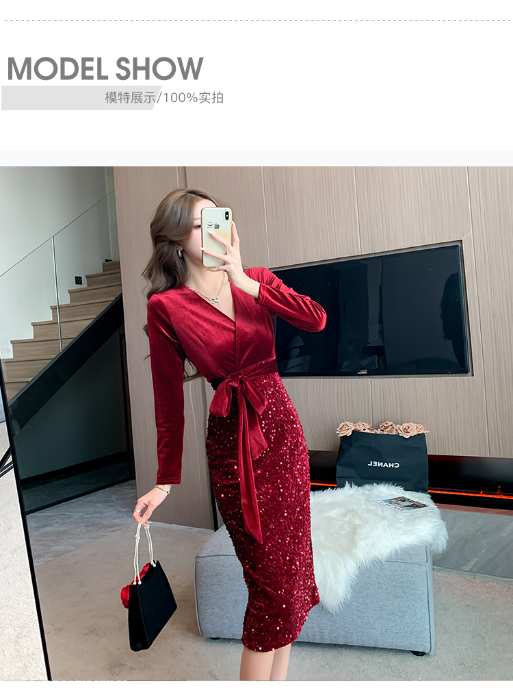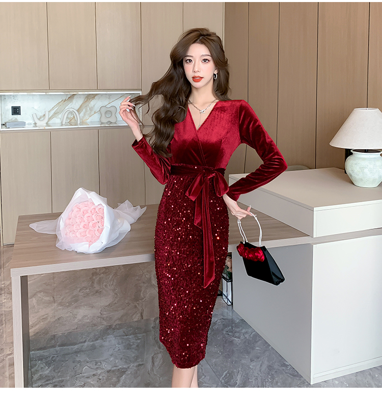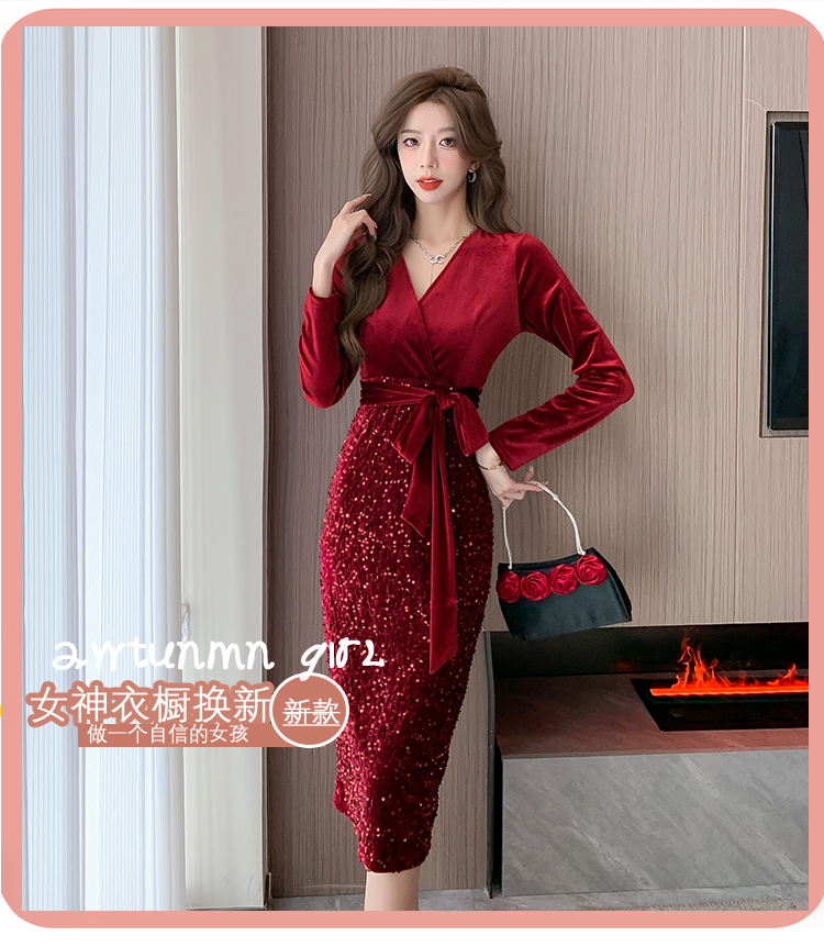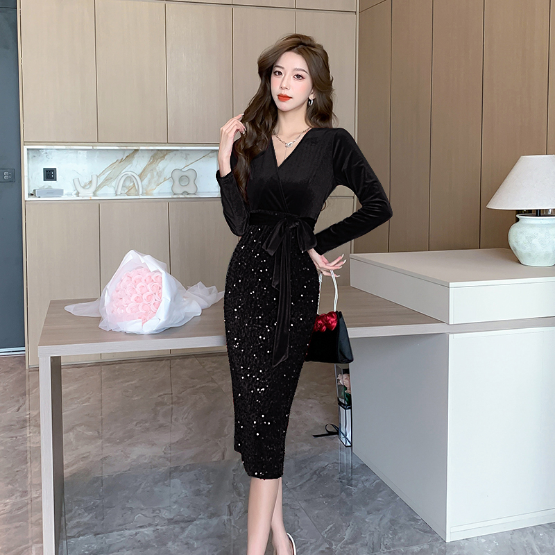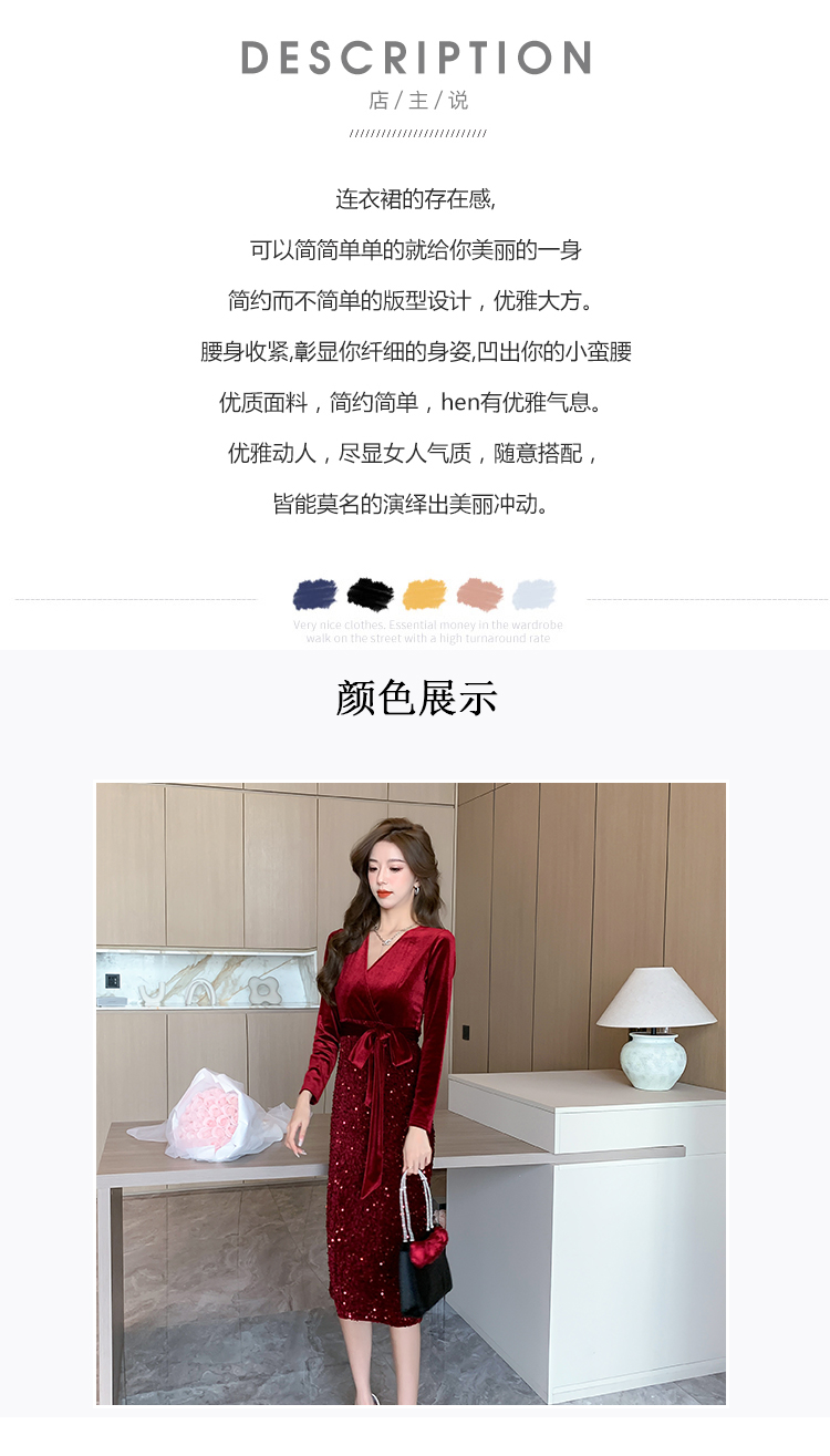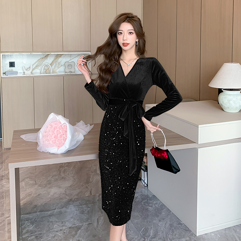 MY15019# 新款时尚v领高贵优雅金丝绒紧身包臀长裙连衣裙女裝貨源服裝批發
