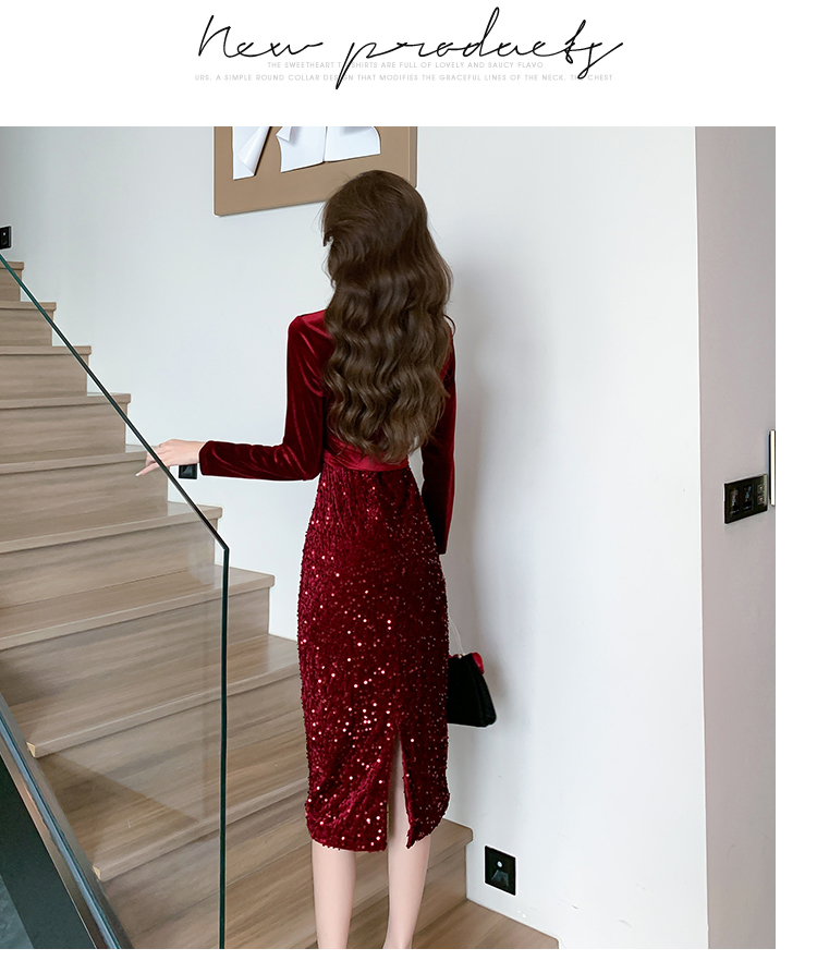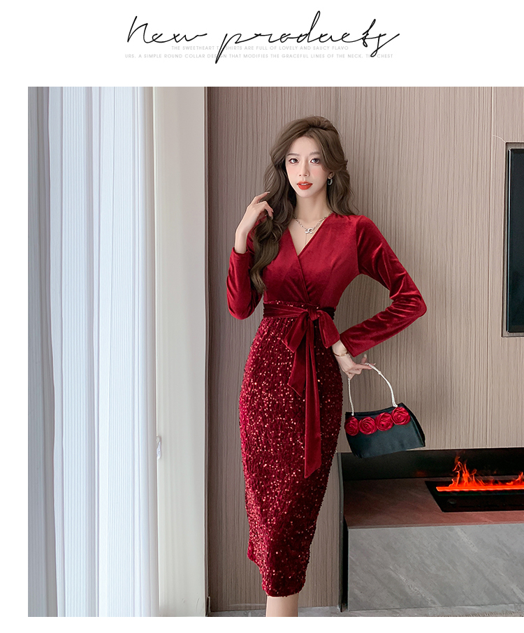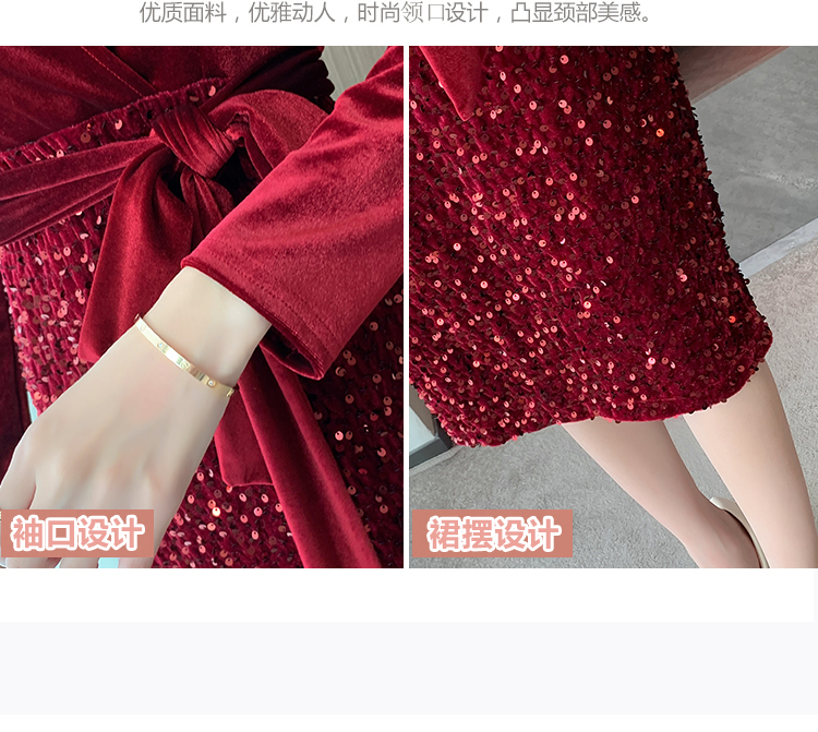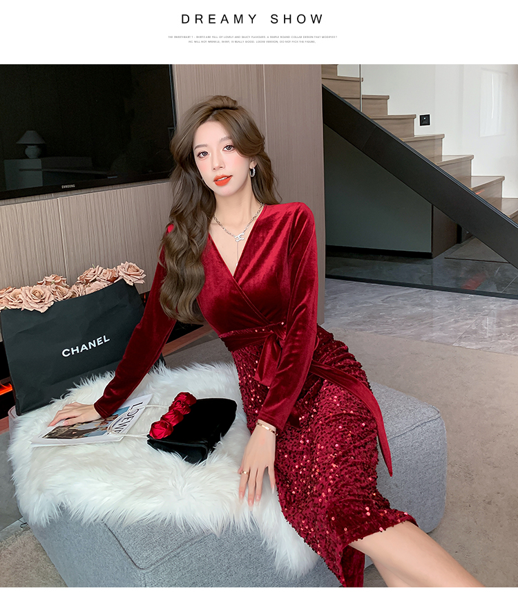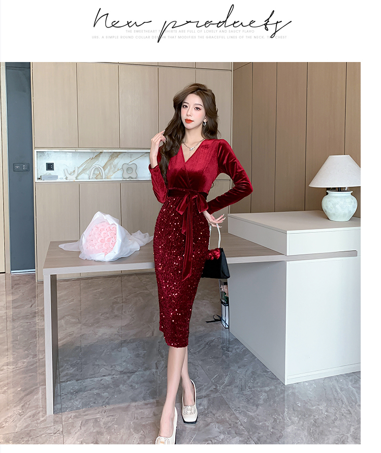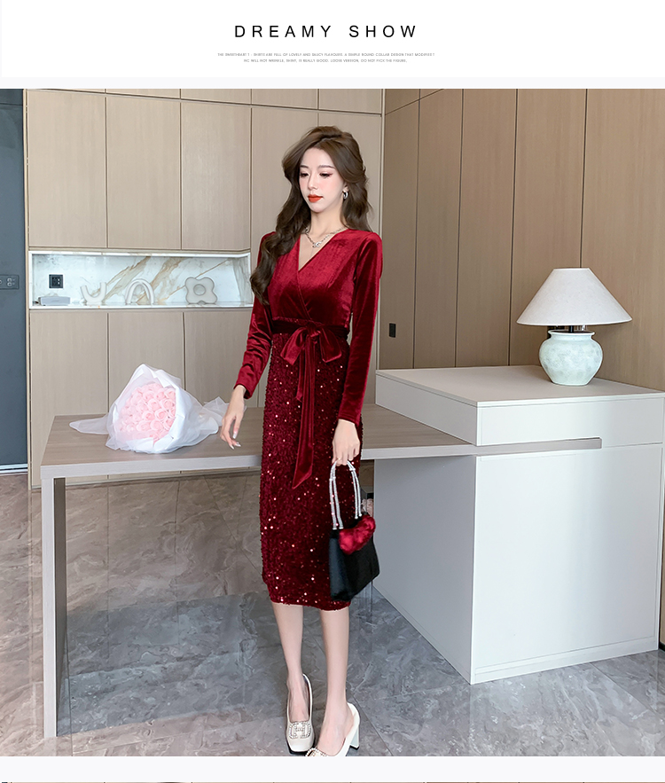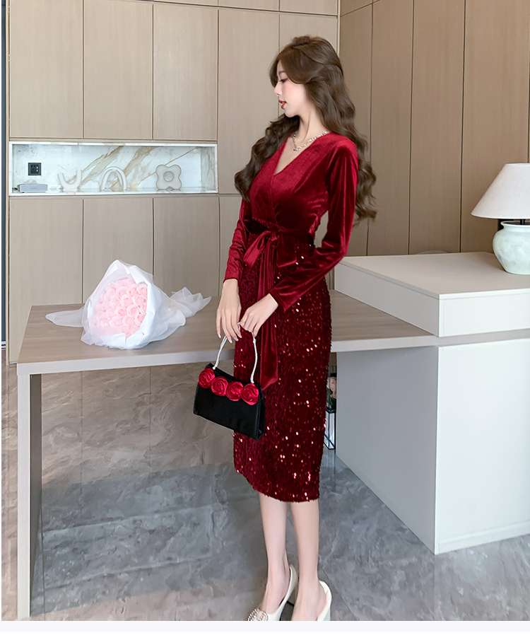 MY15019# 新款时尚v领高贵优雅金丝绒紧身包臀长裙连衣裙女裝貨源服裝批發