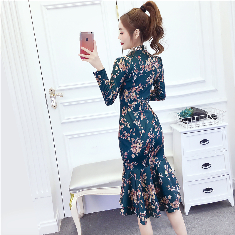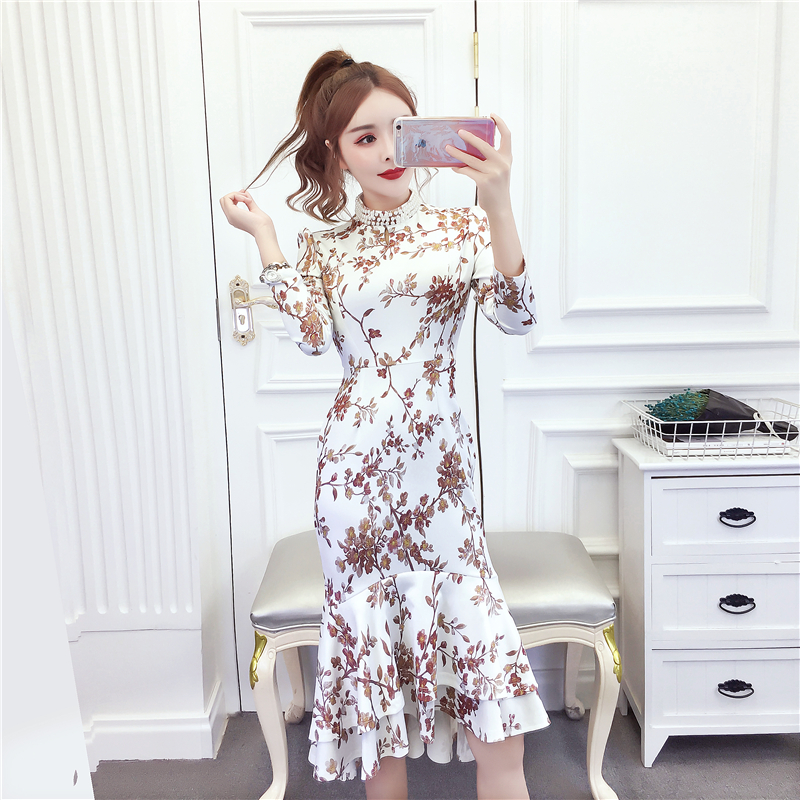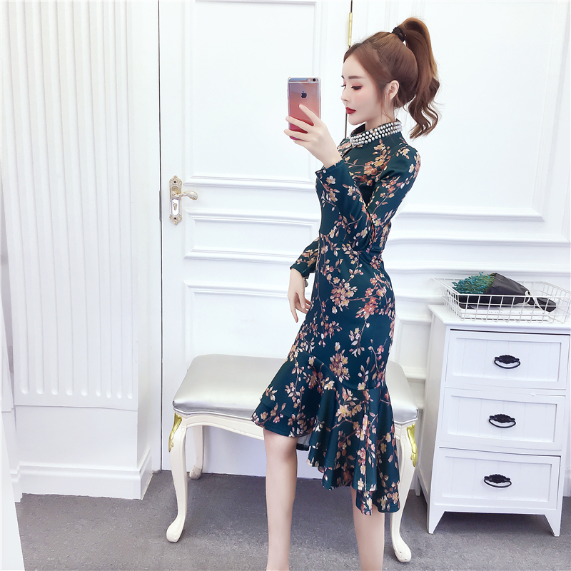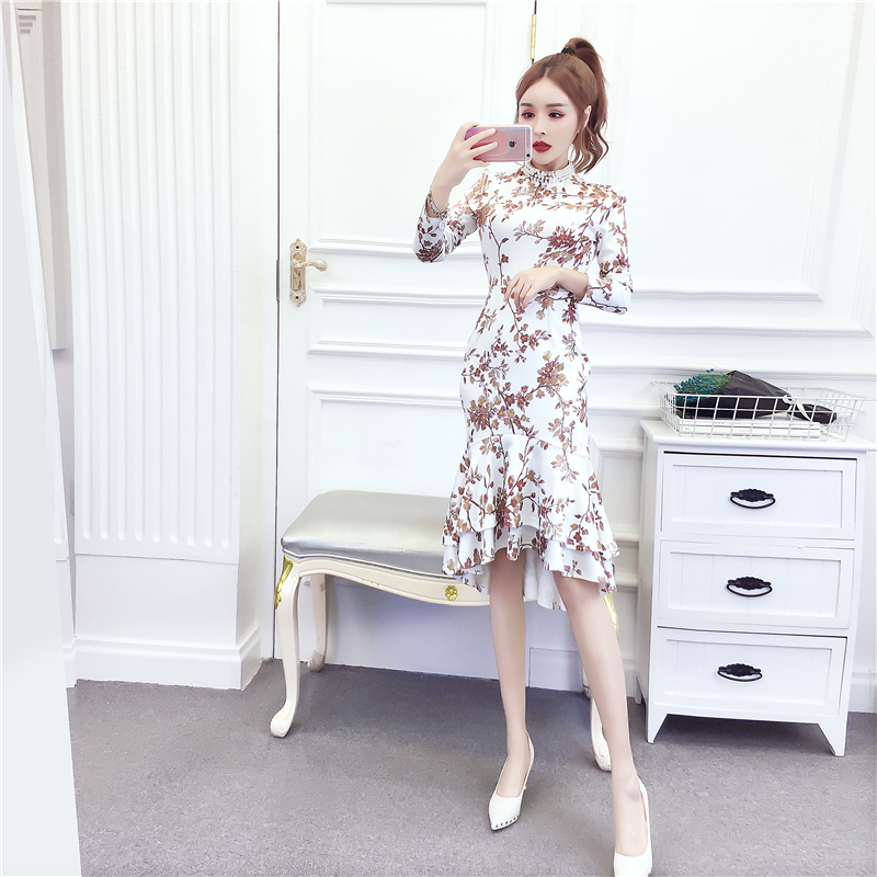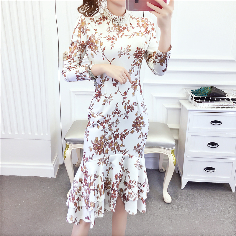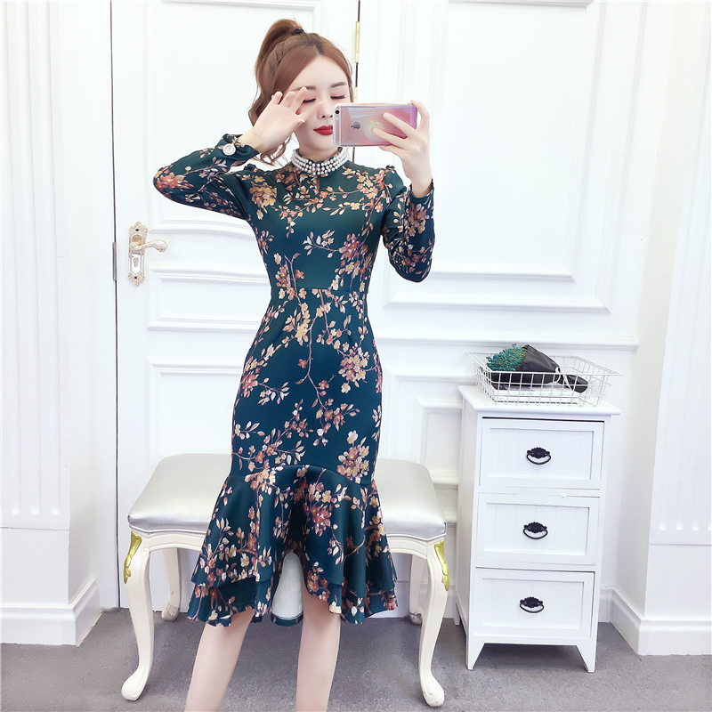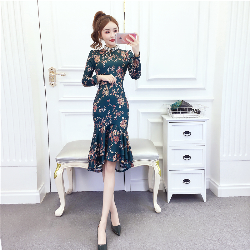 MY15025# 时尚气质显瘦洋气印花钉珠礼服长裙鱼尾连衣裙女裝貨源服裝批發