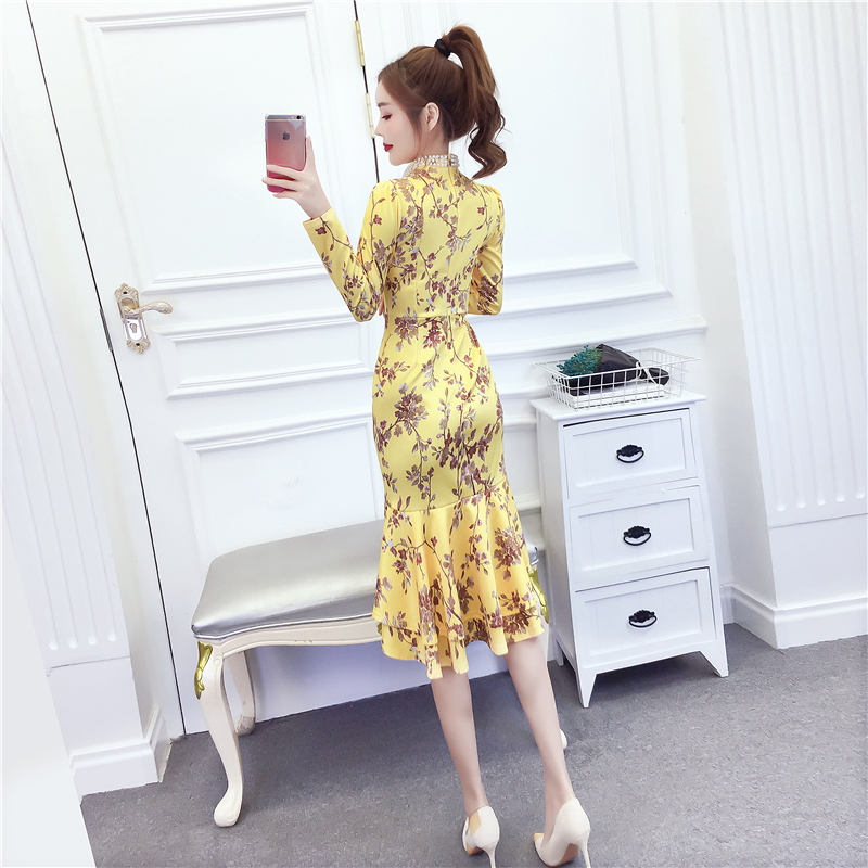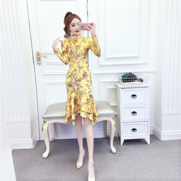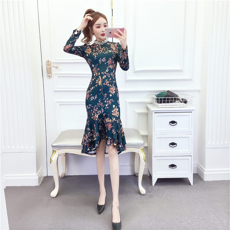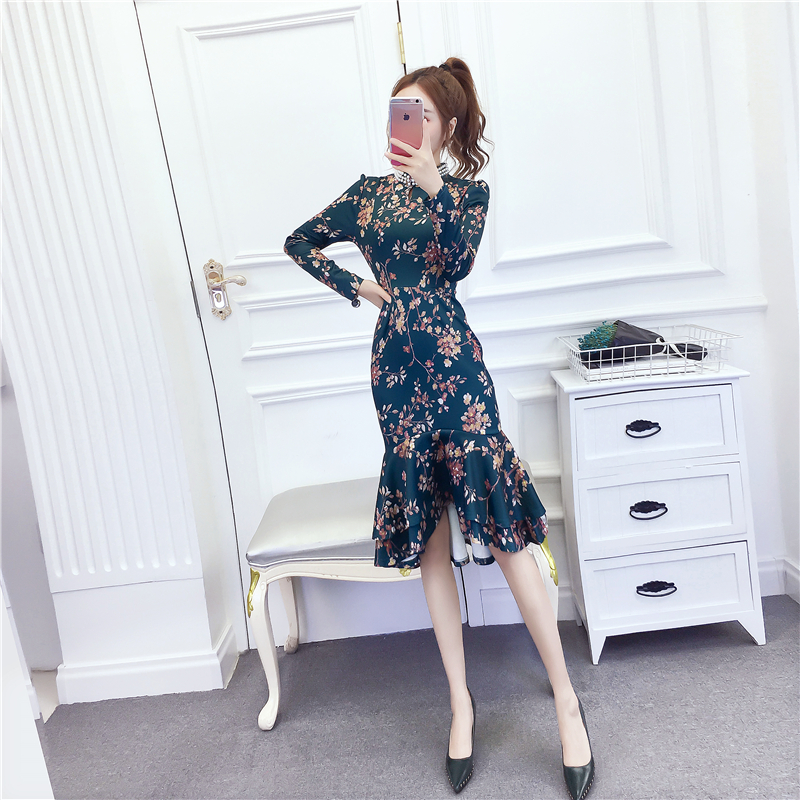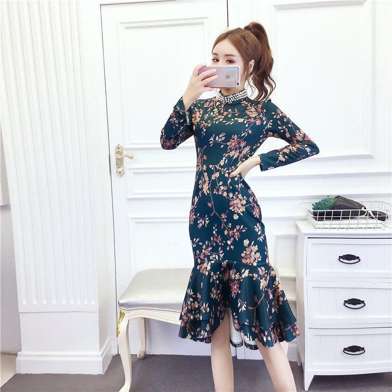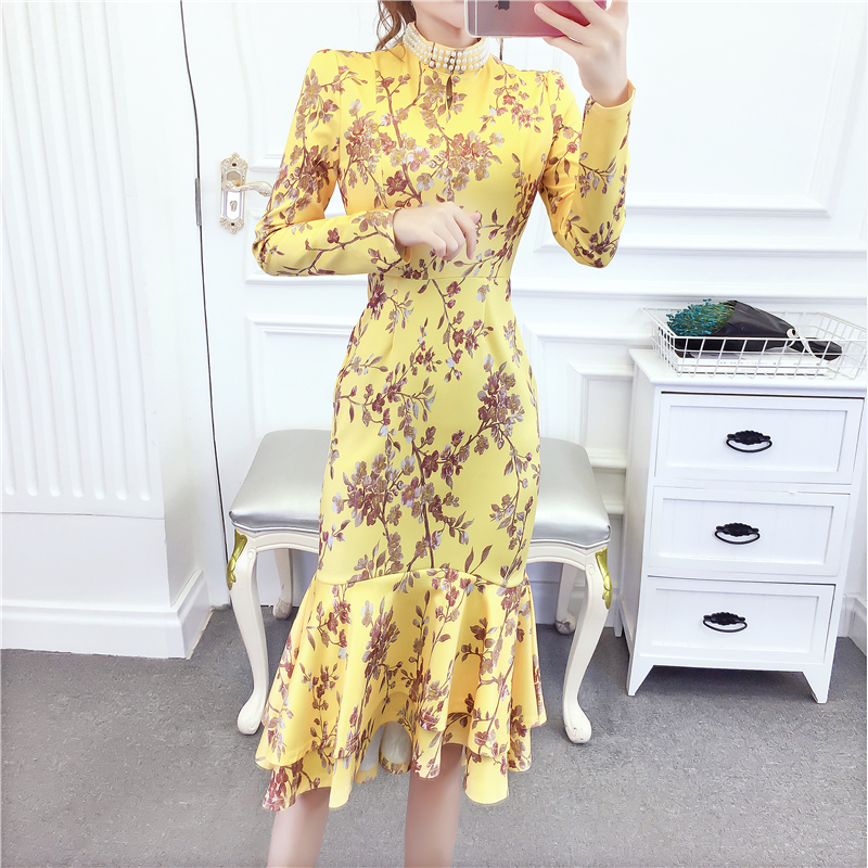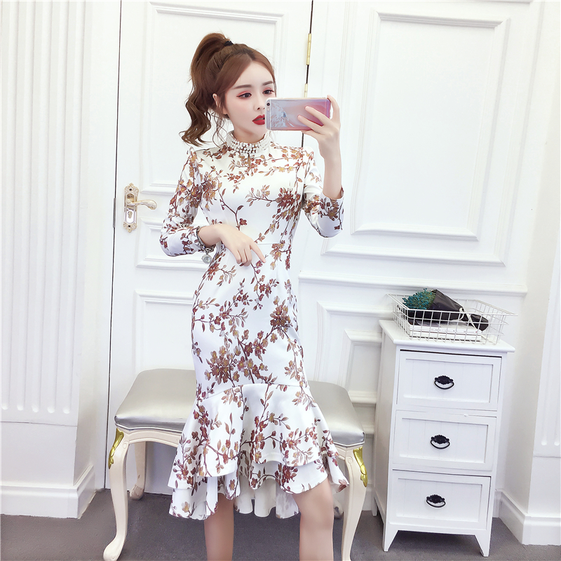 MY15025# 时尚气质显瘦洋气印花钉珠礼服长裙鱼尾连衣裙女裝貨源服裝批發