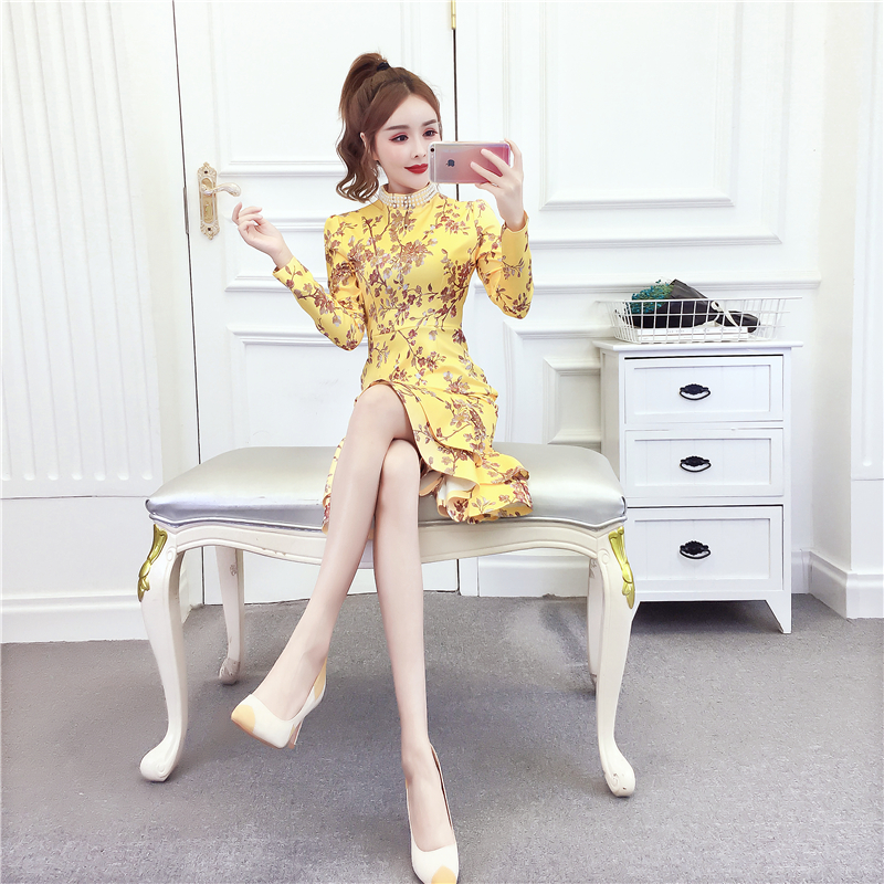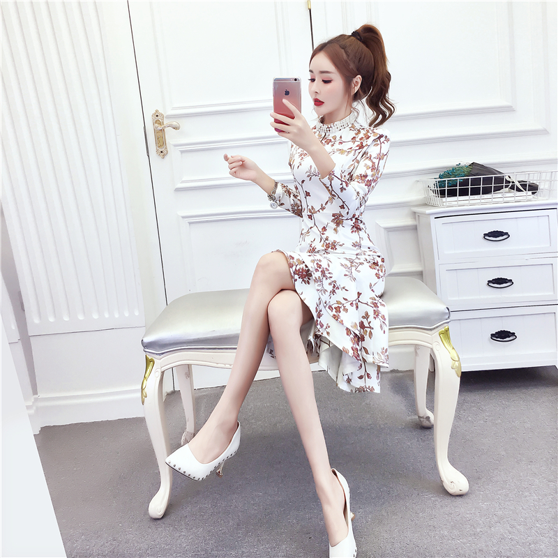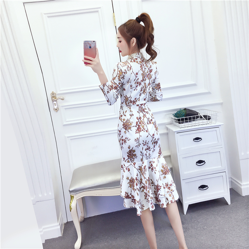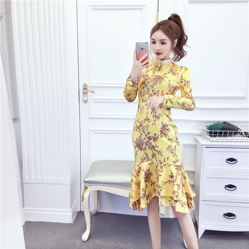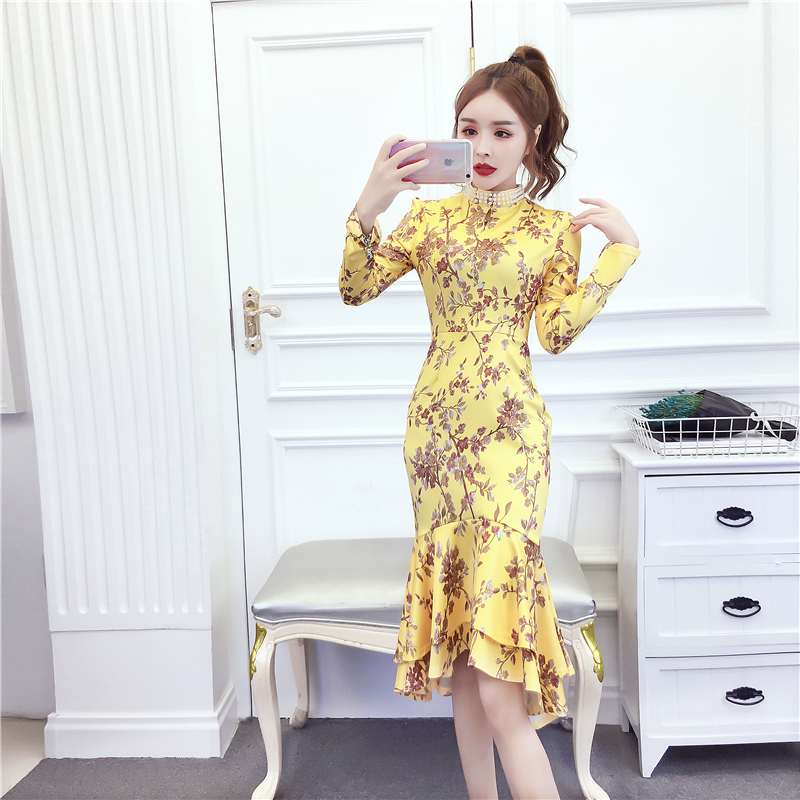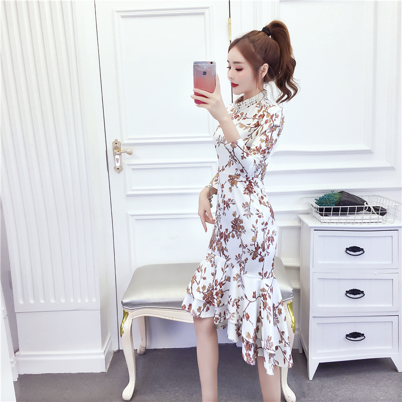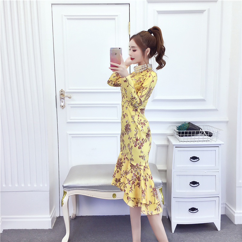 MY15025# 时尚气质显瘦洋气印花钉珠礼服长裙鱼尾连衣裙女裝貨源服裝批發
