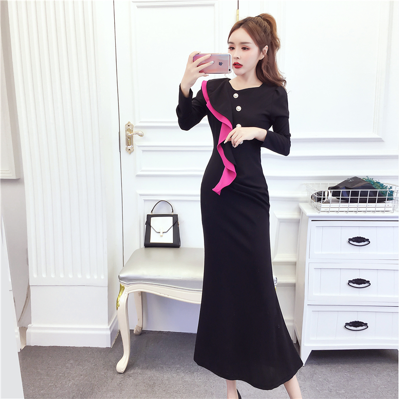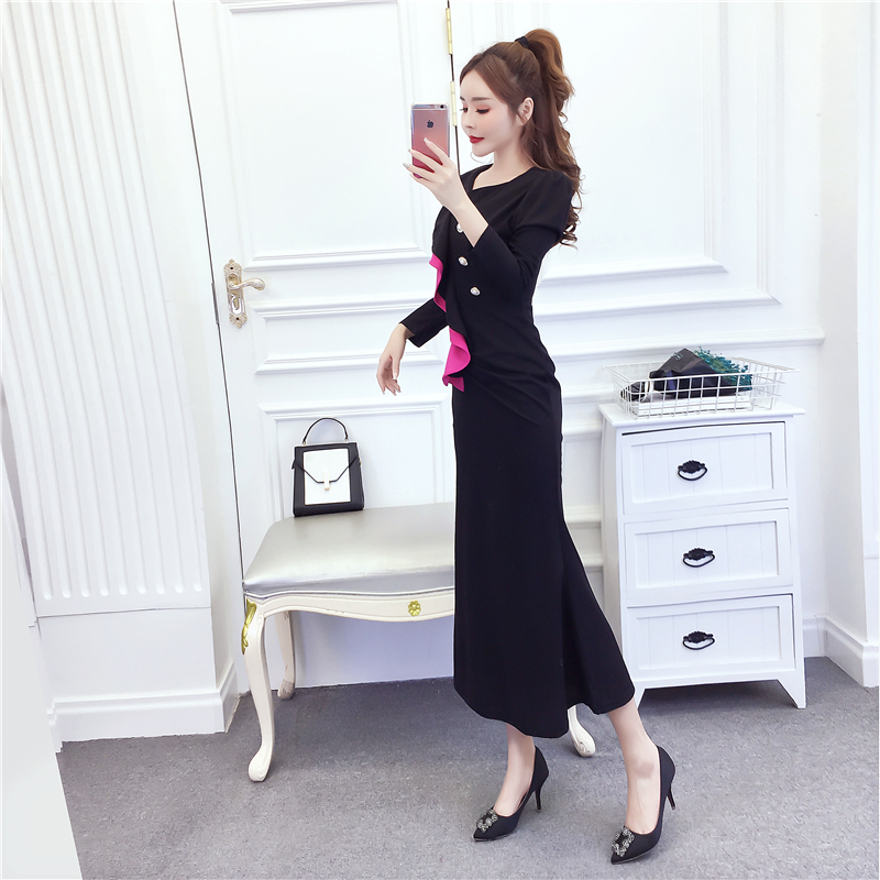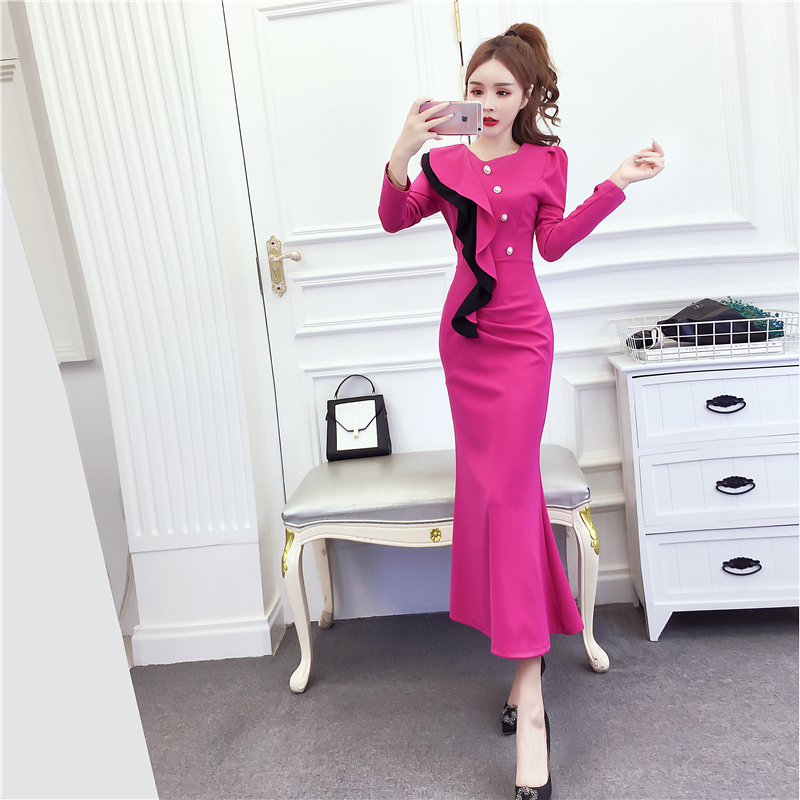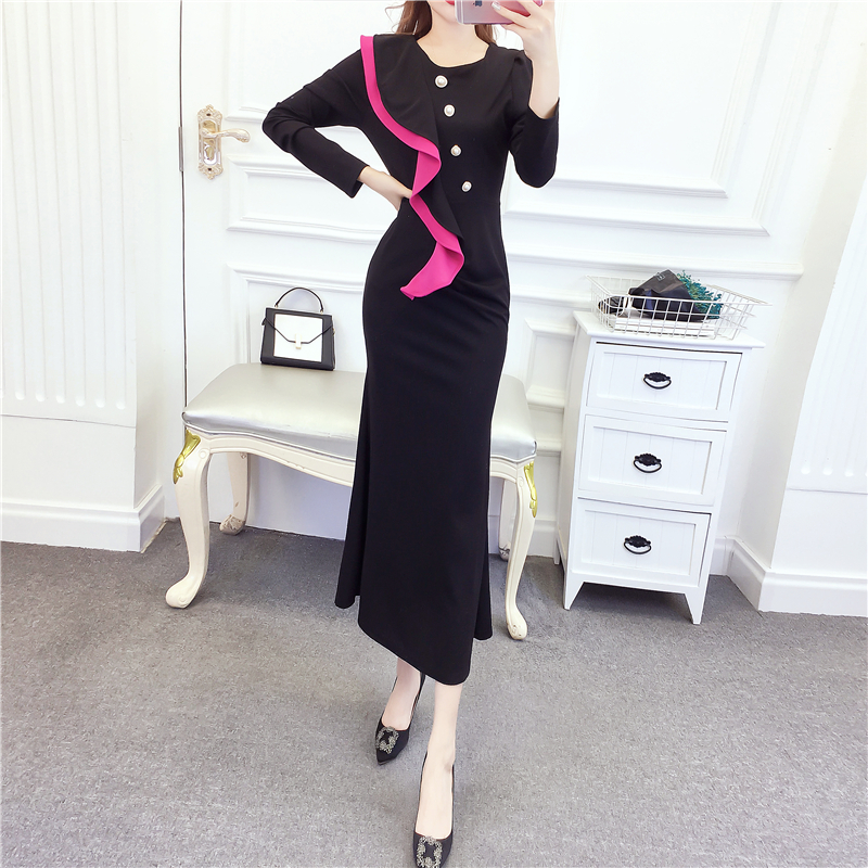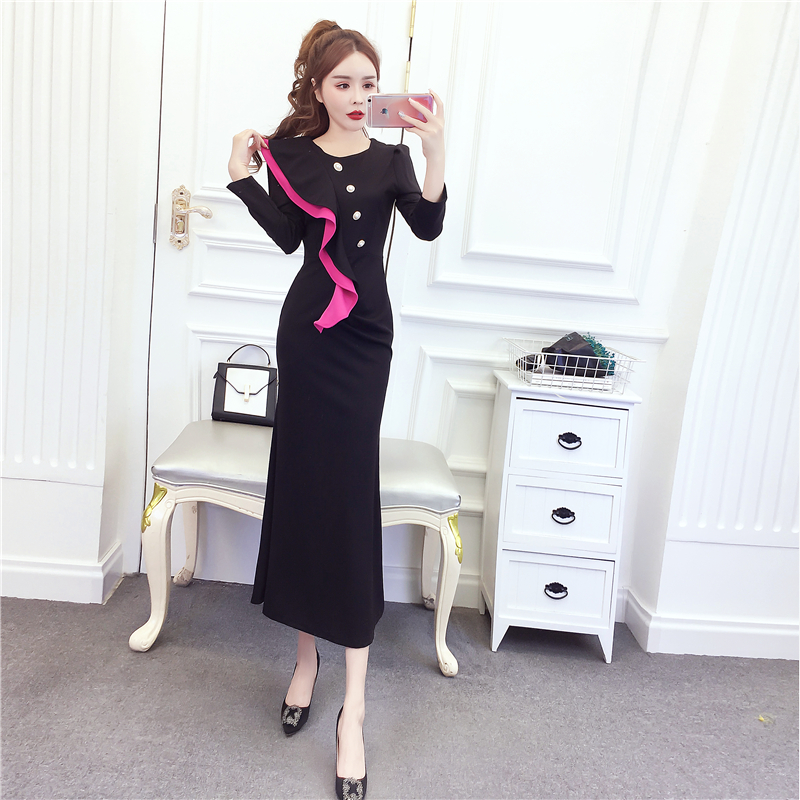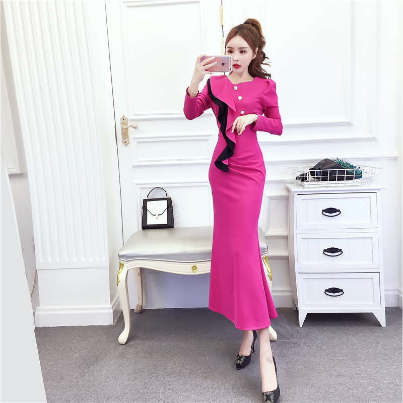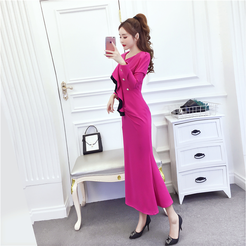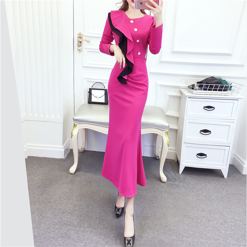 MY15026# 时尚网红气质v领修身荷叶边礼服长裙包臀连衣裙女裝貨源服裝批發