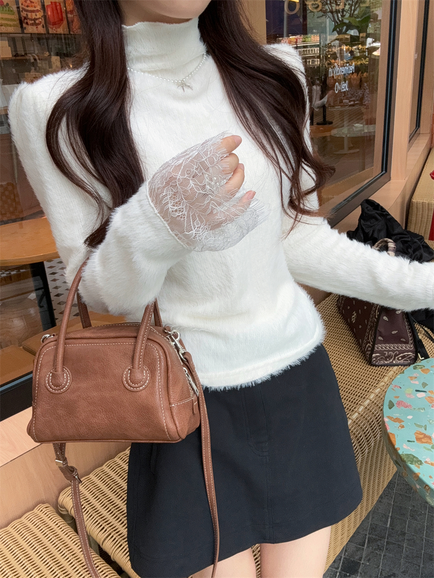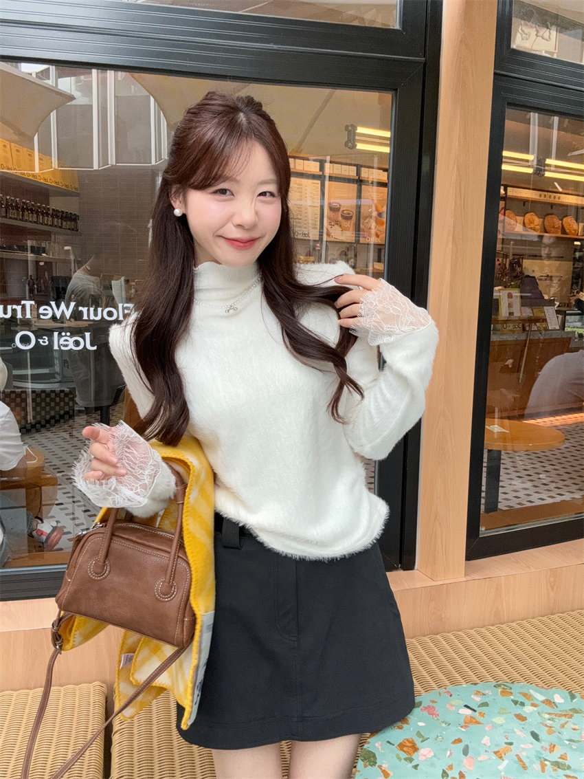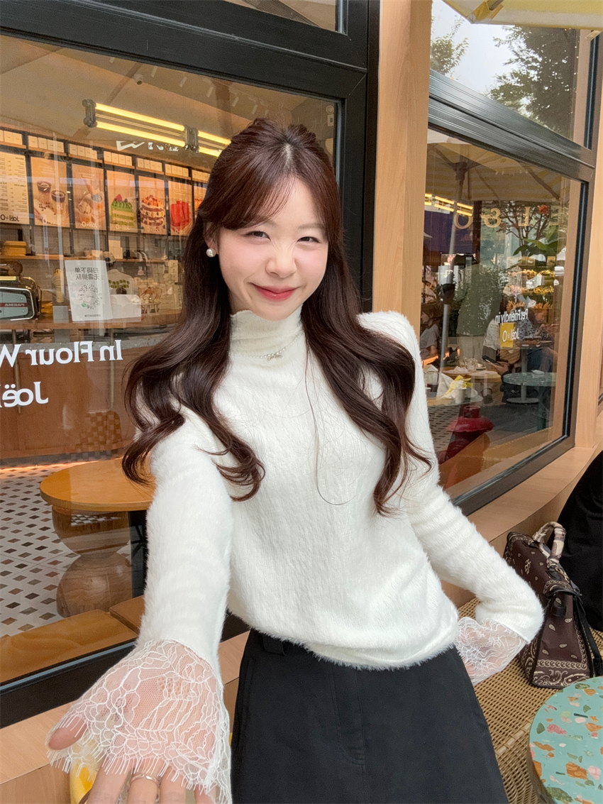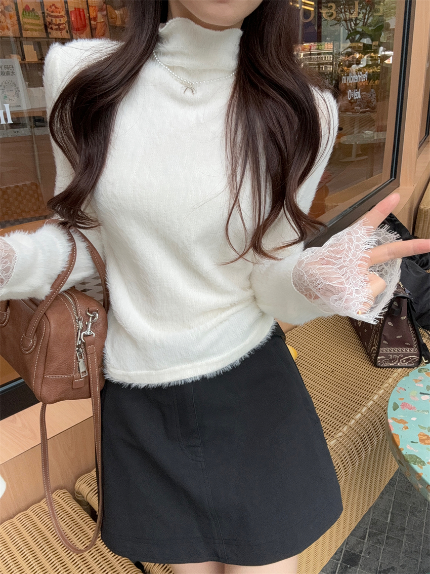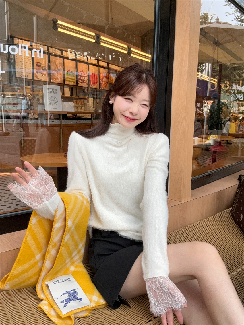 MY15277# 小香风半高领毛衣女白色针织打底衫蕾丝内搭毛毛上衣女裝貨源服裝批發