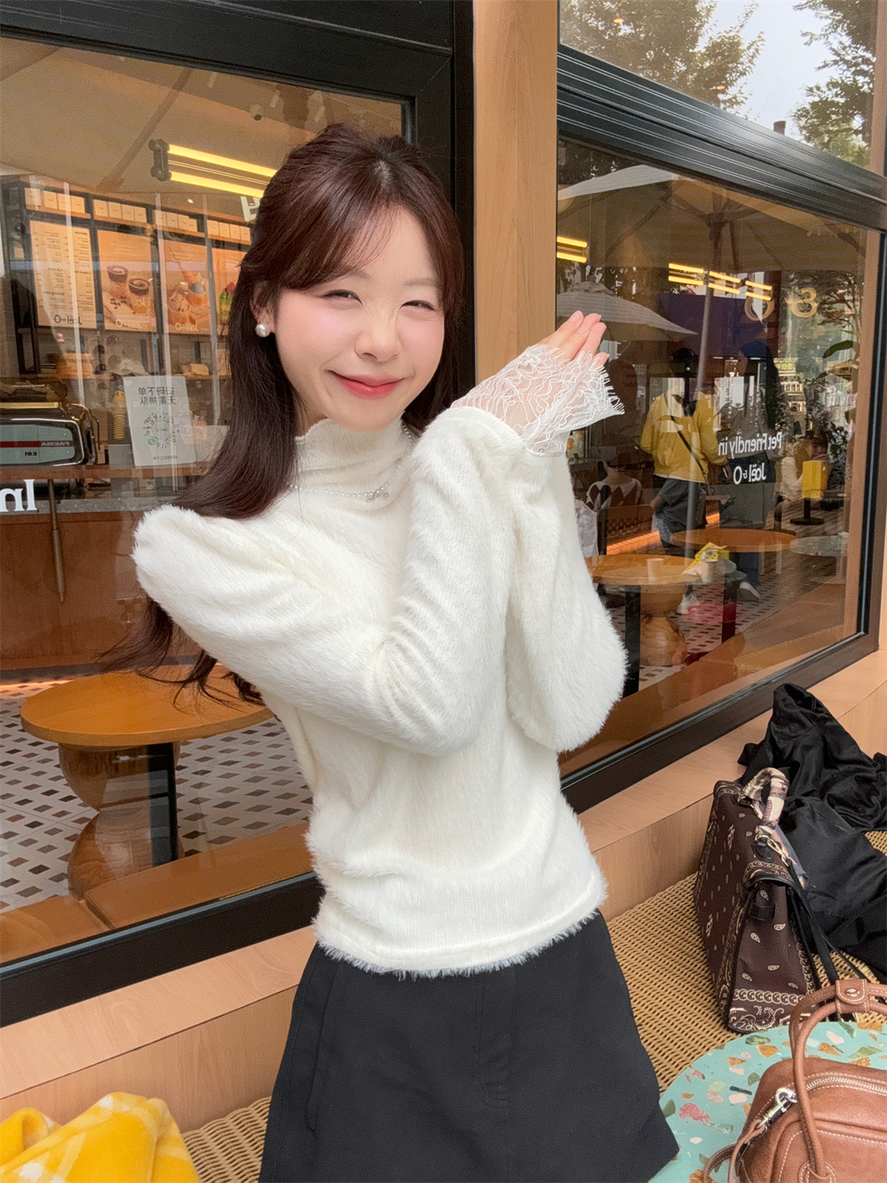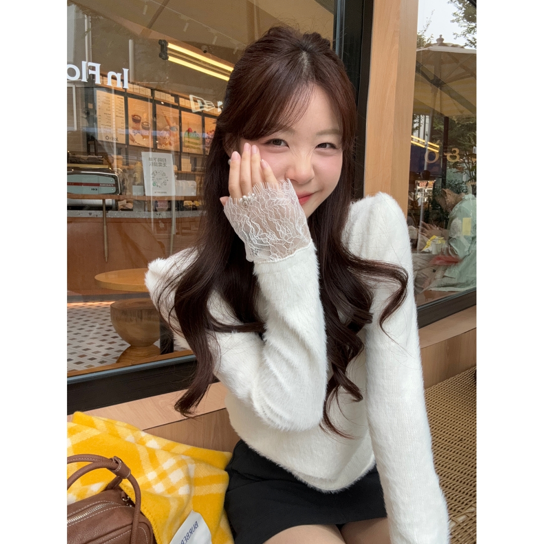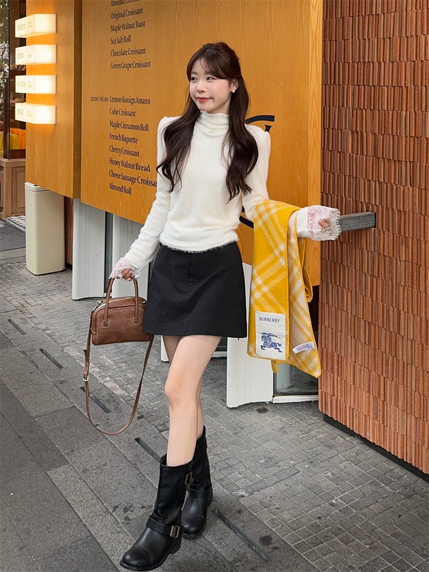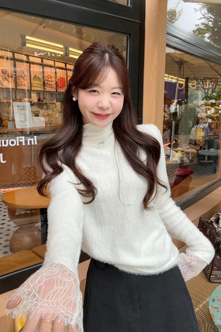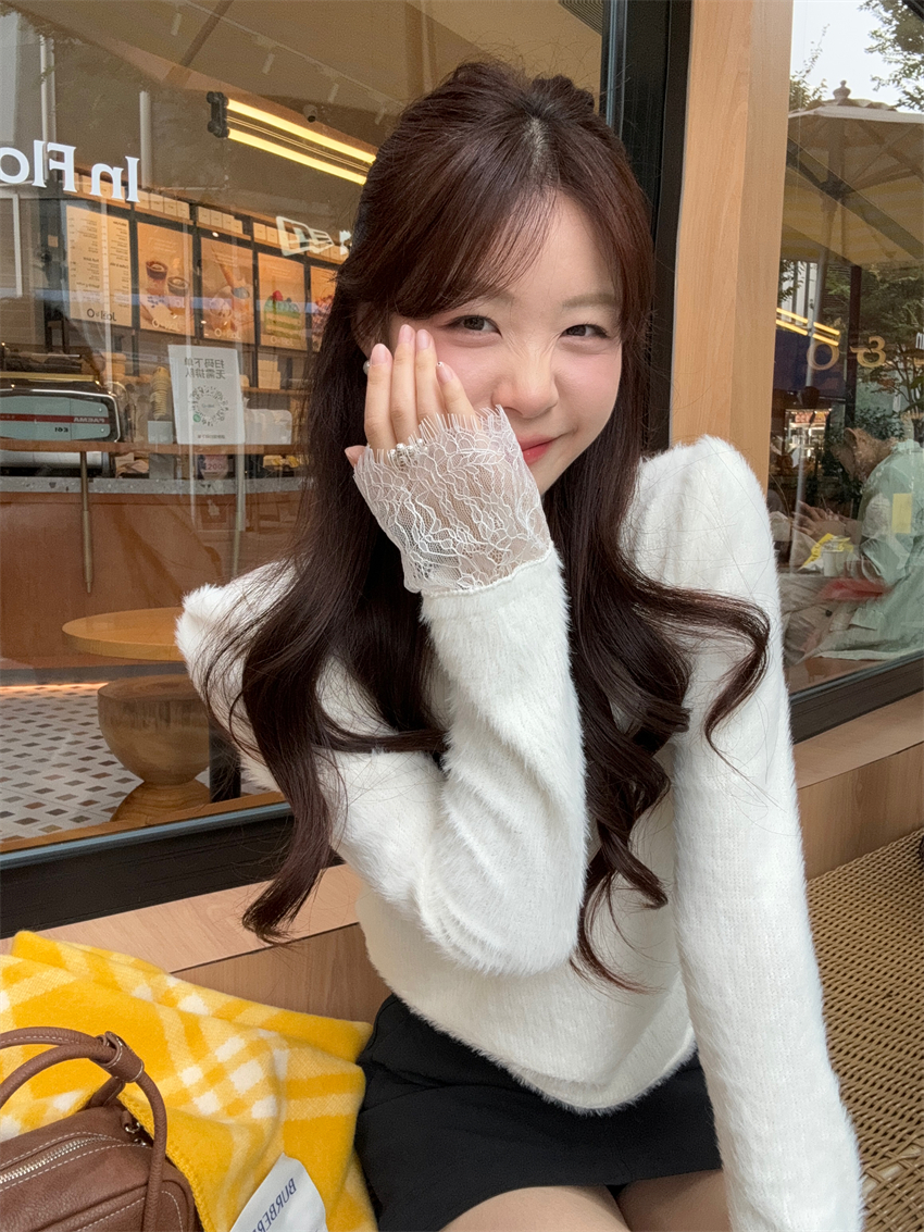 MY15277# 小香风半高领毛衣女白色针织打底衫蕾丝内搭毛毛上衣女裝貨源服裝批發