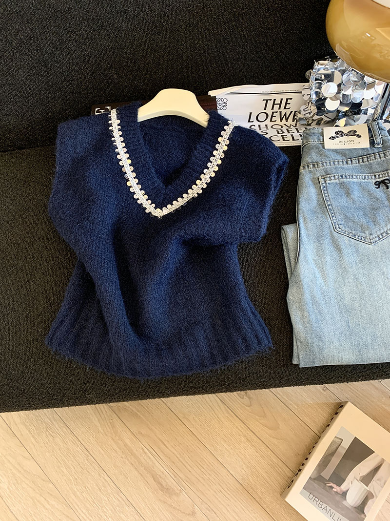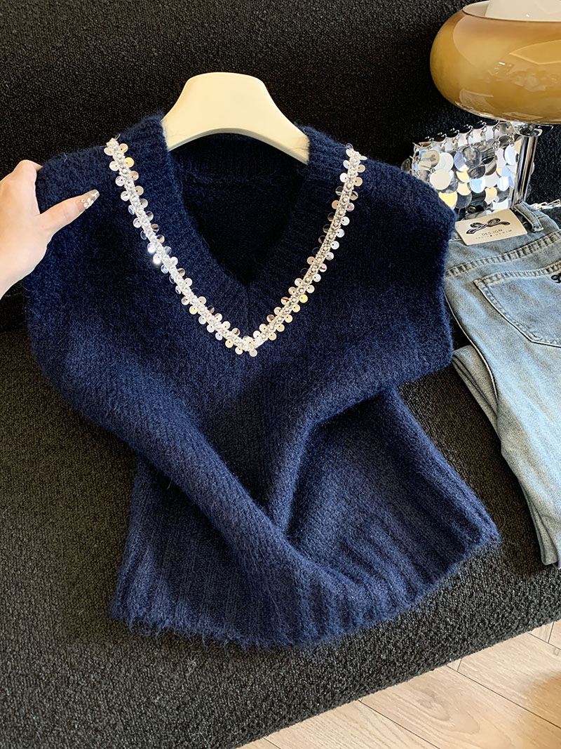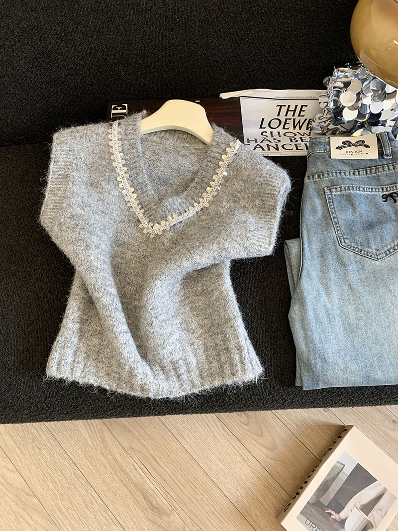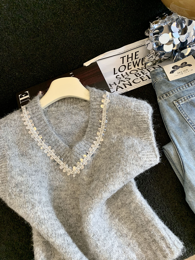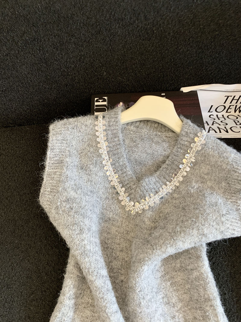 MY15297# V领针织毛衣马甲新款洋气显瘦叠穿亮片背心无袖上衣女裝貨源服裝批發