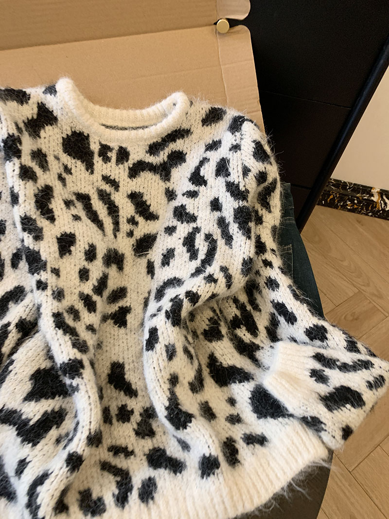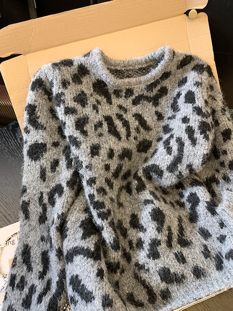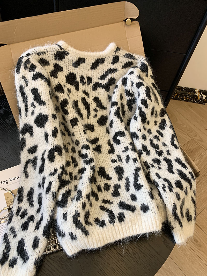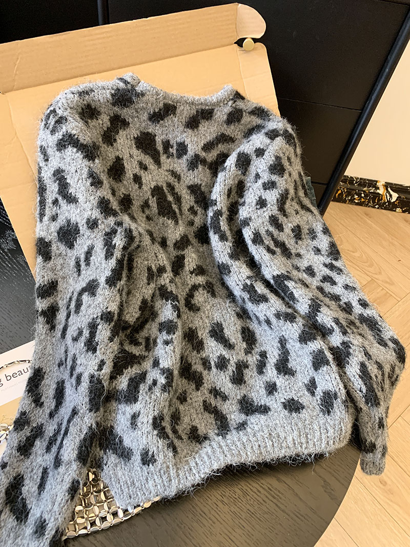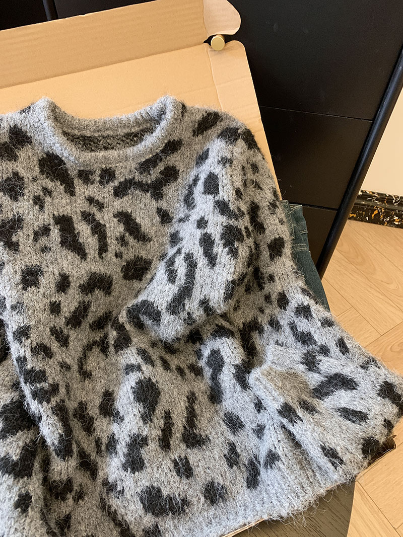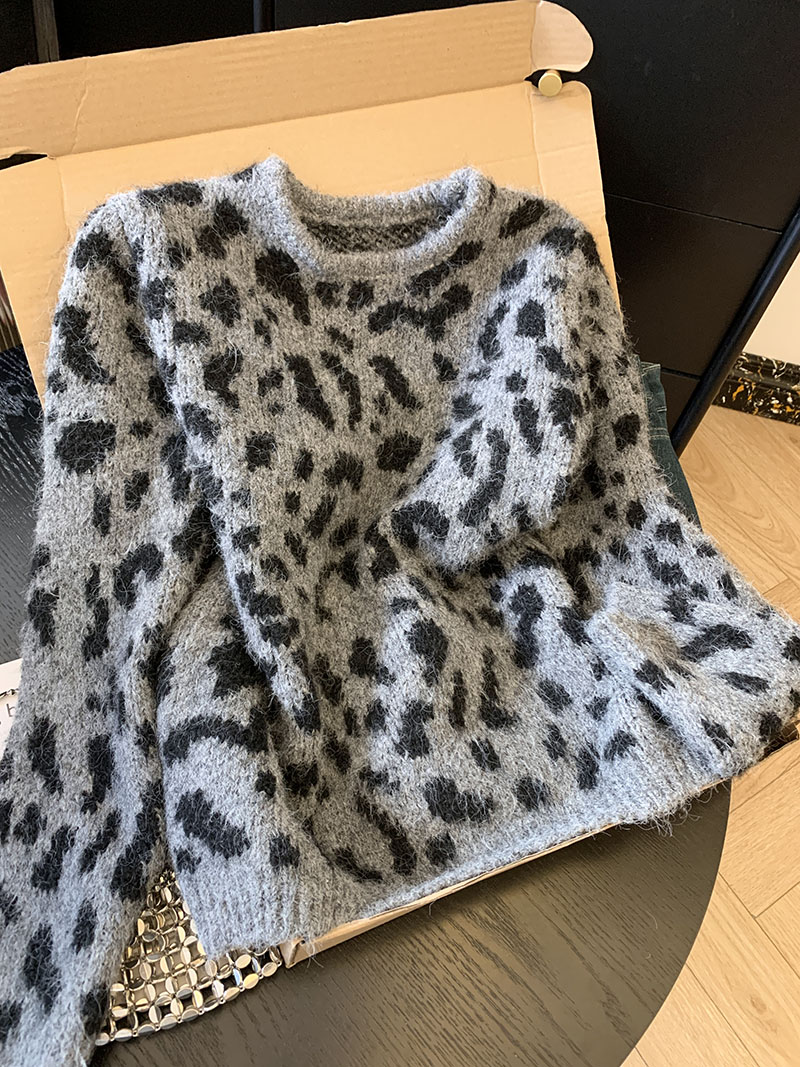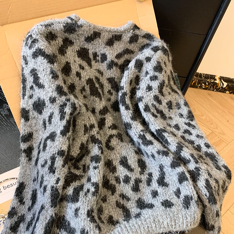 MY15298# 新款韩版宽松显瘦圆领豹纹针织衫女百搭毛衣外套别致上衣女裝貨源服裝批發