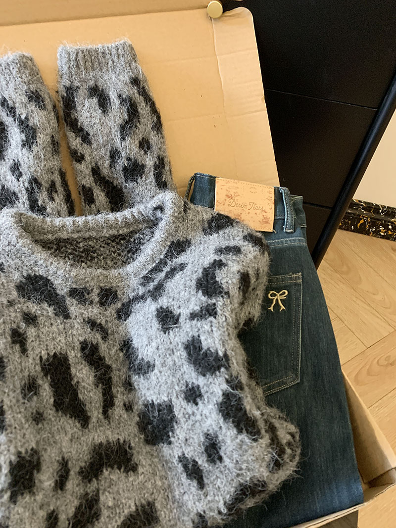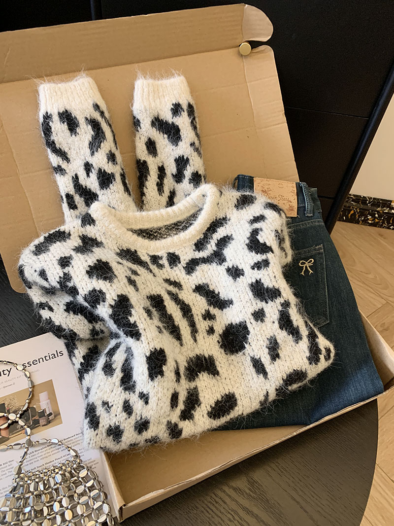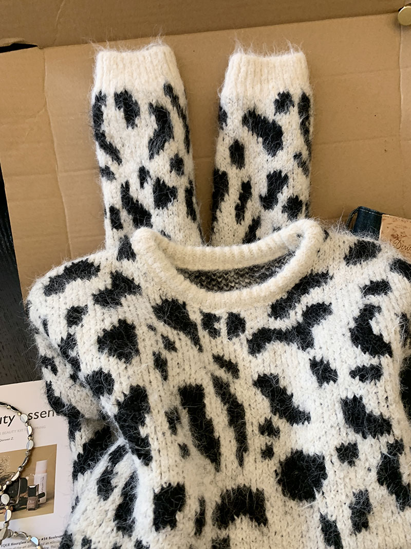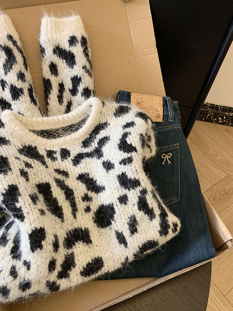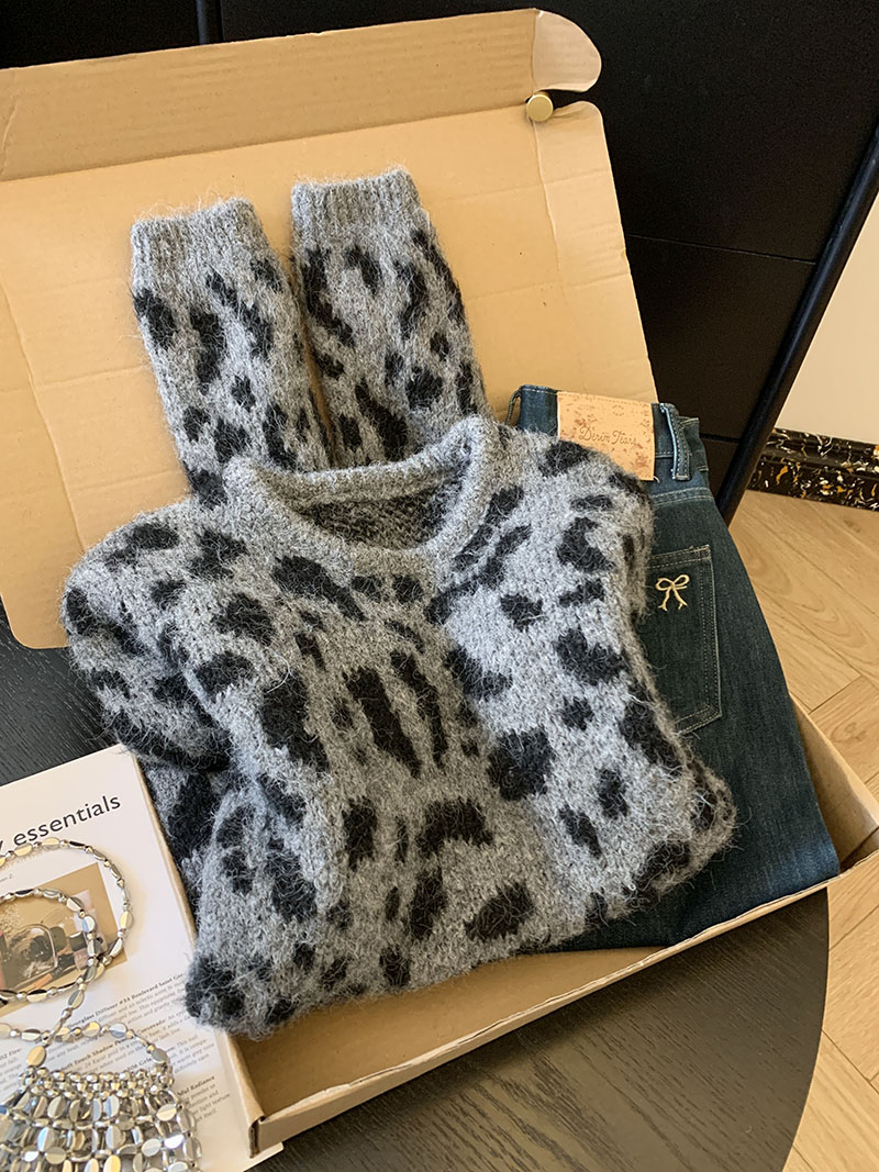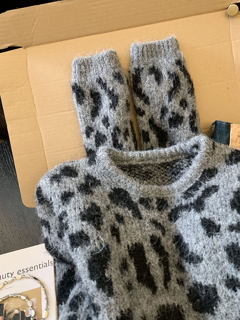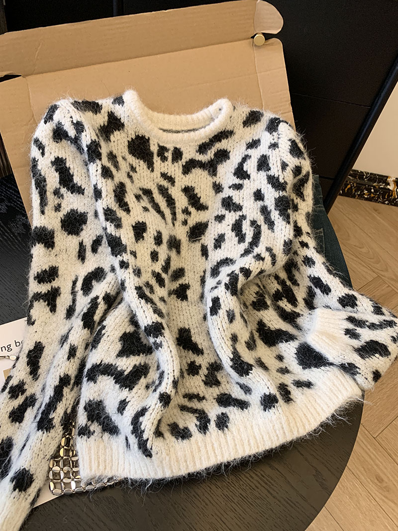 MY15298# 新款韩版宽松显瘦圆领豹纹针织衫女百搭毛衣外套别致上衣女裝貨源服裝批發