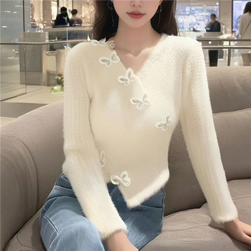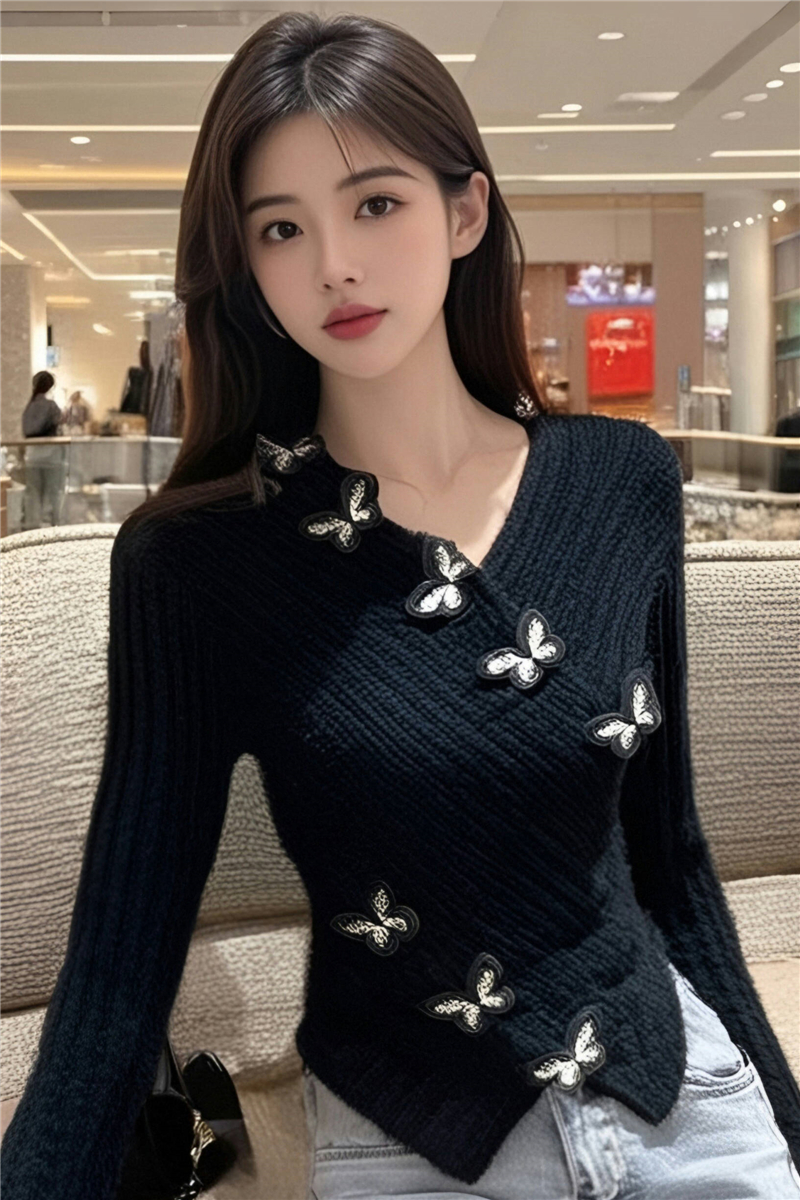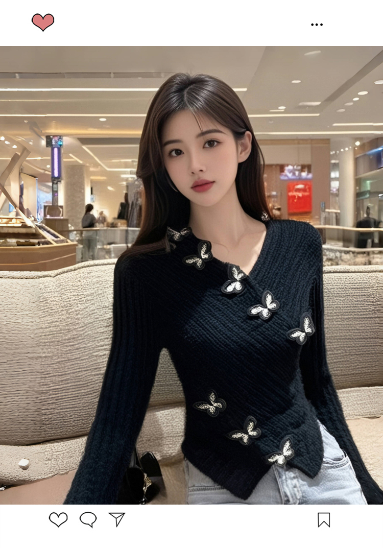 MY15301# 赫本风黑色v领马海毛针织衫女蝴蝶毛衣ins不规则短款上衣女裝貨源服裝批發