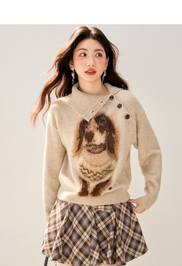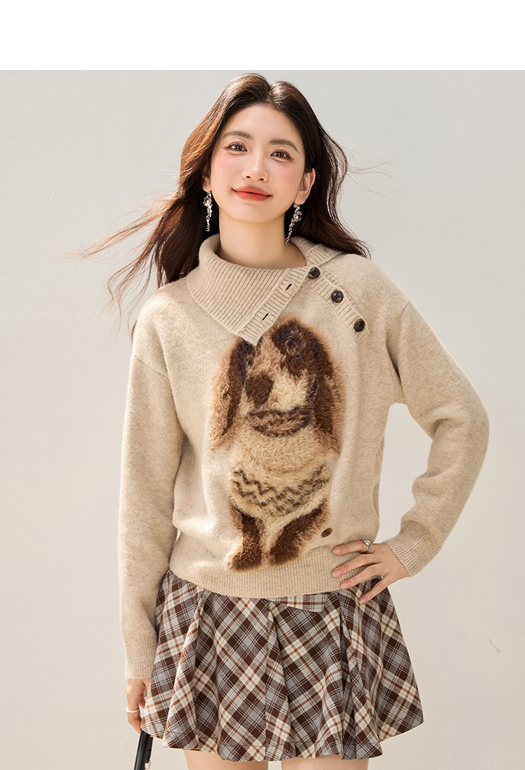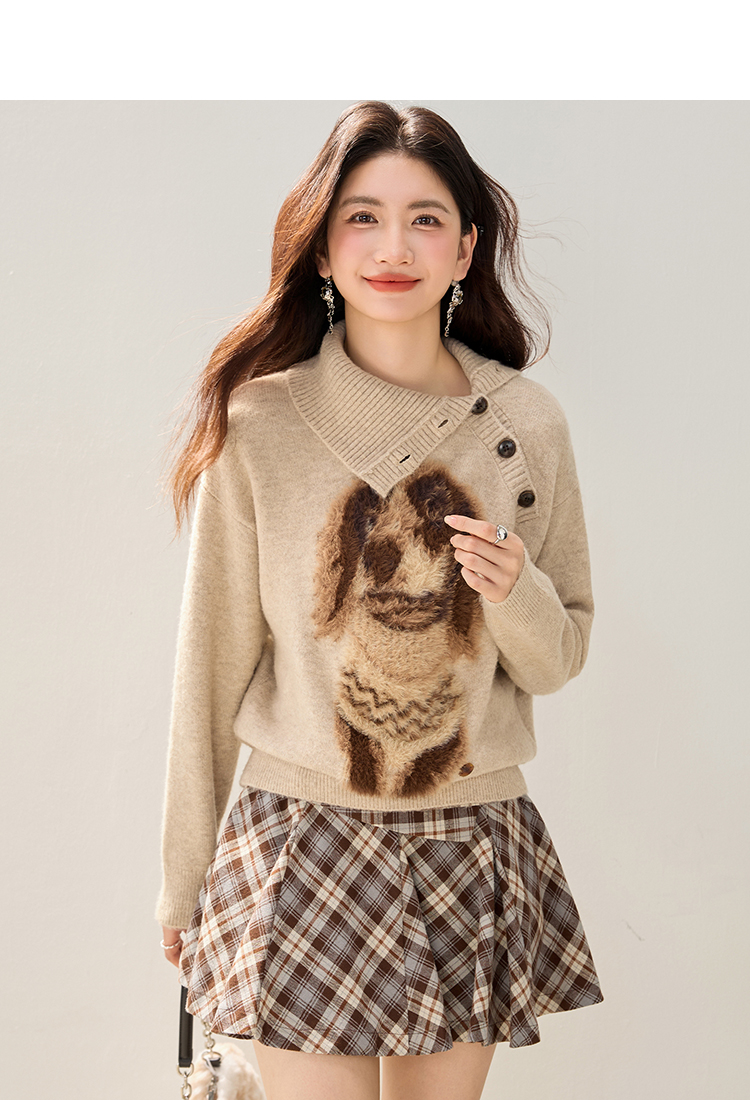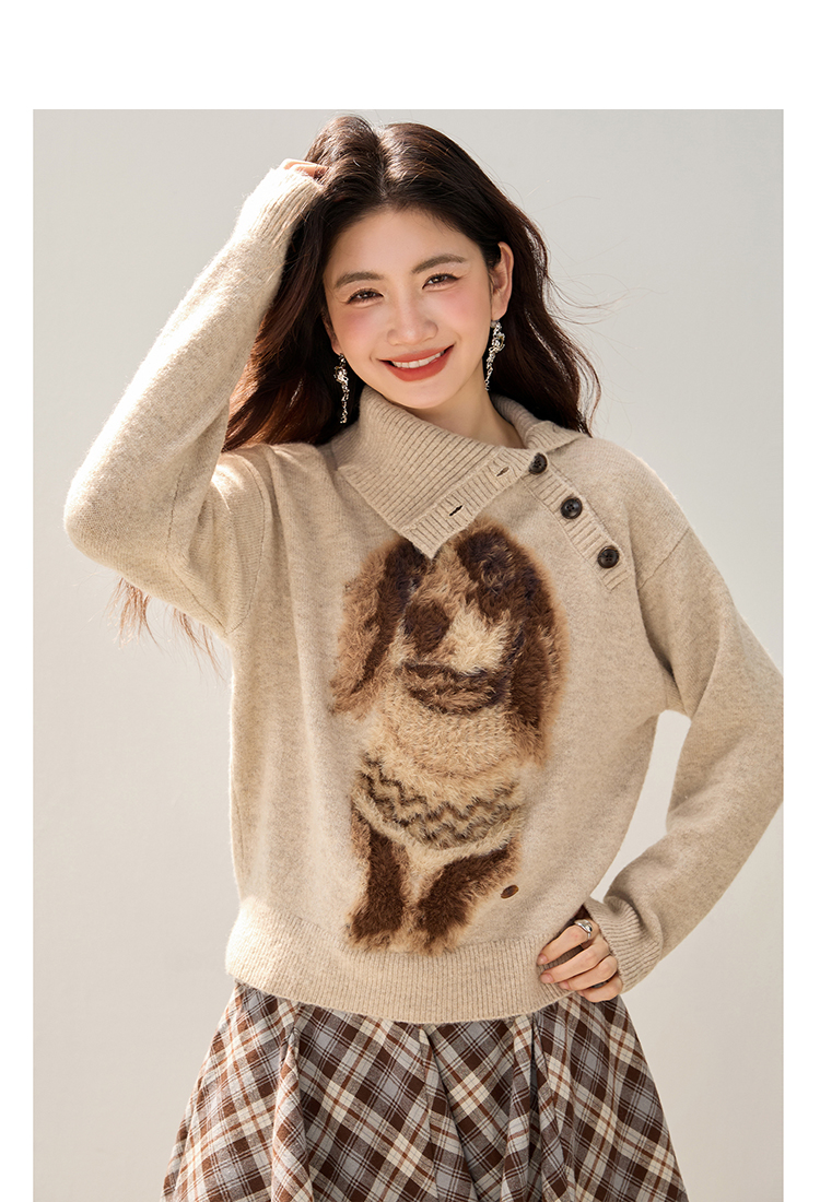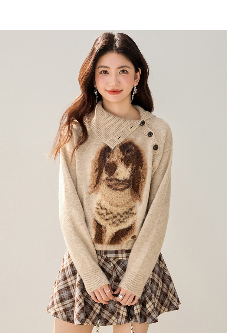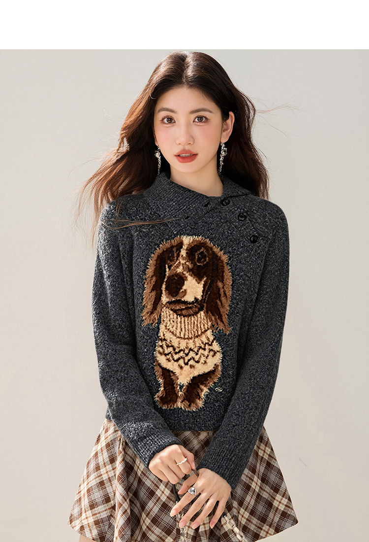 MY15305# 设计感小狗印花纽扣长袖毛衣女秋百搭气质宽松休闲上衣女裝貨源服裝批發