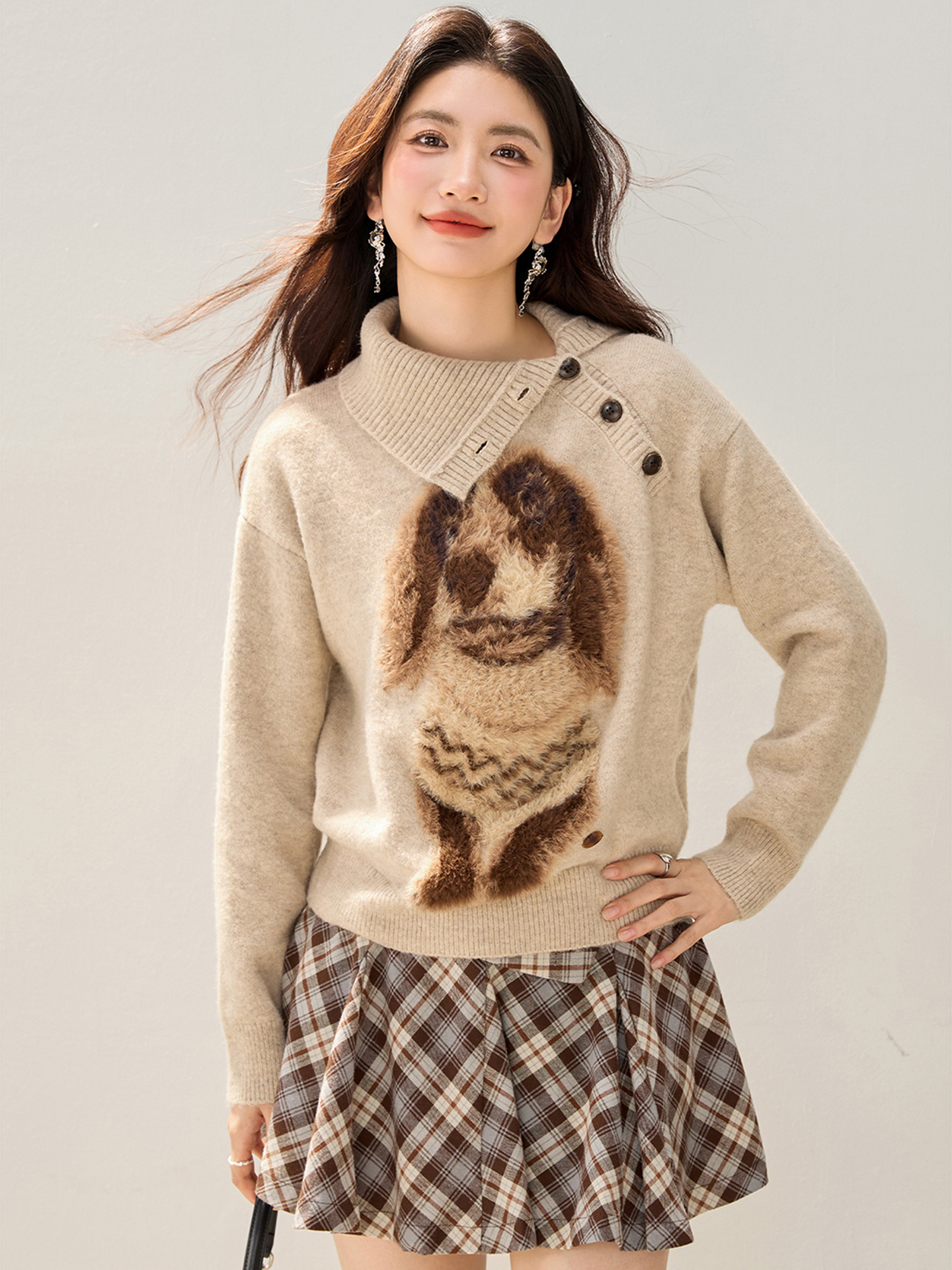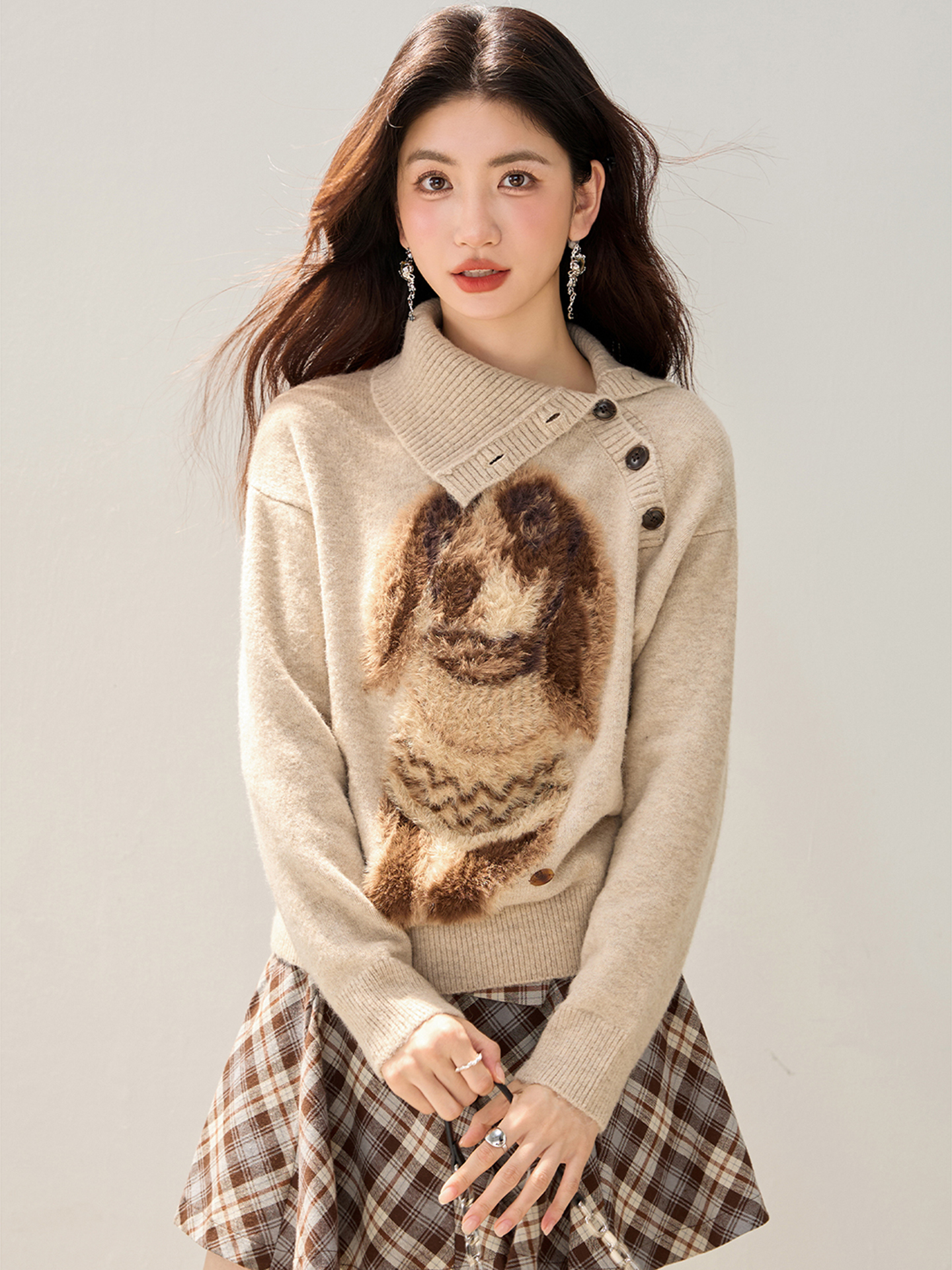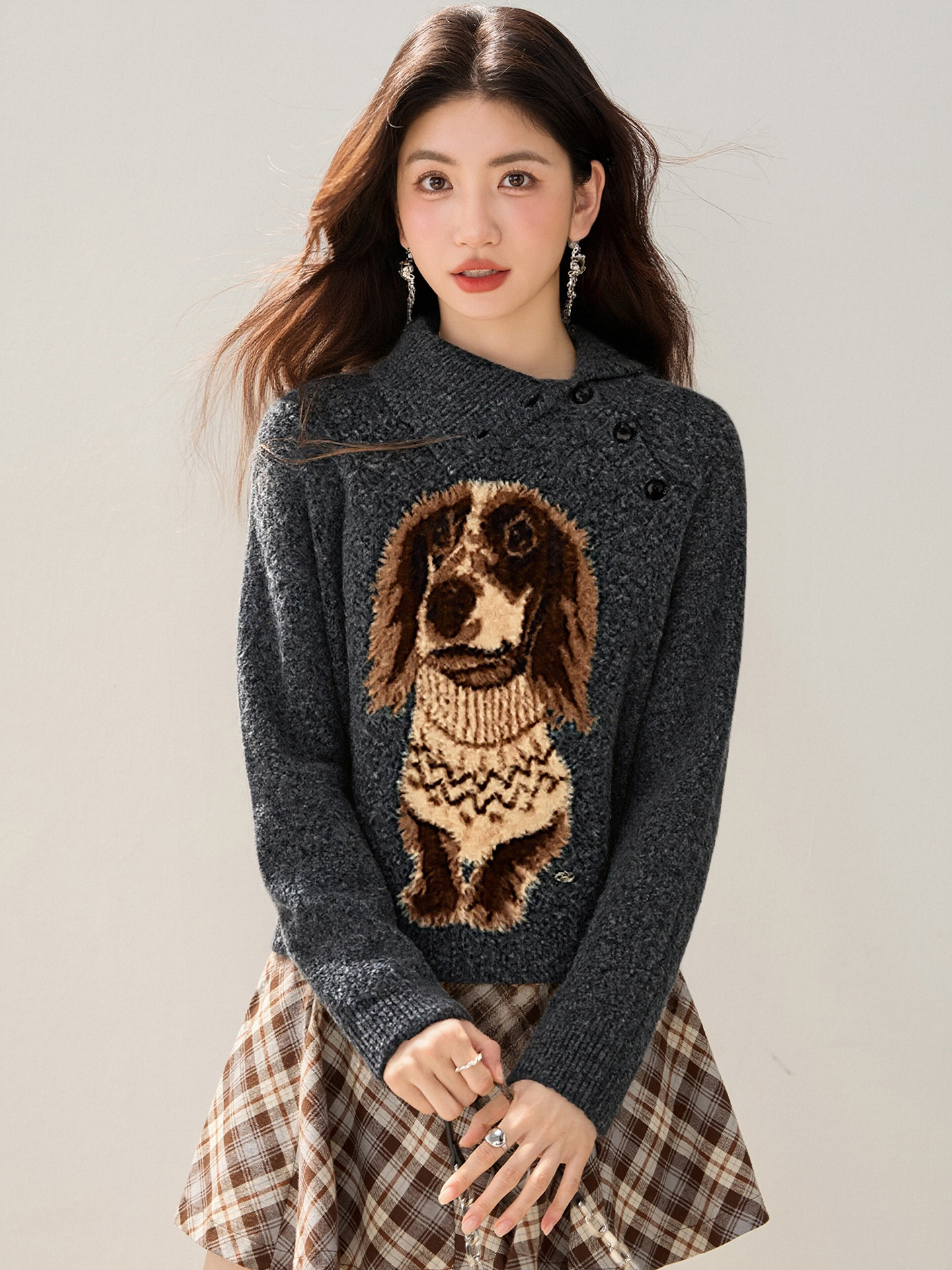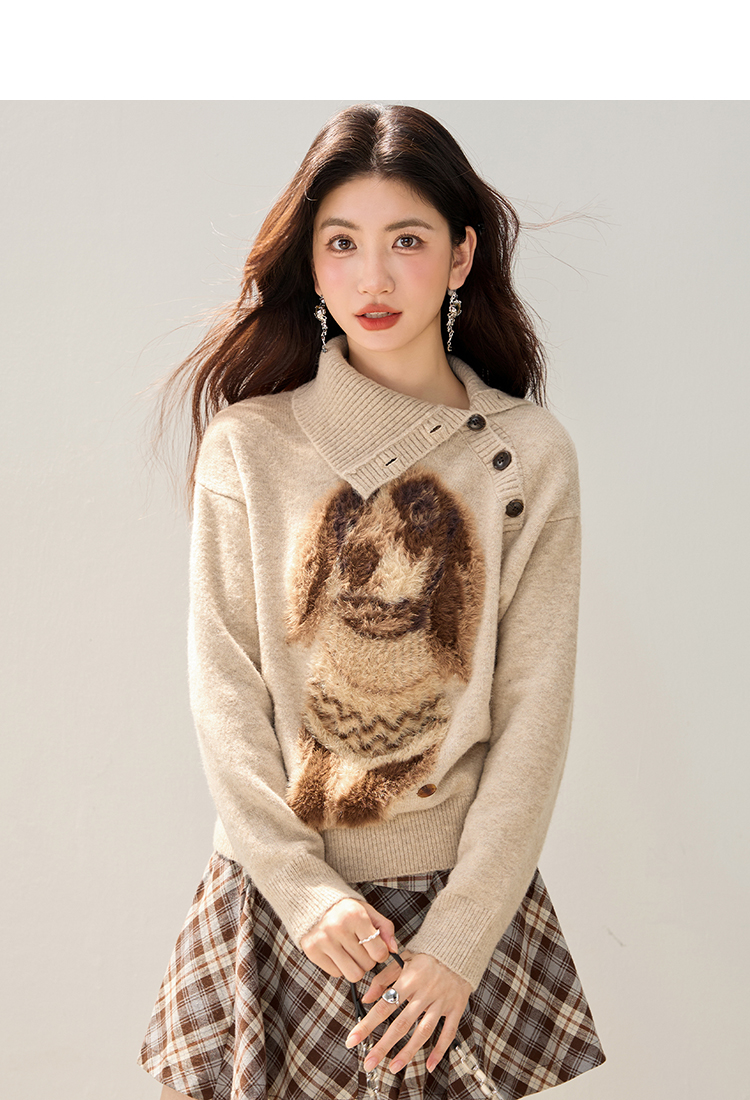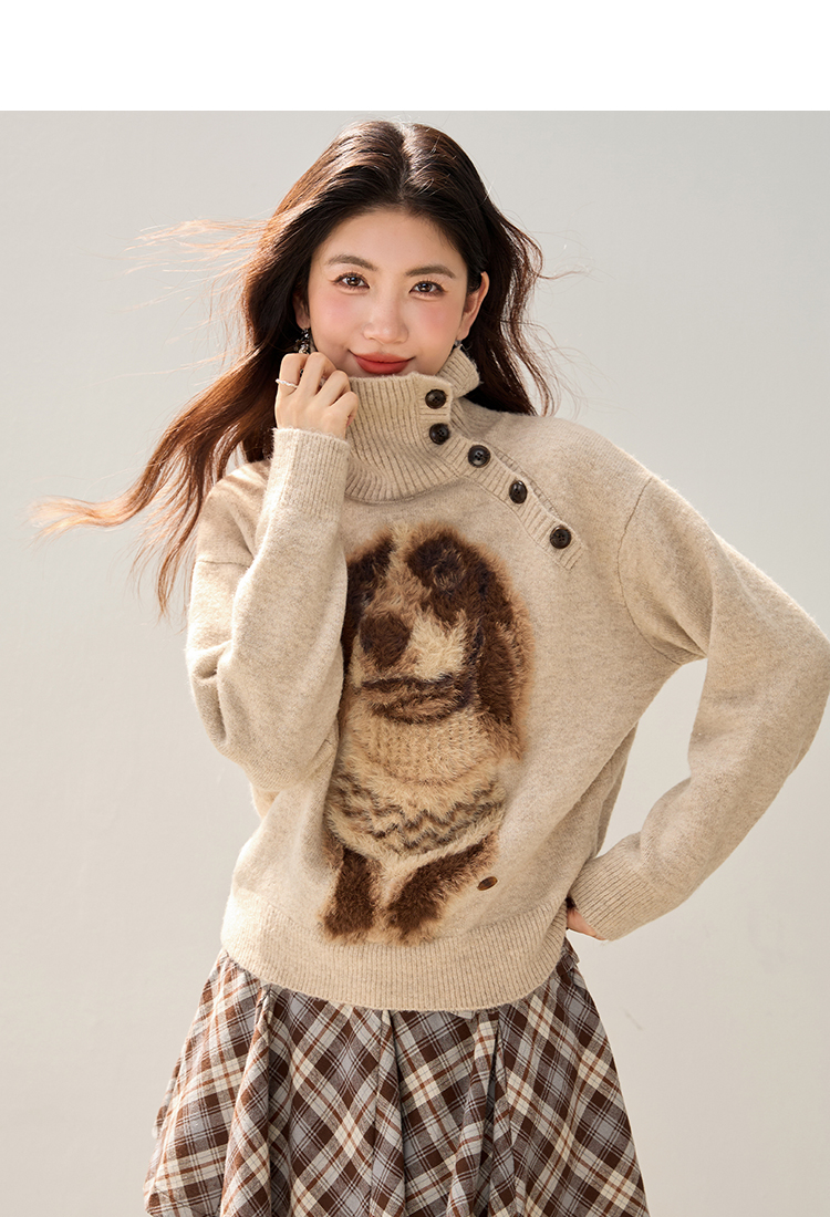 MY15305# 设计感小狗印花纽扣长袖毛衣女秋百搭气质宽松休闲上衣女裝貨源服裝批發
