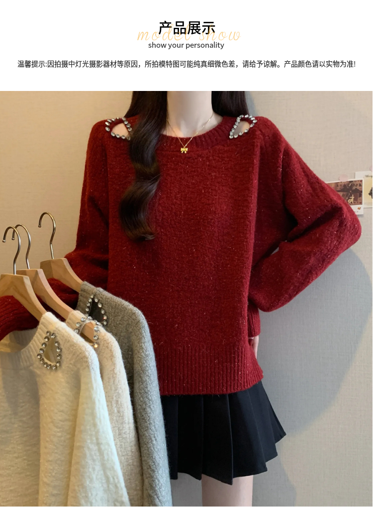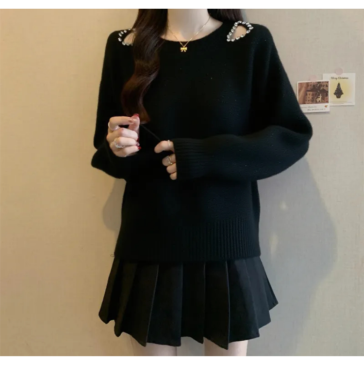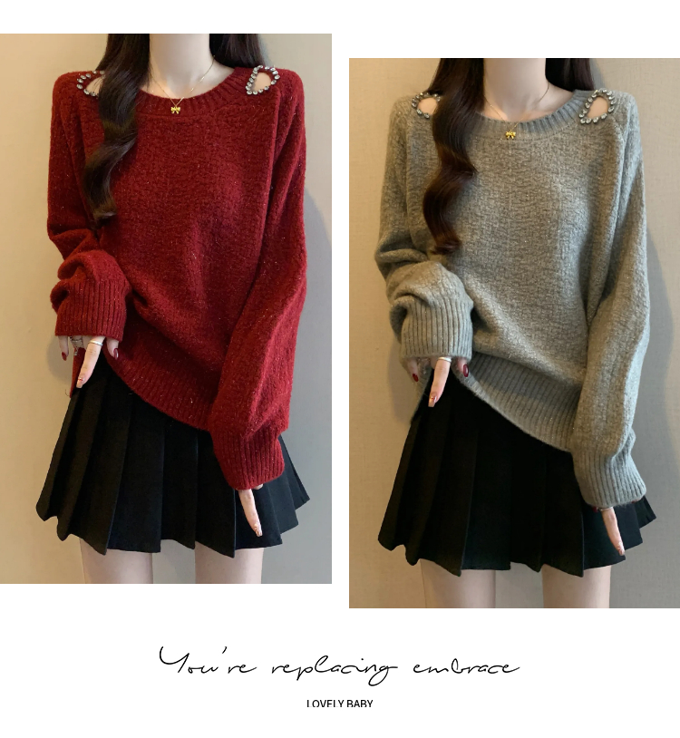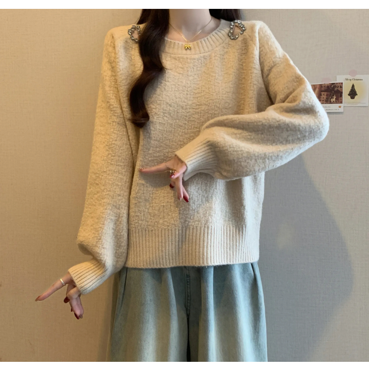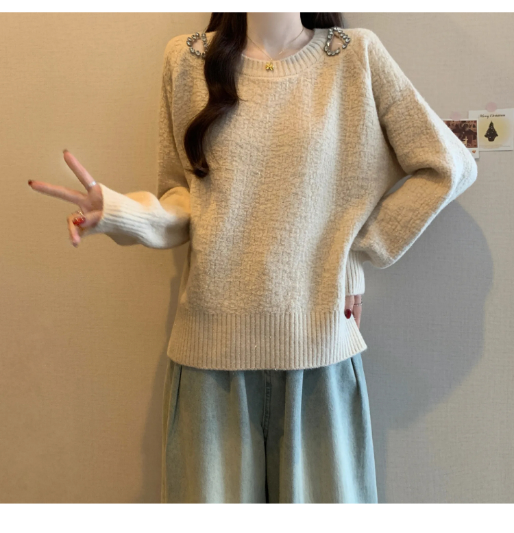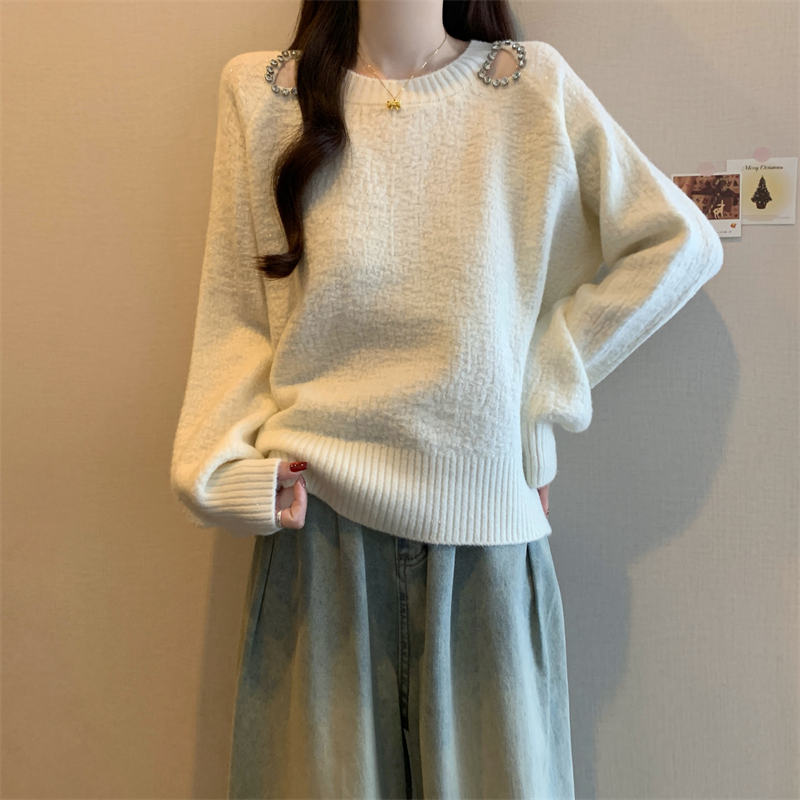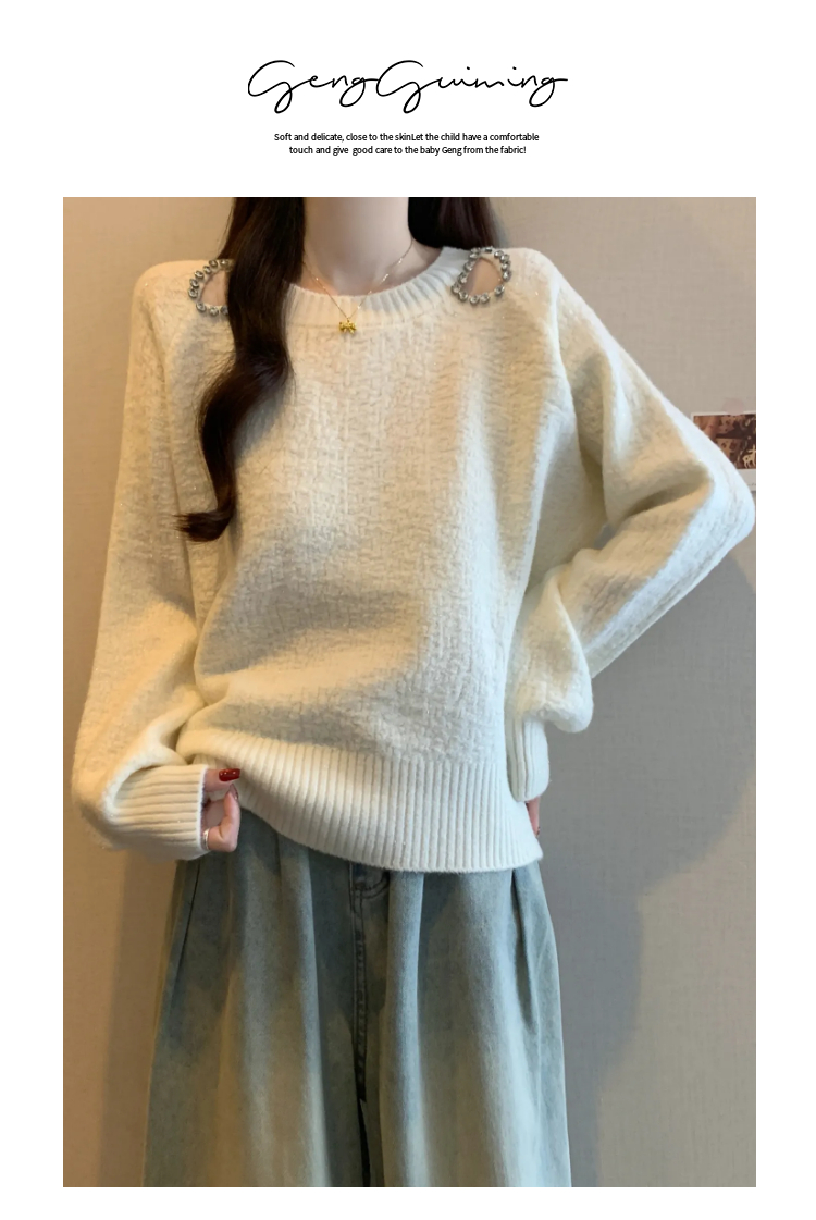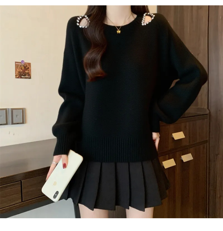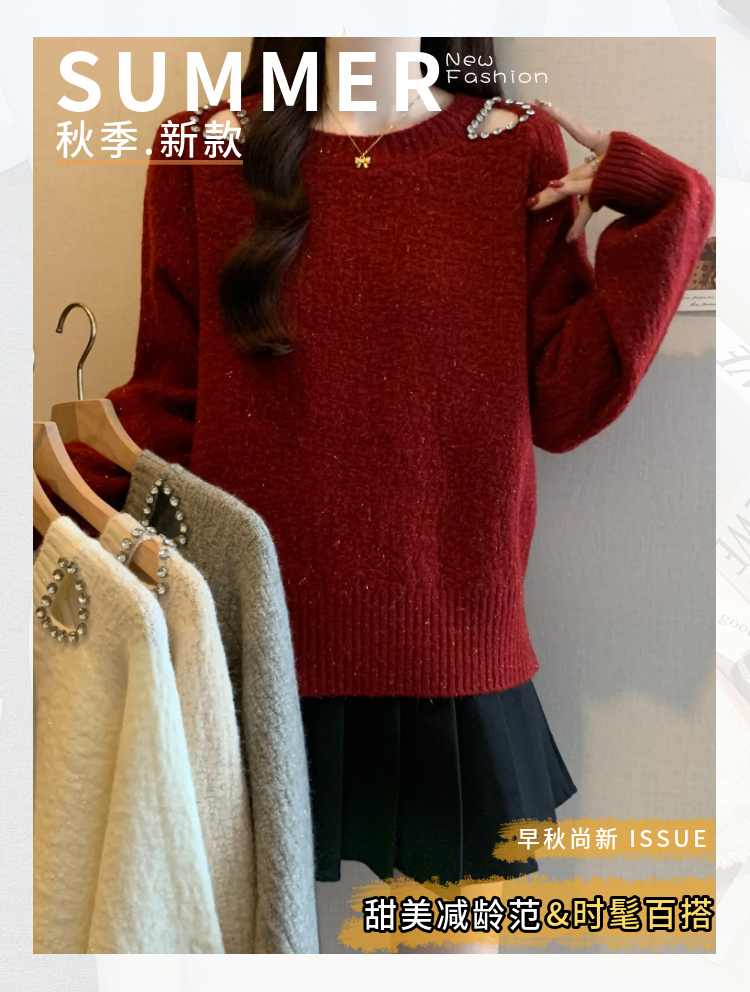 MY15372# 法式高级感镶钻毛衣新款设计感心机露肩显瘦针织衫女裝貨源服裝批發