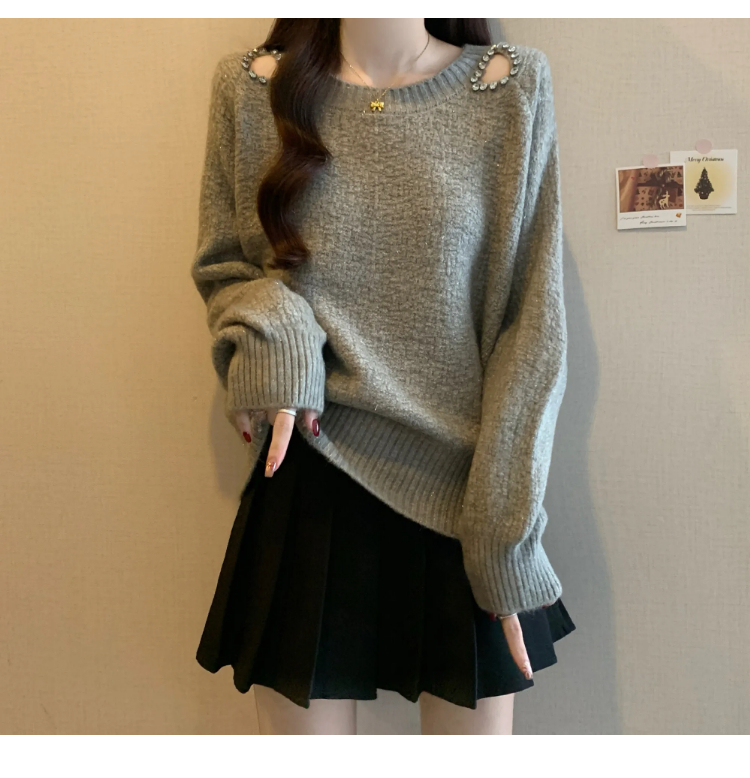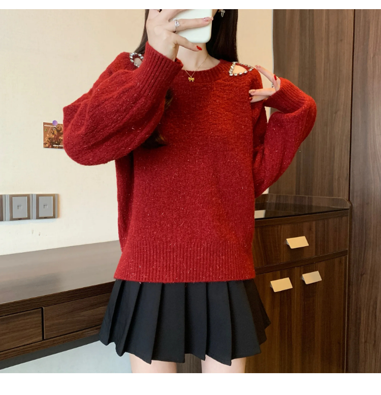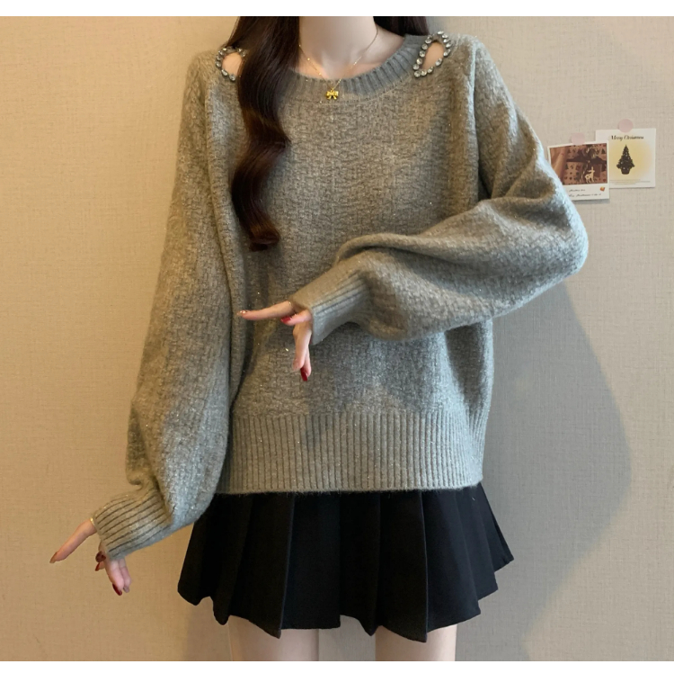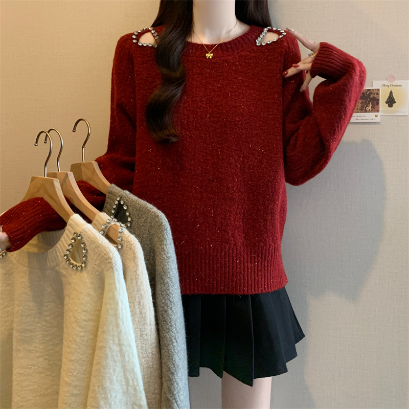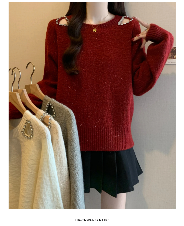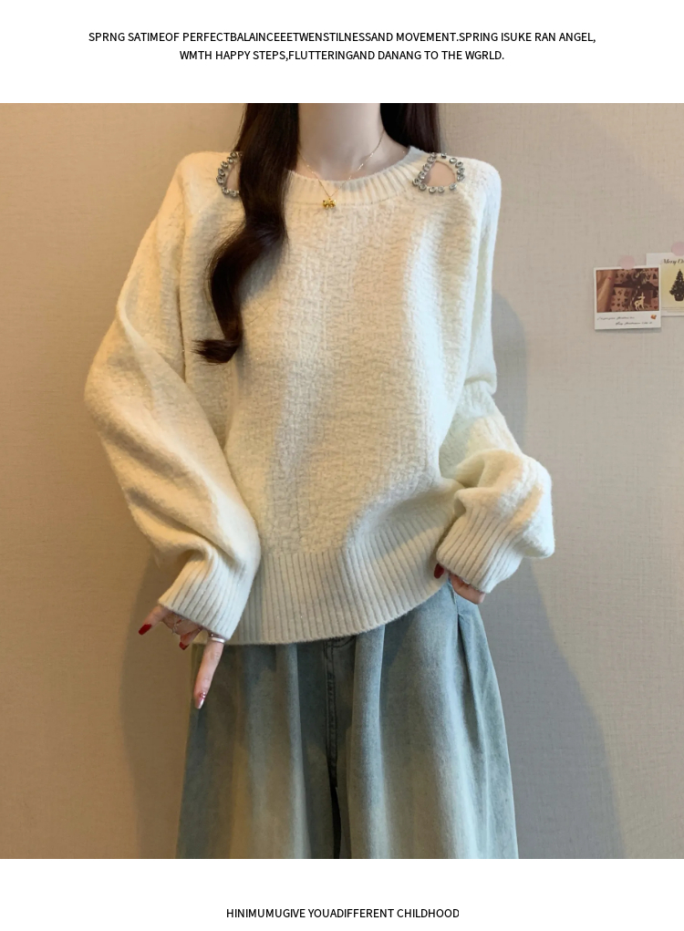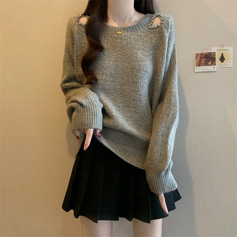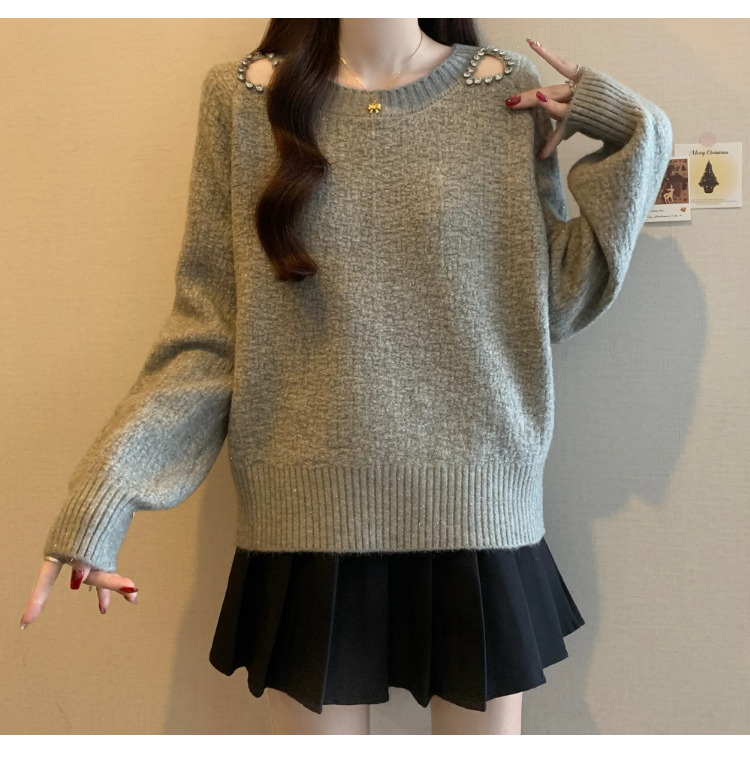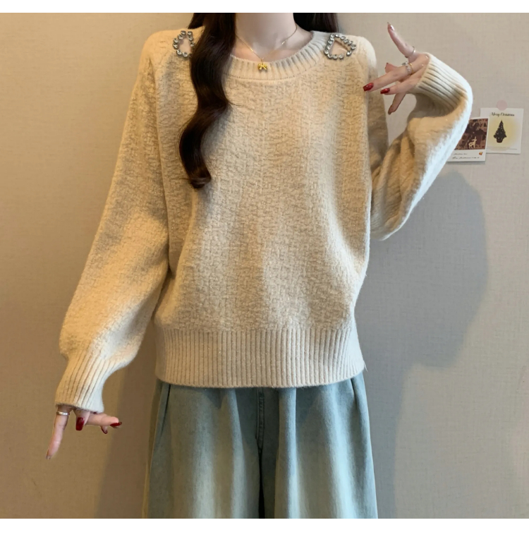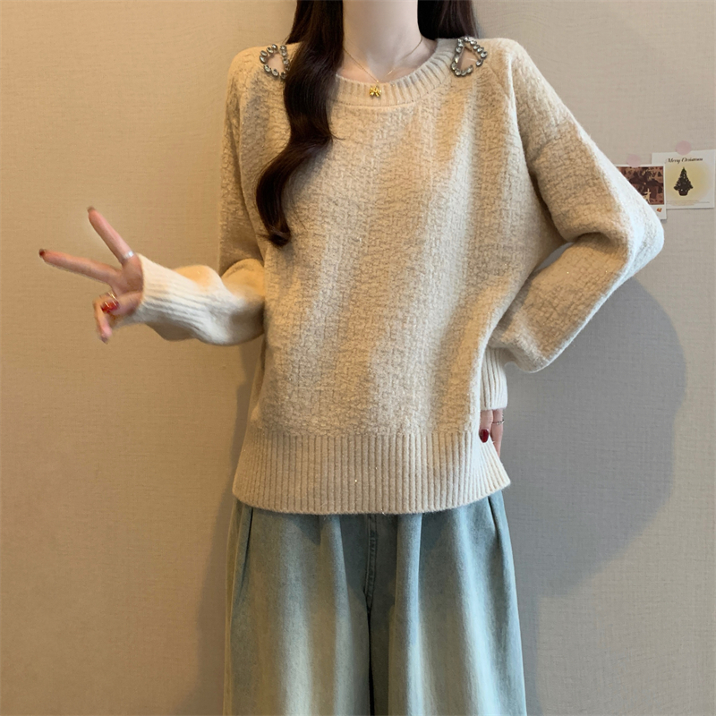MY15372# 法式高级感镶钻毛衣新款设计感心机露肩显瘦针织衫女裝貨源服裝批發