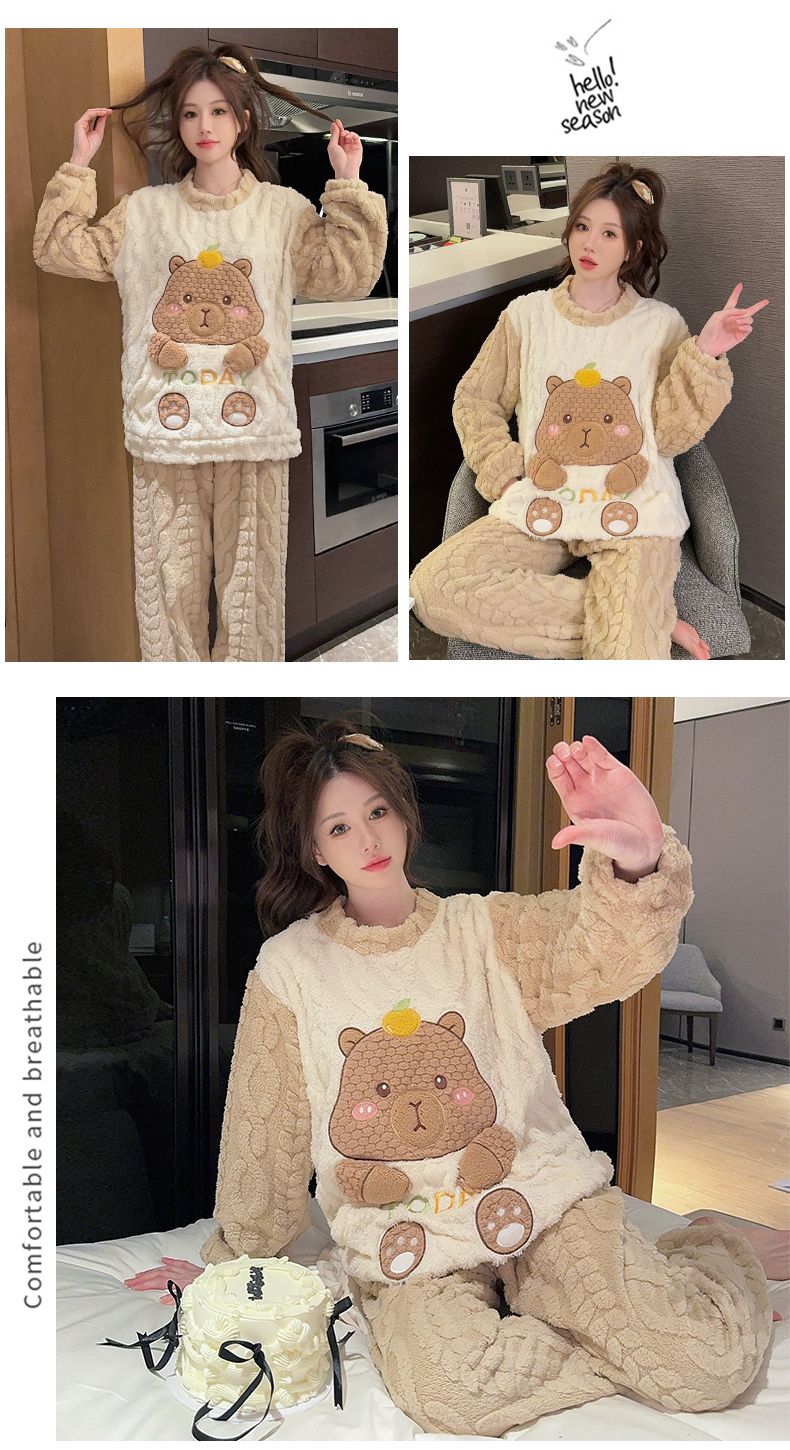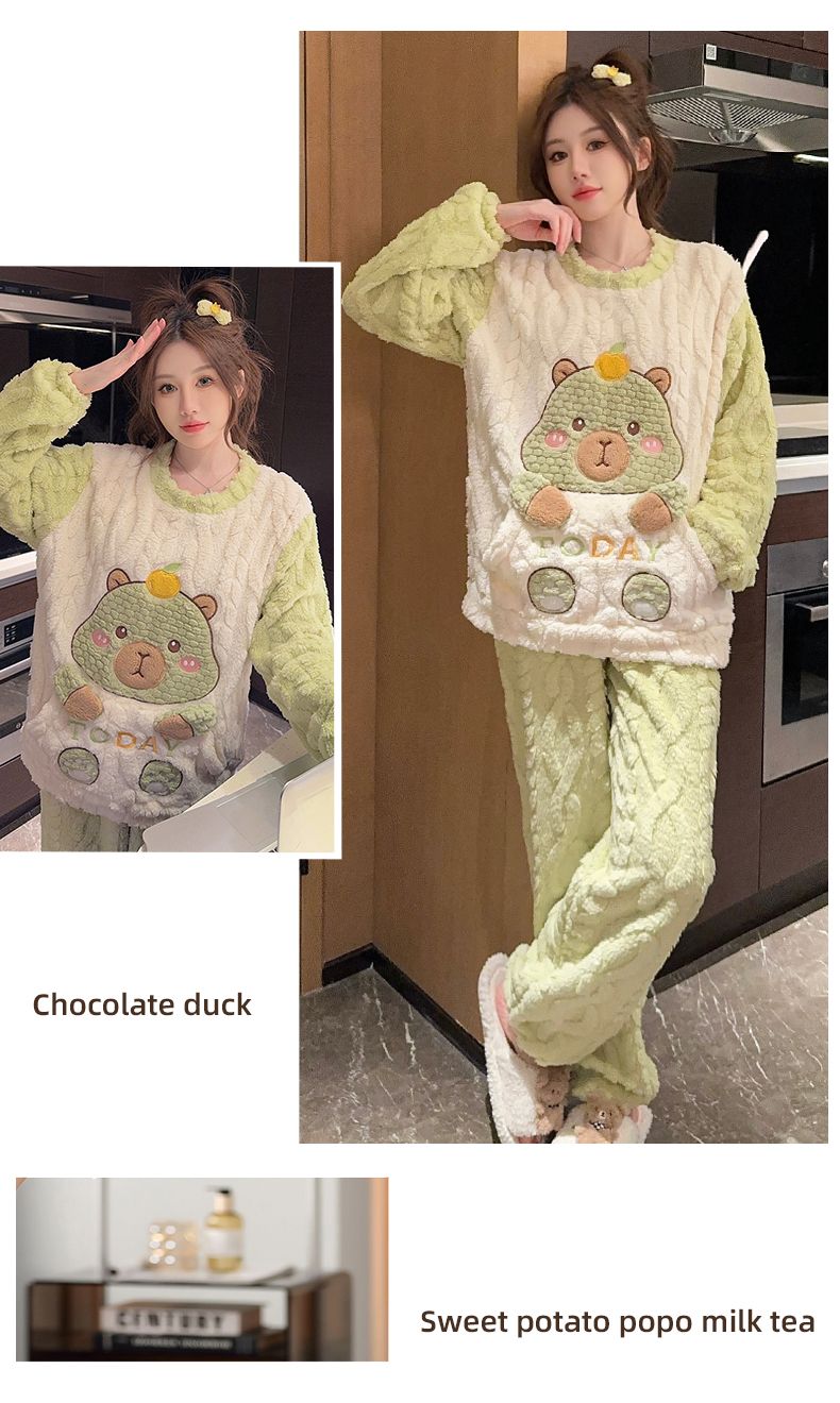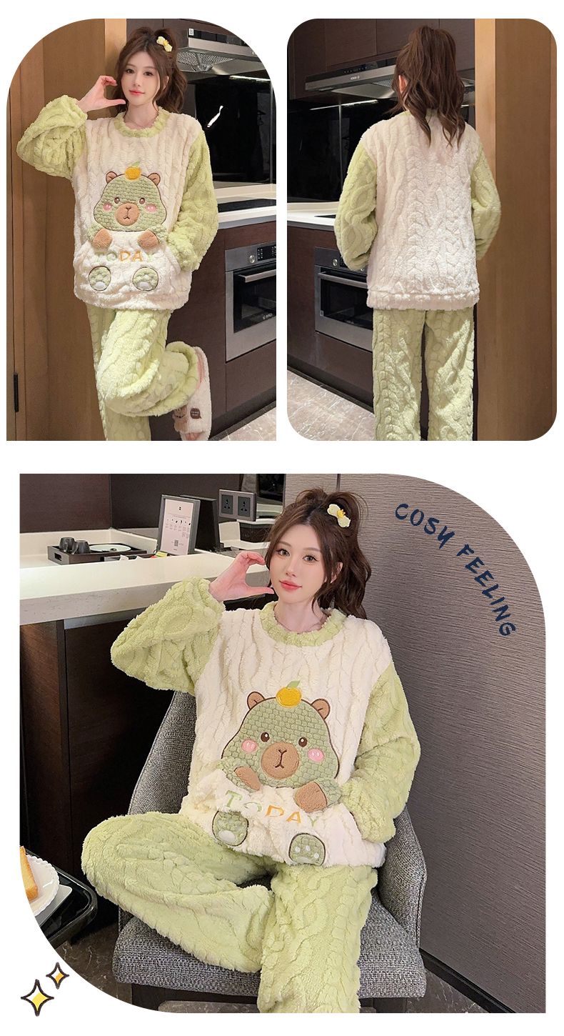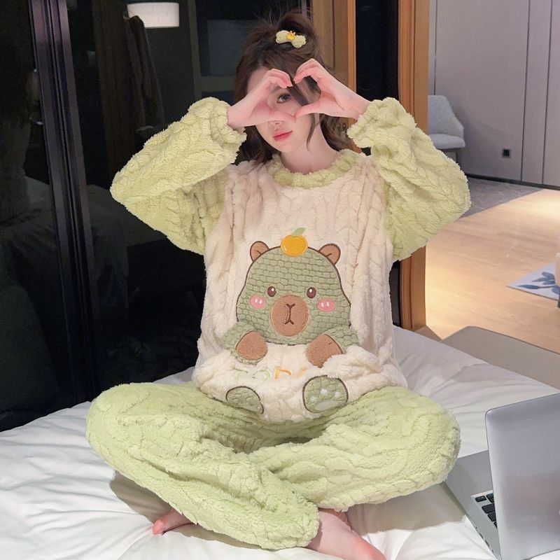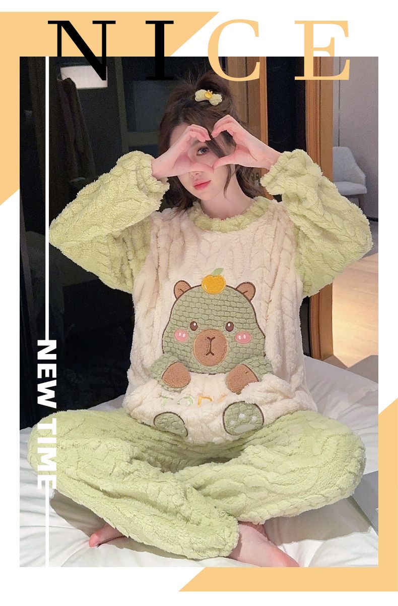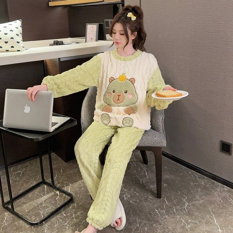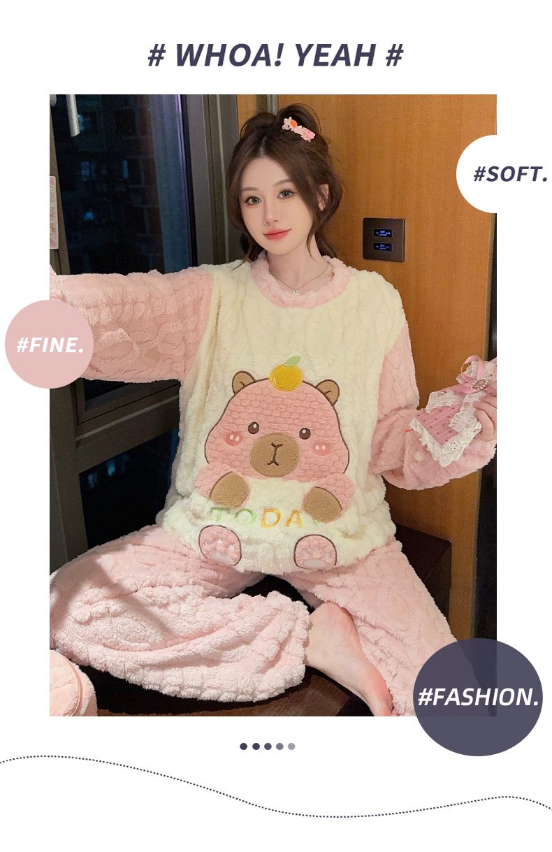 MY15411# 提花绒睡衣少女甜美时尚花边长袖加肥大码230斤胖M家居服女裝貨源服裝批發