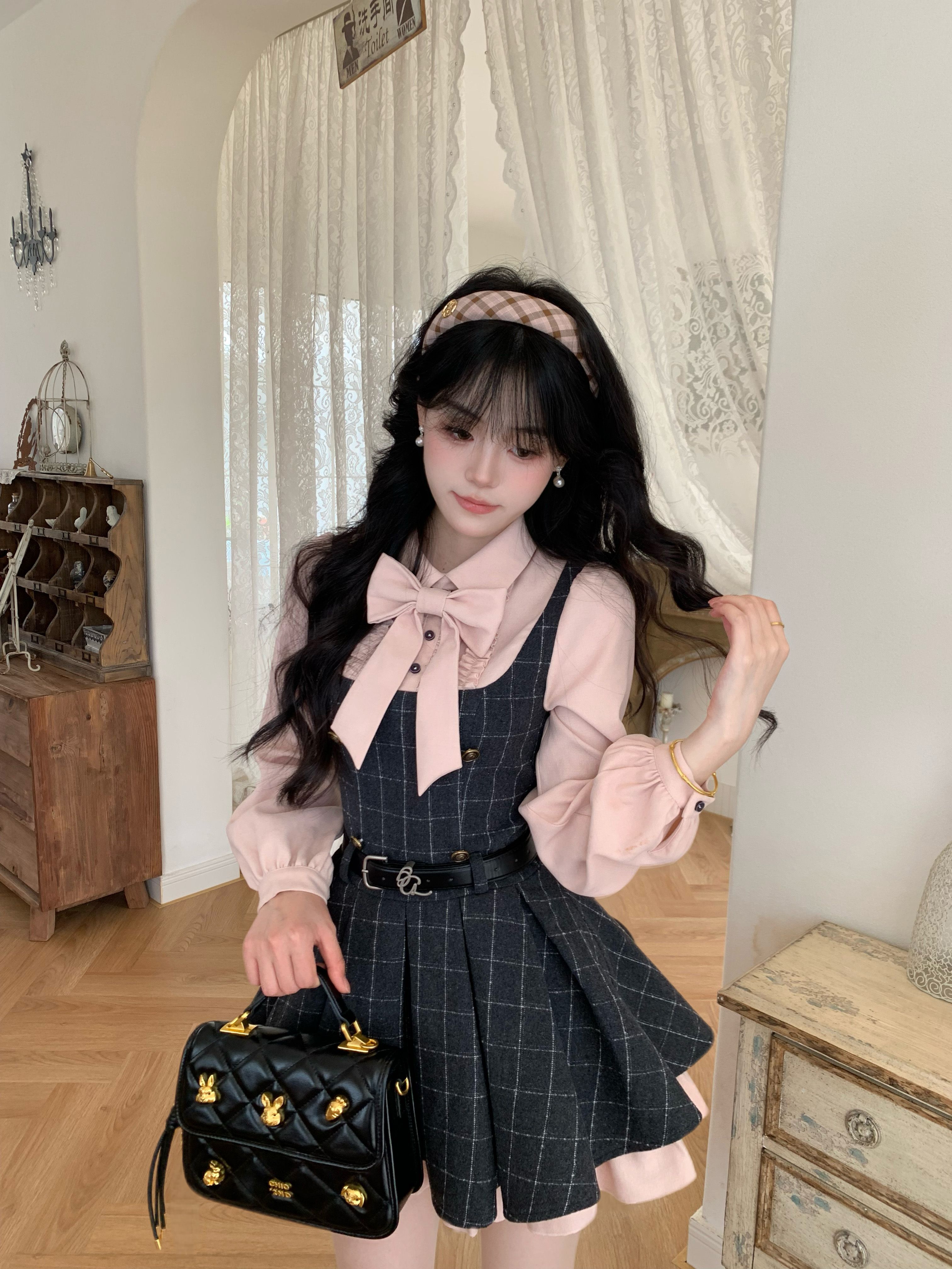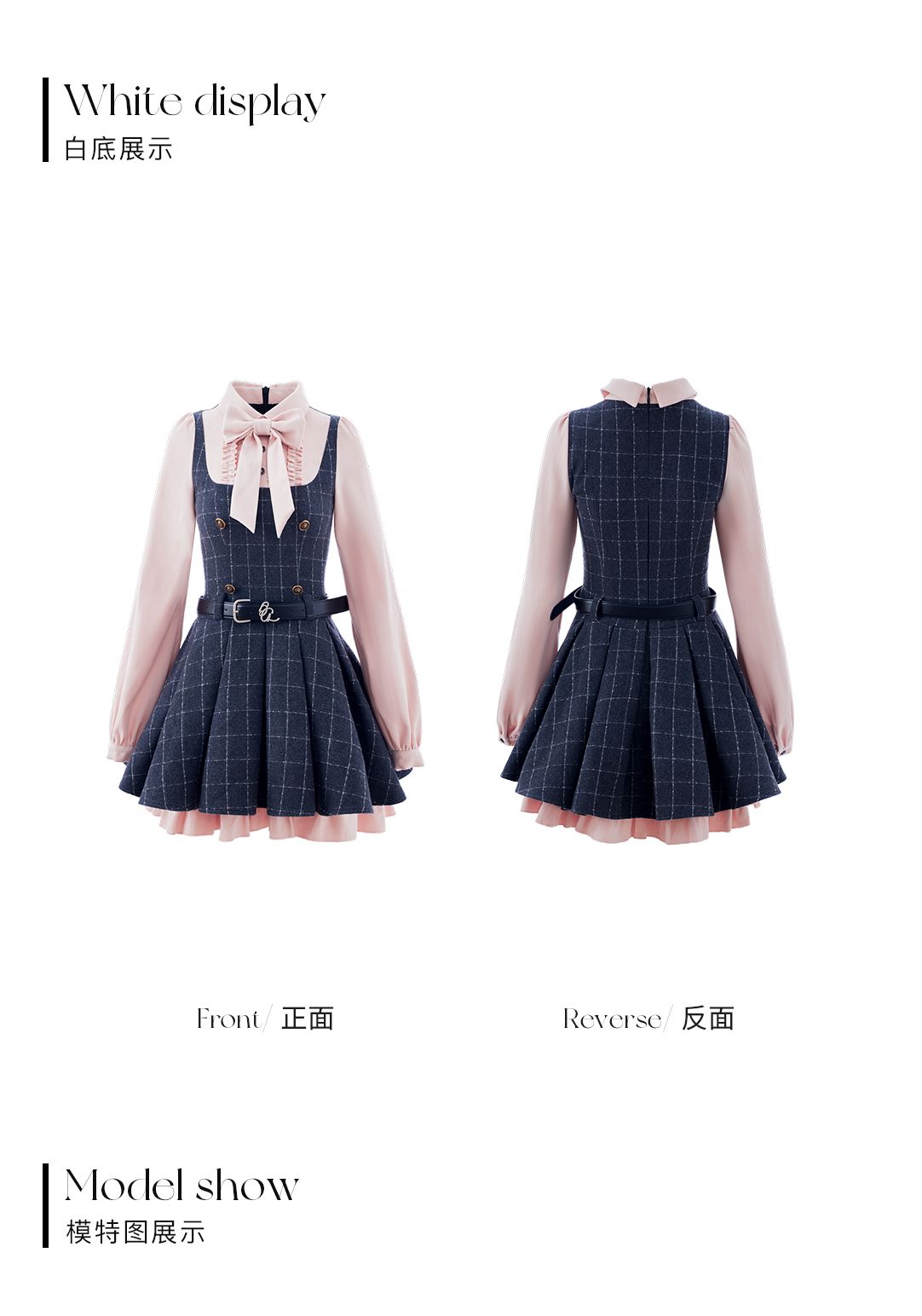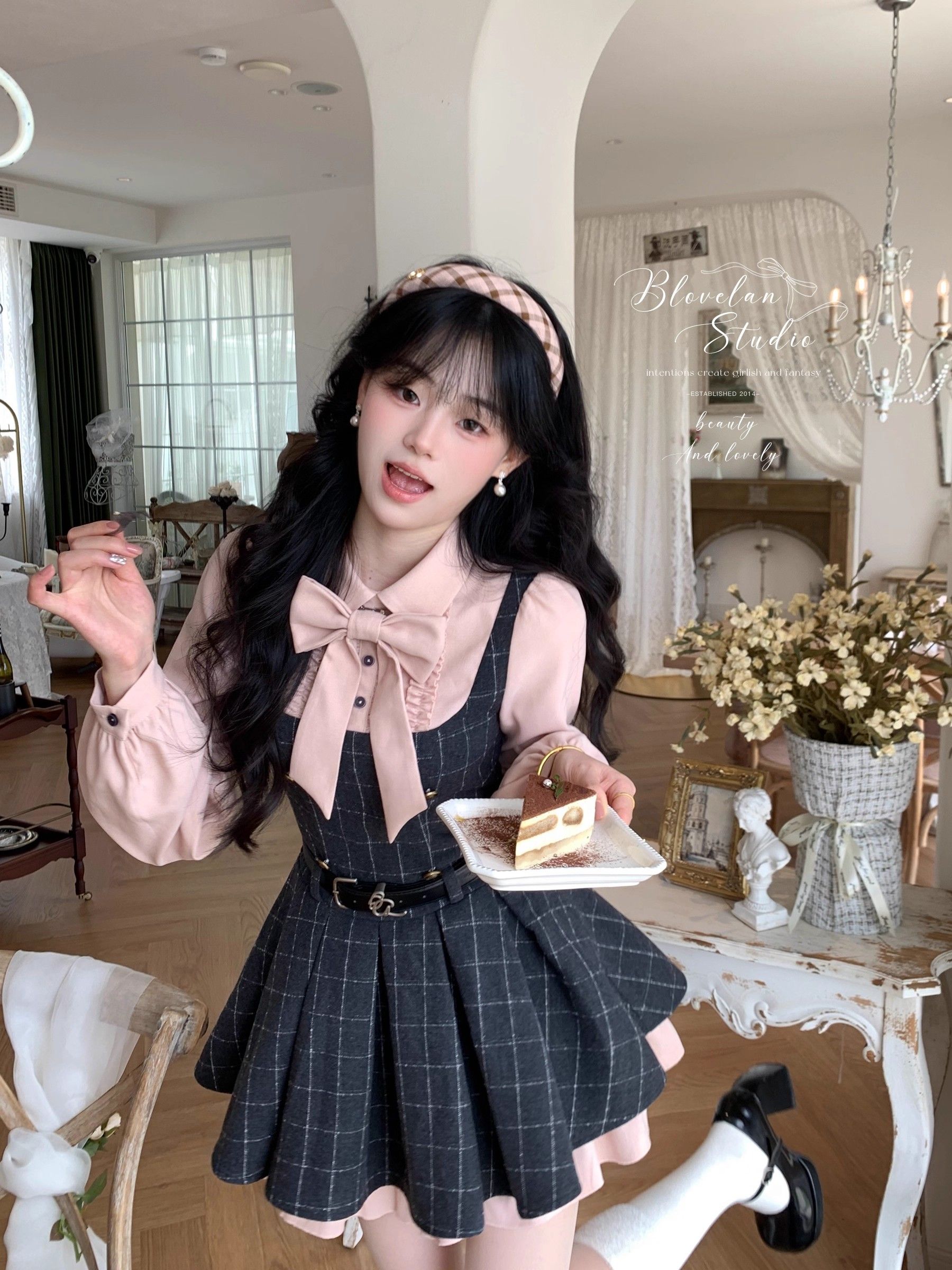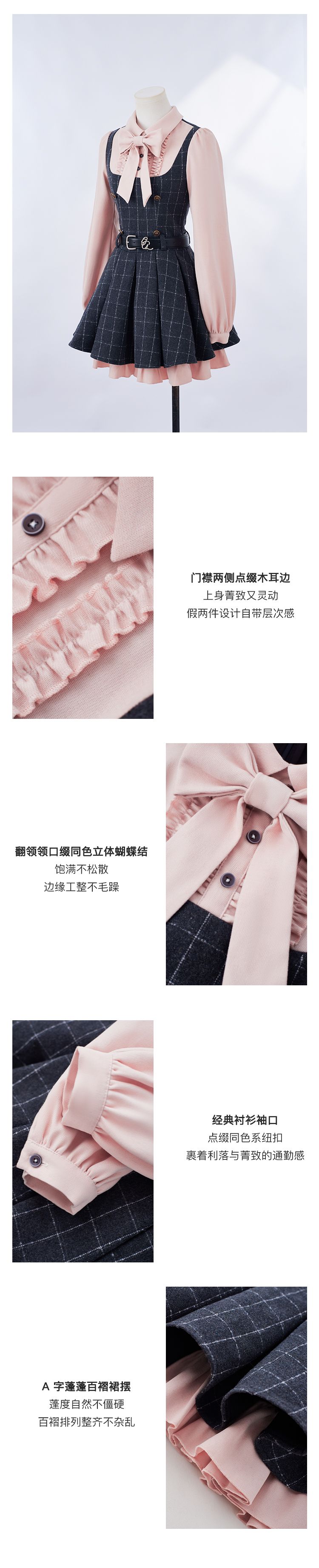 MY15494# Blovelan雾蓝 深秋新款少女感蝴蝶结衬衫格纹收腰蓬蓬百褶连衣裙女裝貨源服裝批發