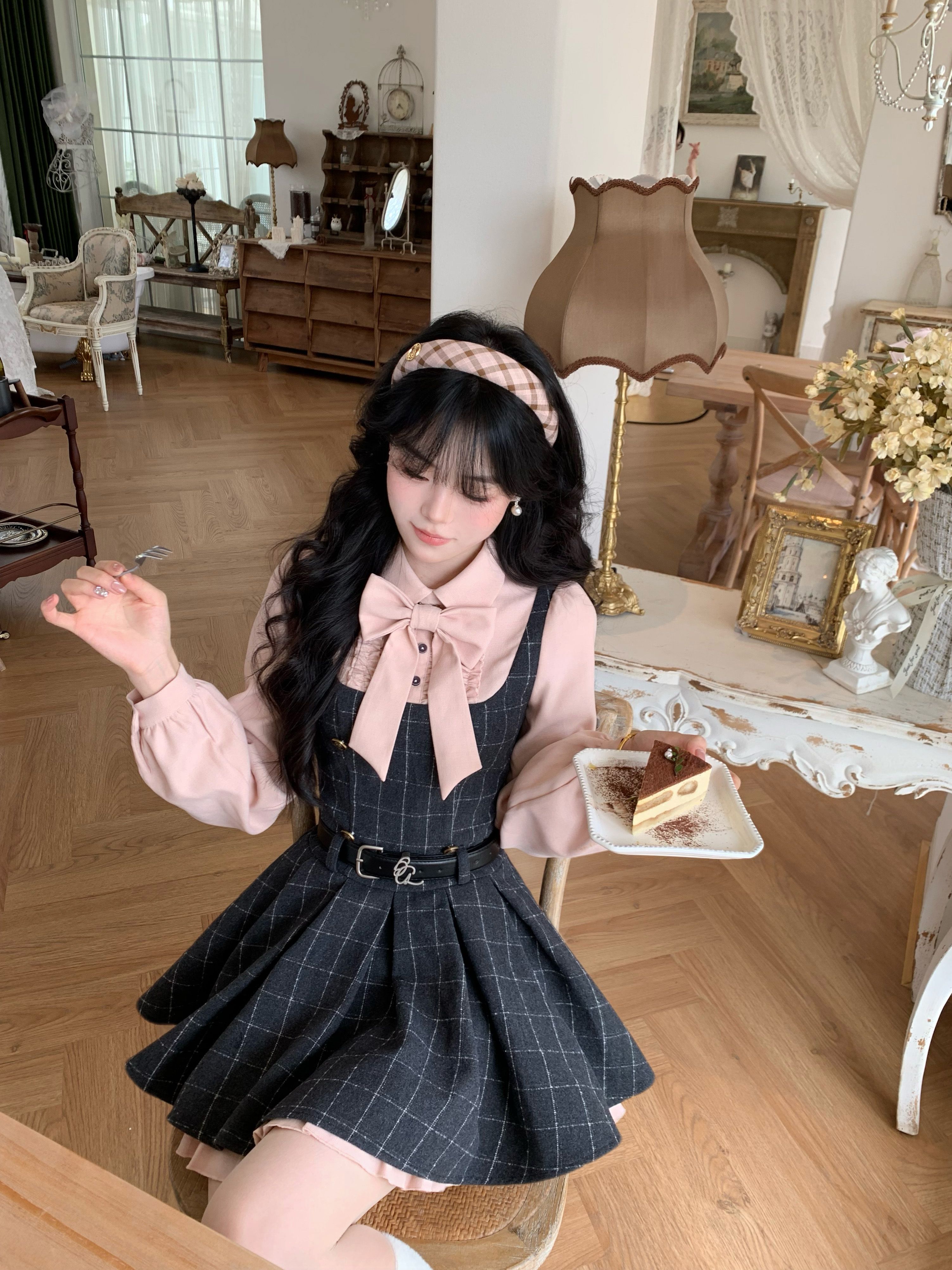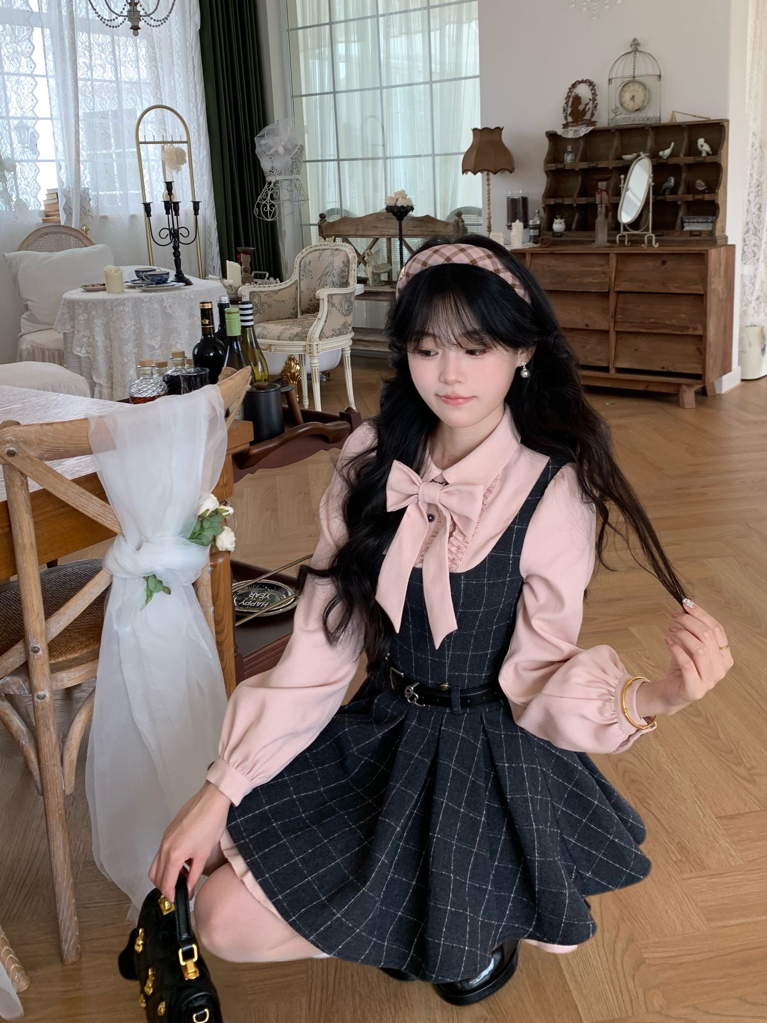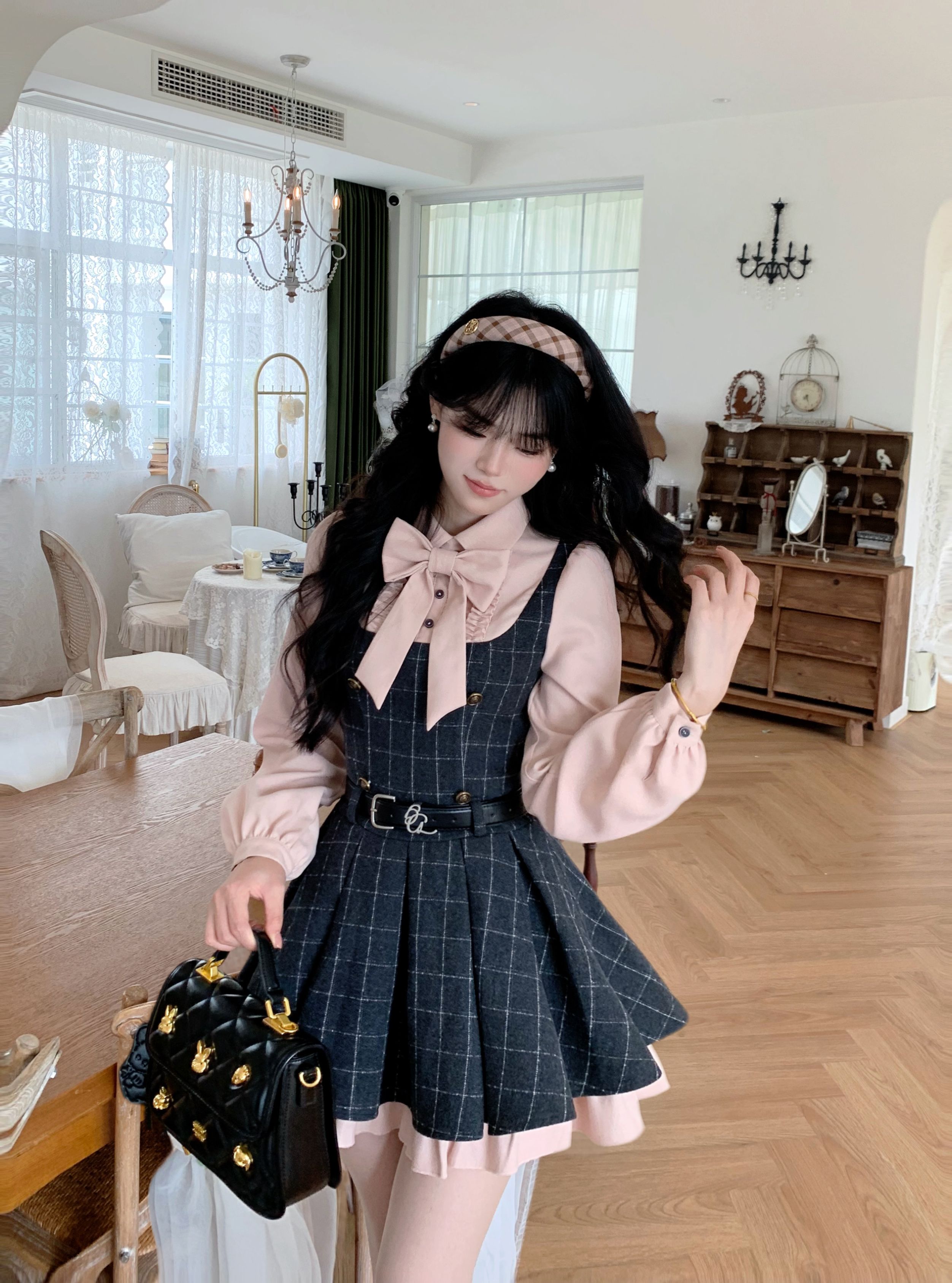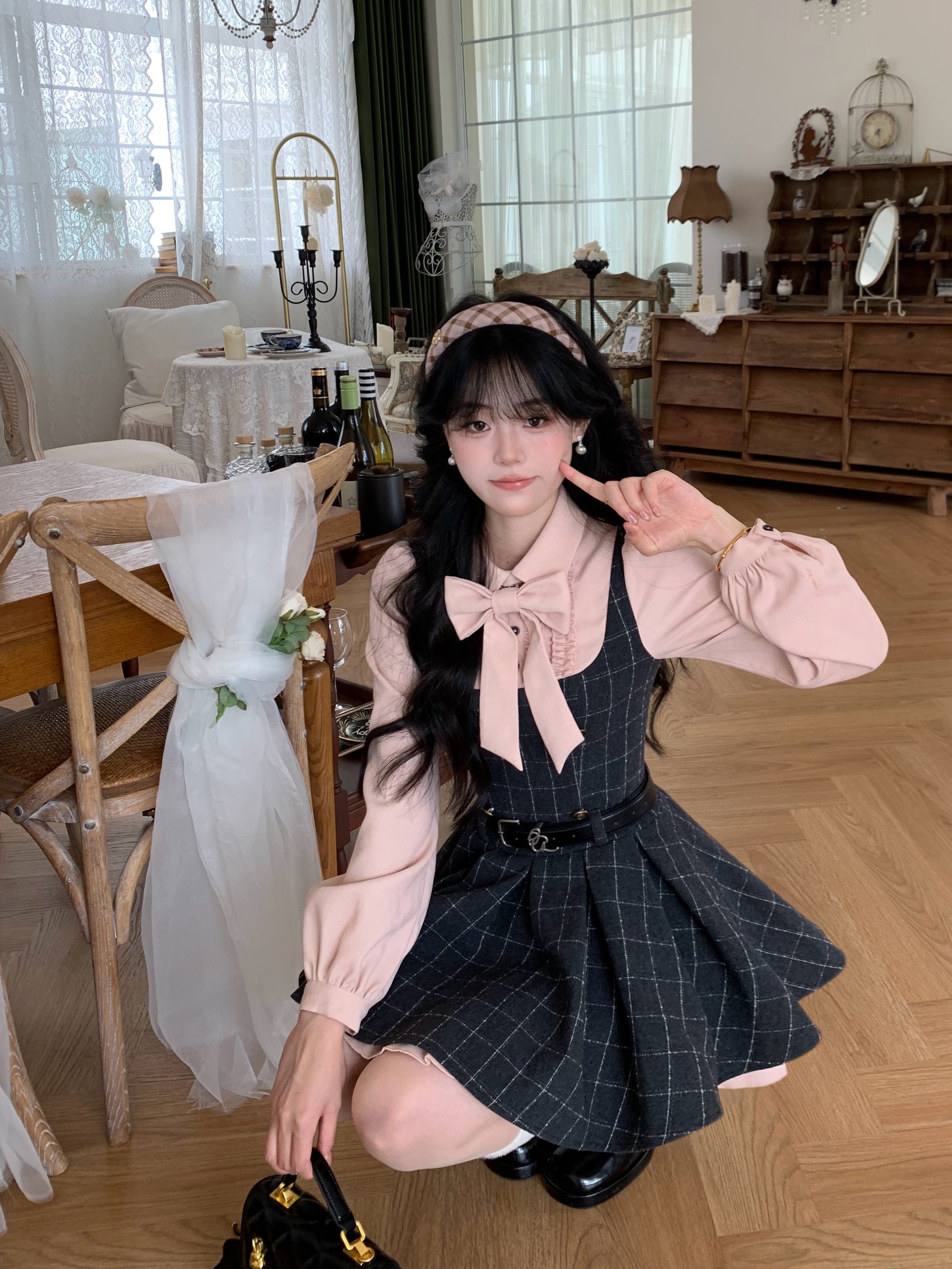 MY15494# Blovelan雾蓝 深秋新款少女感蝴蝶结衬衫格纹收腰蓬蓬百褶连衣裙女裝貨源服裝批發
