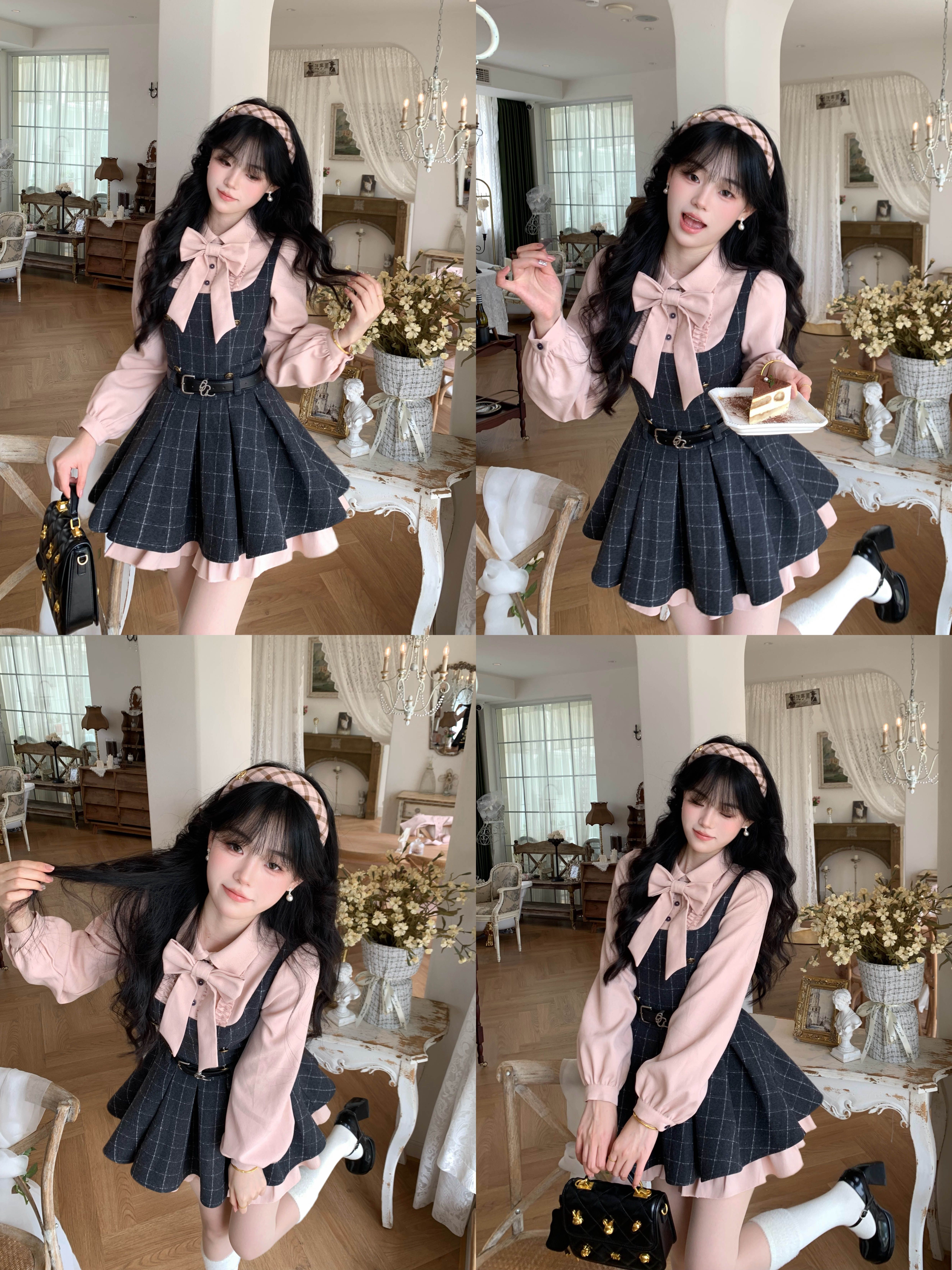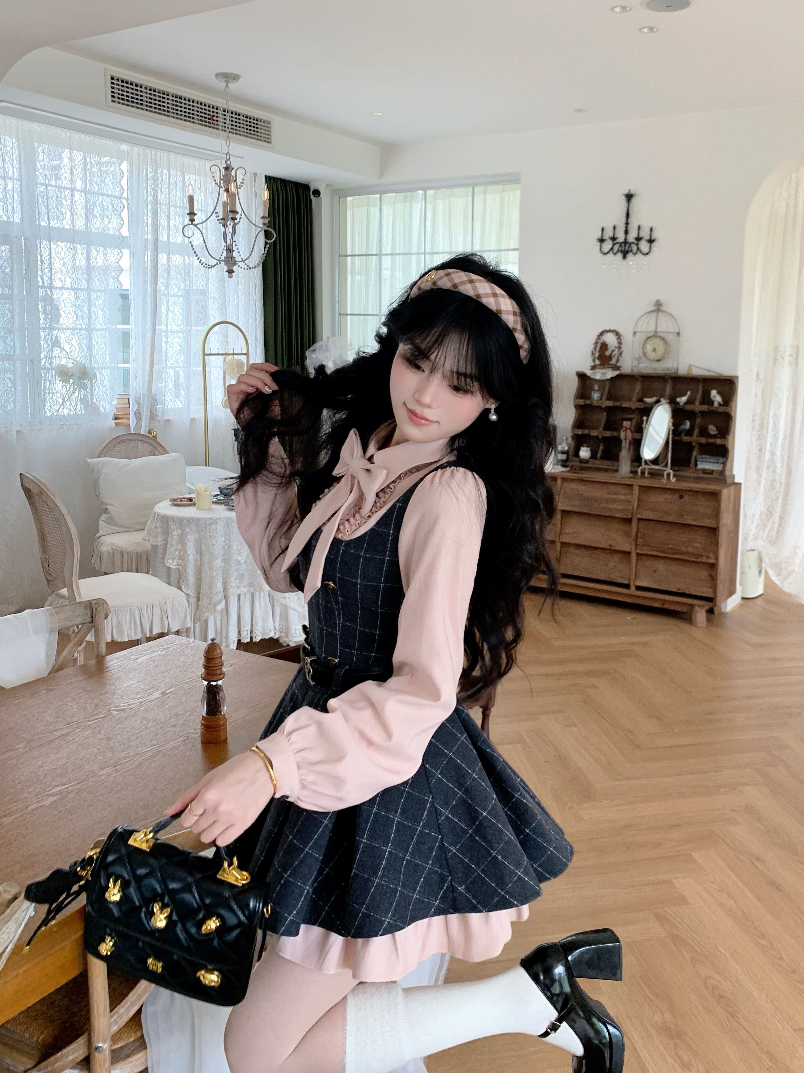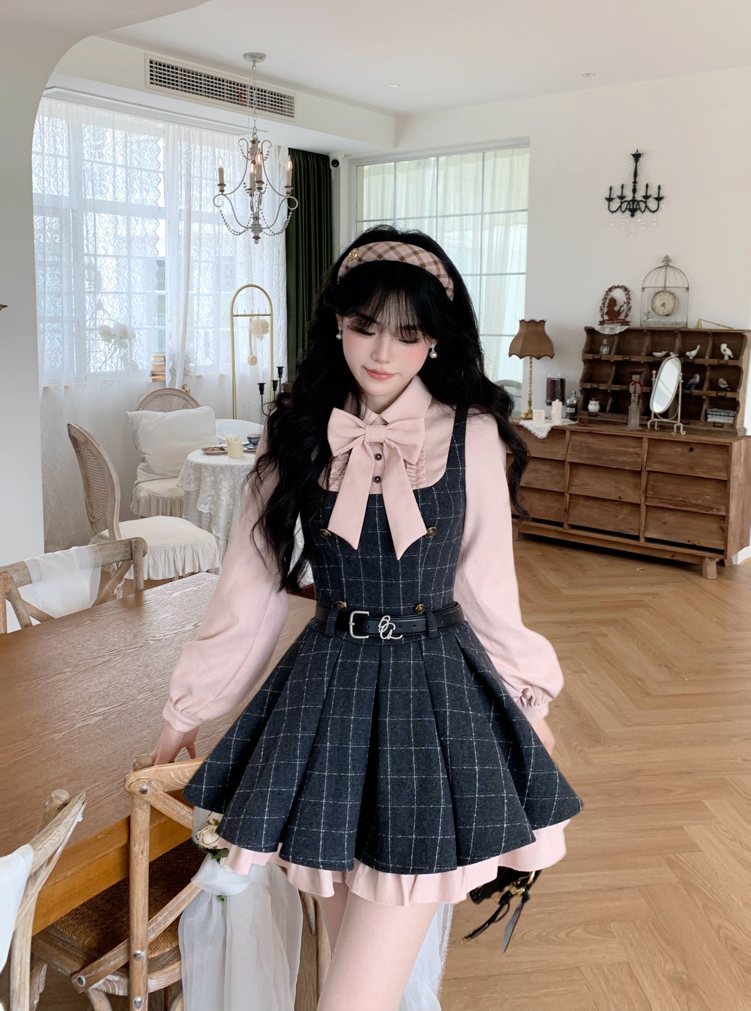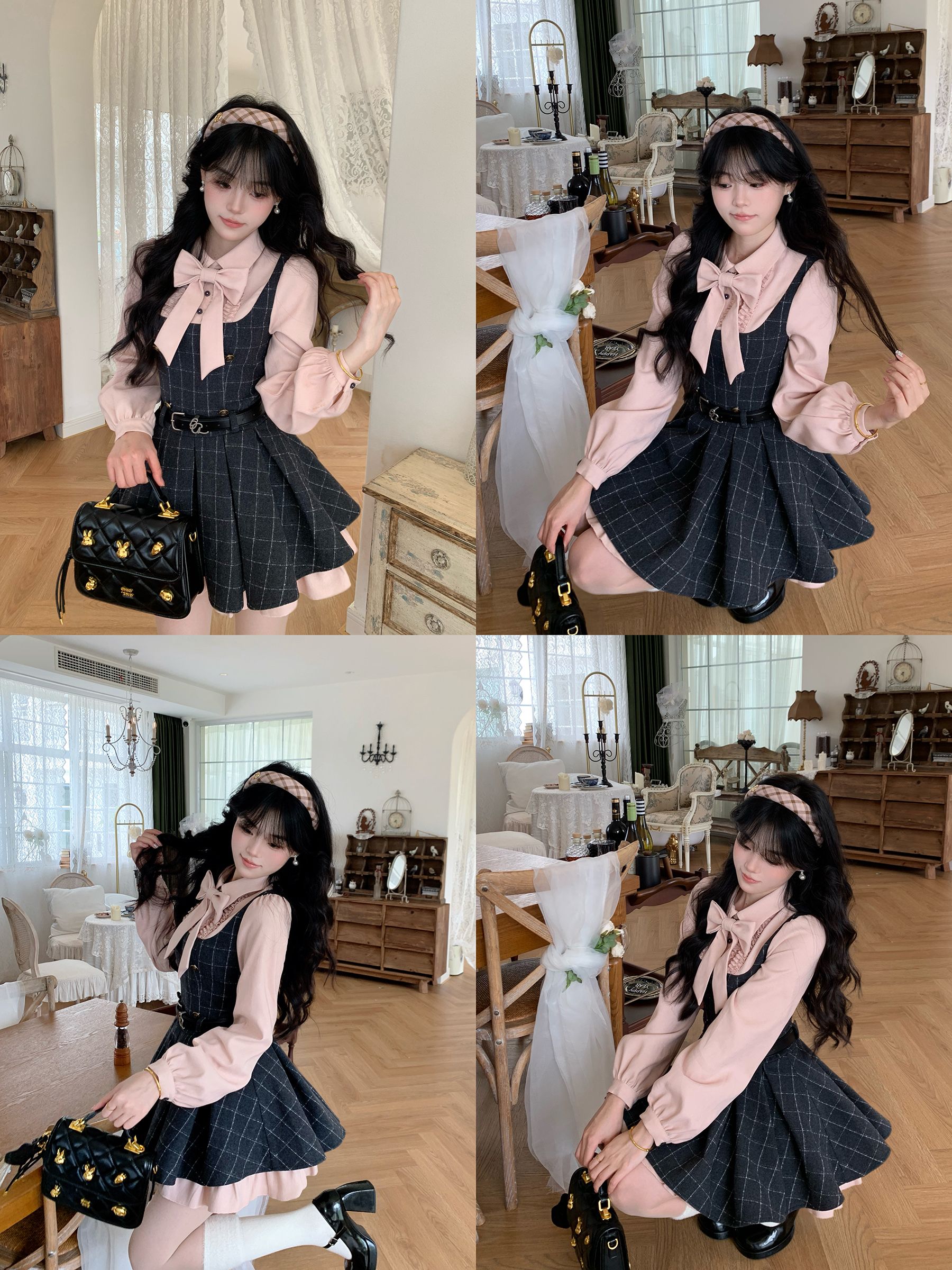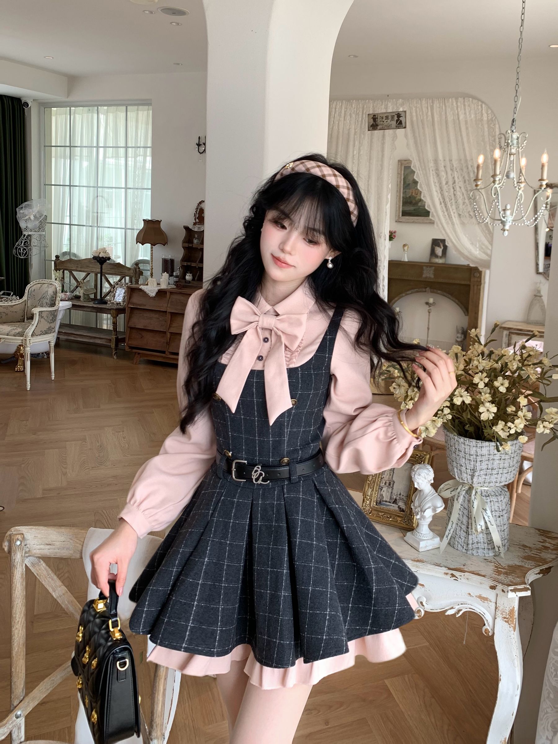 MY15494# Blovelan雾蓝 深秋新款少女感蝴蝶结衬衫格纹收腰蓬蓬百褶连衣裙女裝貨源服裝批發