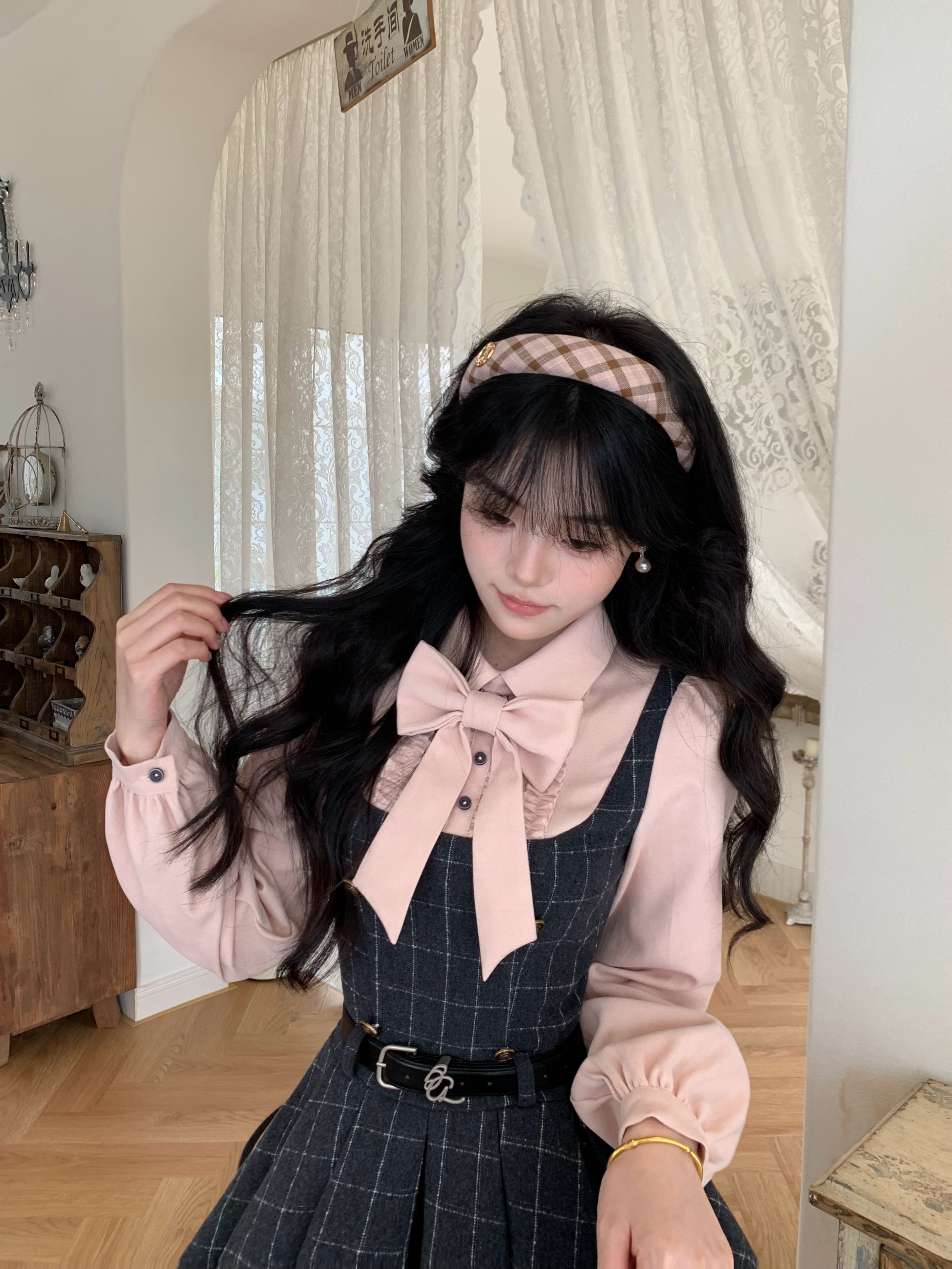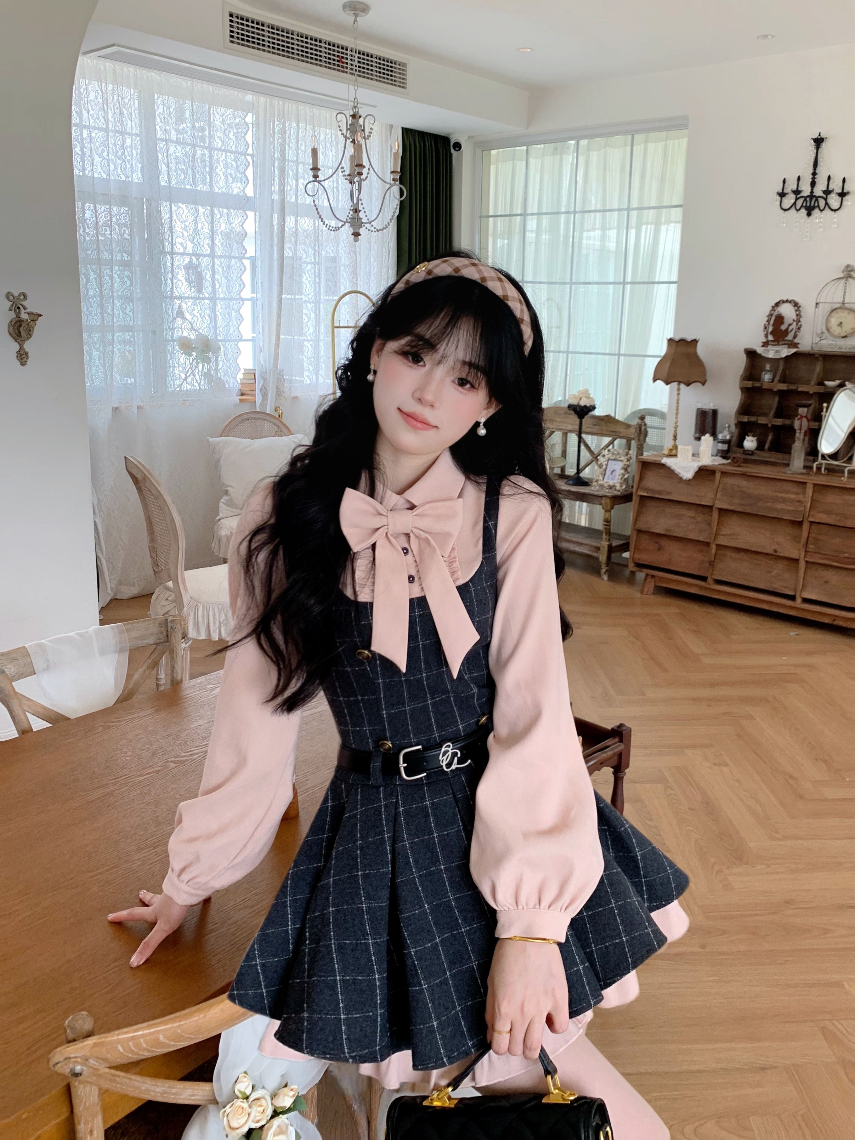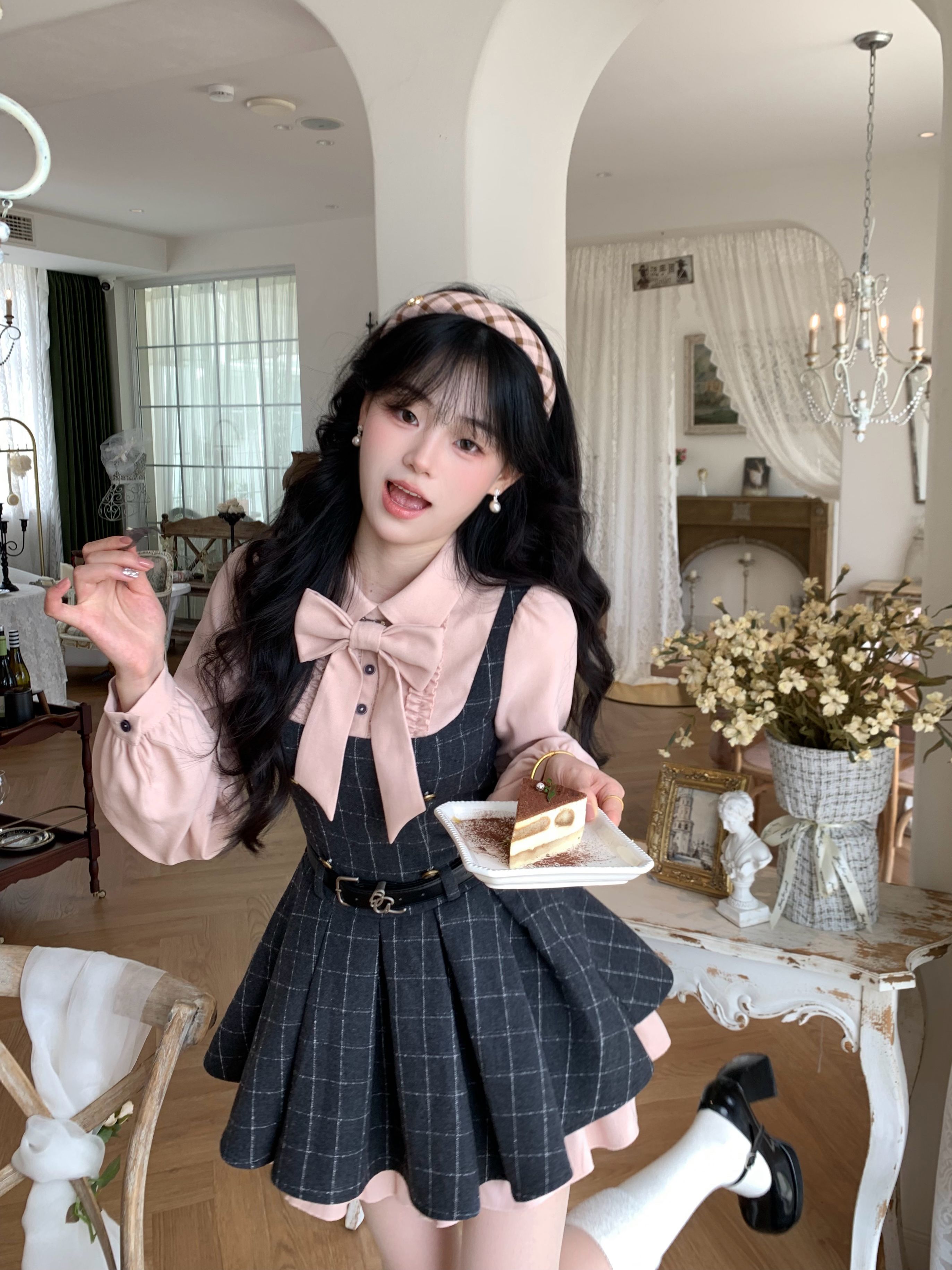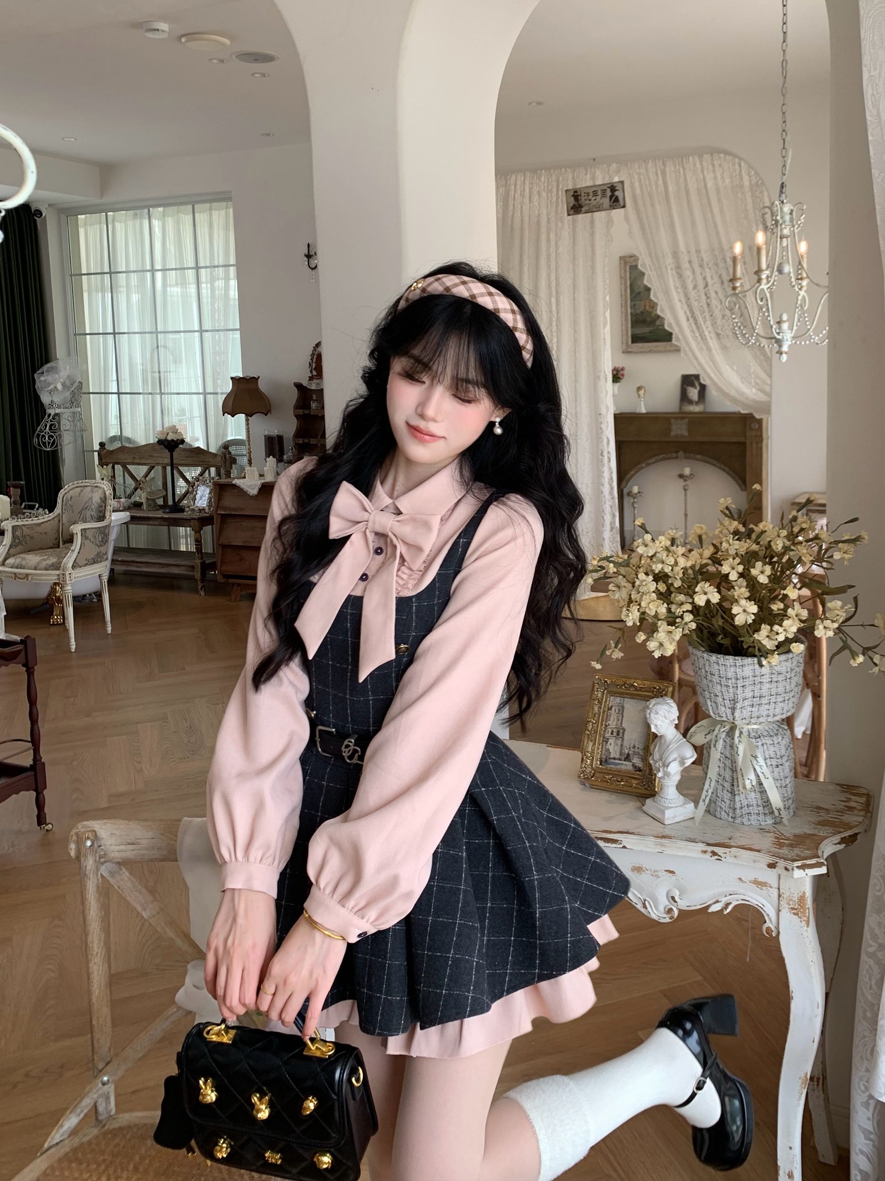 MY15494# Blovelan雾蓝 深秋新款少女感蝴蝶结衬衫格纹收腰蓬蓬百褶连衣裙女裝貨源服裝批發