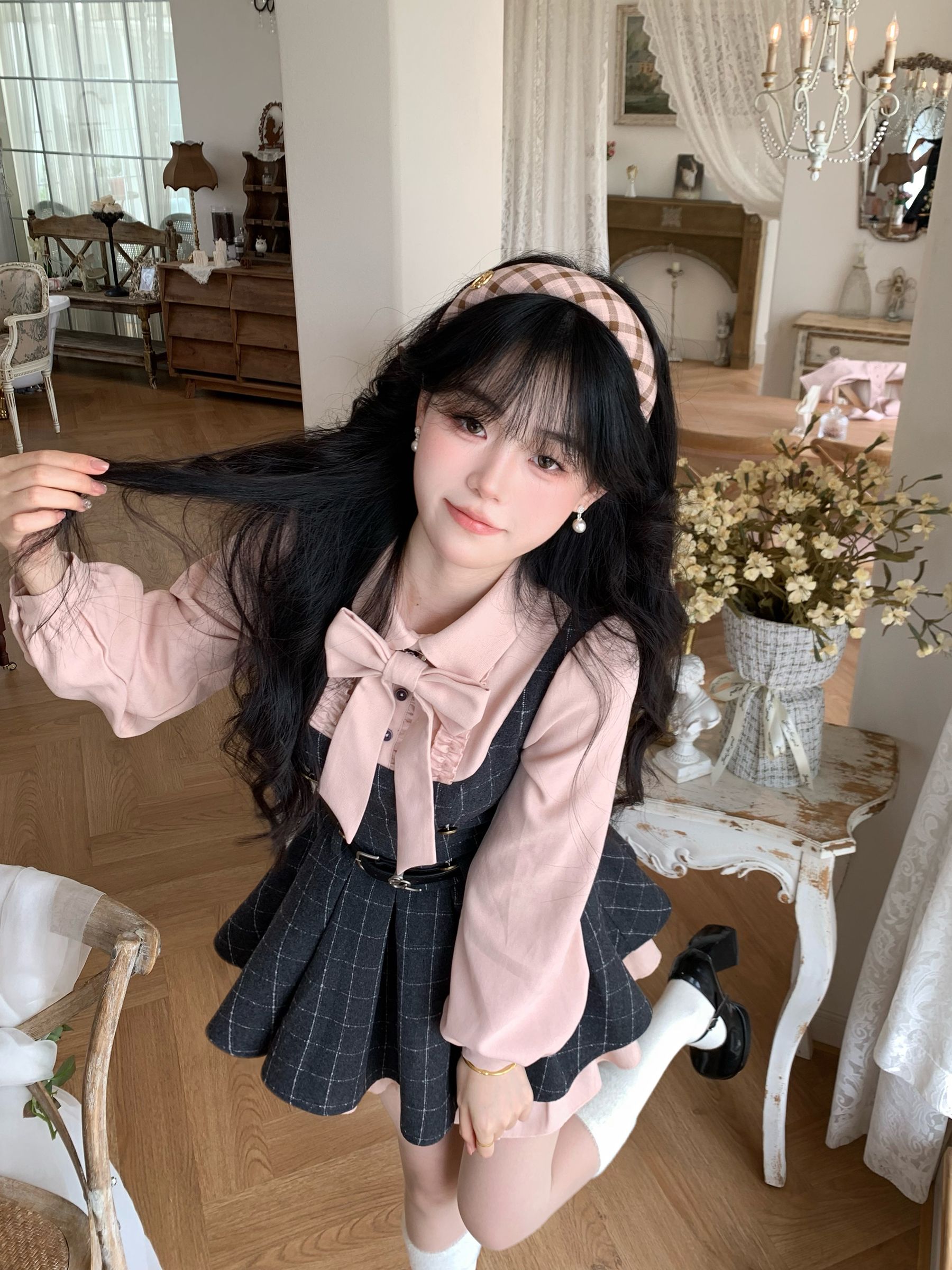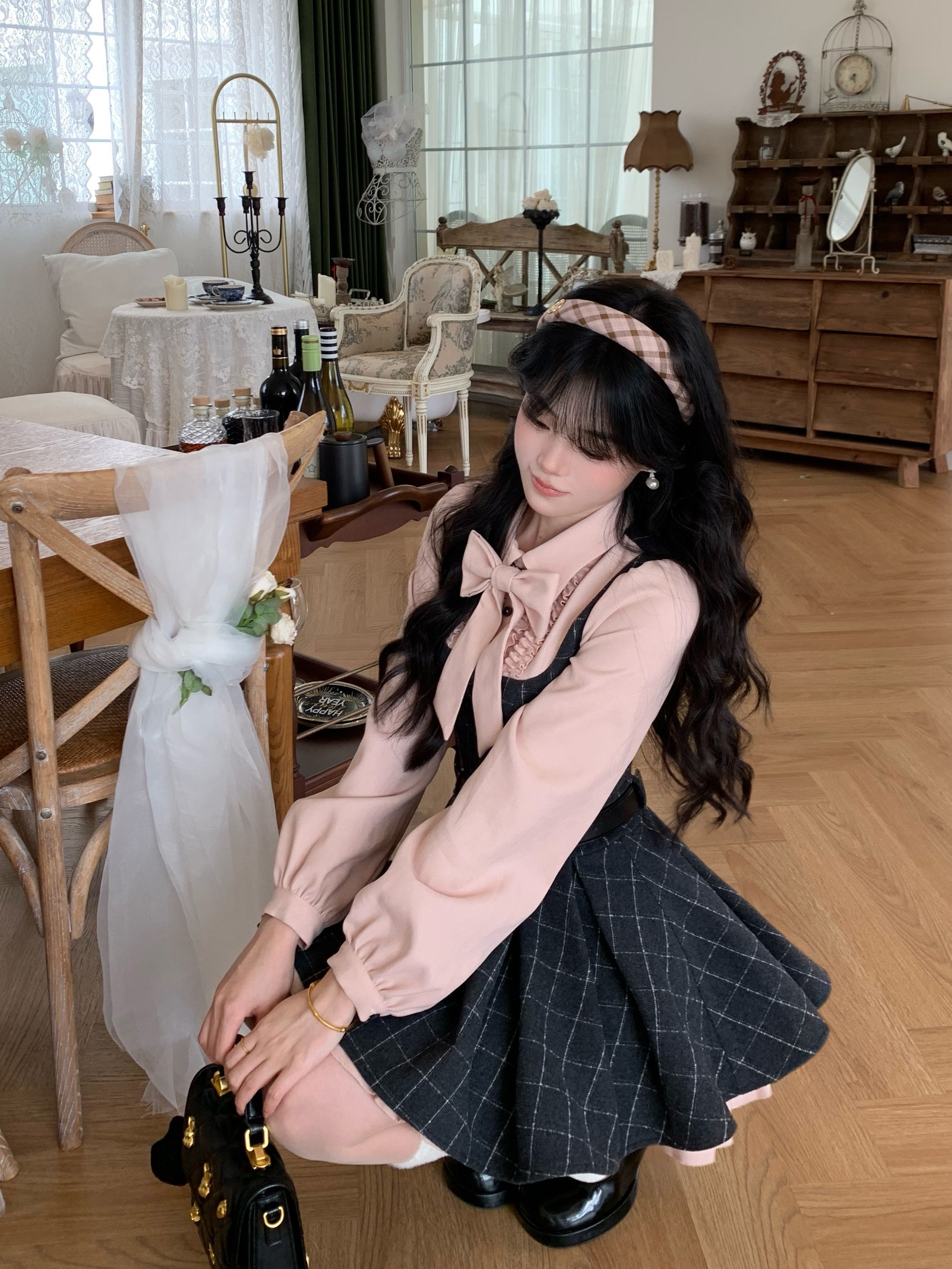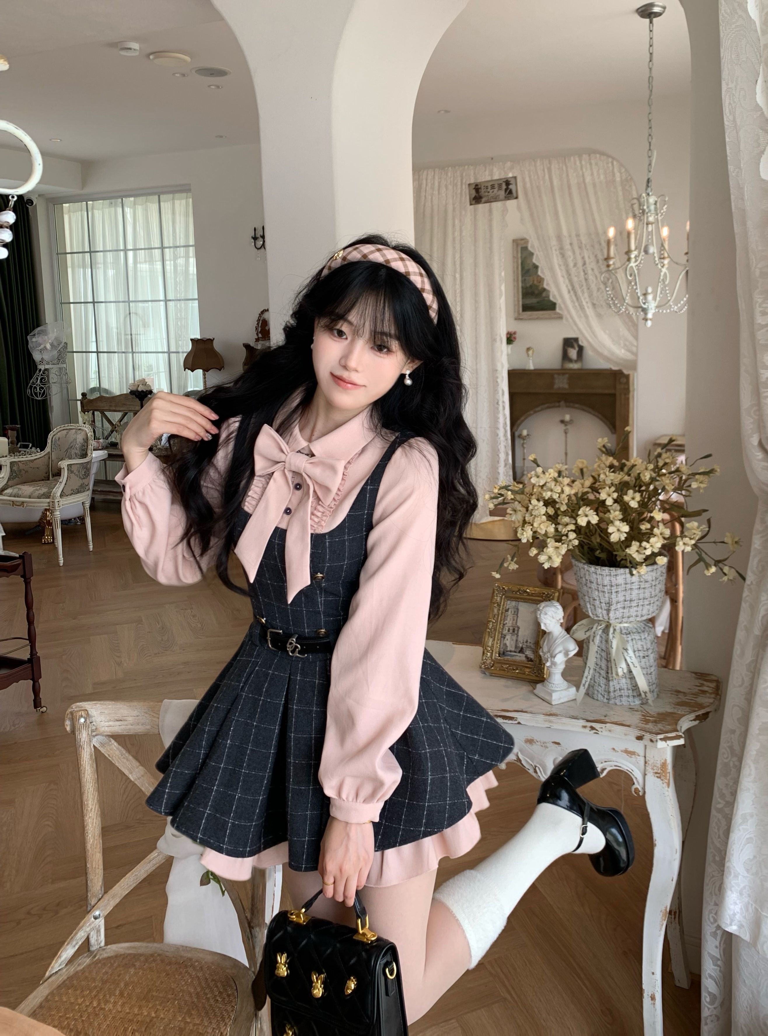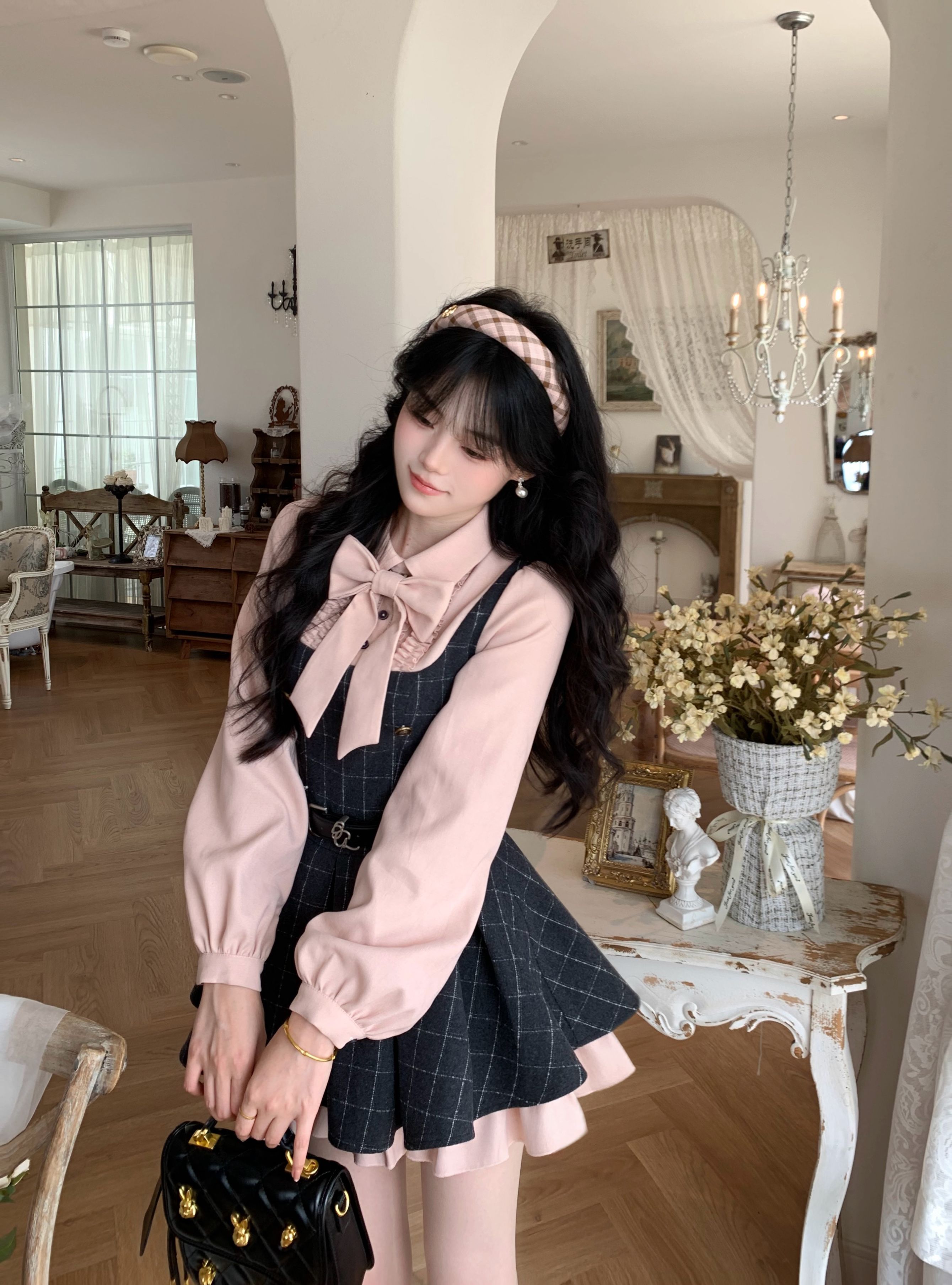 MY15494# Blovelan雾蓝 深秋新款少女感蝴蝶结衬衫格纹收腰蓬蓬百褶连衣裙女裝貨源服裝批發