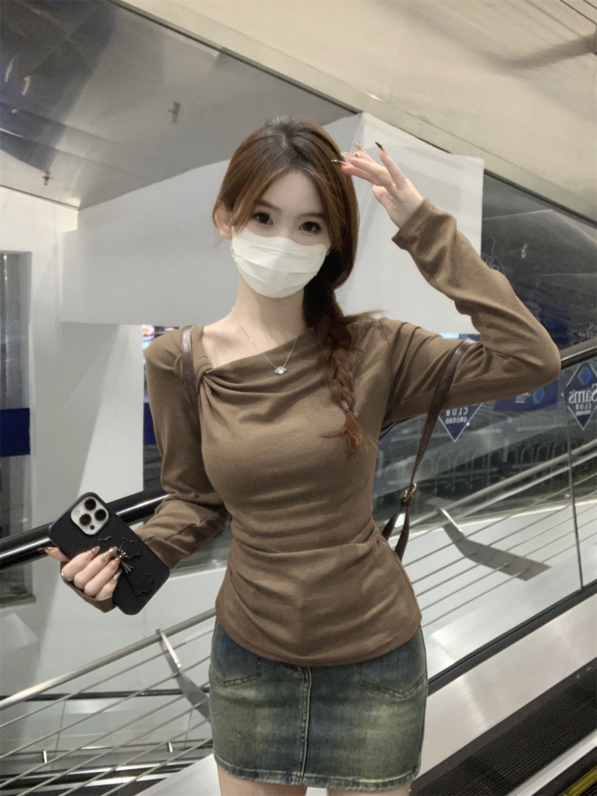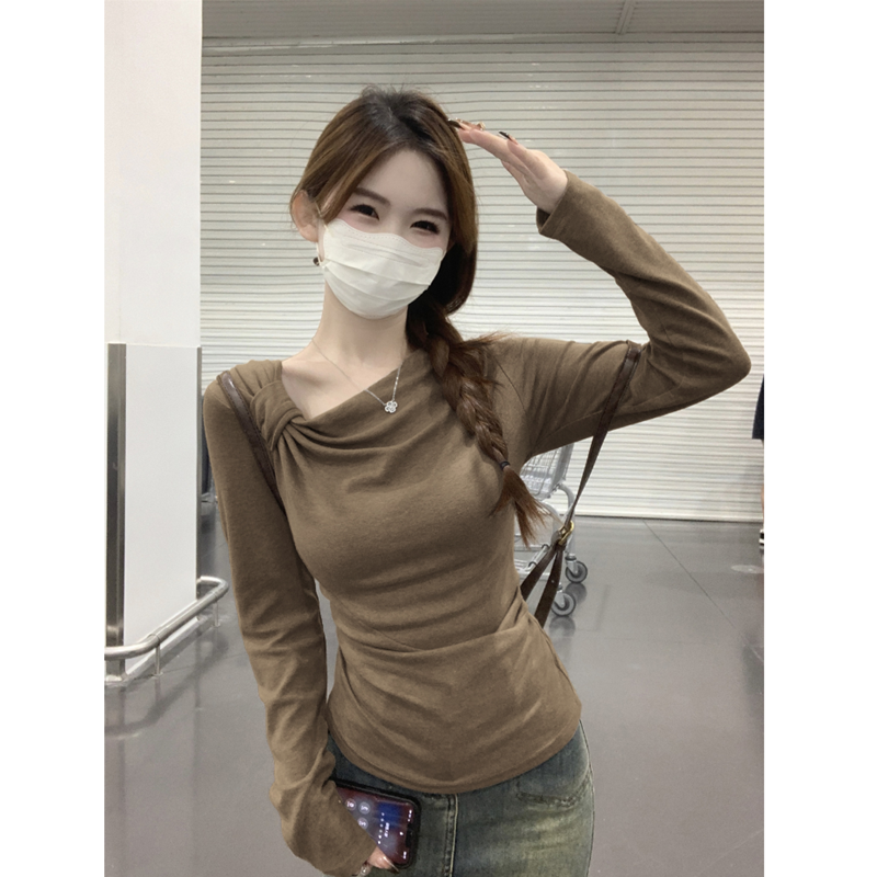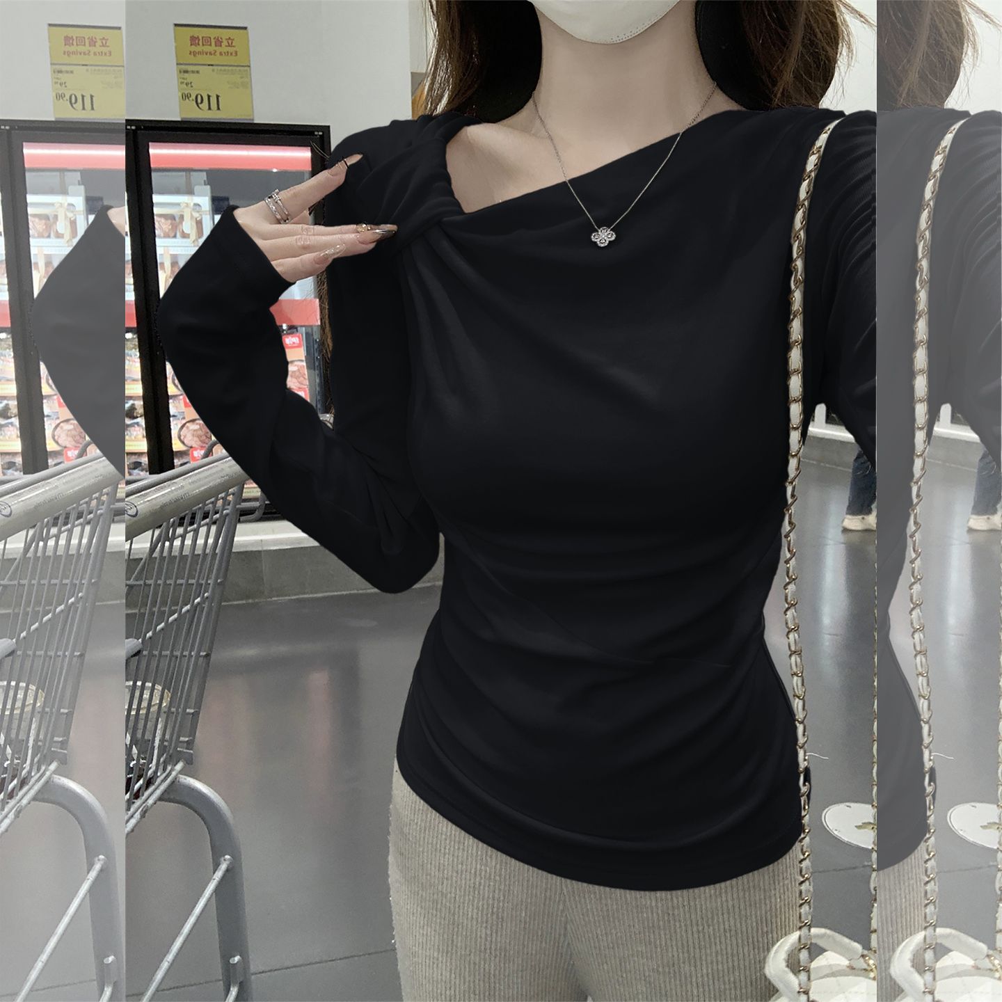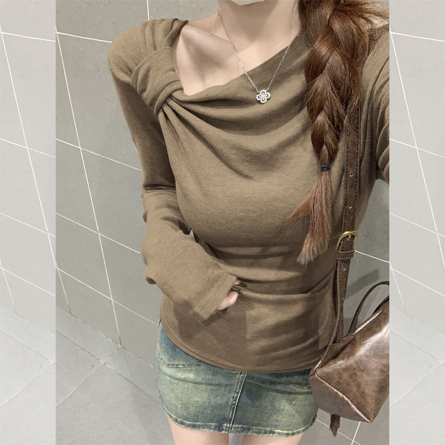 MY15495# 精品羊绒 斜领长袖t恤女秋季修身设计感小众内搭打底衫上衣女裝貨源服裝批發