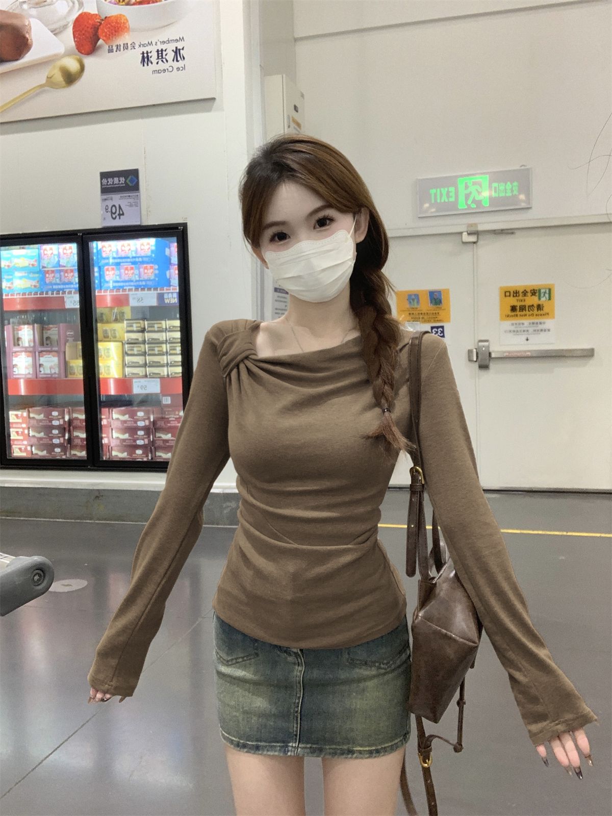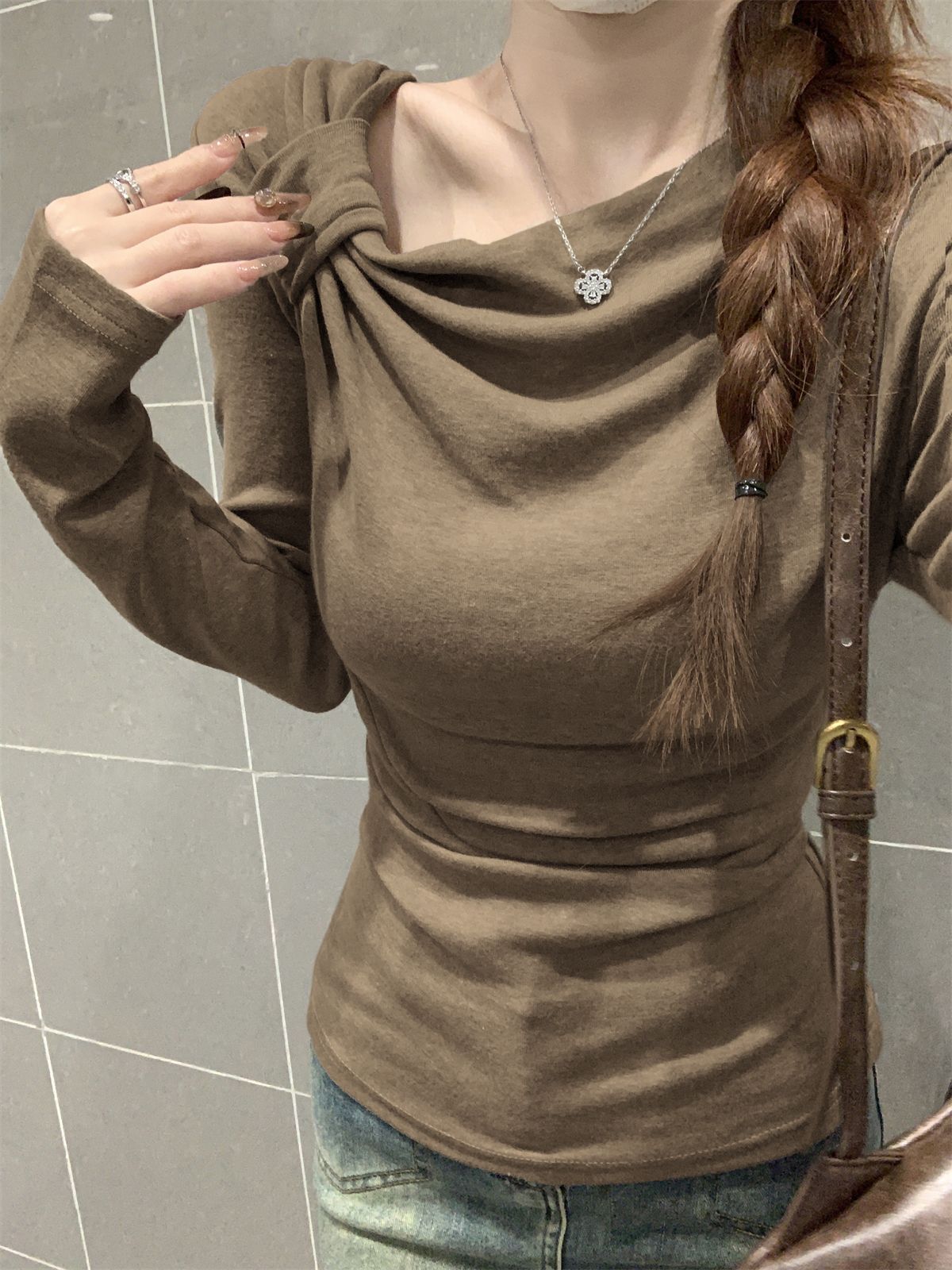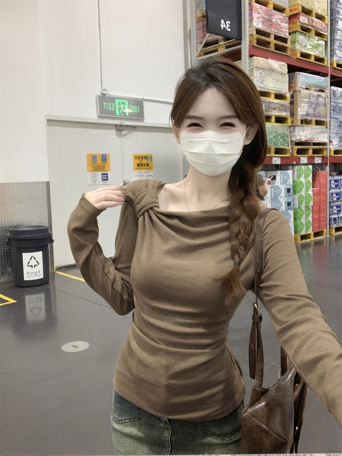MY15495# 精品羊绒 斜领长袖t恤女秋季修身设计感小众内搭打底衫上衣女裝貨源服裝批發