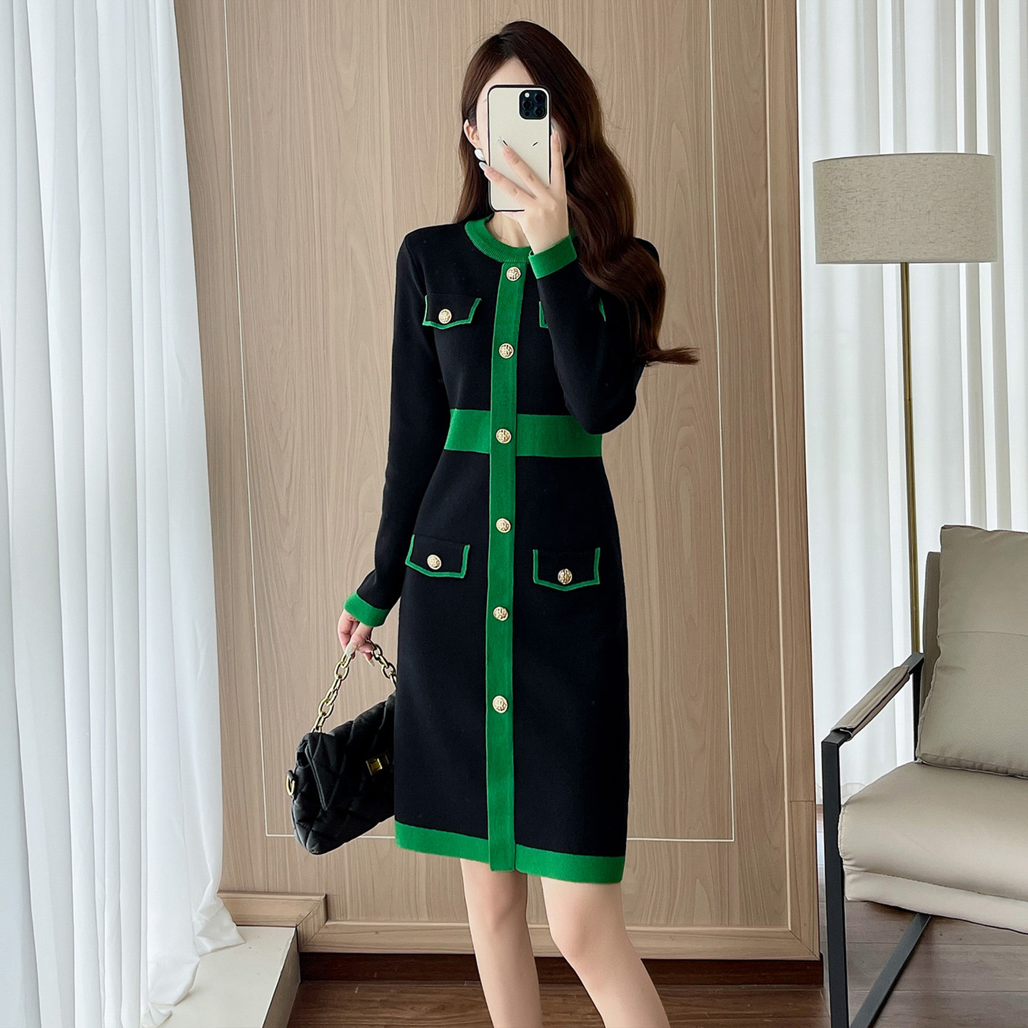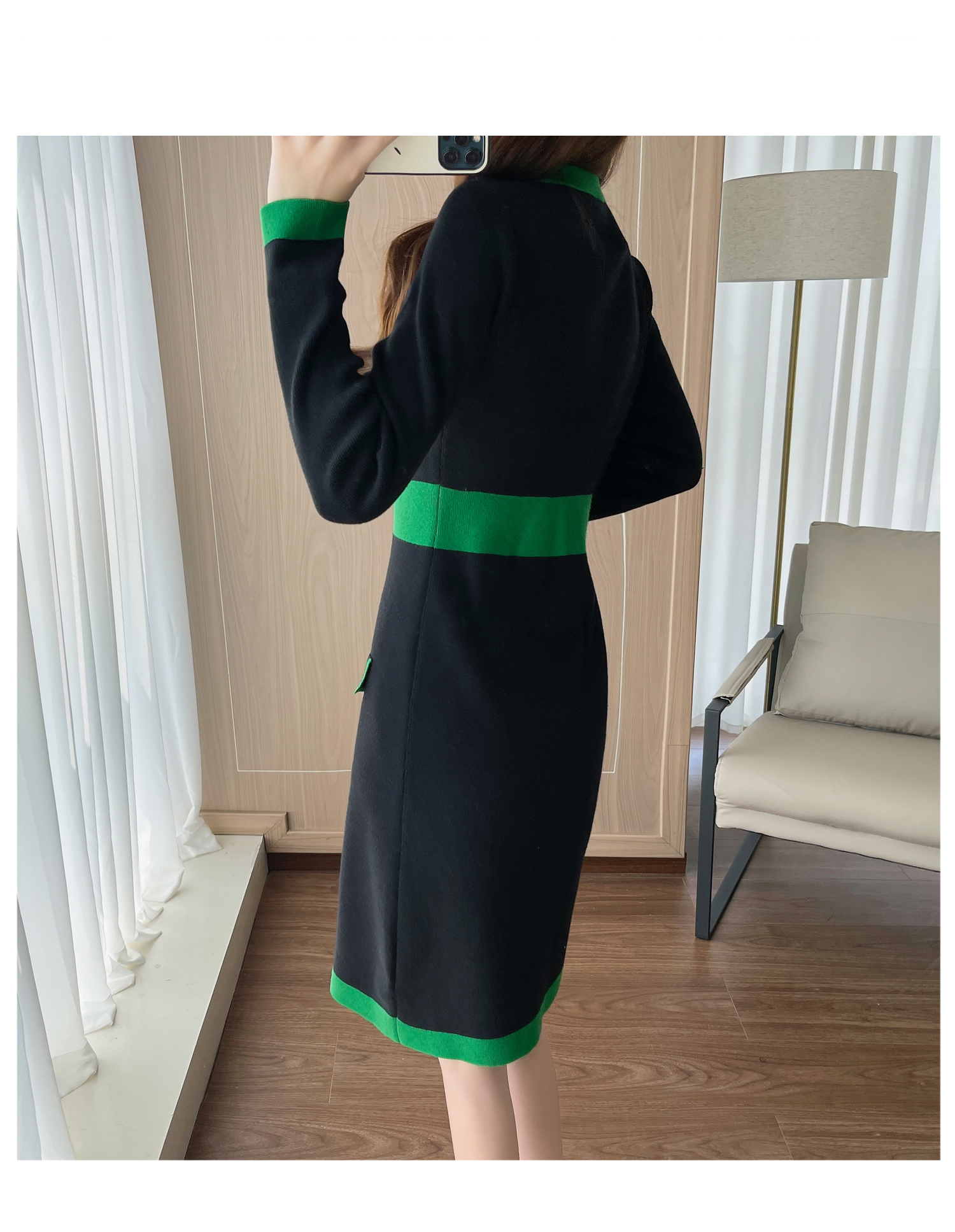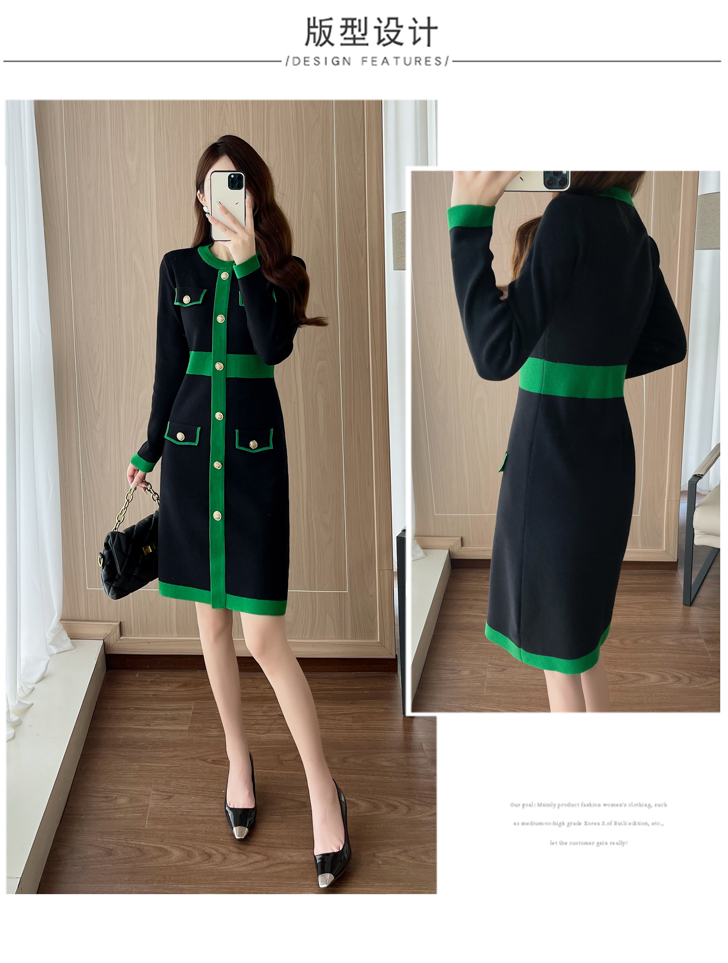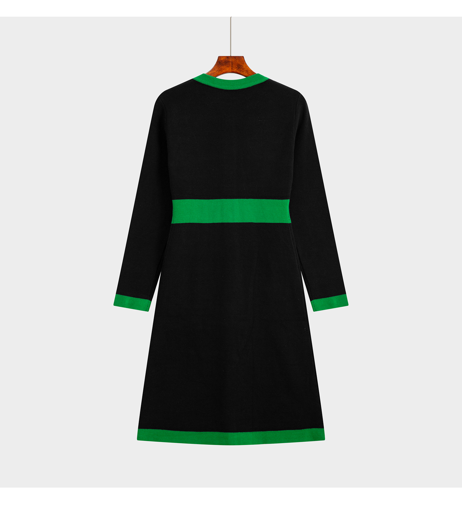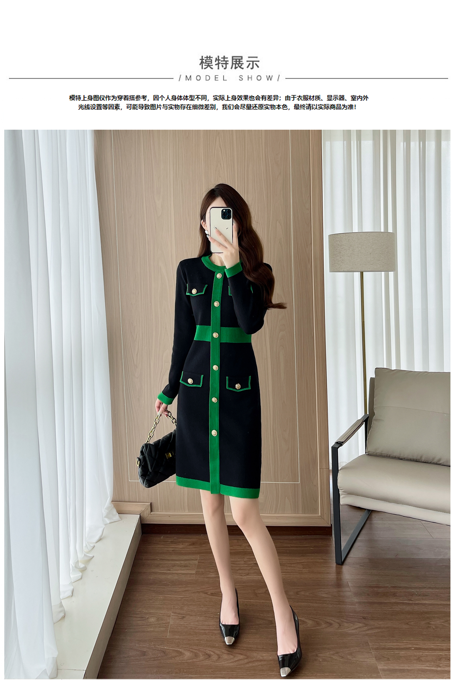 MY15496# 韩国高端气质针织撞色拼接圆领长袖毛衣连衣裙收腰显瘦打底裙女裝貨源服裝批發