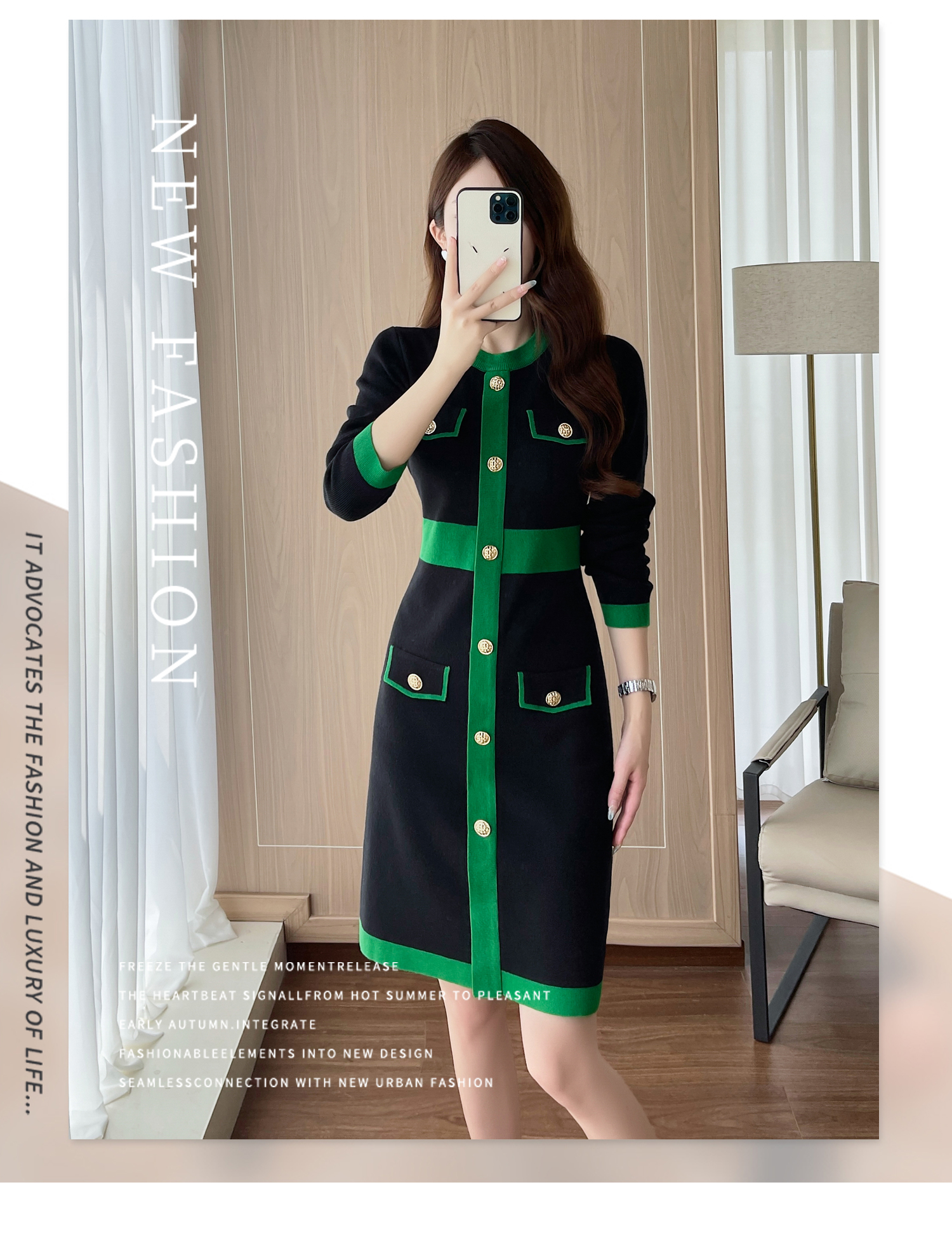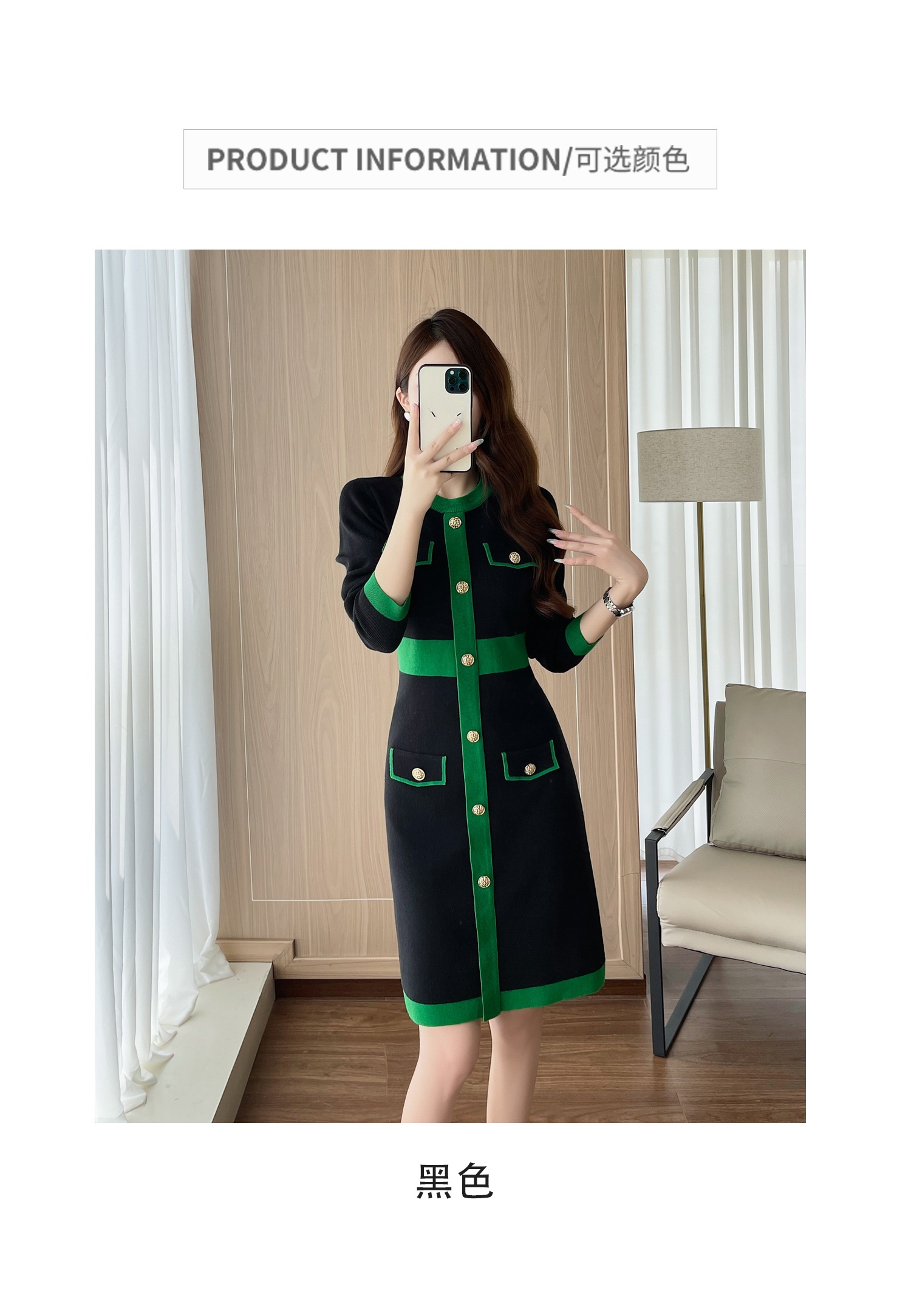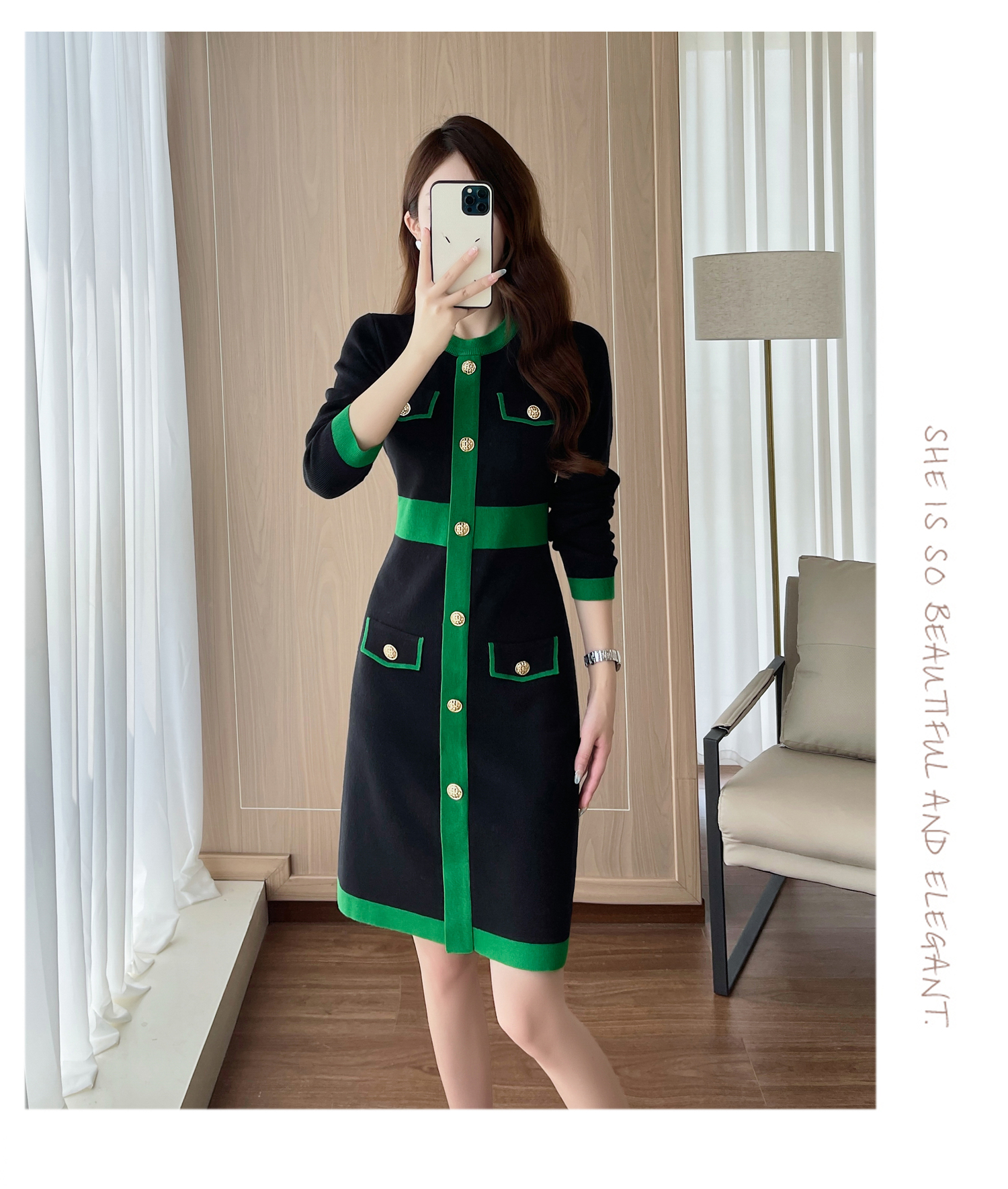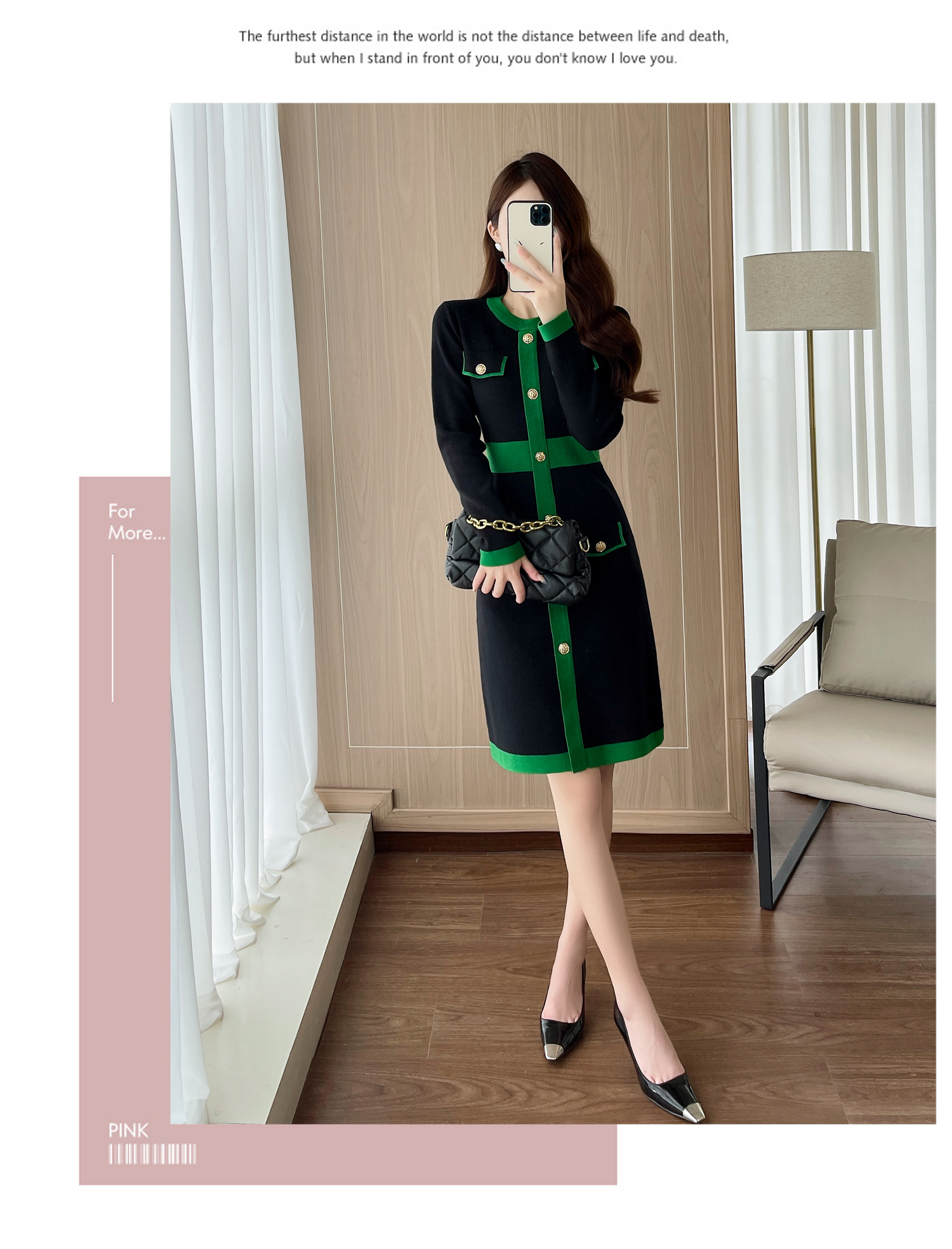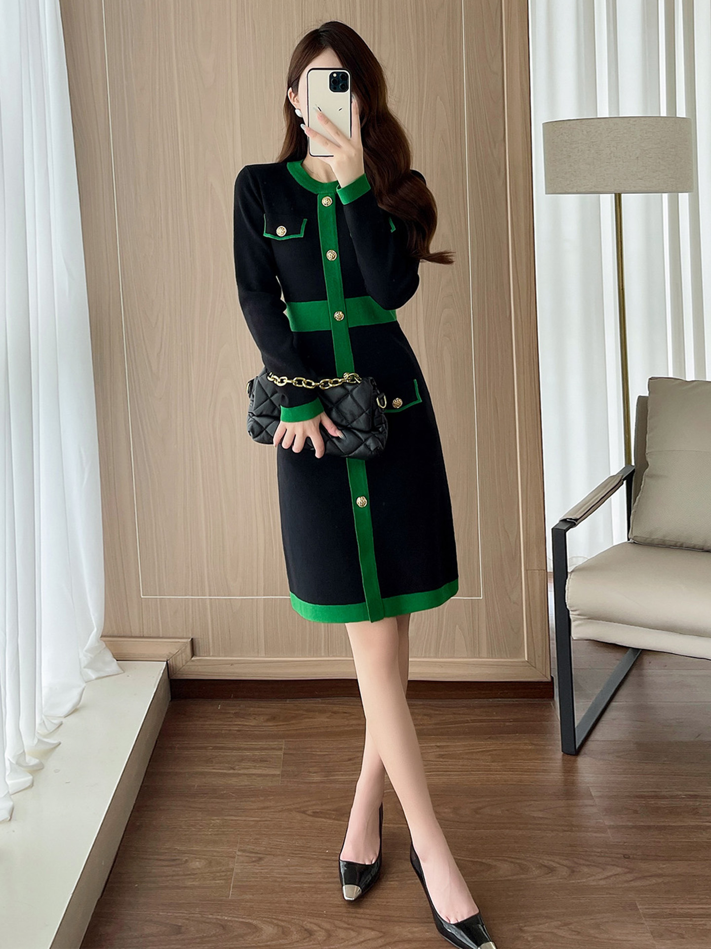MY15496# 韩国高端气质针织撞色拼接圆领长袖毛衣连衣裙收腰显瘦打底裙女裝貨源服裝批發
