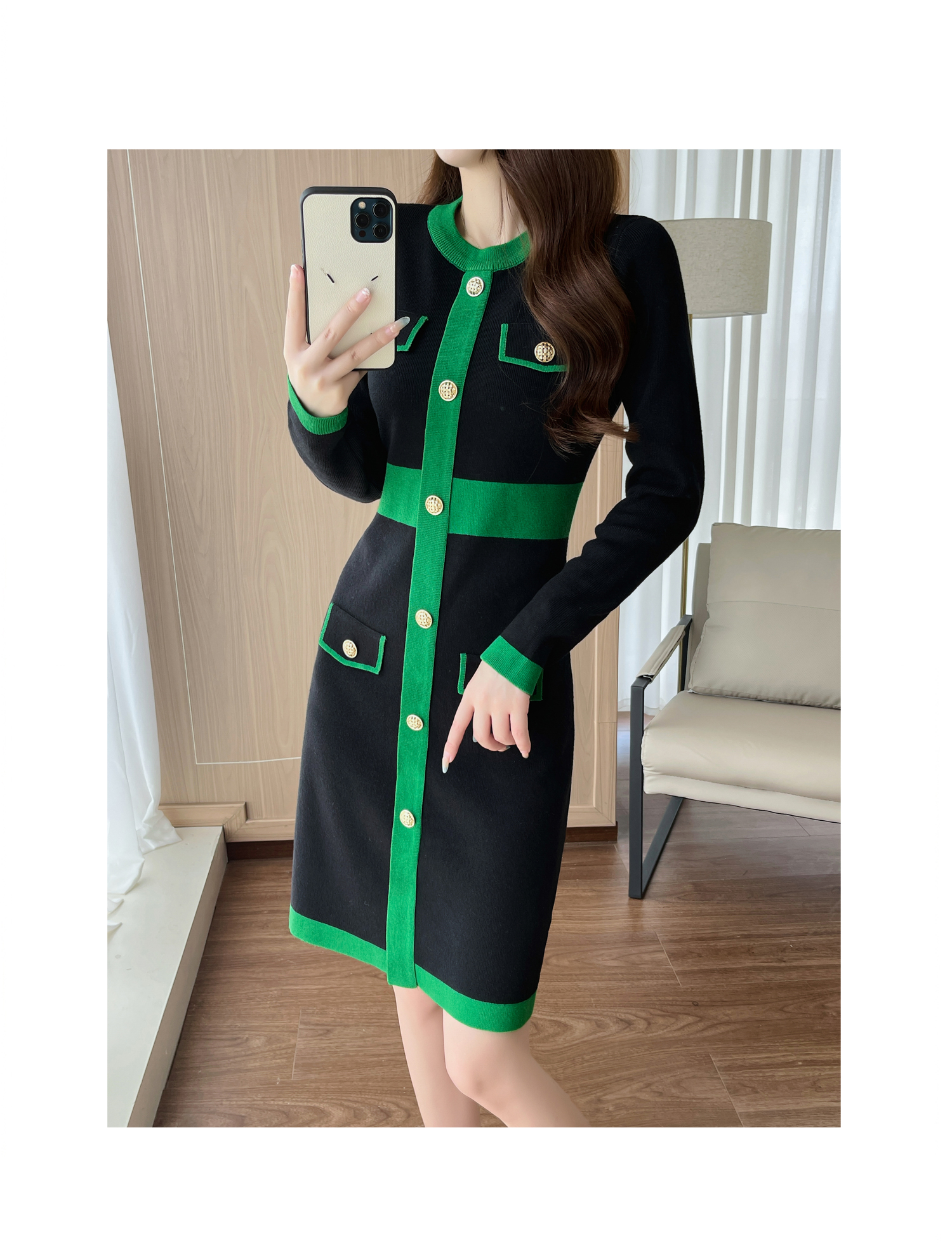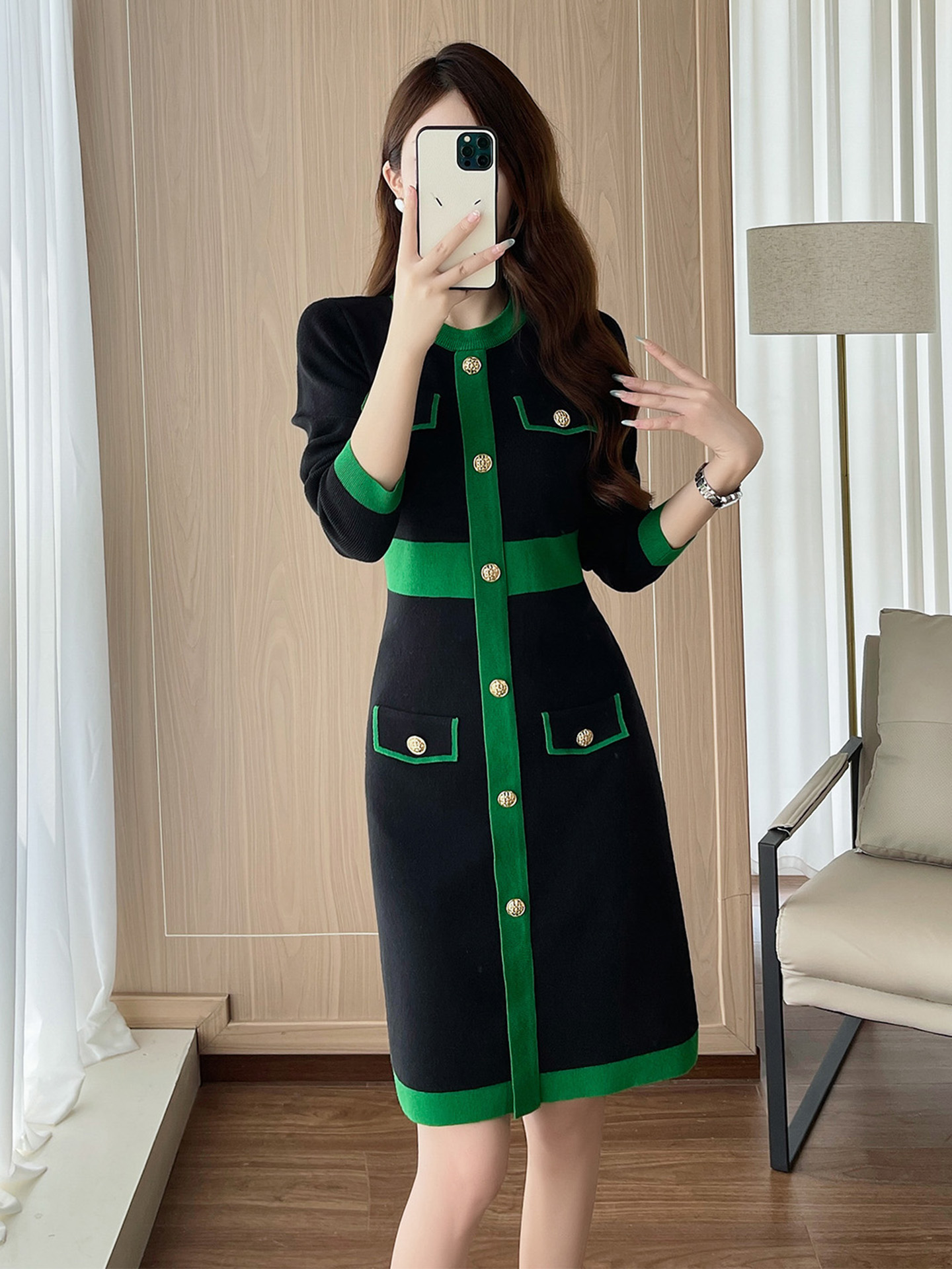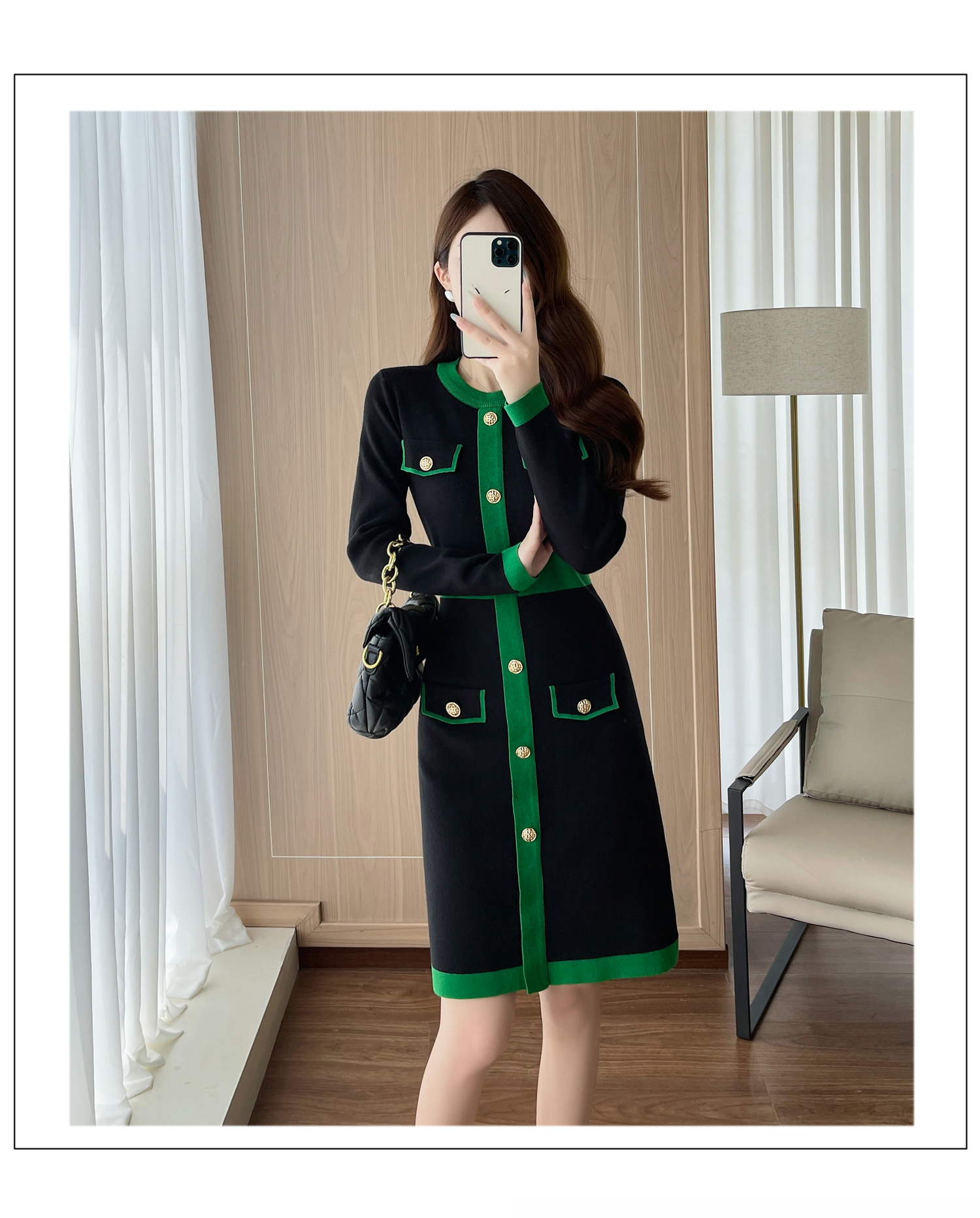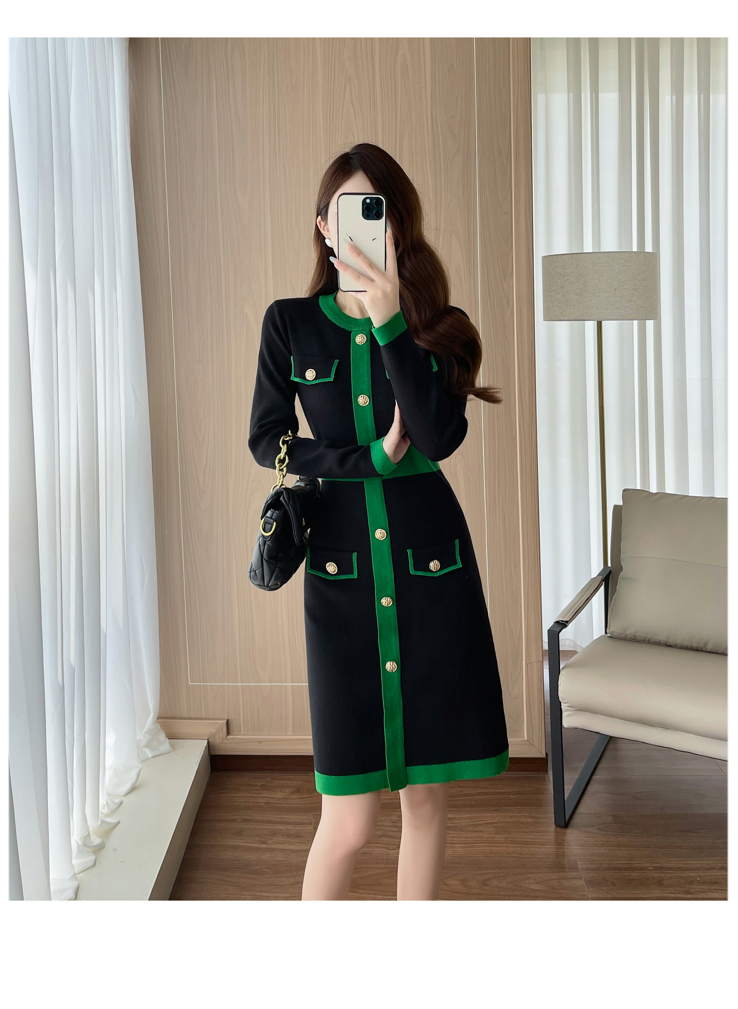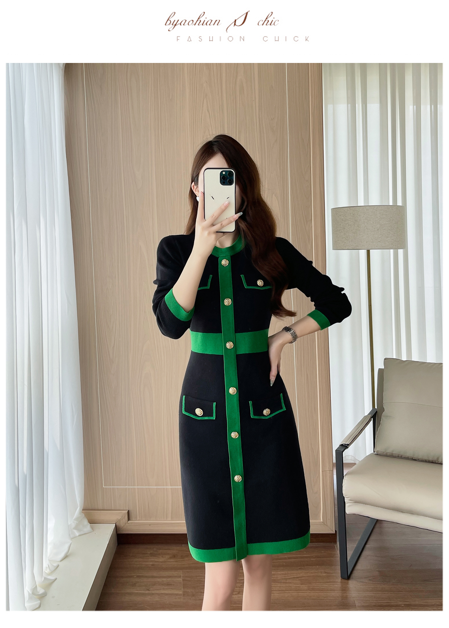 MY15496# 韩国高端气质针织撞色拼接圆领长袖毛衣连衣裙收腰显瘦打底裙女裝貨源服裝批發