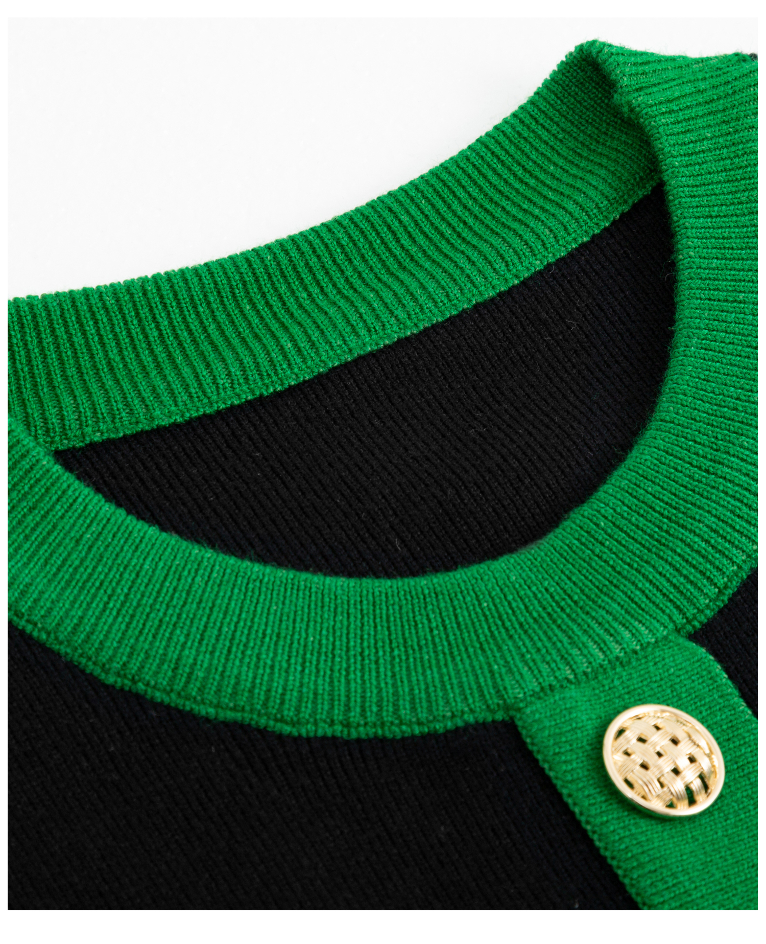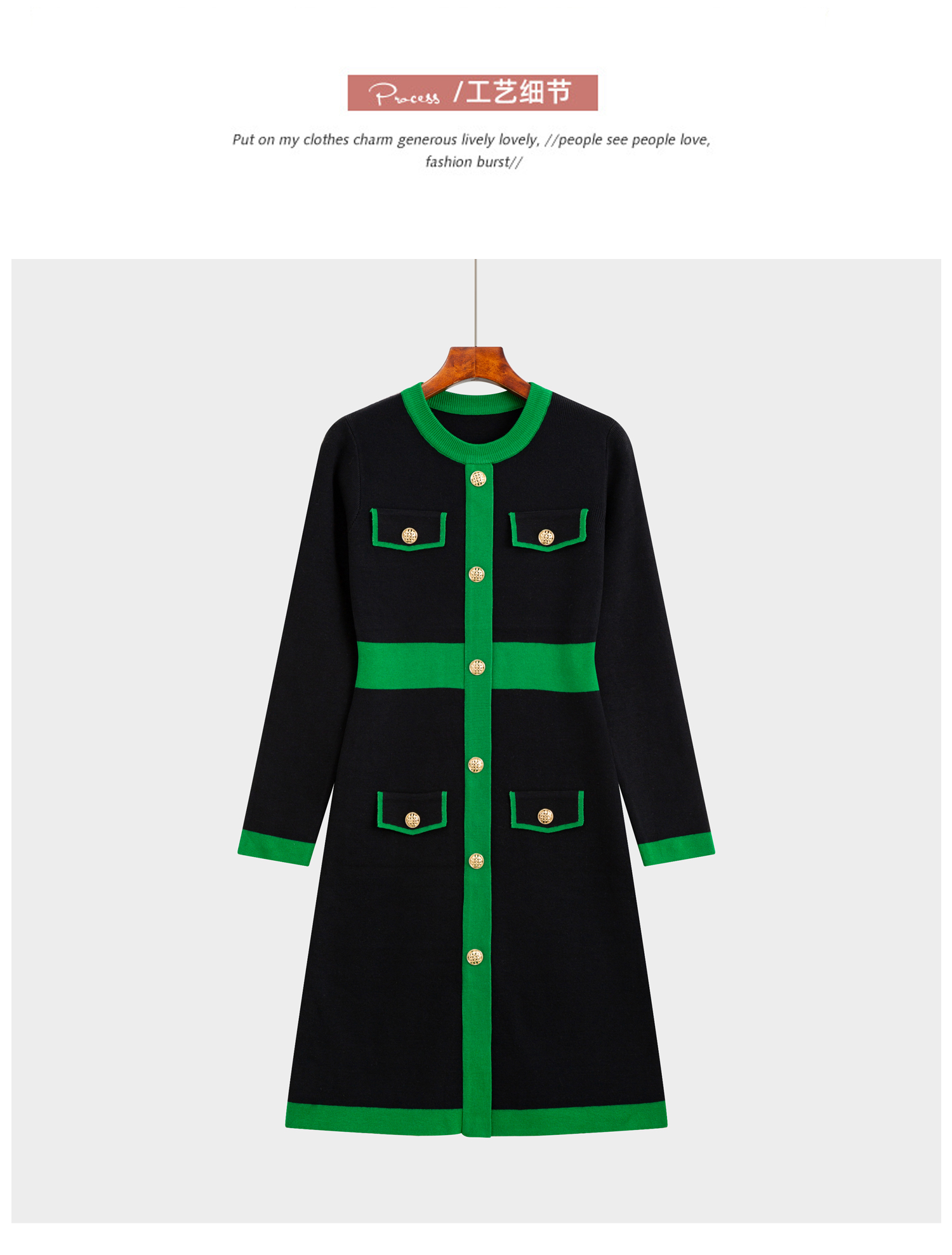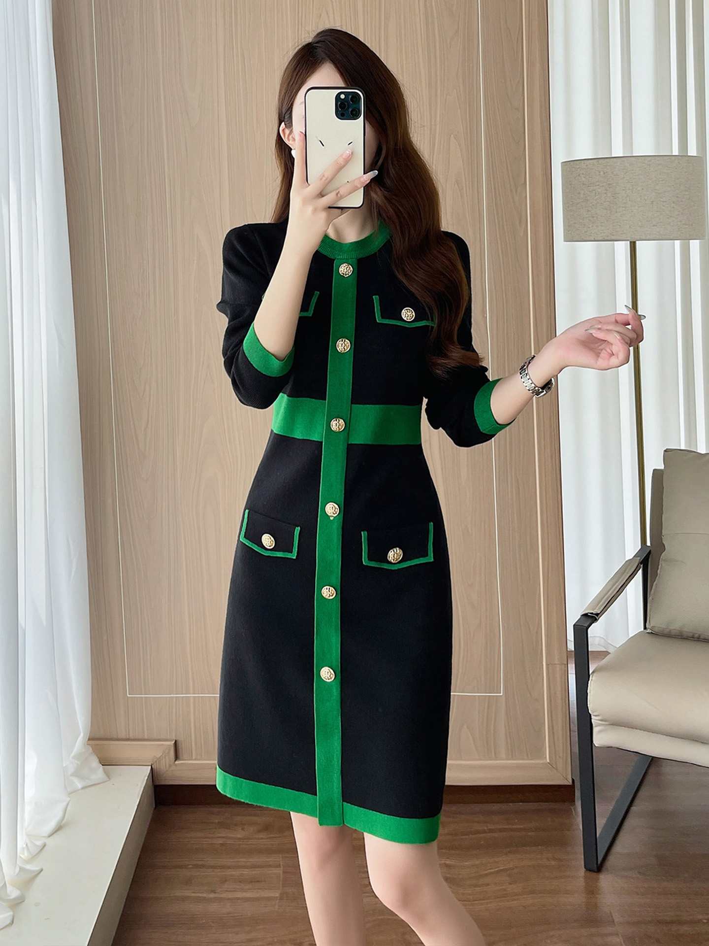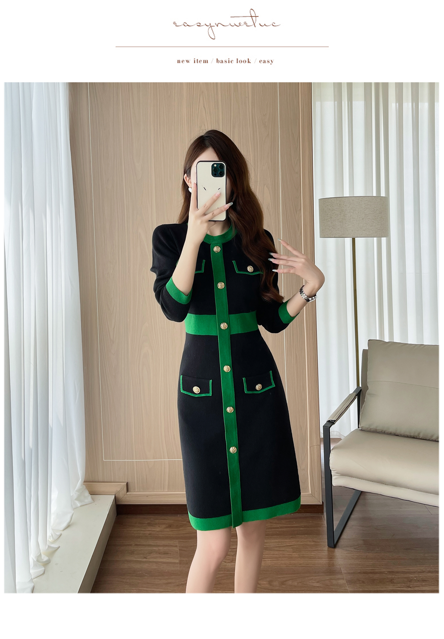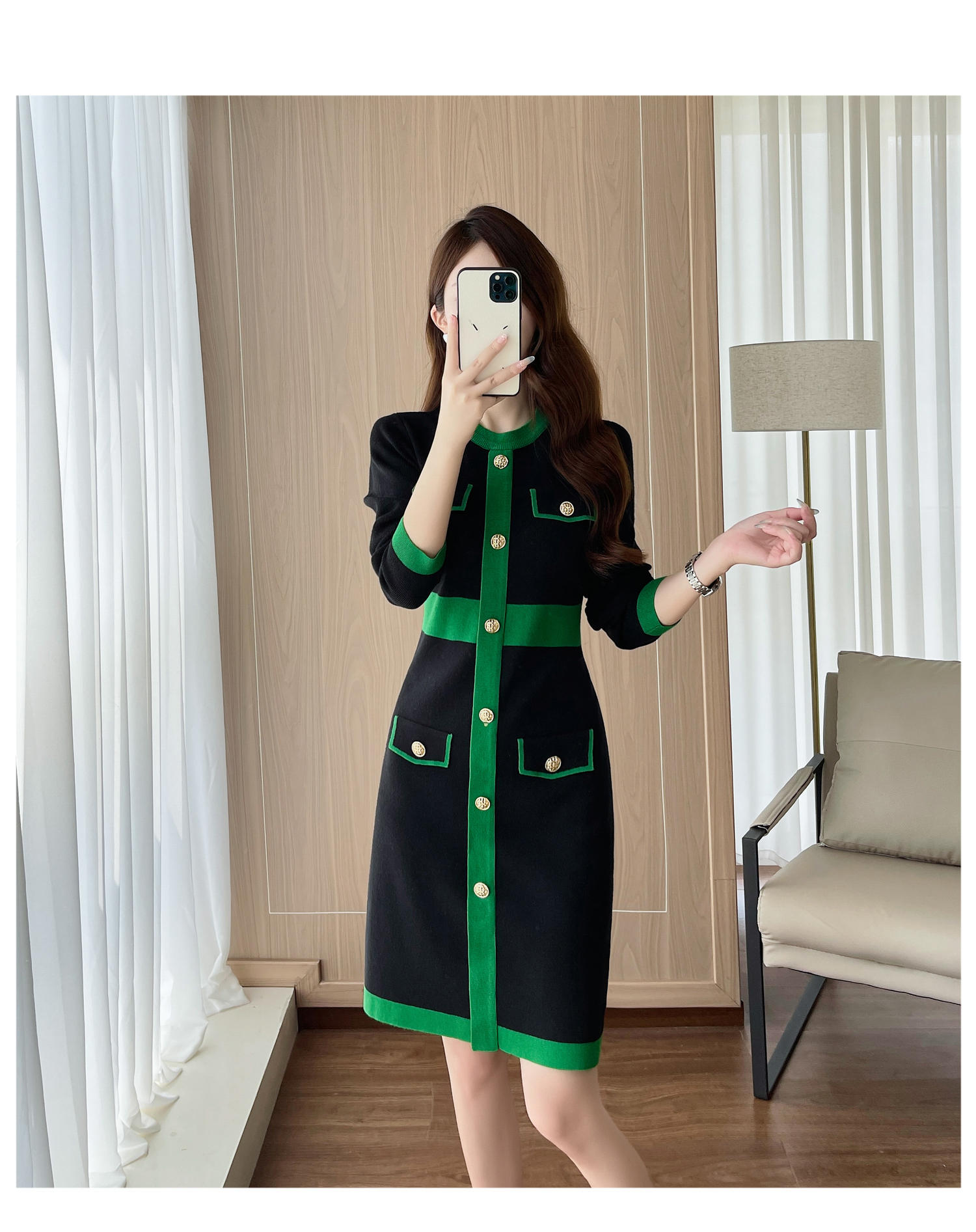 MY15496# 韩国高端气质针织撞色拼接圆领长袖毛衣连衣裙收腰显瘦打底裙女裝貨源服裝批發