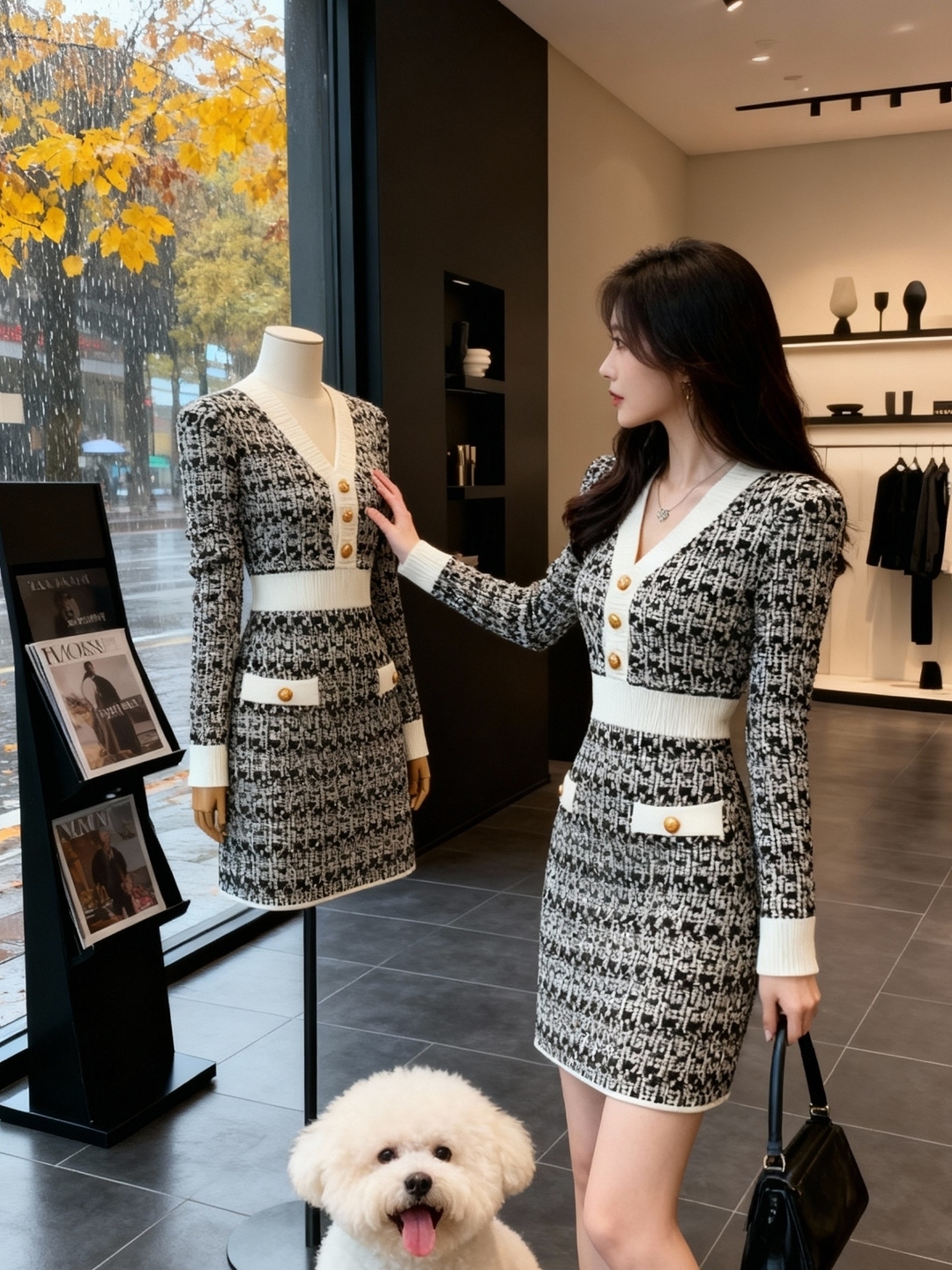 MY15503# 韩国小香风V领针织毛衣连衣裙高级感气质法式千鸟格打底裙女裝貨源服裝批發