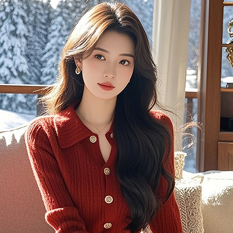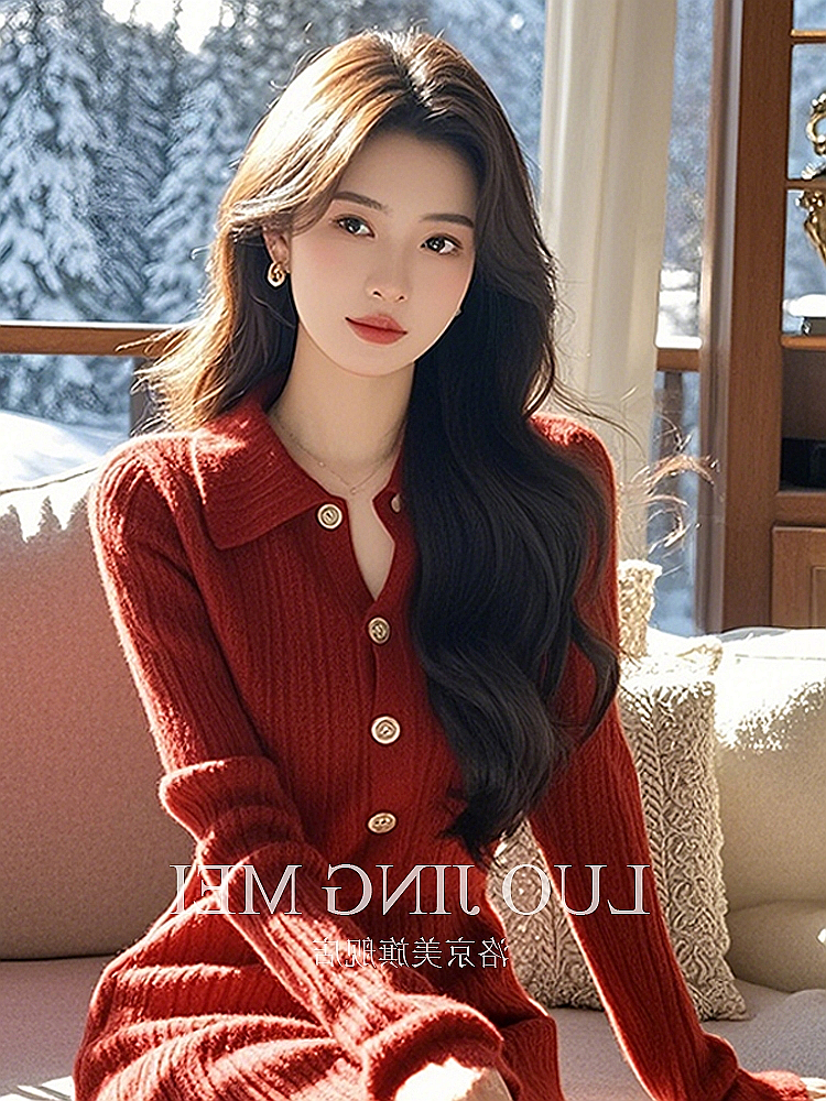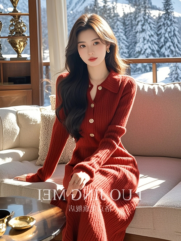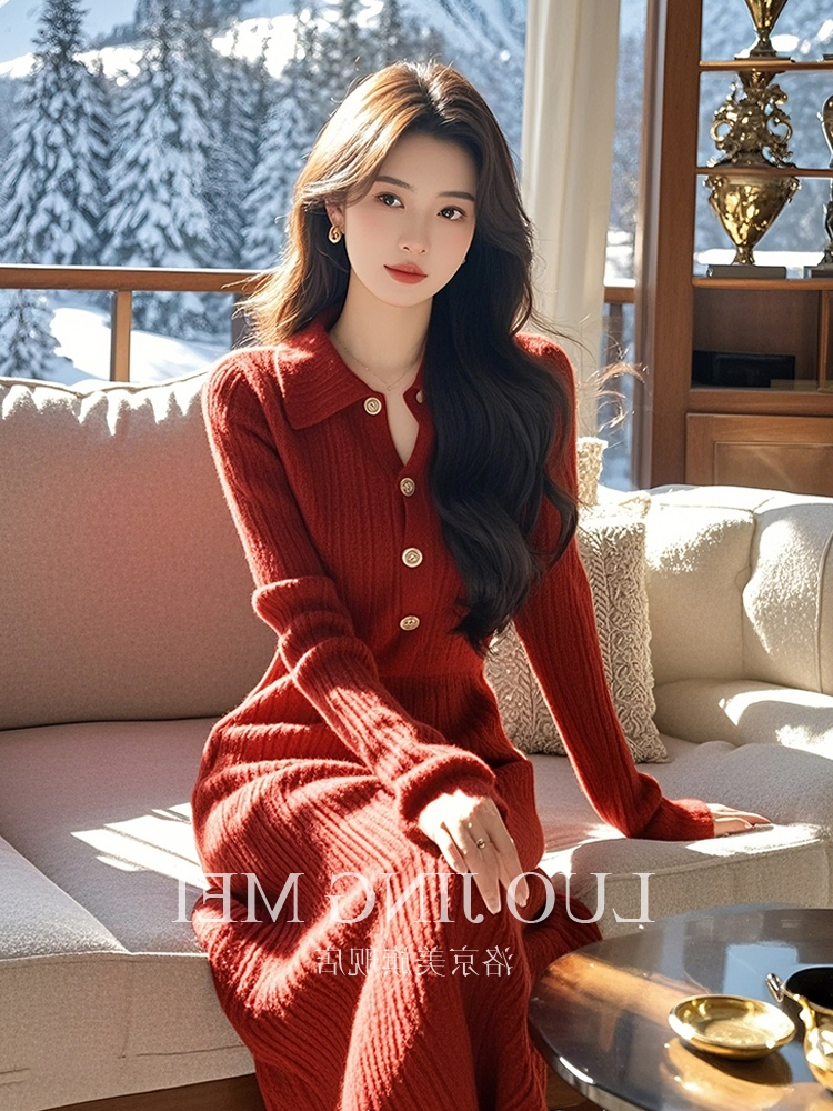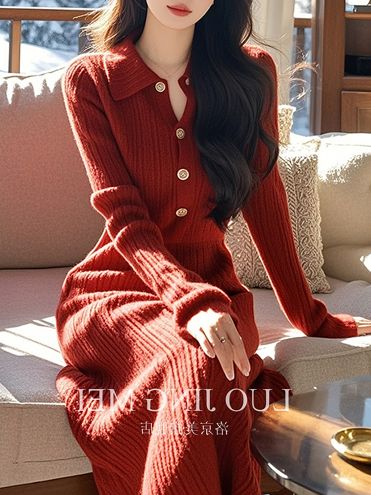 MY15504# 韩国圣诞节回门敬酒服新年本命红百搭polo翻领针织毛衣连衣裙长裙女裝貨源服裝批發