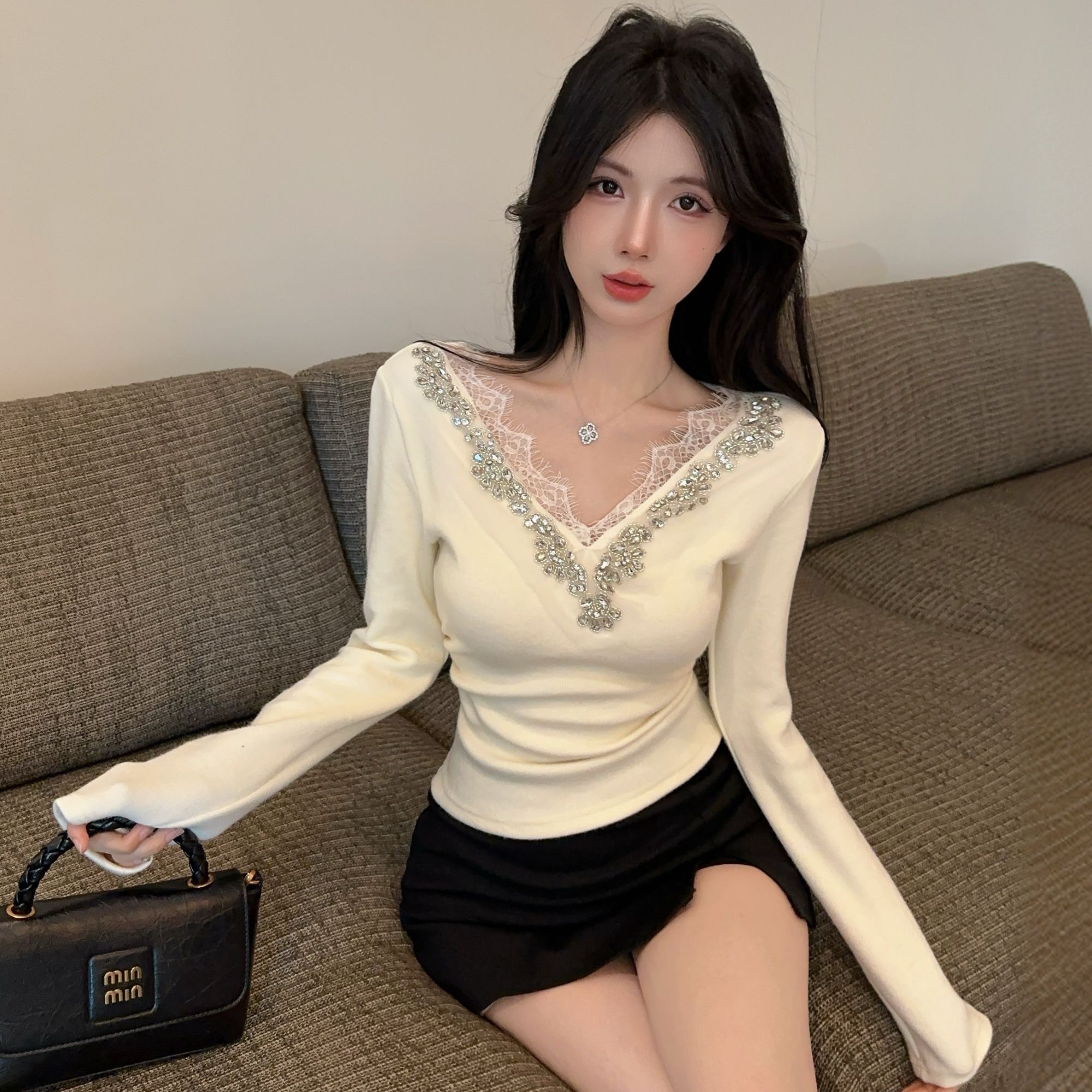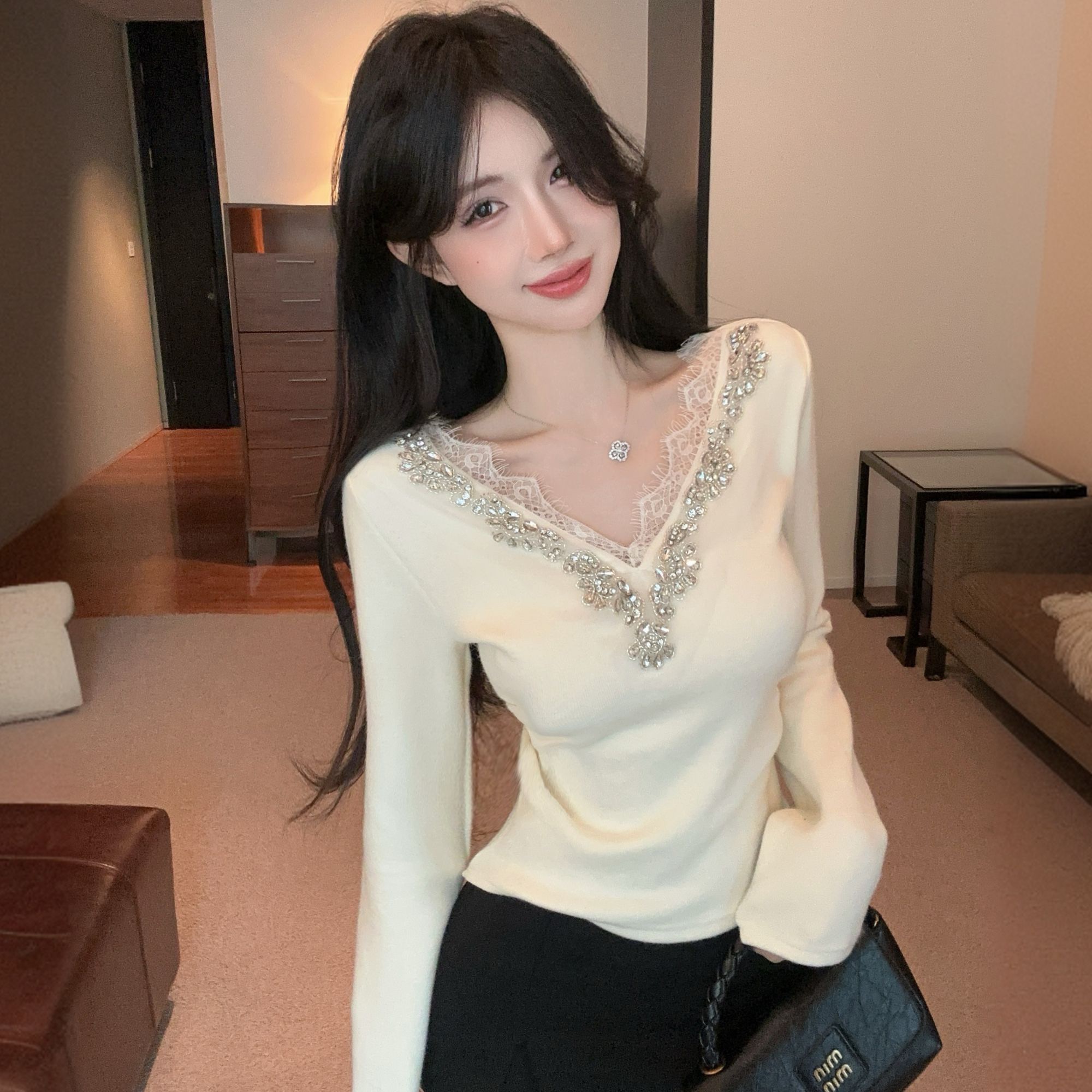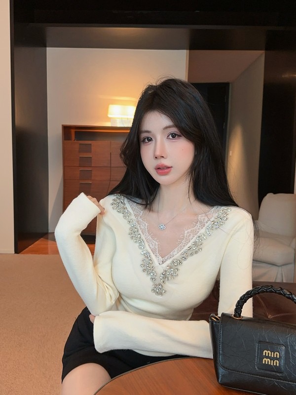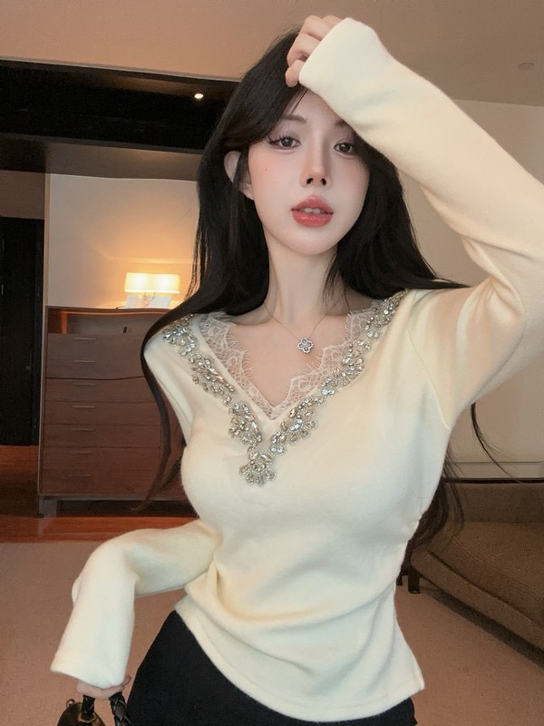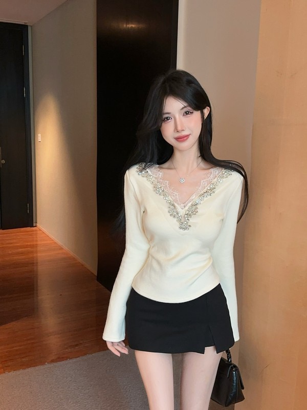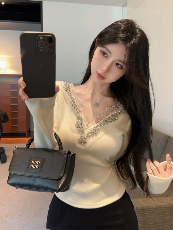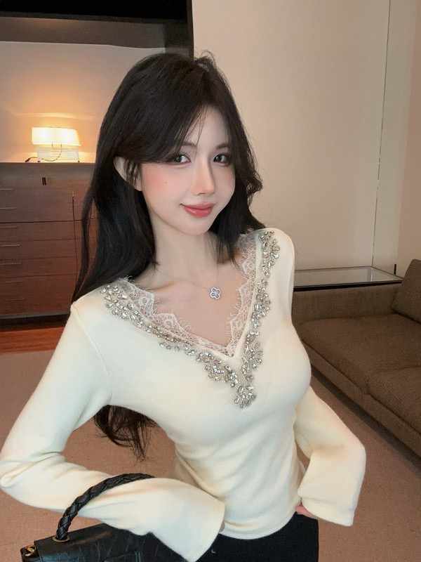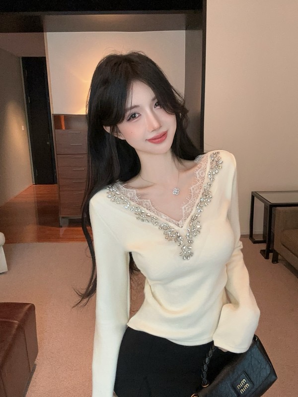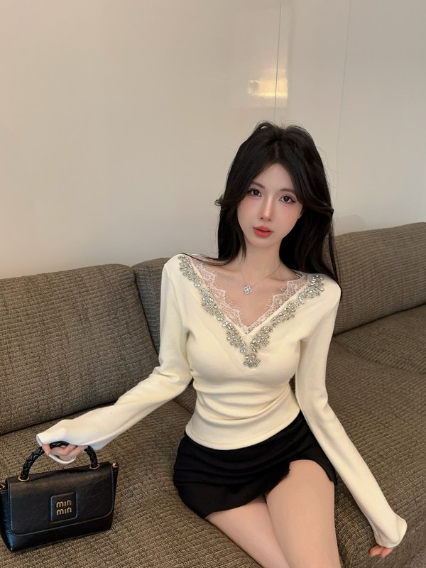 MY15515# 重工蕾丝镶钻v领气质显瘦设计感上衣女裝貨源服裝批發