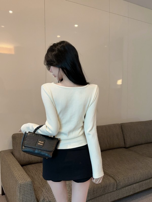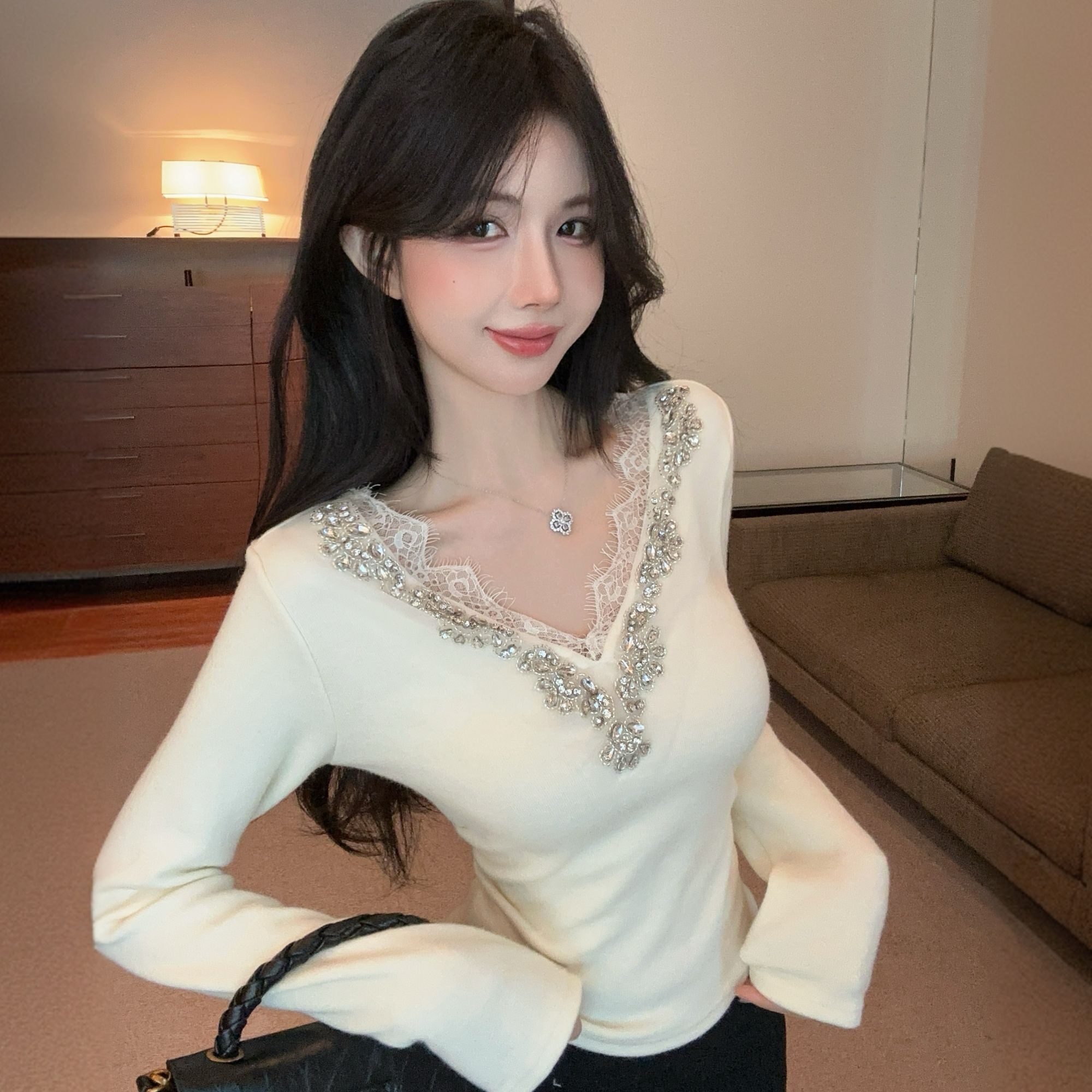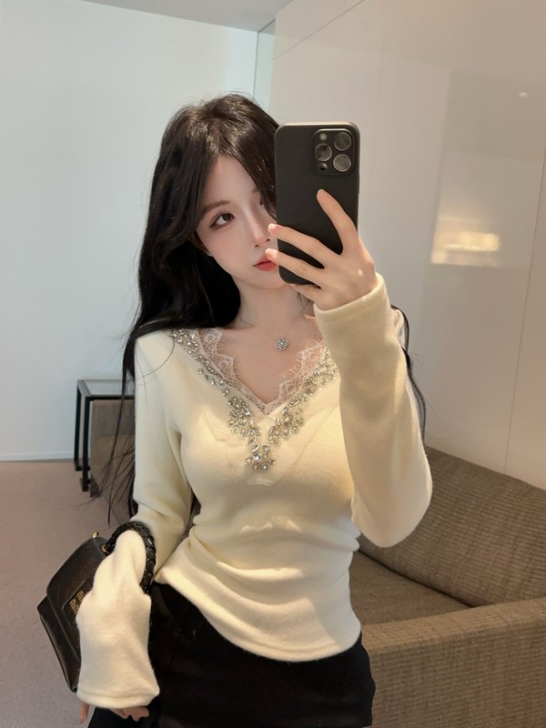 MY15526# 加绒V领钩花蕾丝打底衫新款法式时尚气质褶皱收腰上衣女裝貨...
