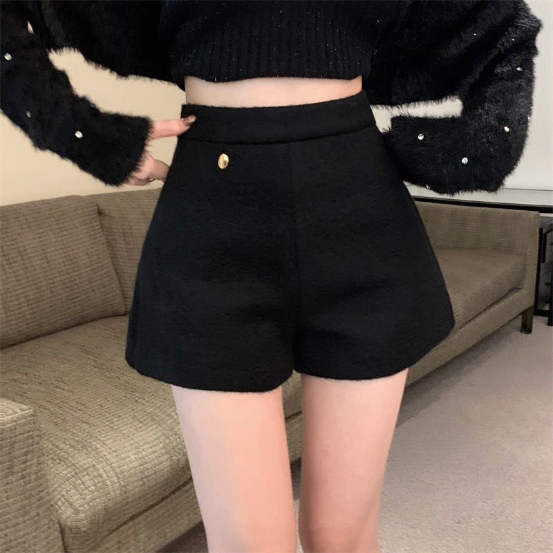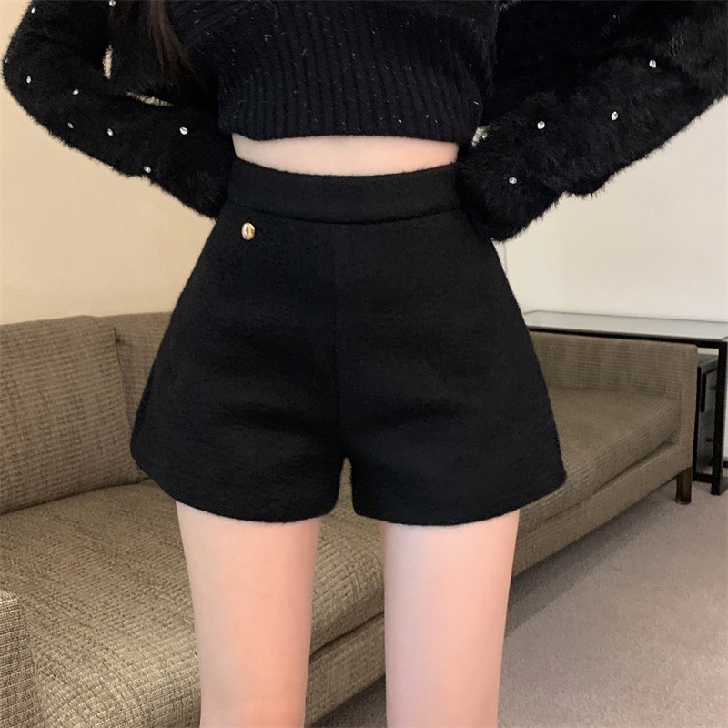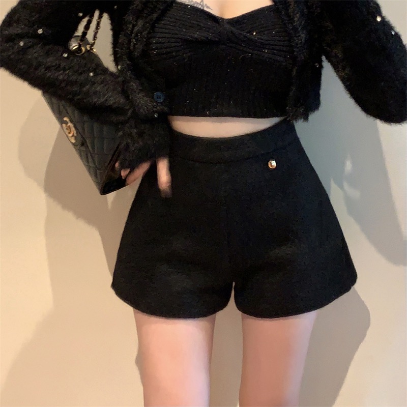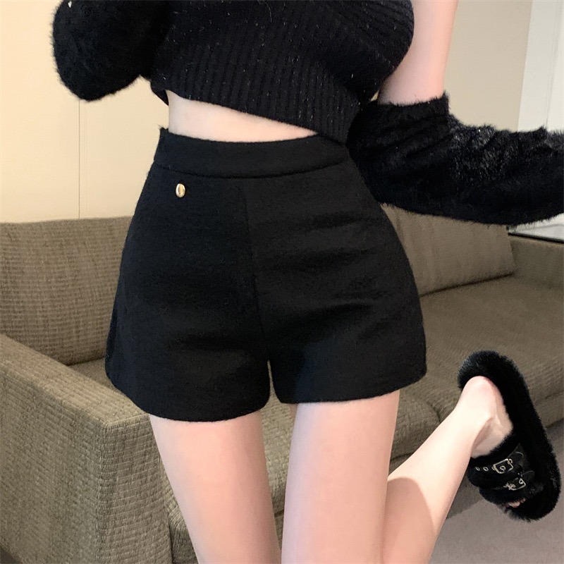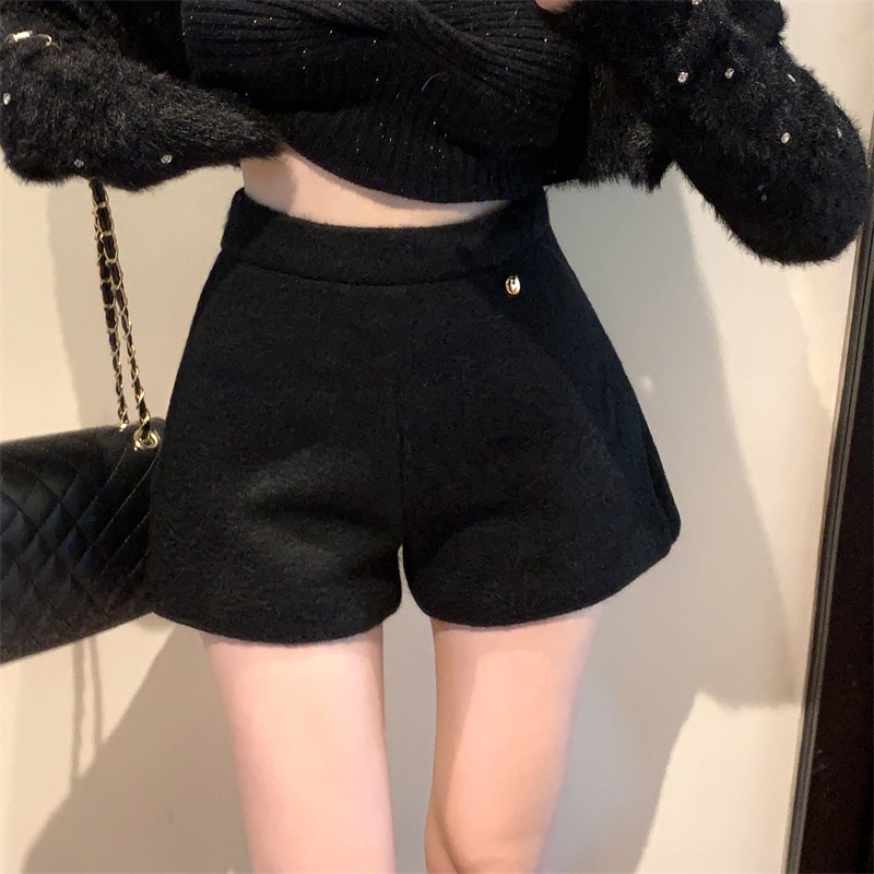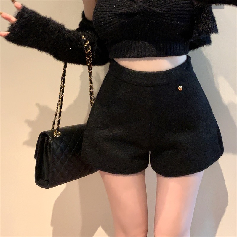 MY15448# 简约气质纯色毛呢抽绳高腰休闲裤小众加厚包臀短裤女裝貨源服...
