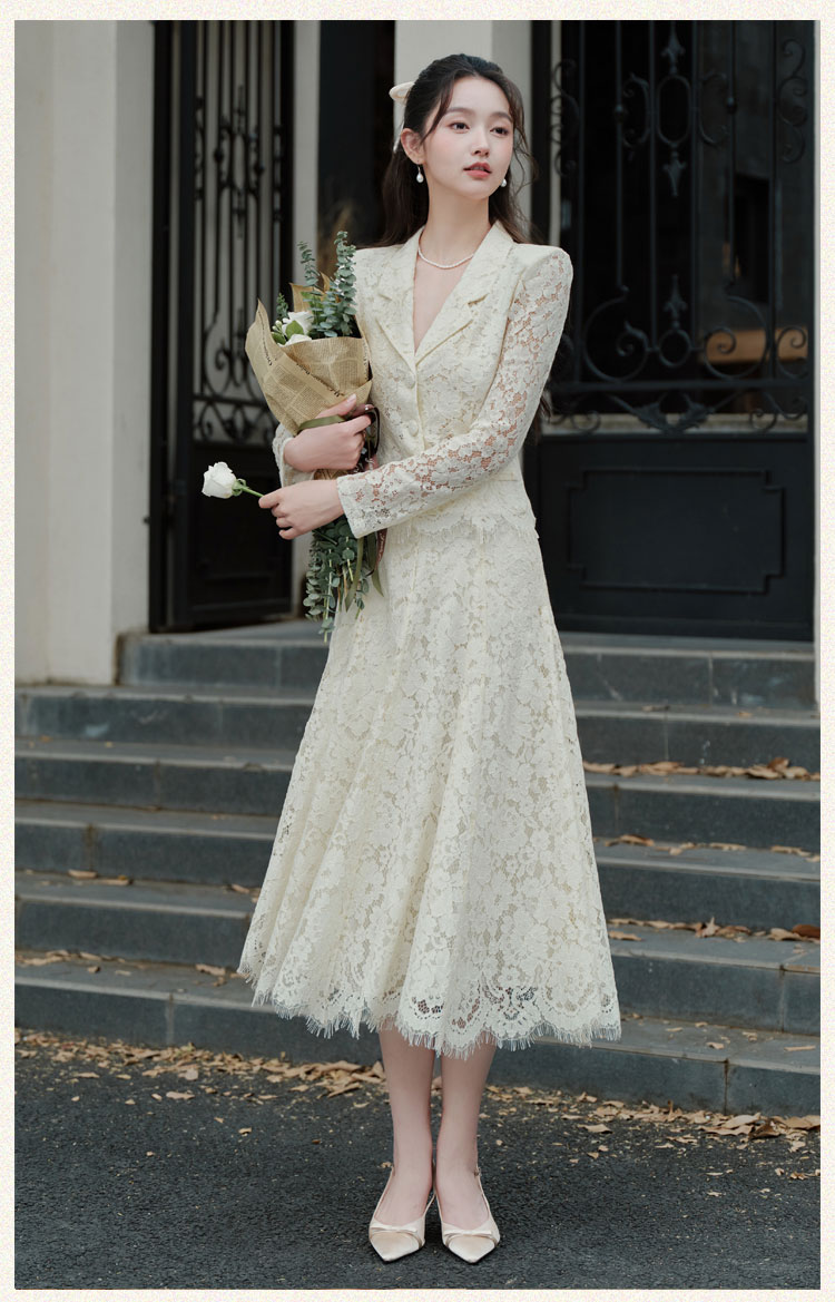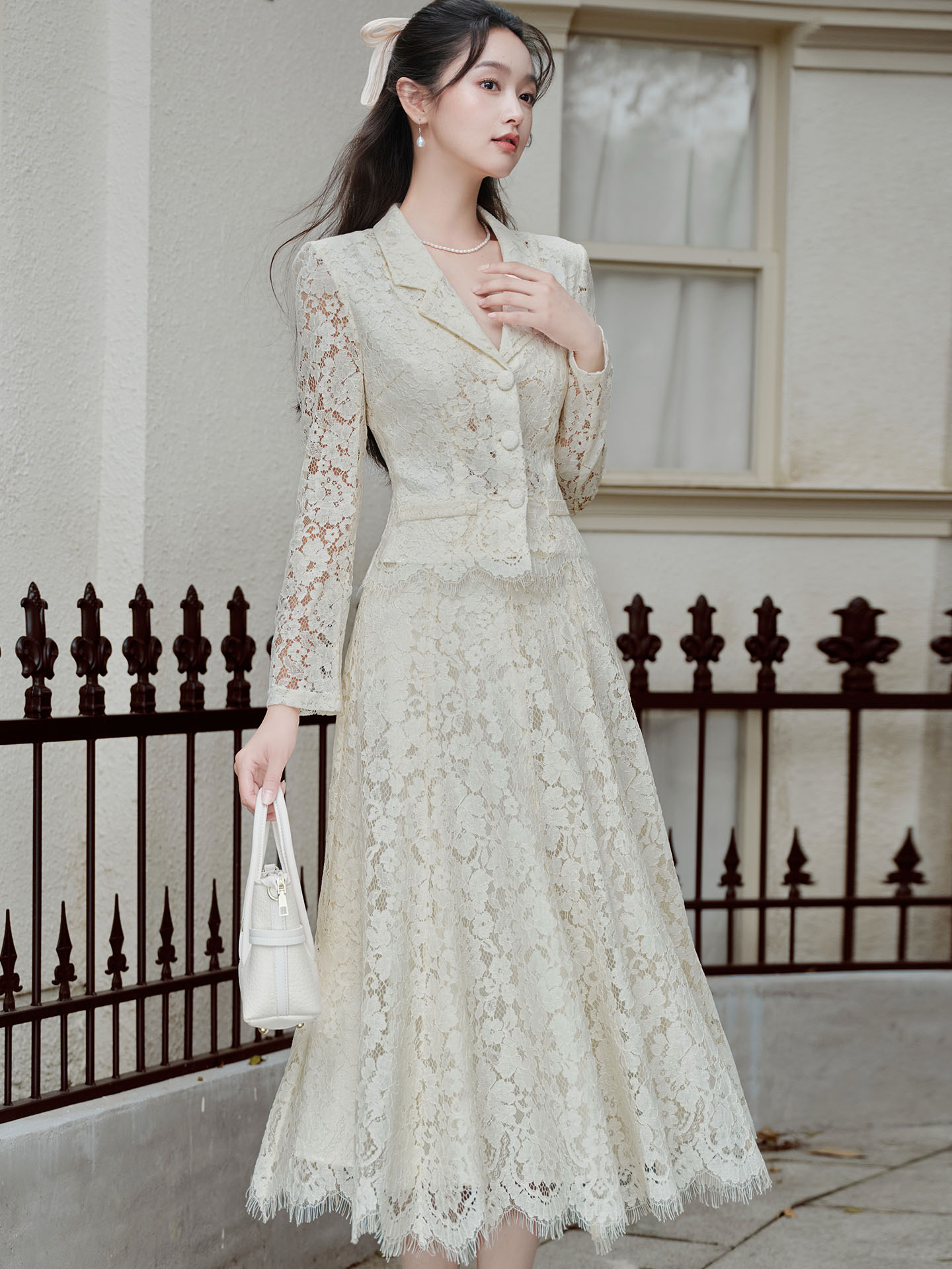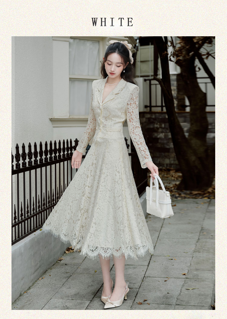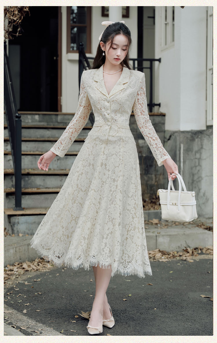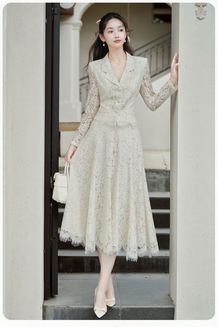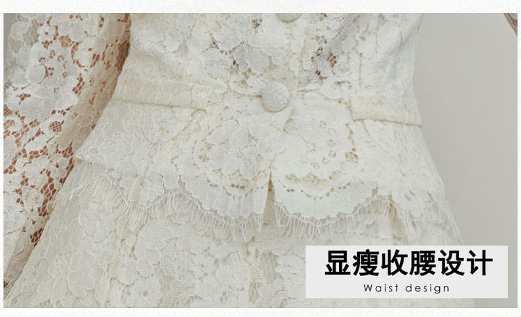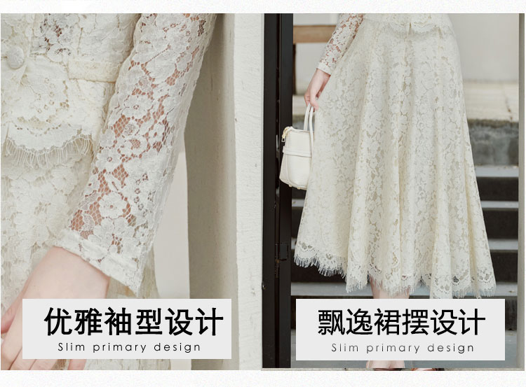 MY15520# 韩女约会 纯欲温柔蕾丝上衣收腰大裙摆长裙套装女裝貨源服裝批發